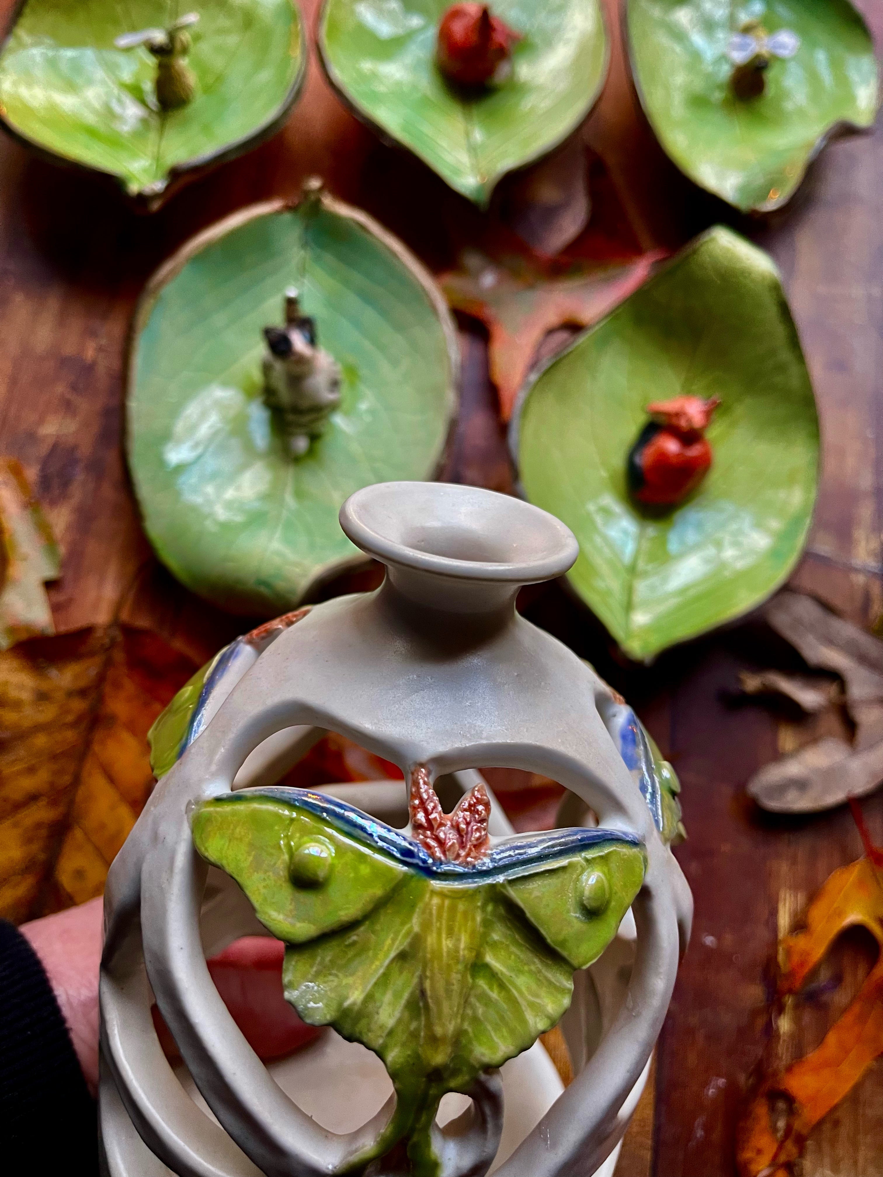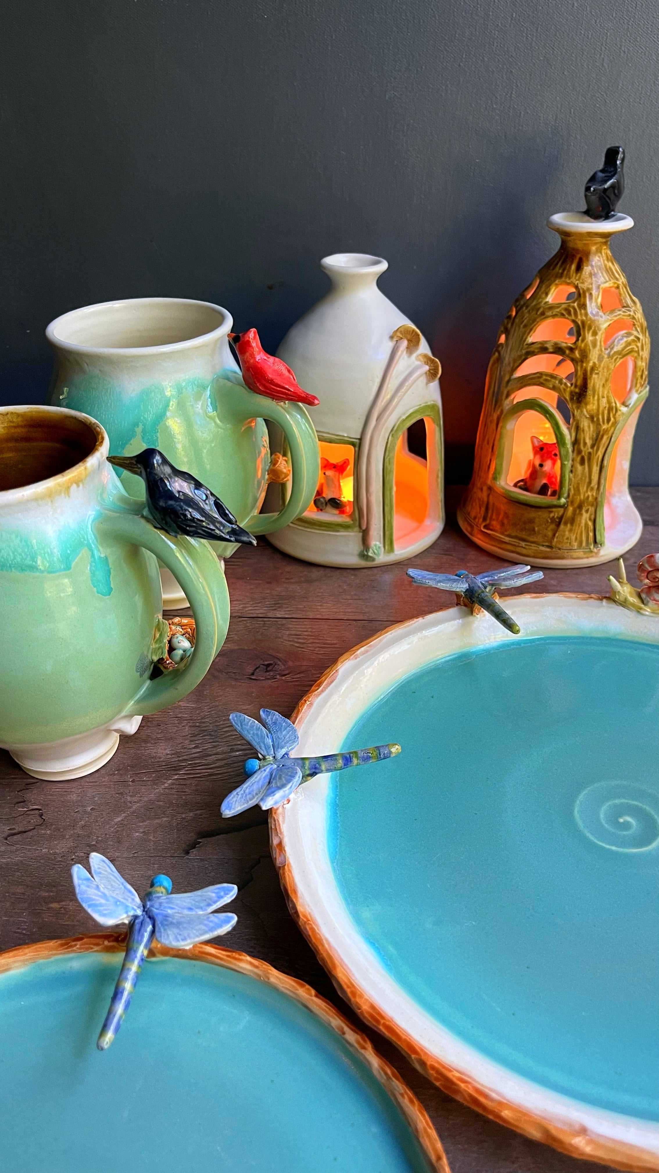 Rustic, organic dinnerware and bespoke serving pieces. My sets have been in daily use for 35 years. I make each ceramic piece by hand in stoneware clay with heirloom quality, food safe glazes. These organic shapes emerge from the land I share in the Blue Ridge Mountains with birds, fox, bats and magical plant life.