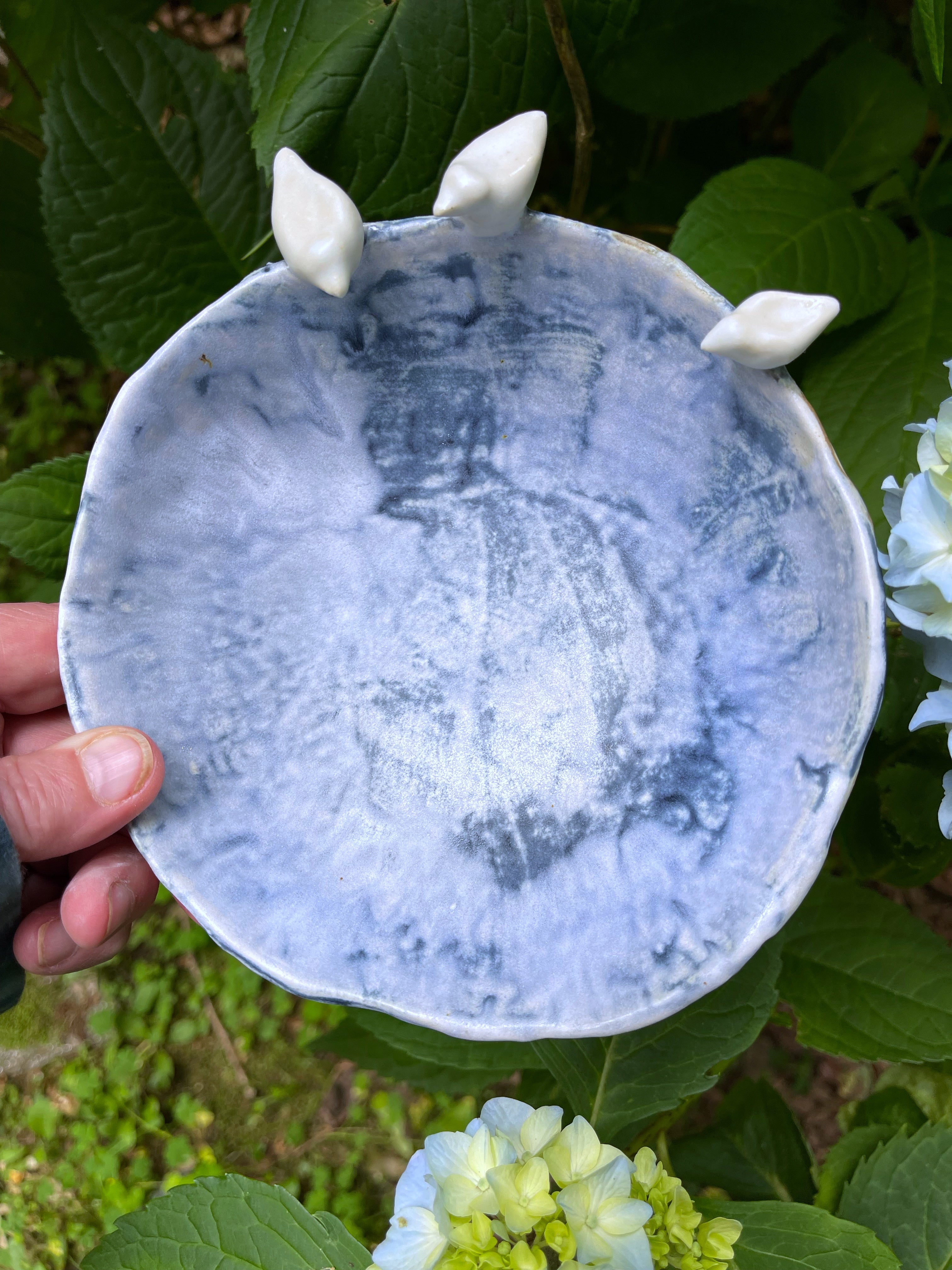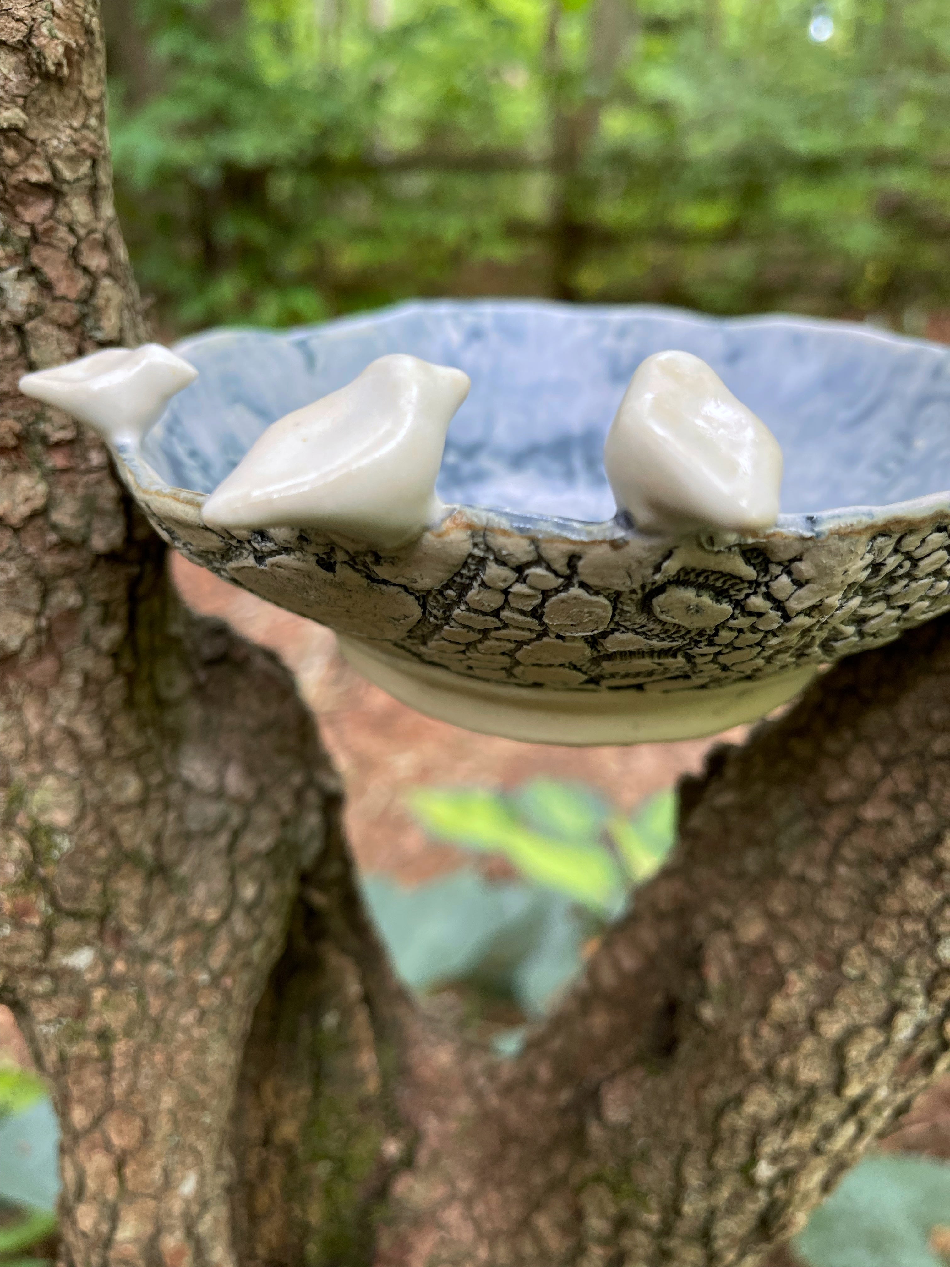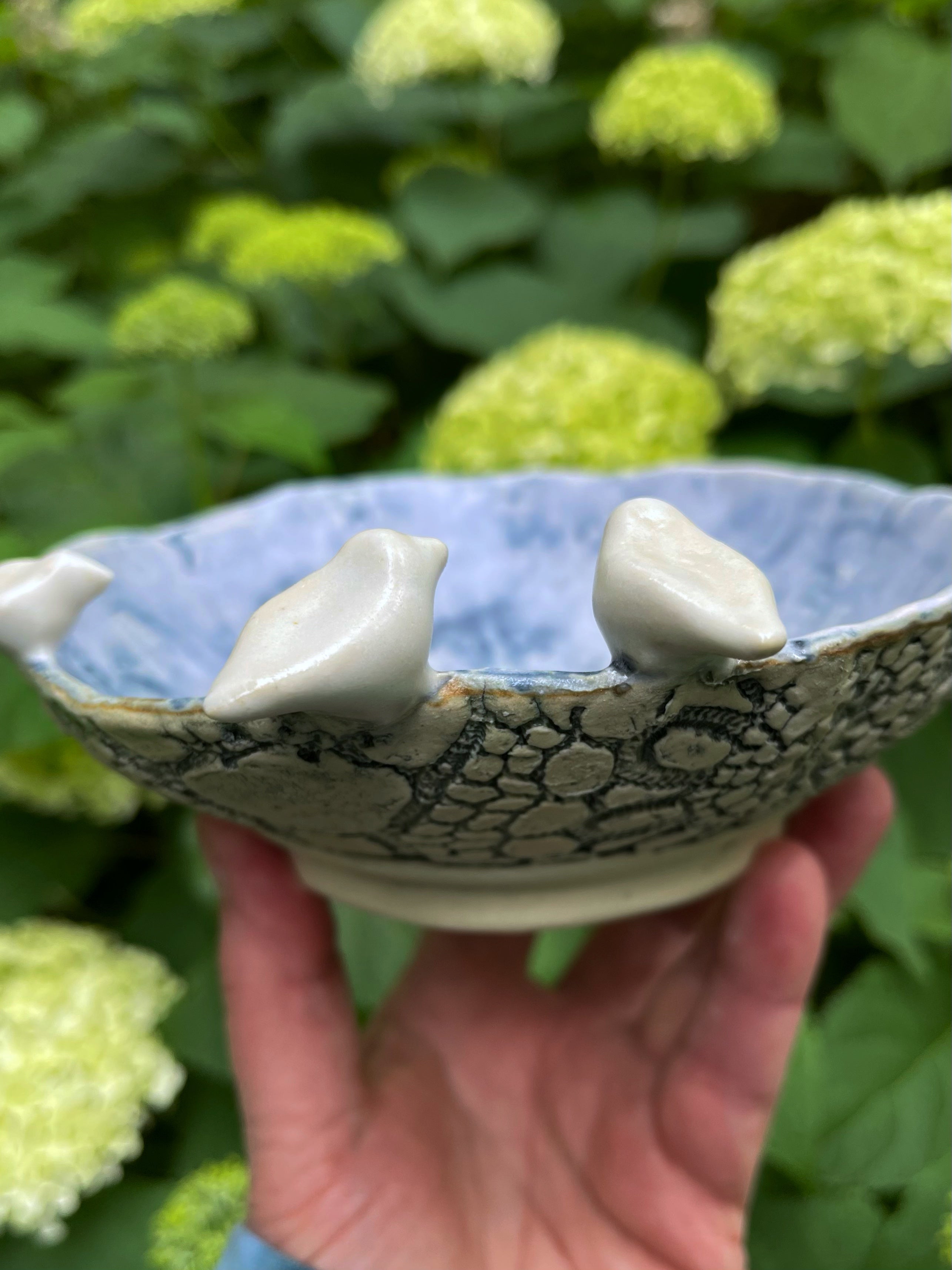 A Family of 2 parent birds and a baby bird perch on the rim of a textured lace bowl with a mottled blue glaze.