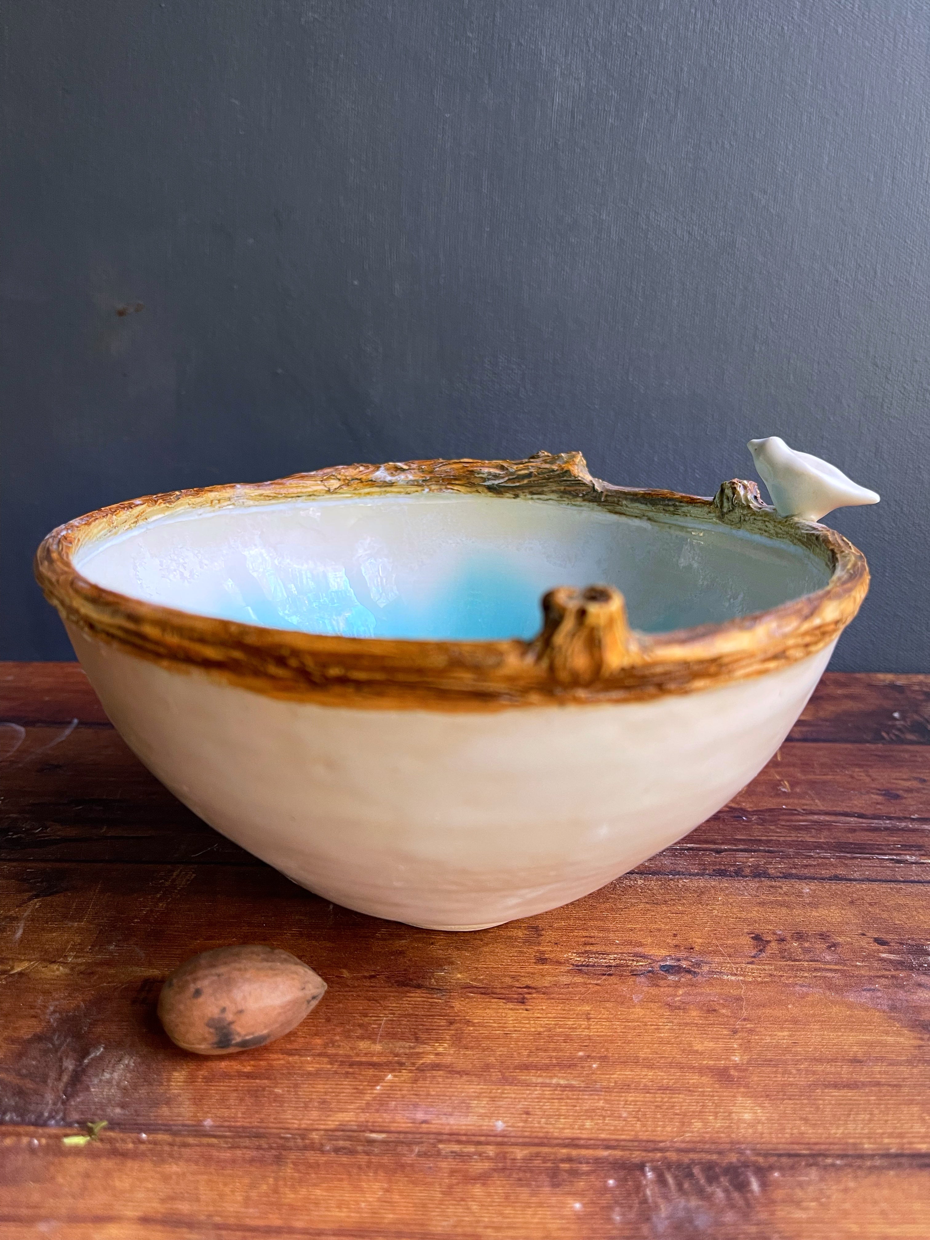 White bird on a tree branch rim with fluid glazes