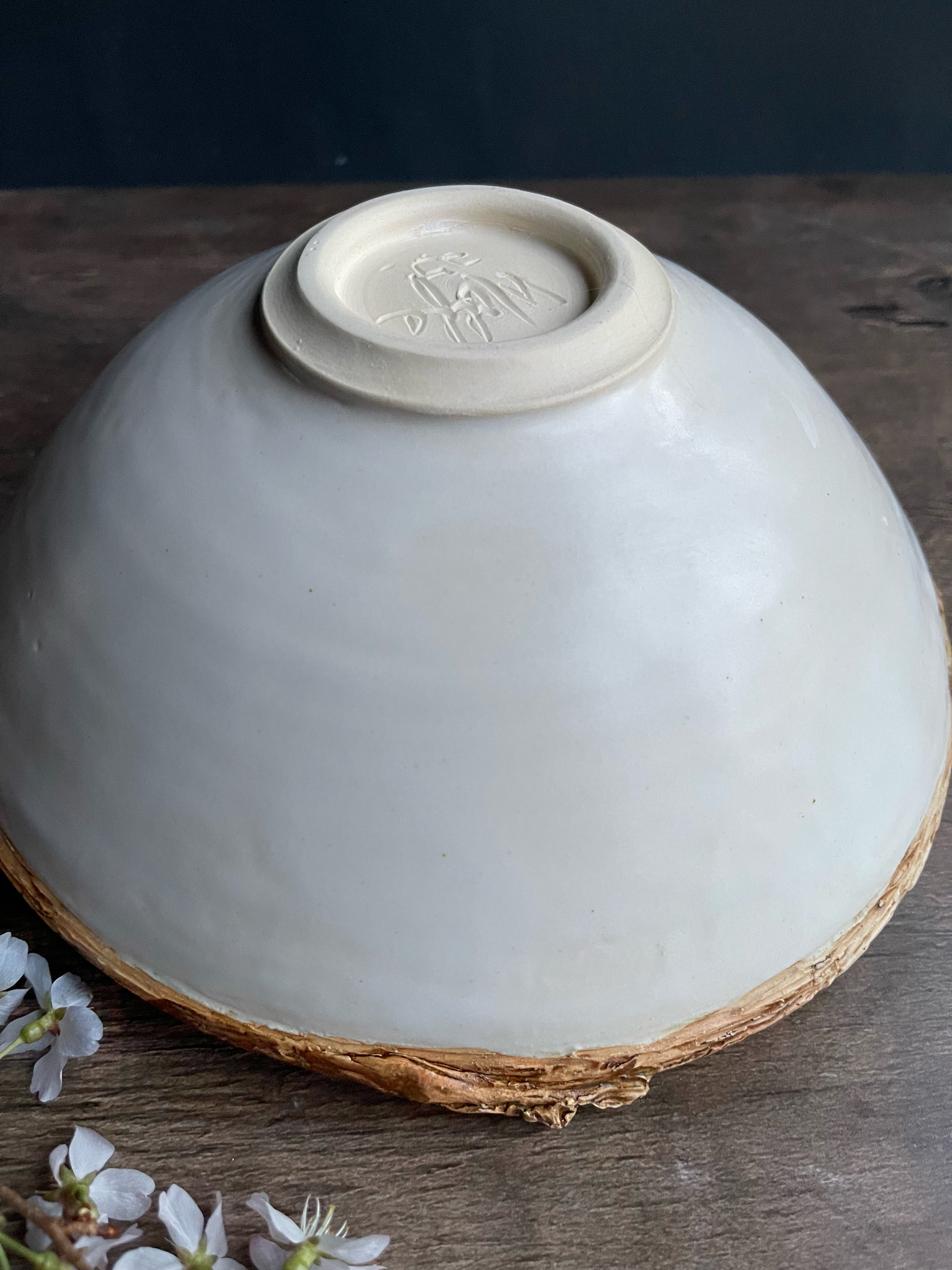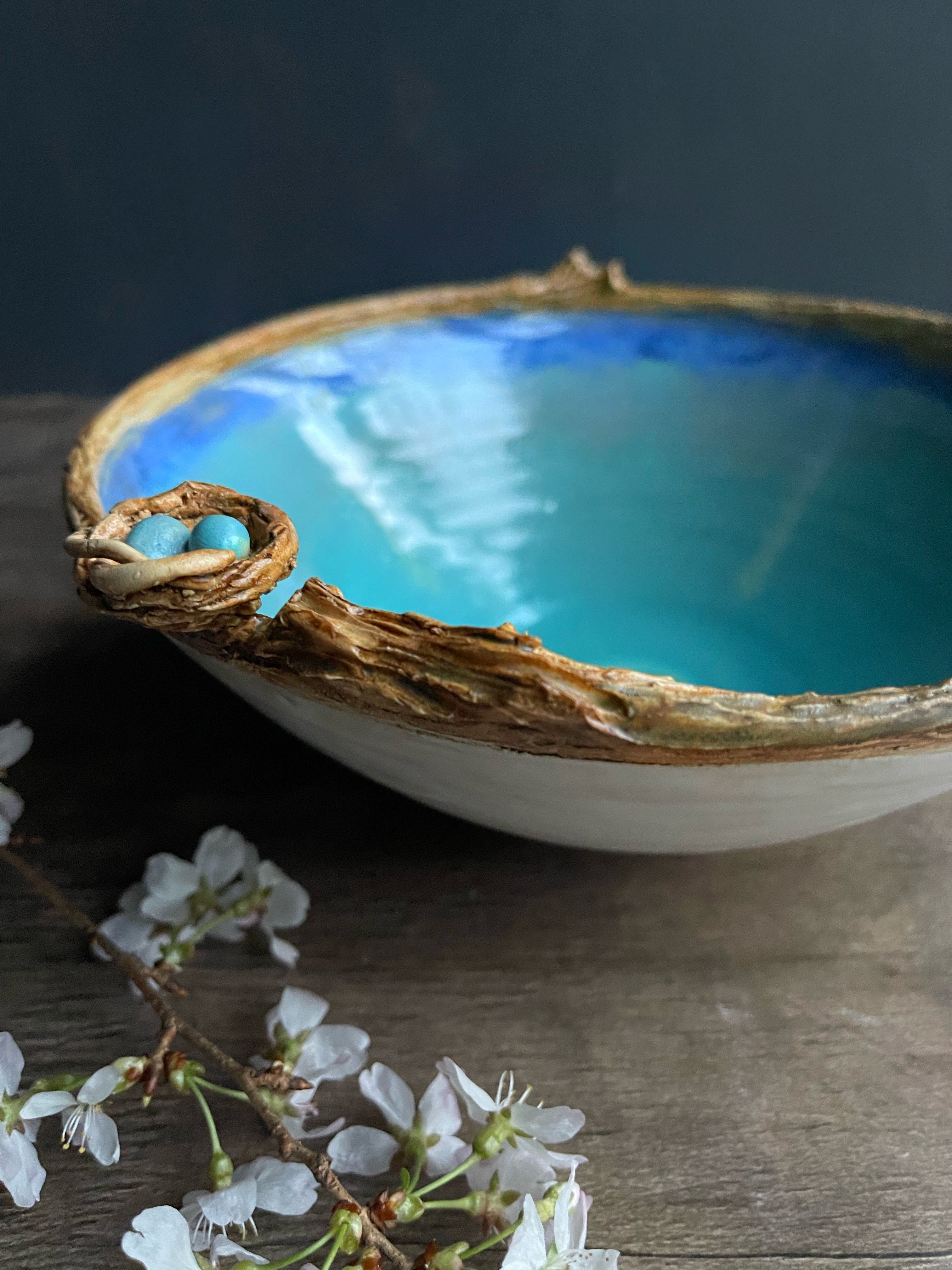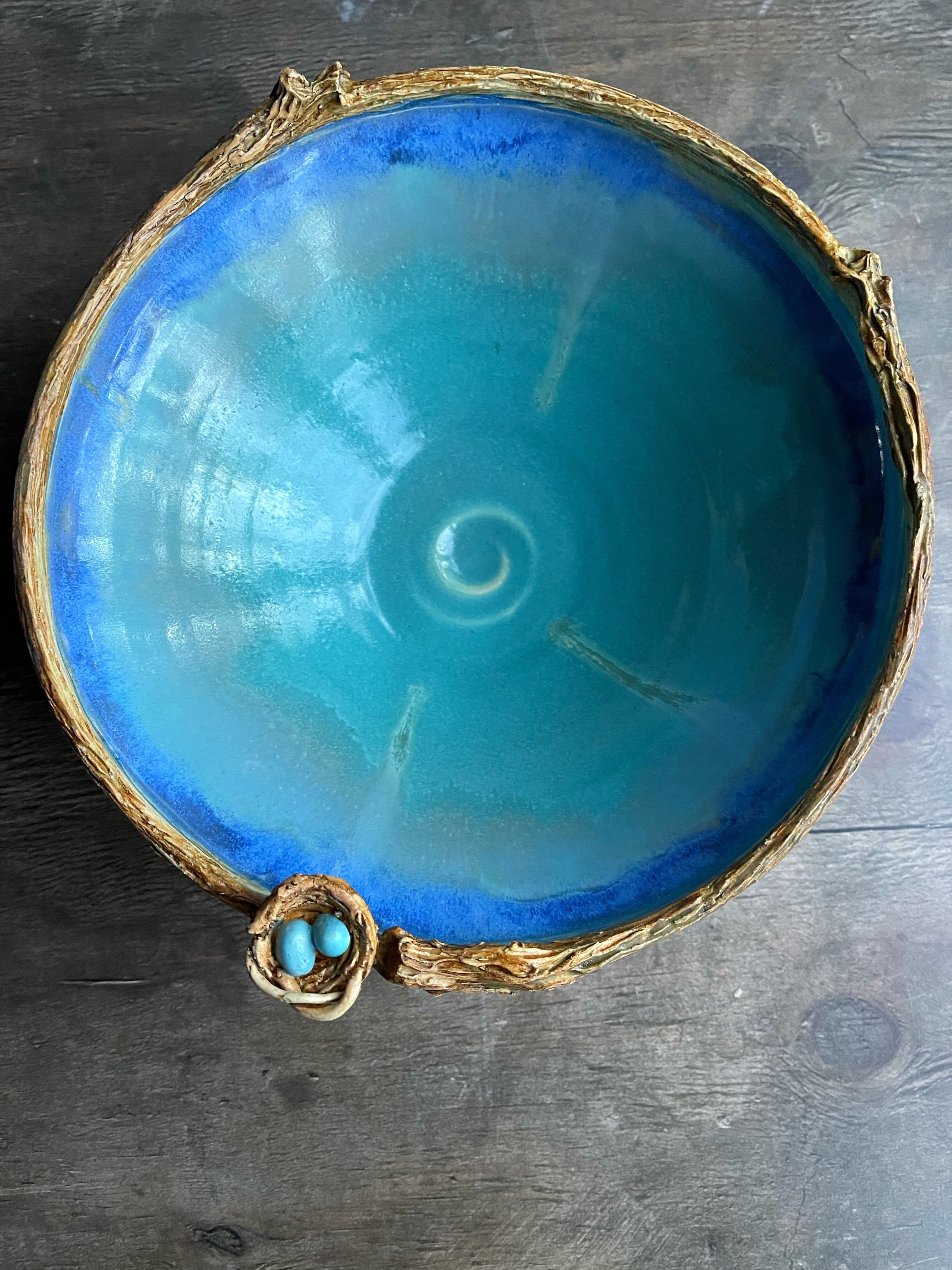 Textured tree branch rimmed bowl with tiny birds nest glazed in multicolor glazes inside.