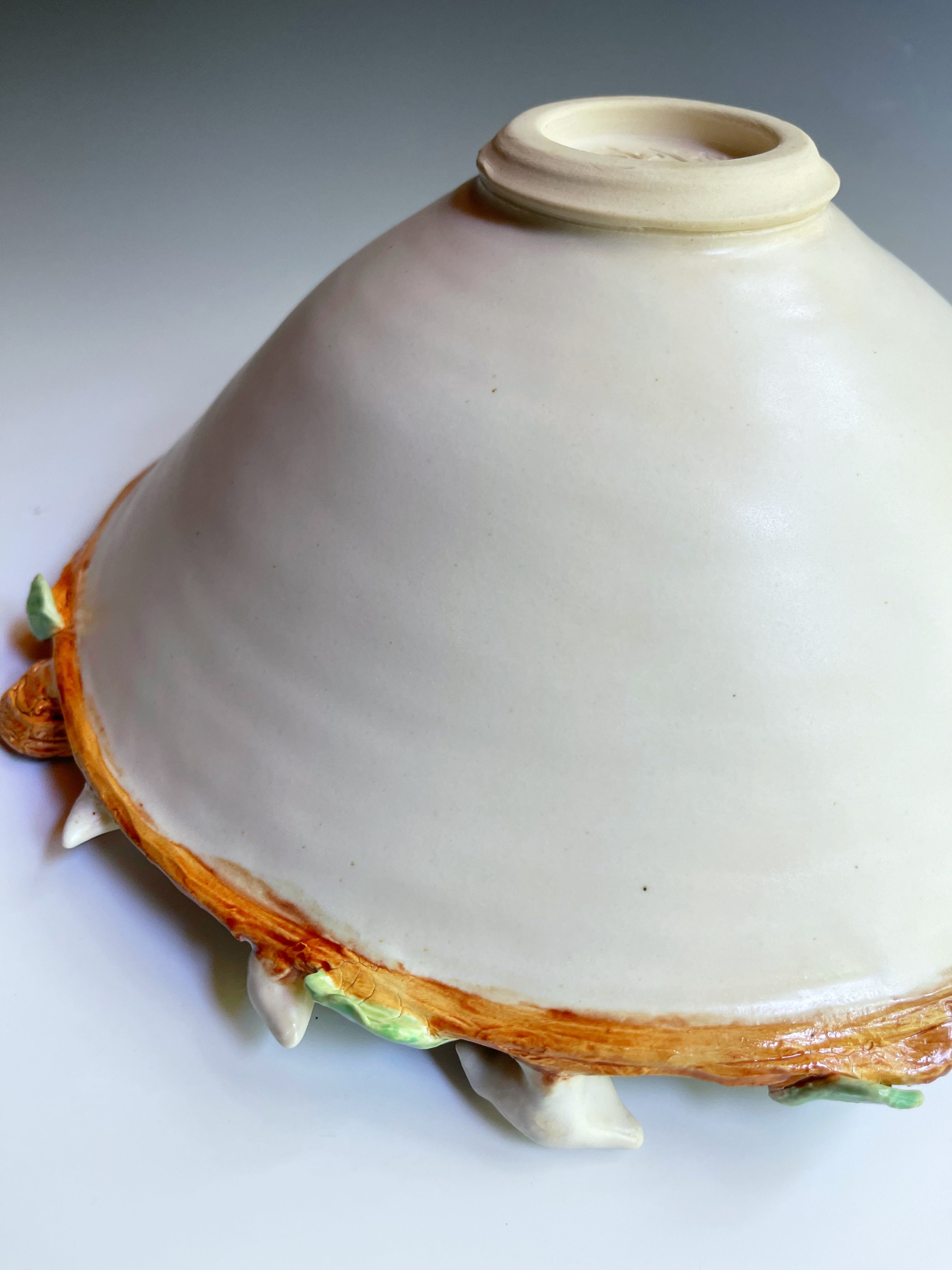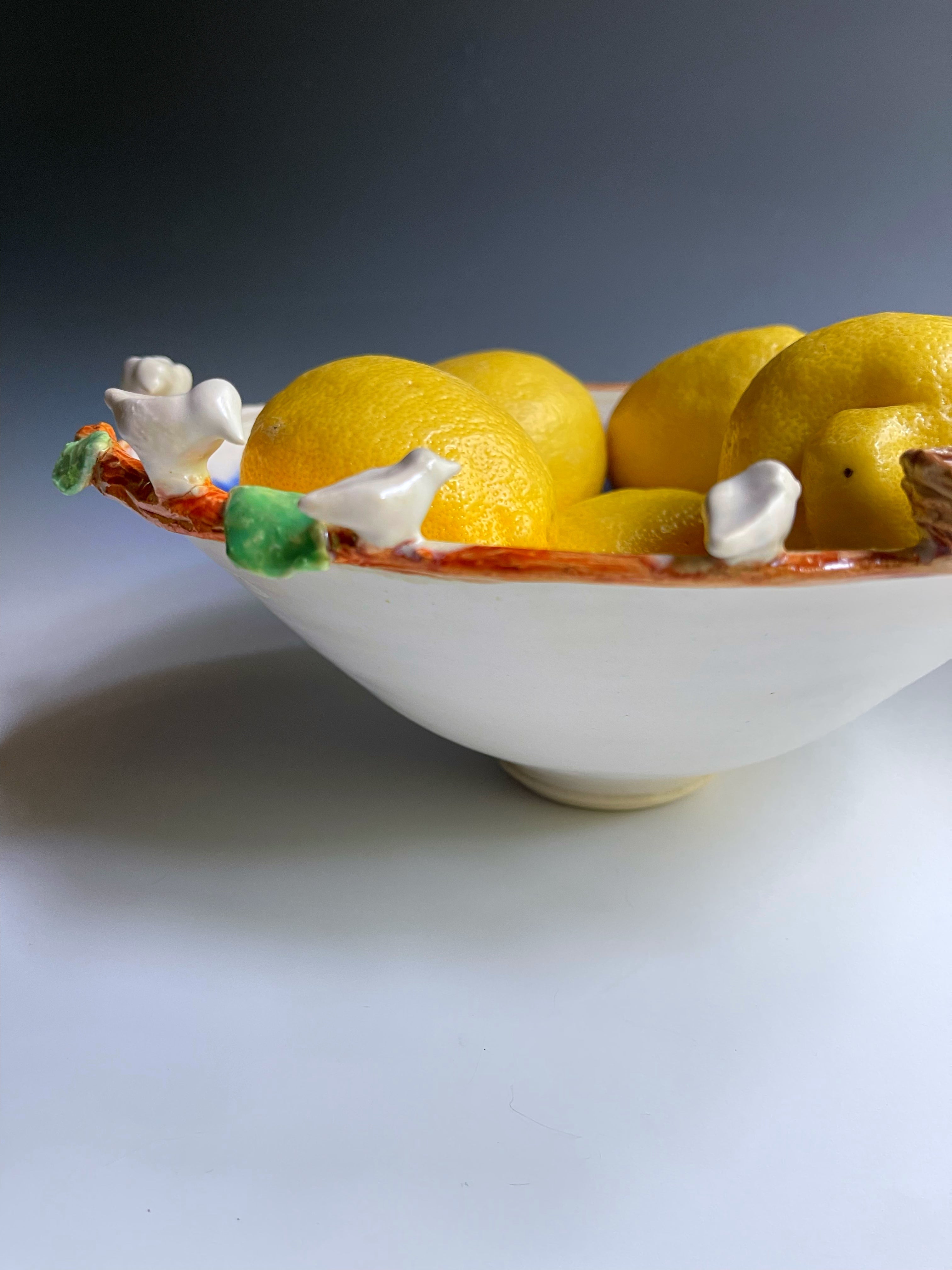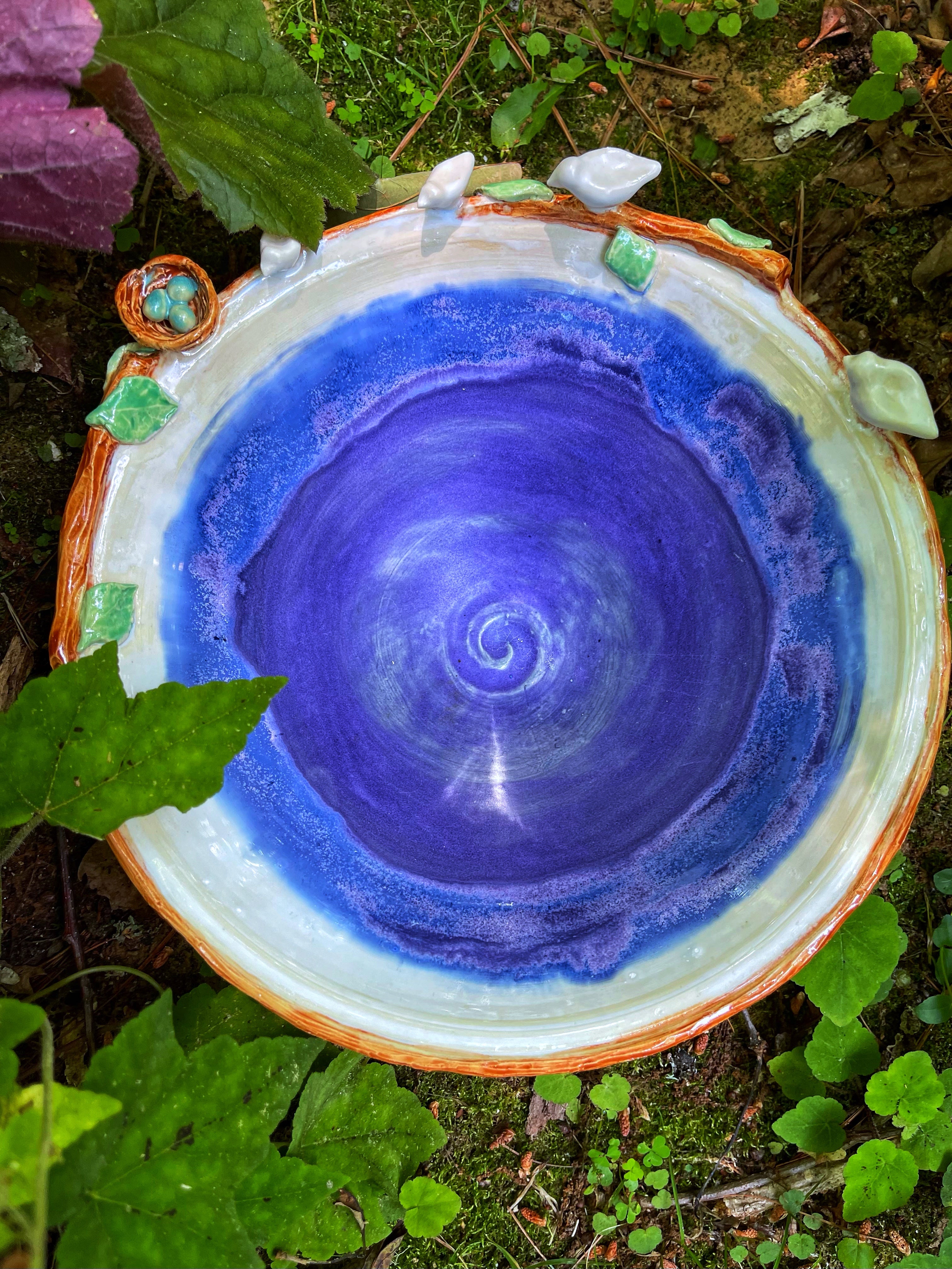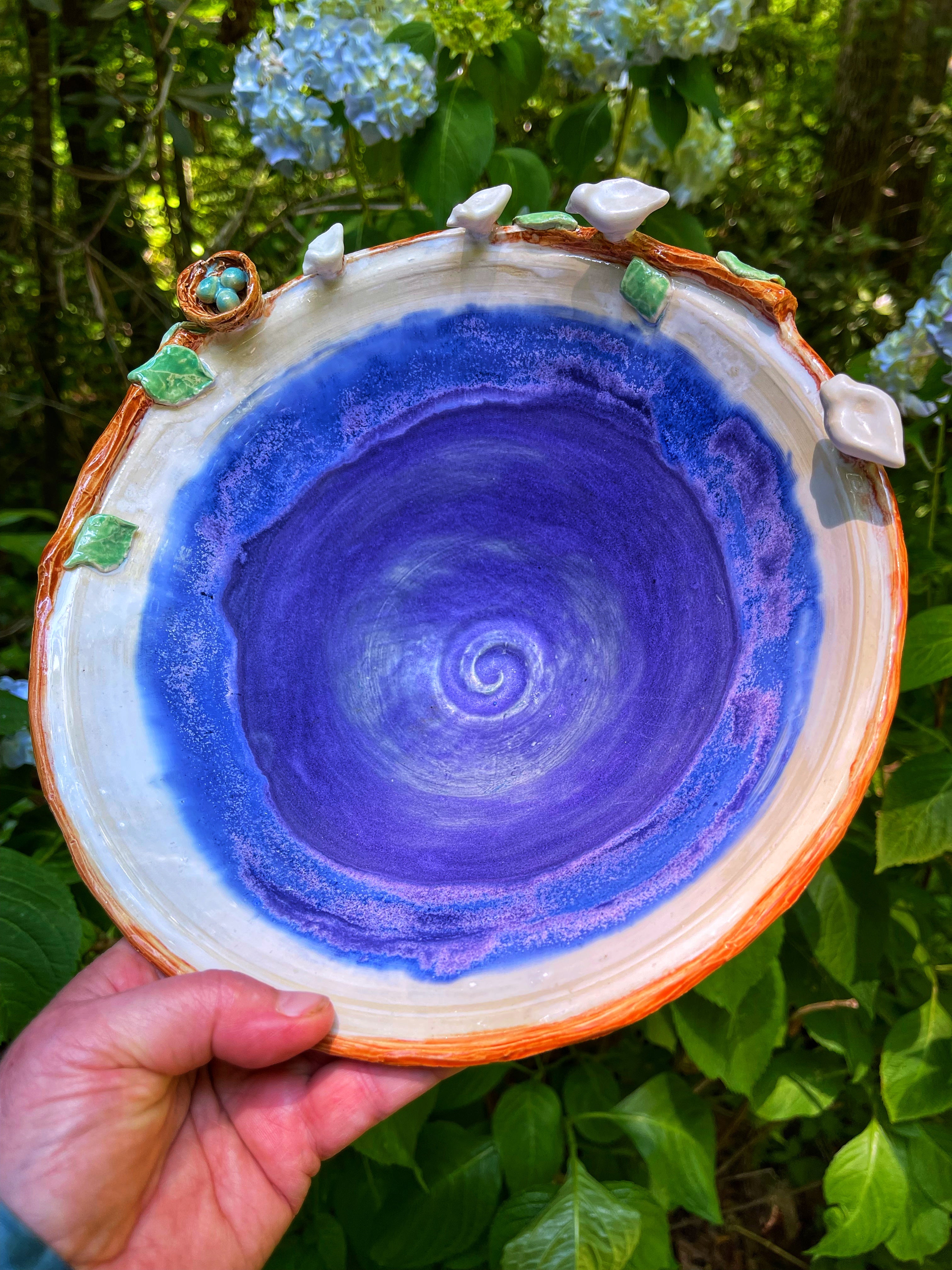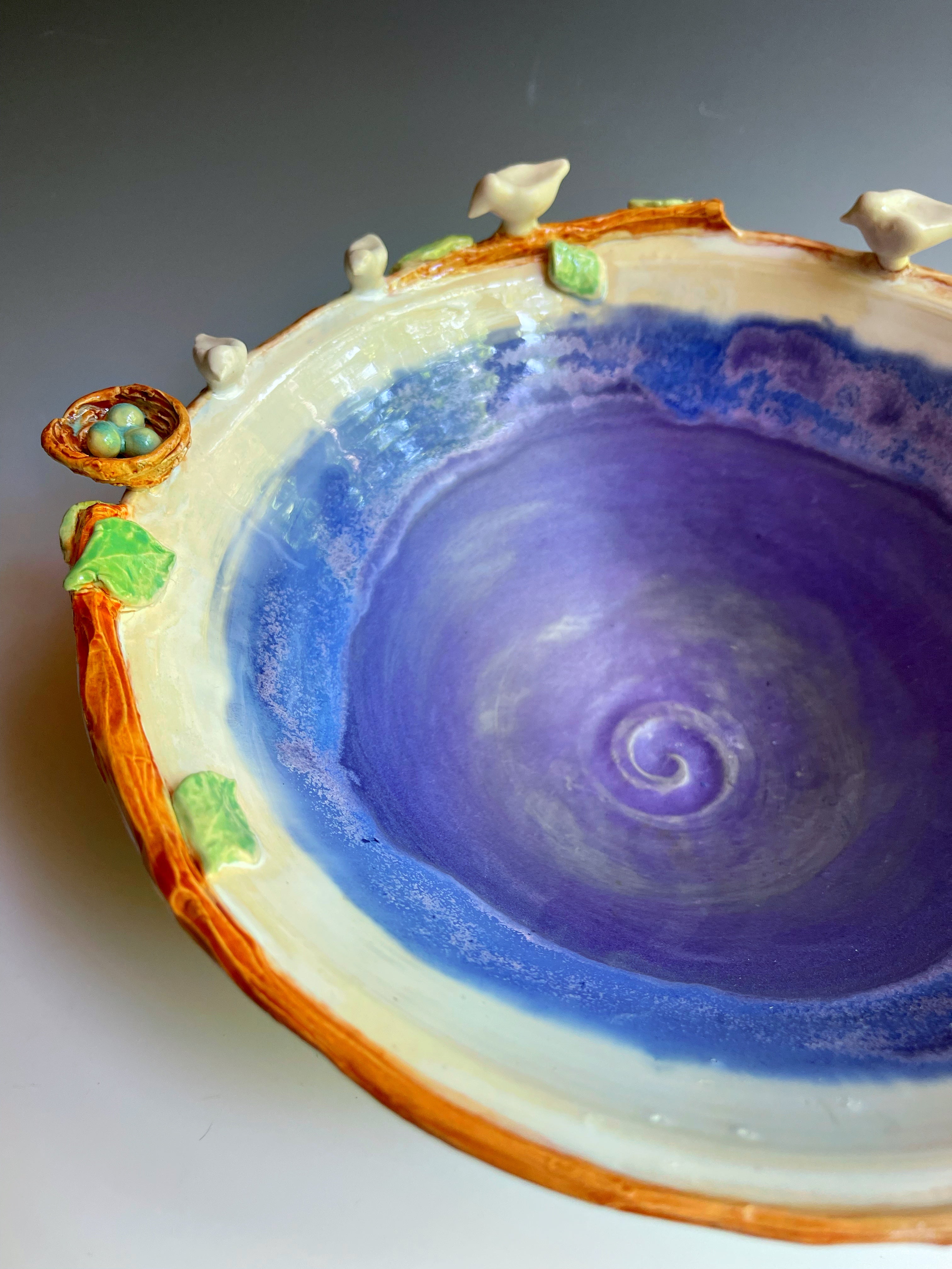 Textured tree branch rimmed bowl with a bird family and a nest with eggs glazed in multicolor microcrystalline glazes inside.