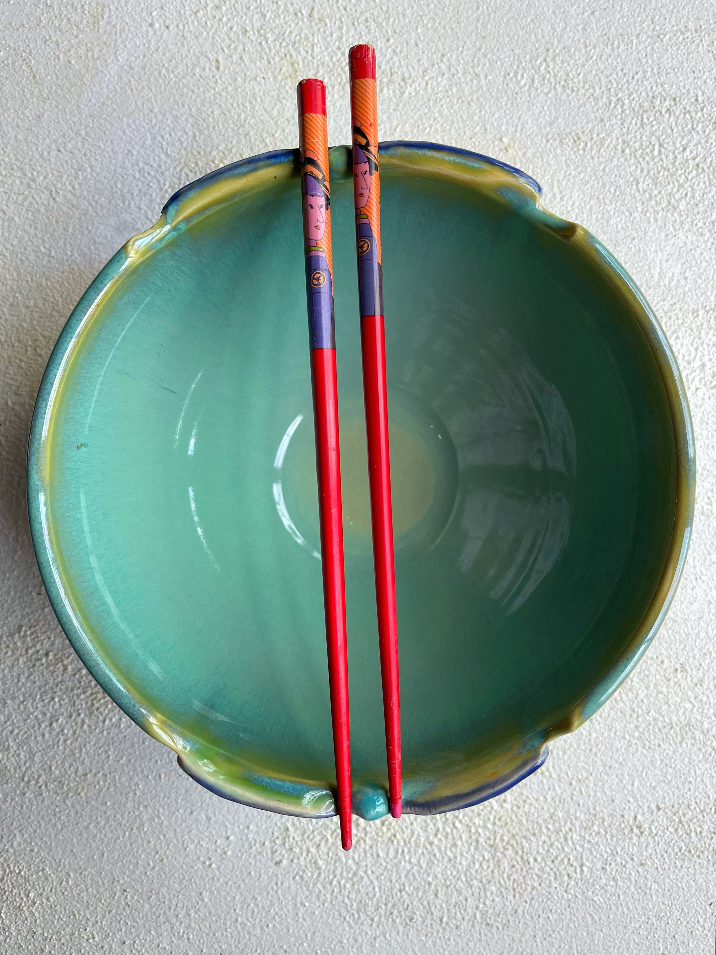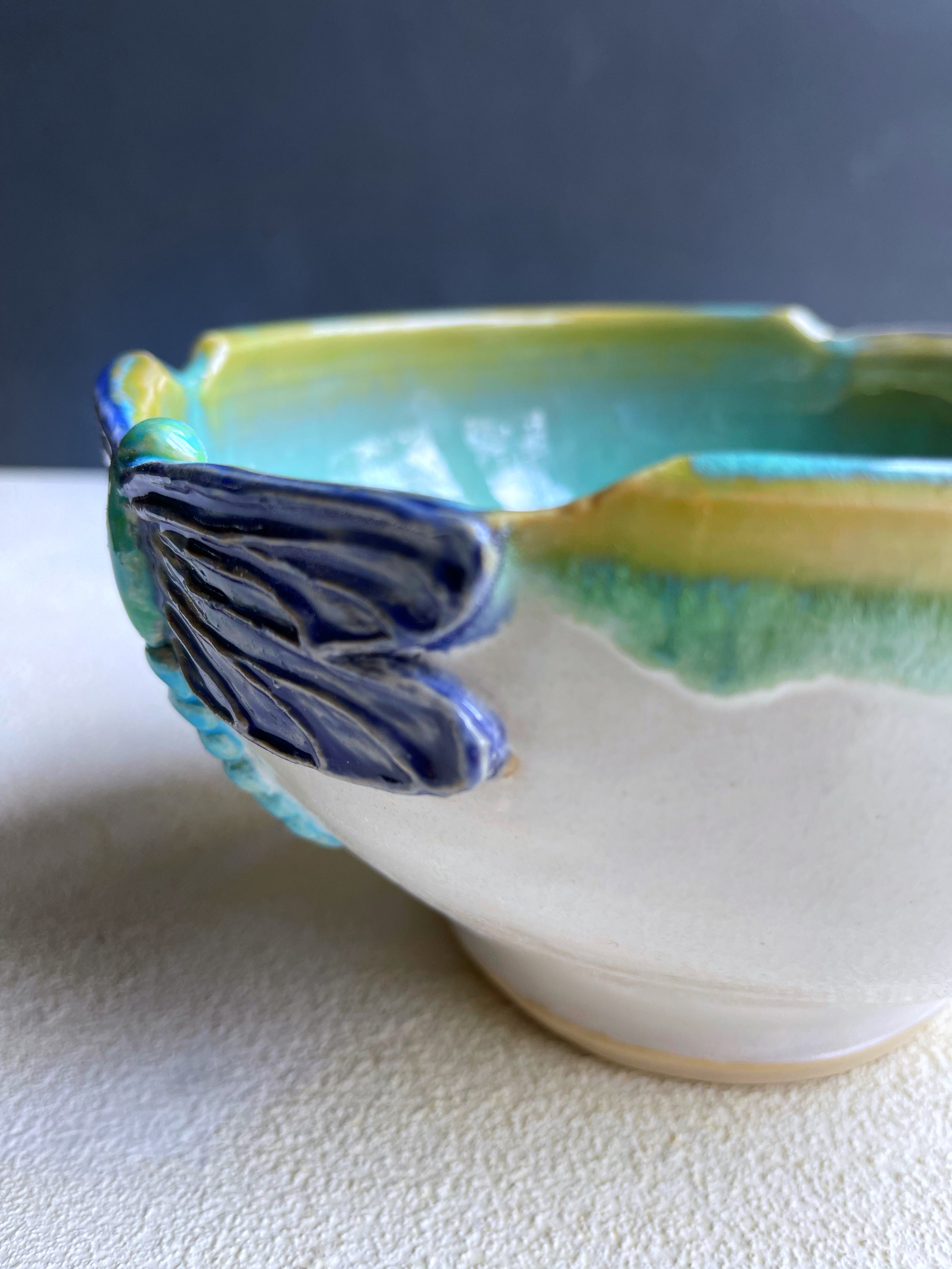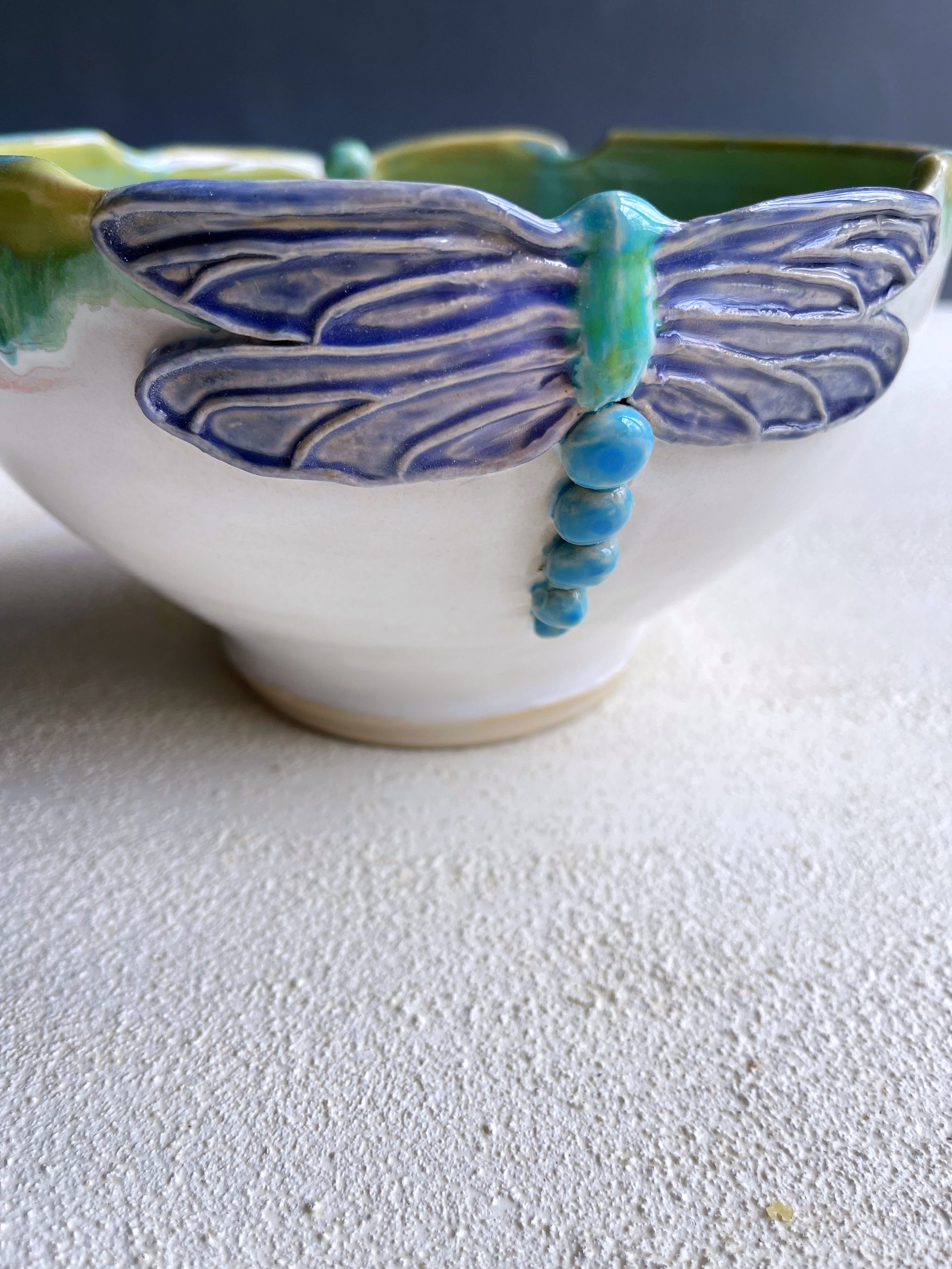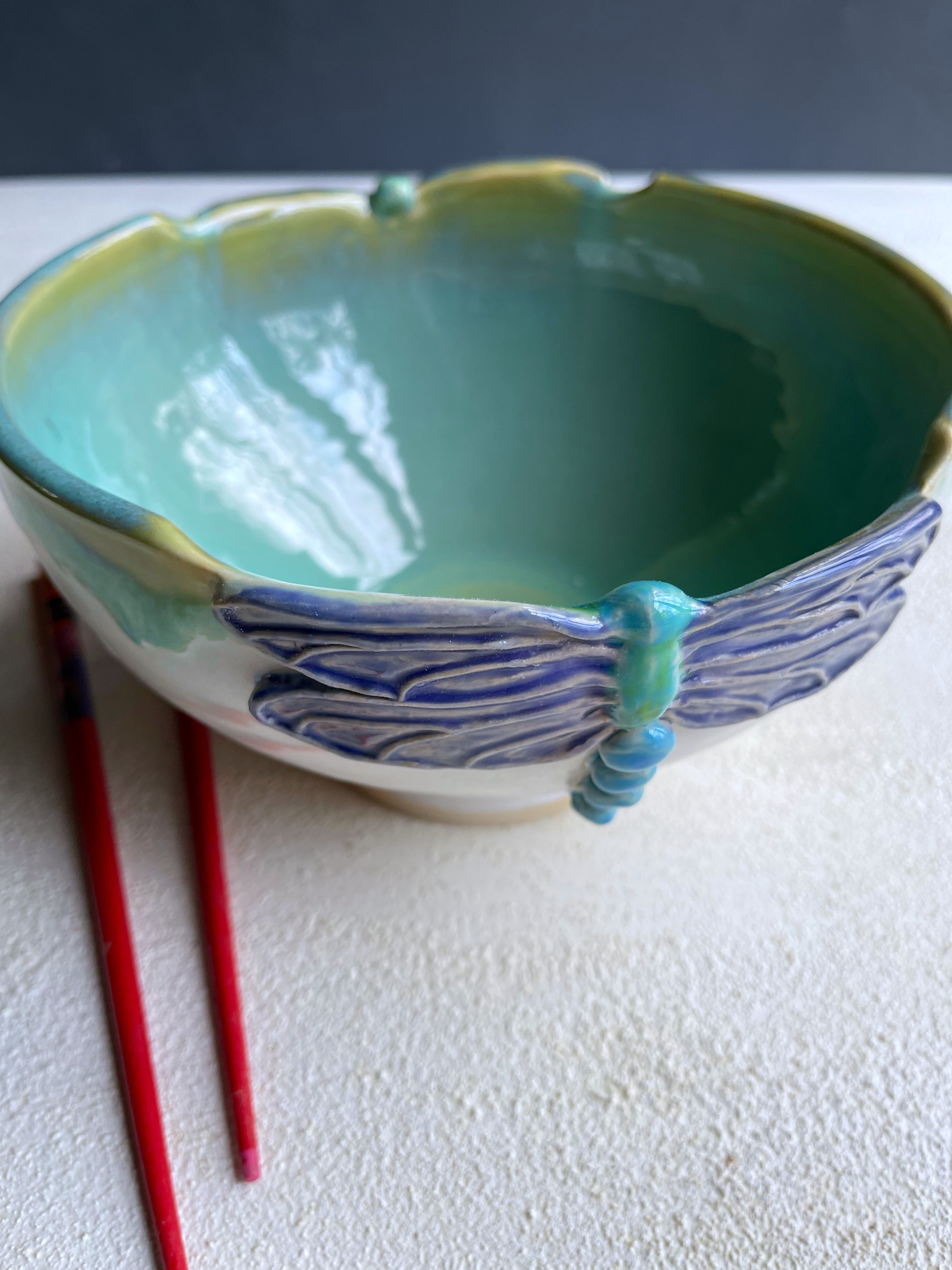 A serving bowl thrown on a wheel with hand sculpted dragonflies for chopstick rests. It also makes a serving bowl.