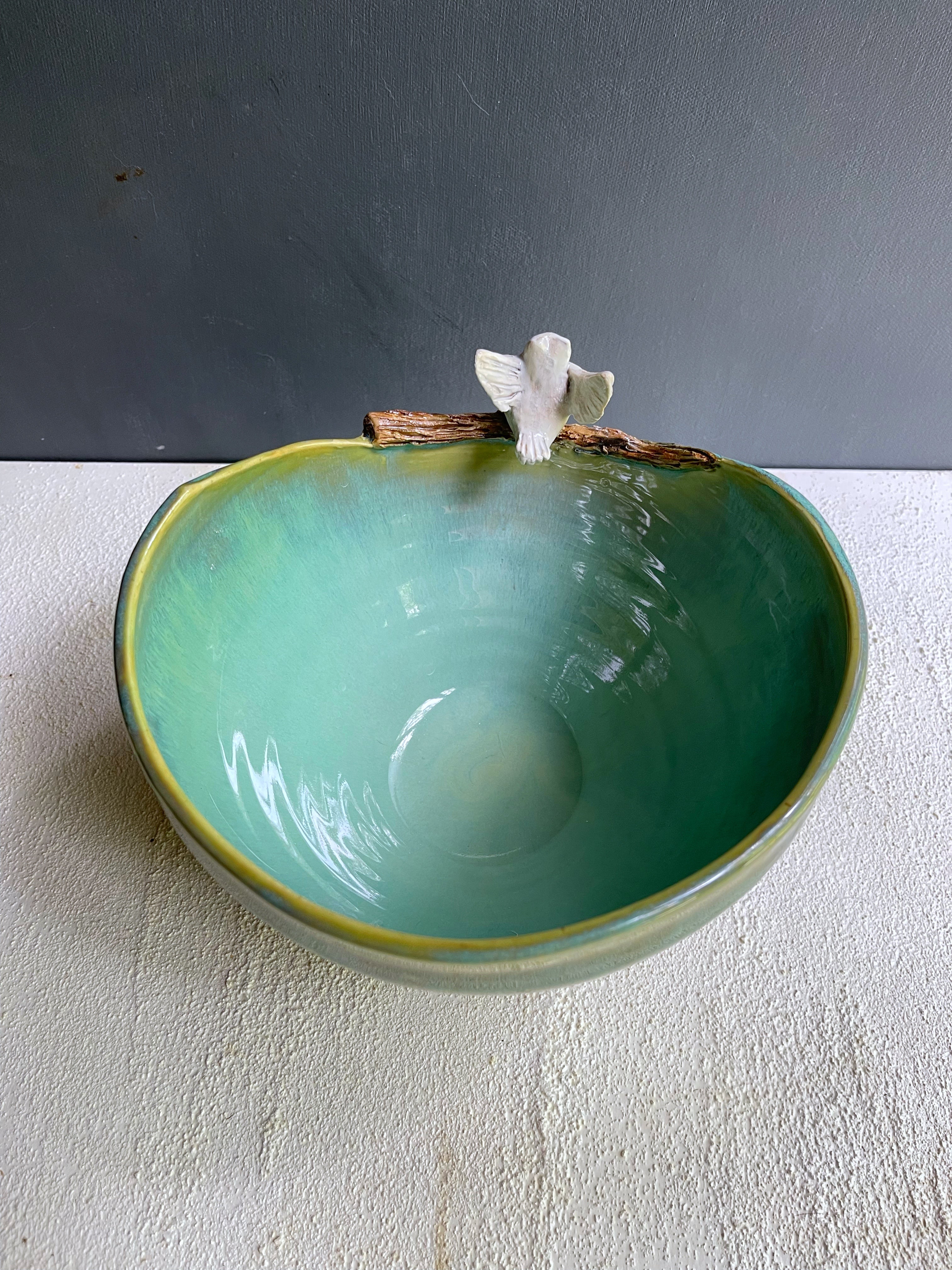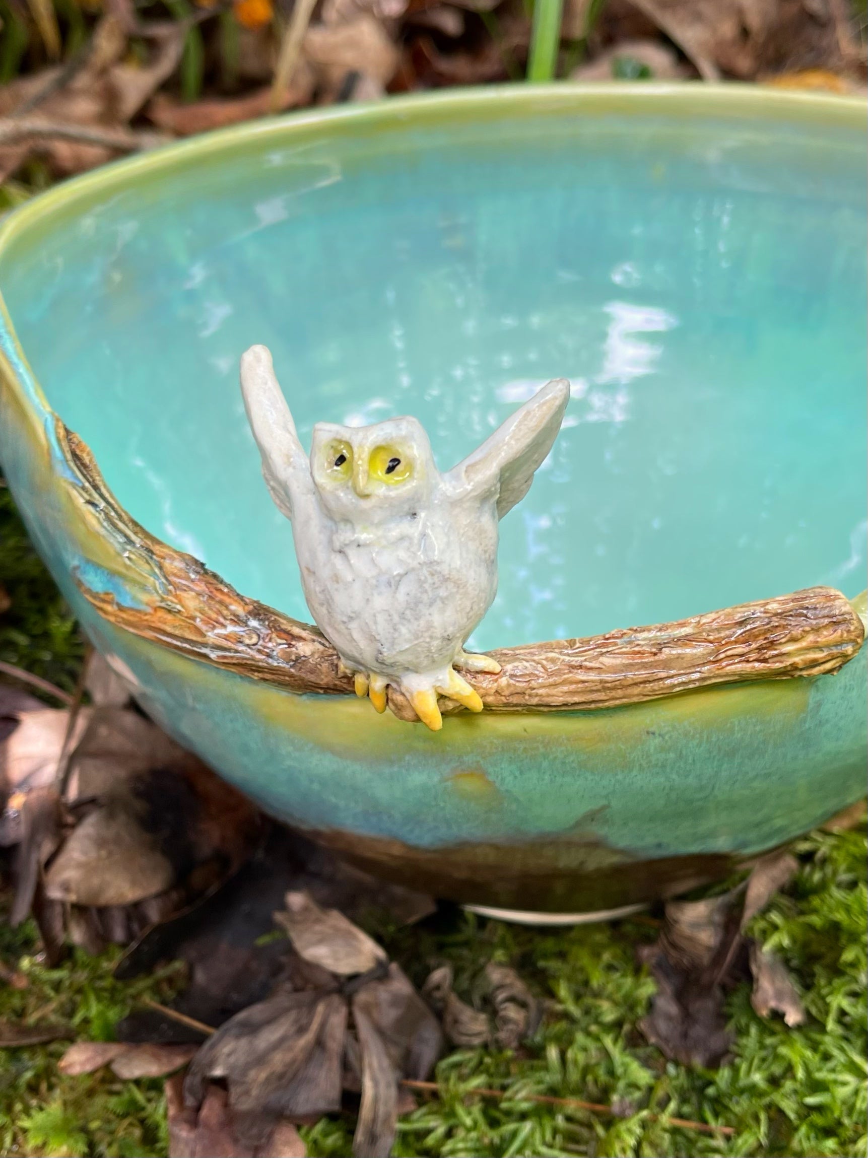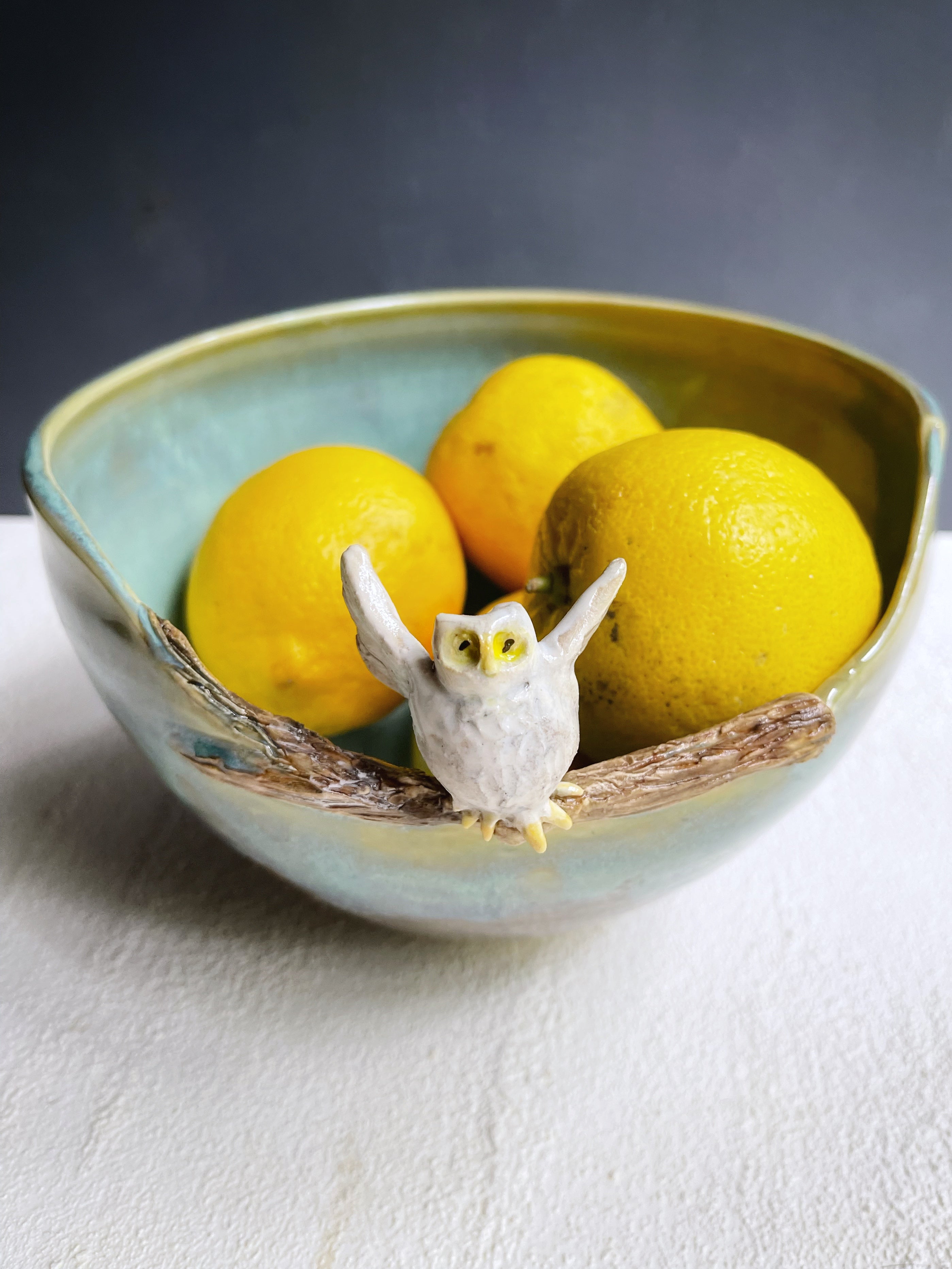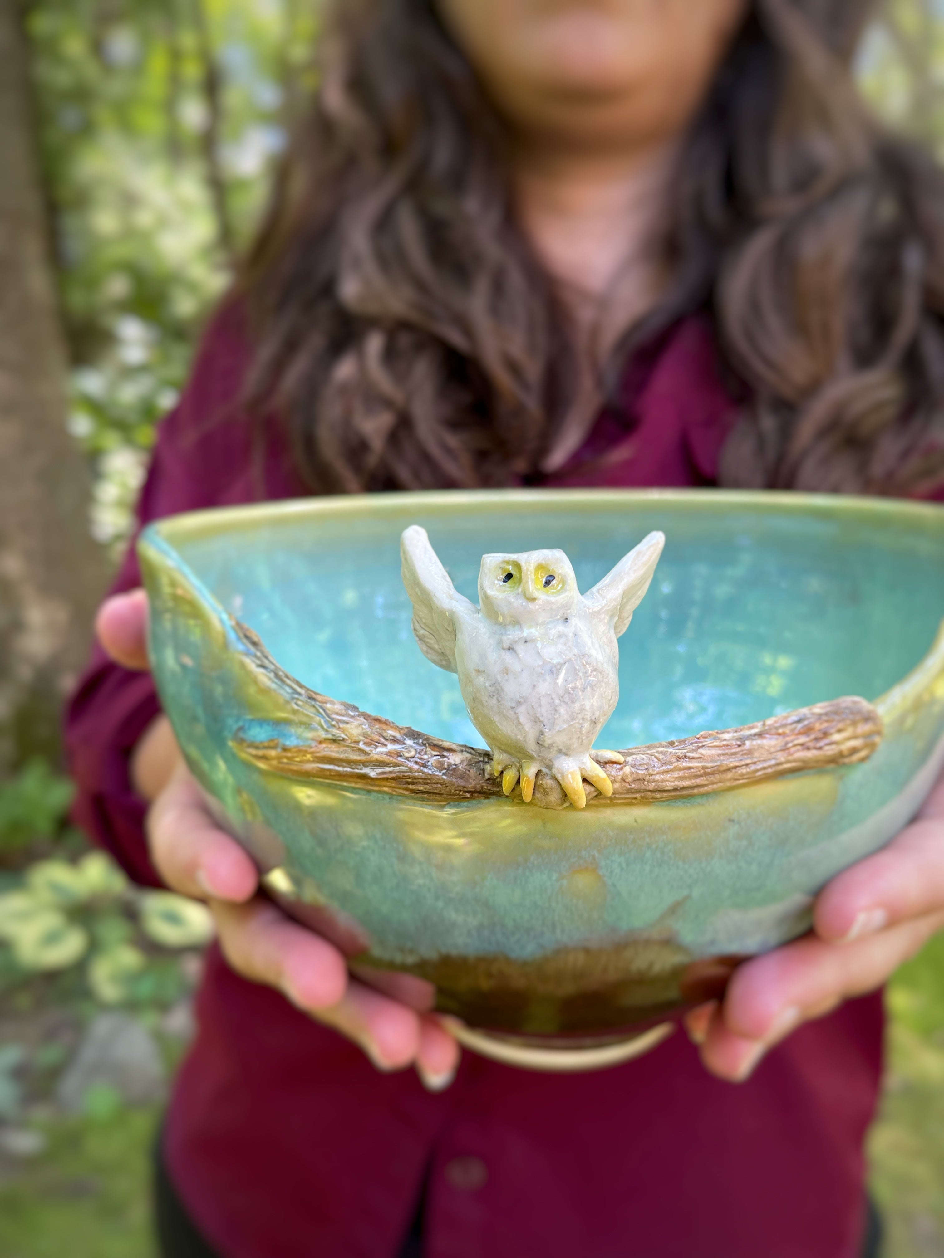 A serving bowl thrown on a wheel with hand sculpted owl perched on a limb. Beautiful details and character.