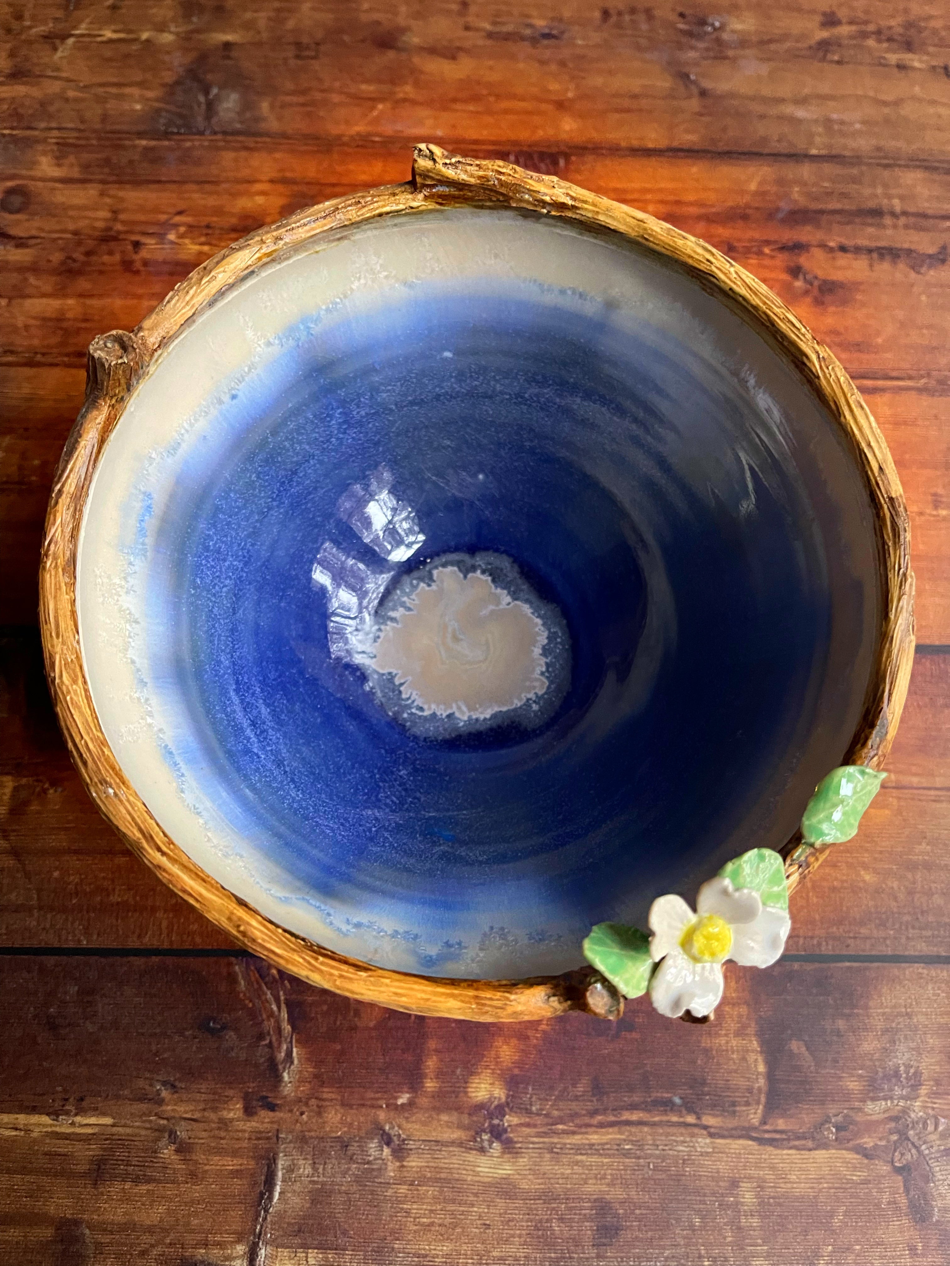 Wheel thrown bowl with dogwood bloom and spectacular glazes!