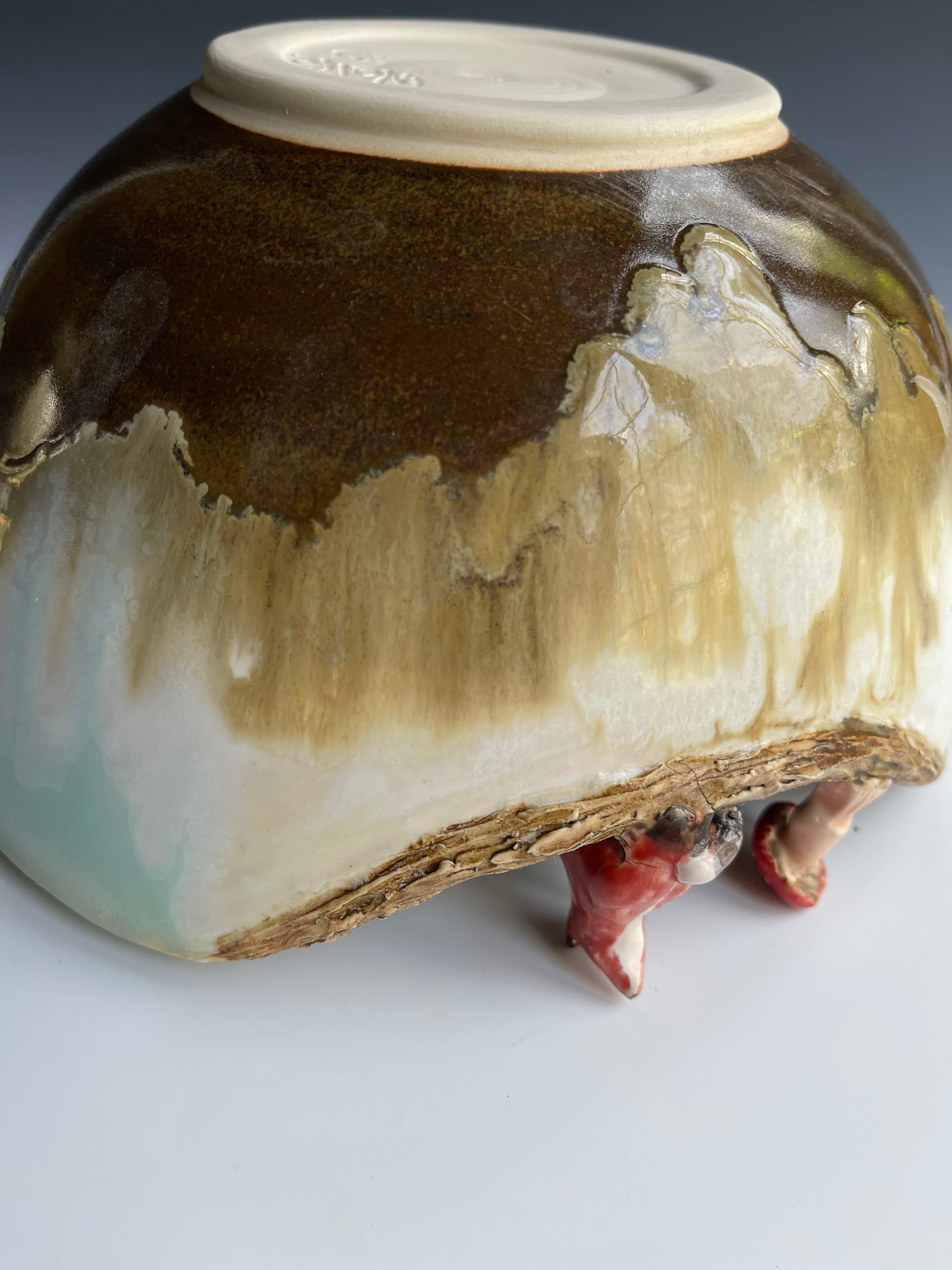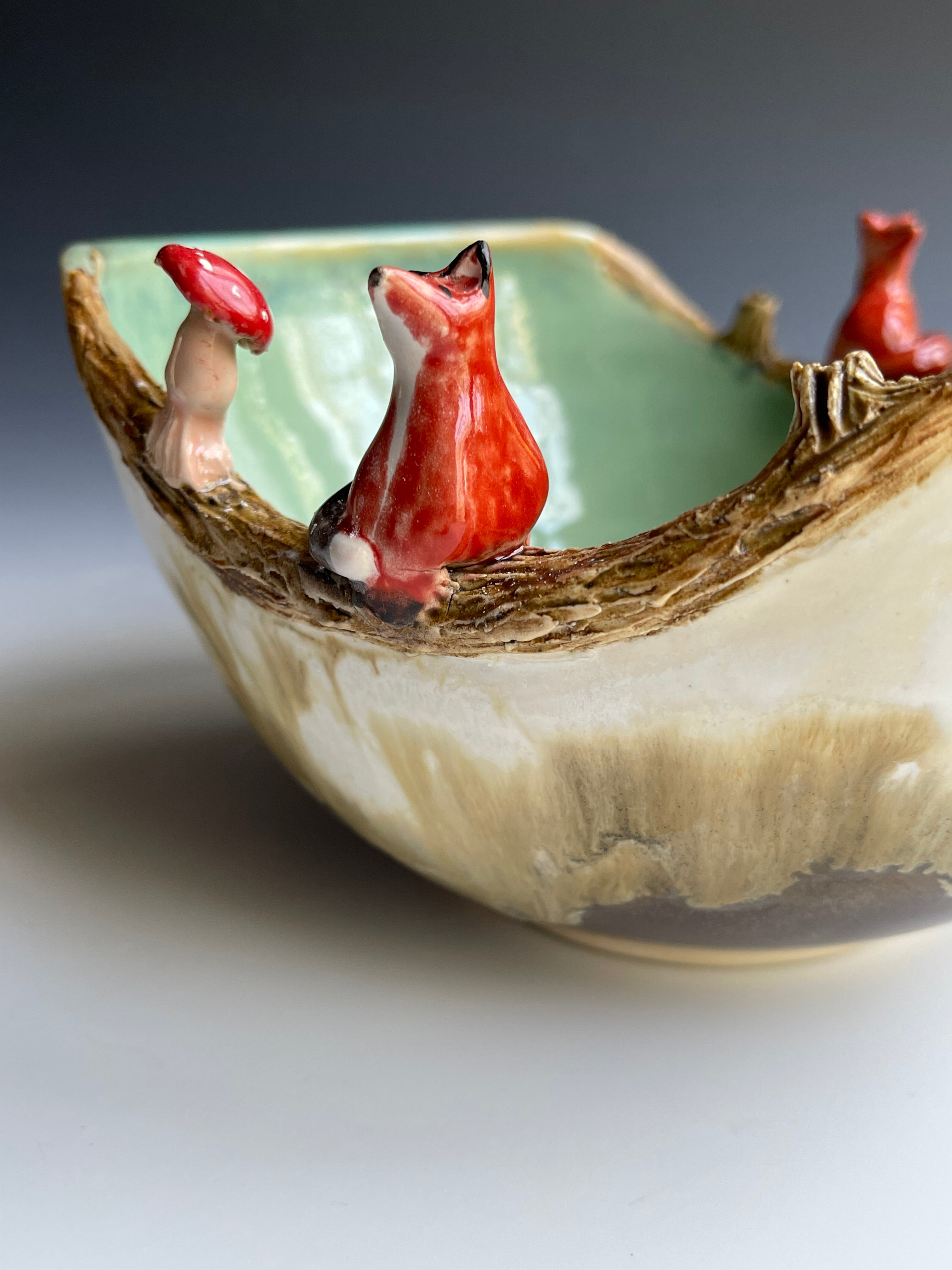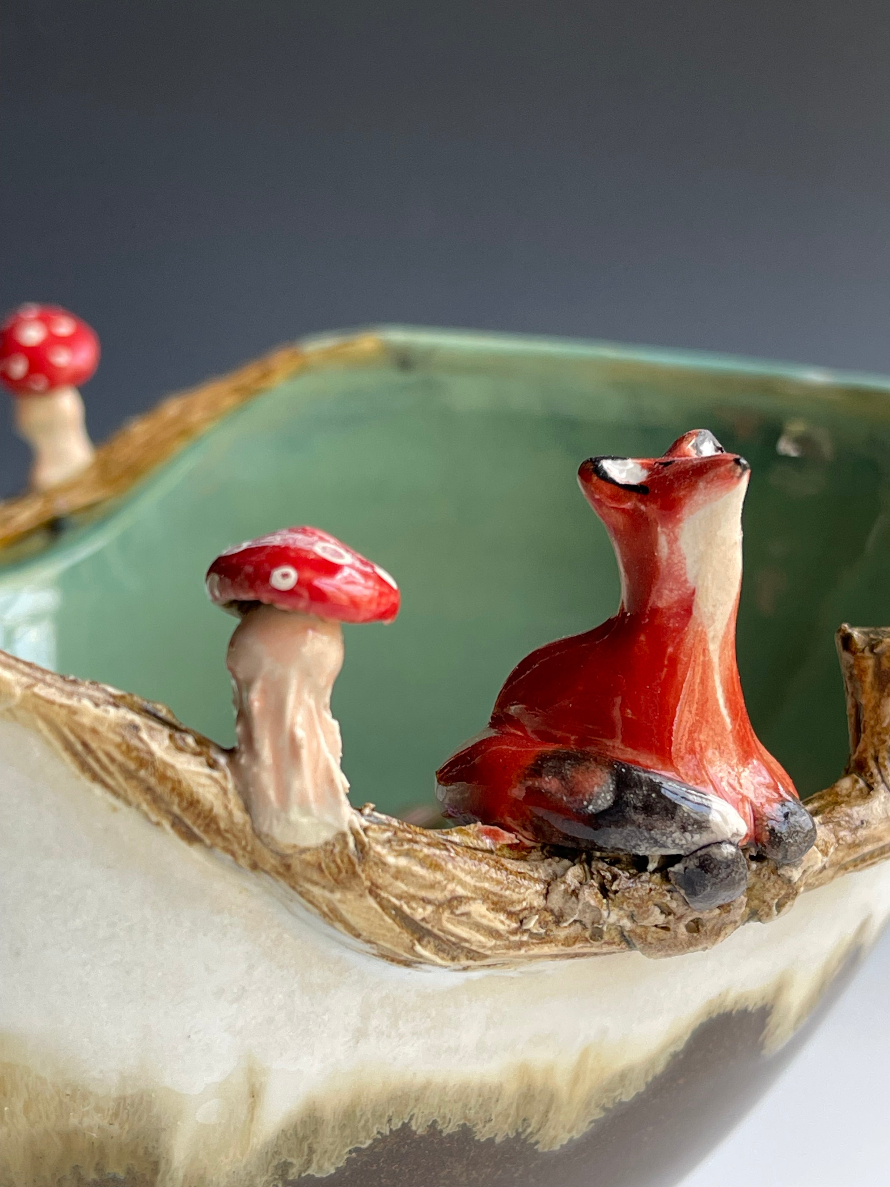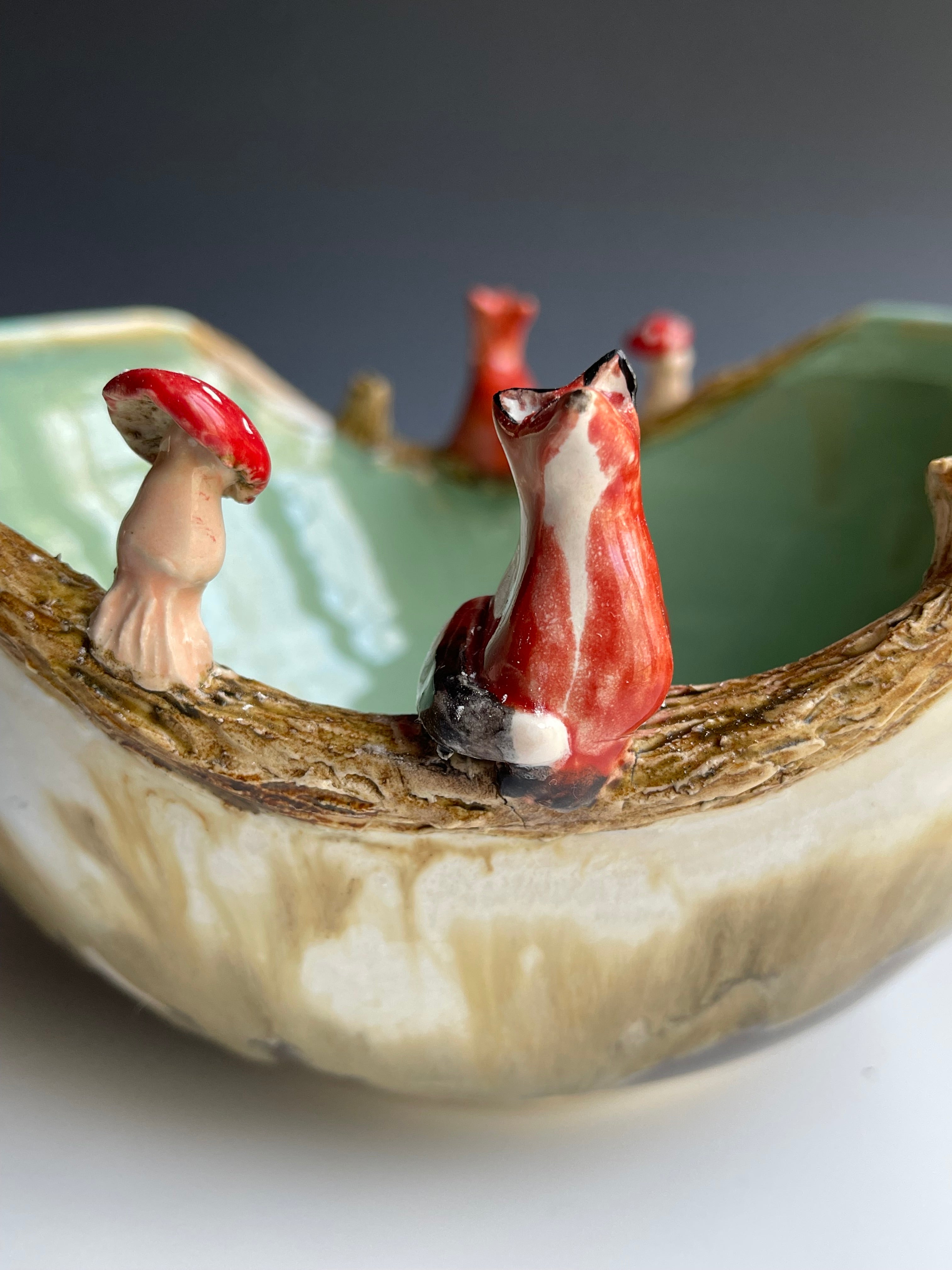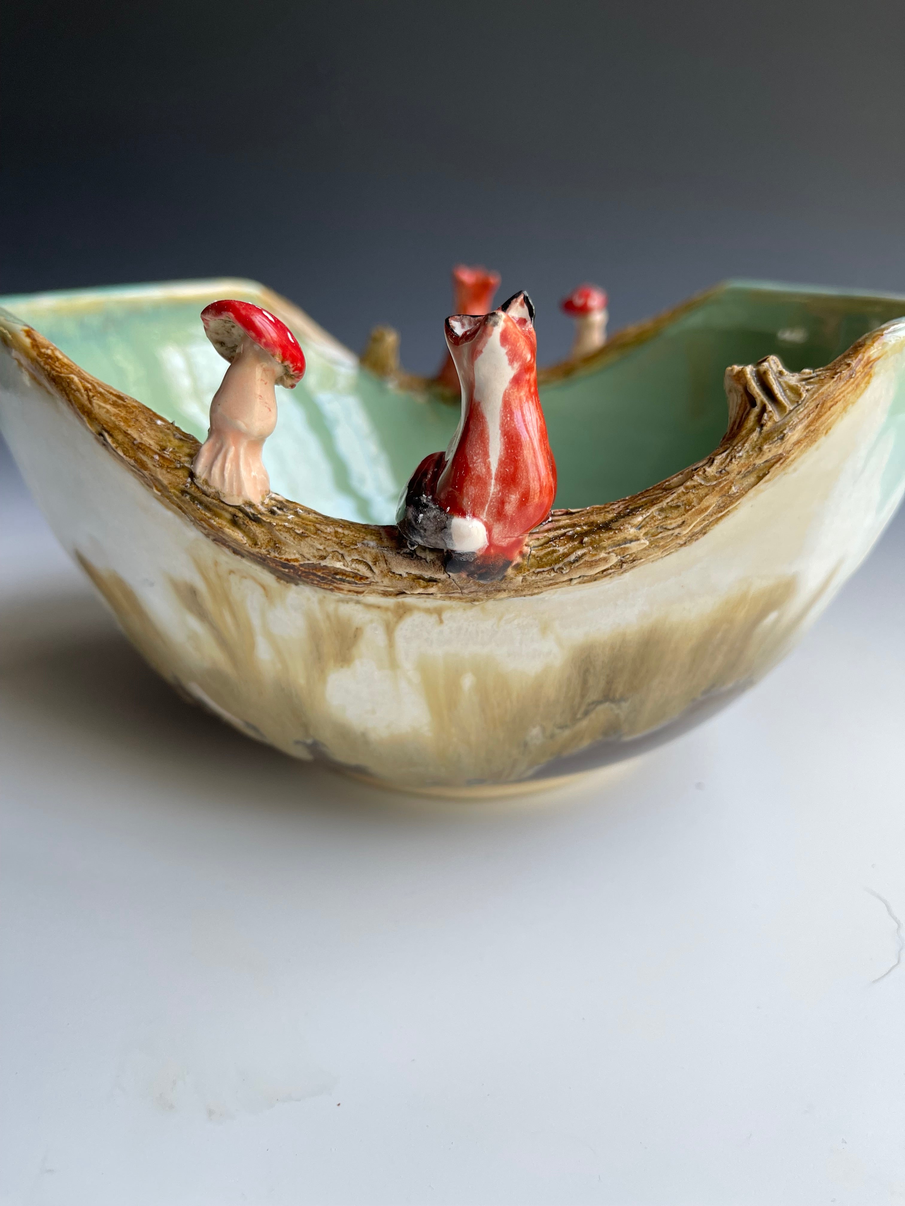 A hand sculpted fox wits a mushroom perch on a log. Same scene on opposite sides.This special piece may be used as a centerpiece or as a serving bowl. As a spirit animal the fox is a guardian and brings your cunning intuitive insights.