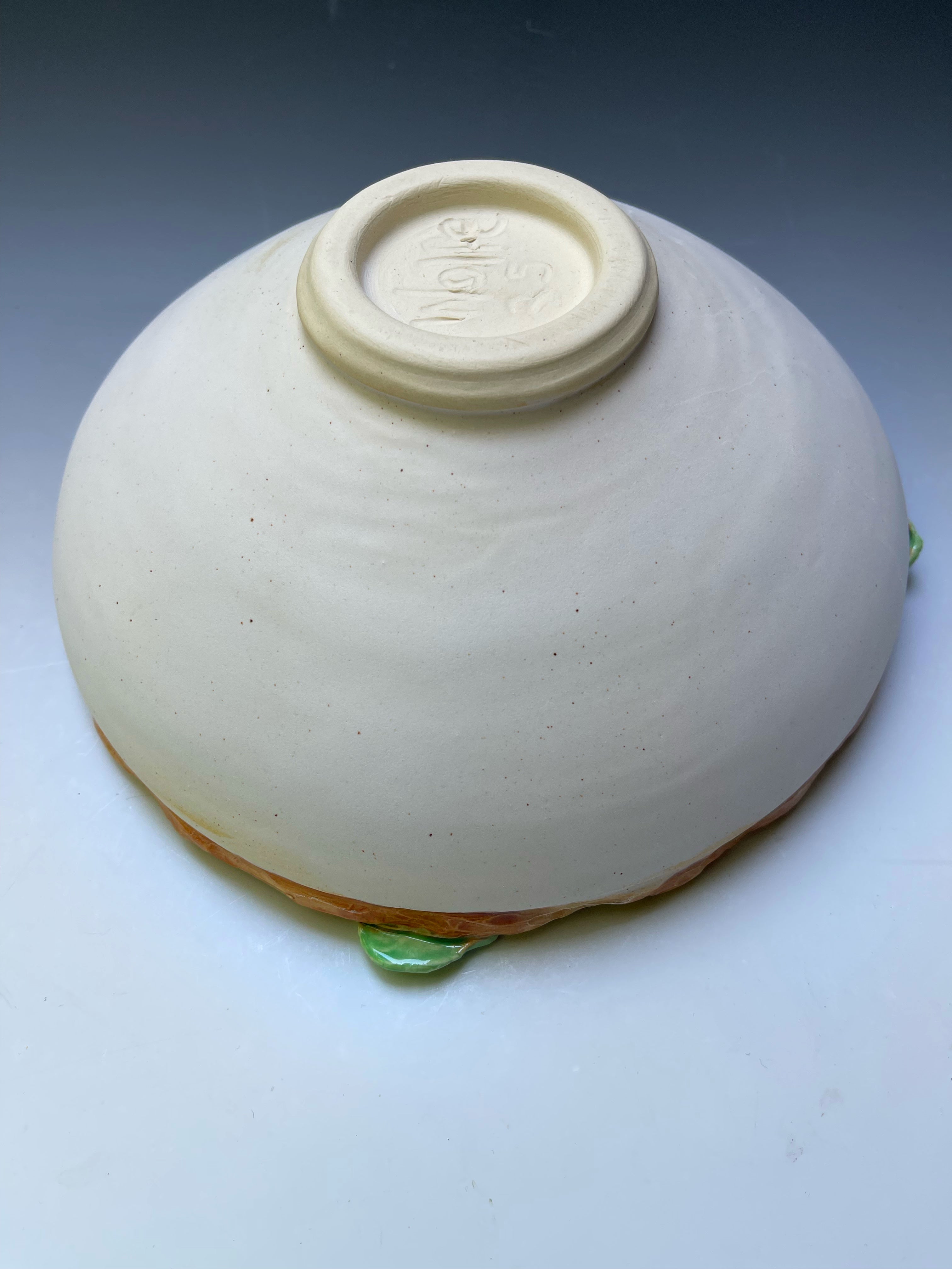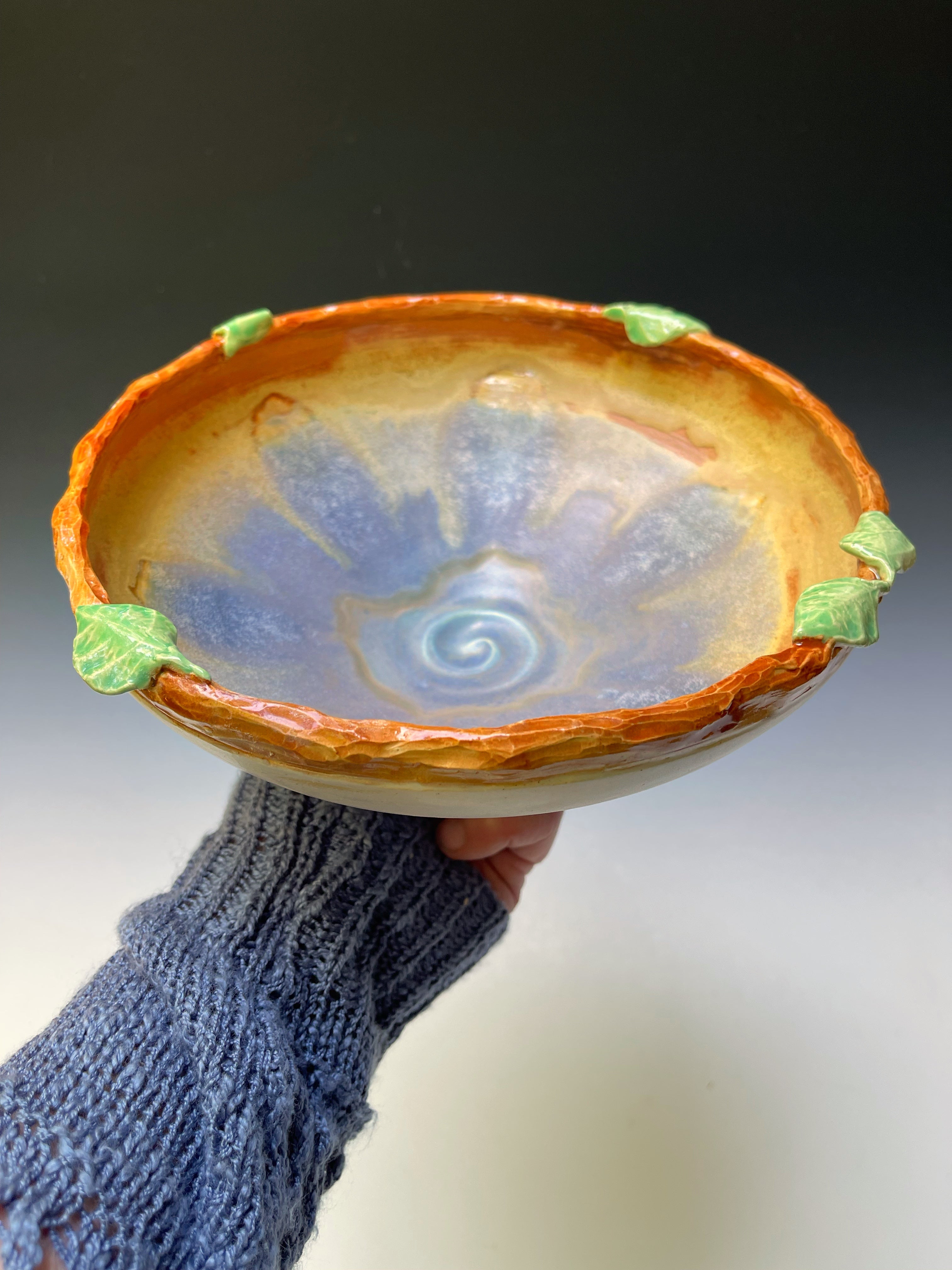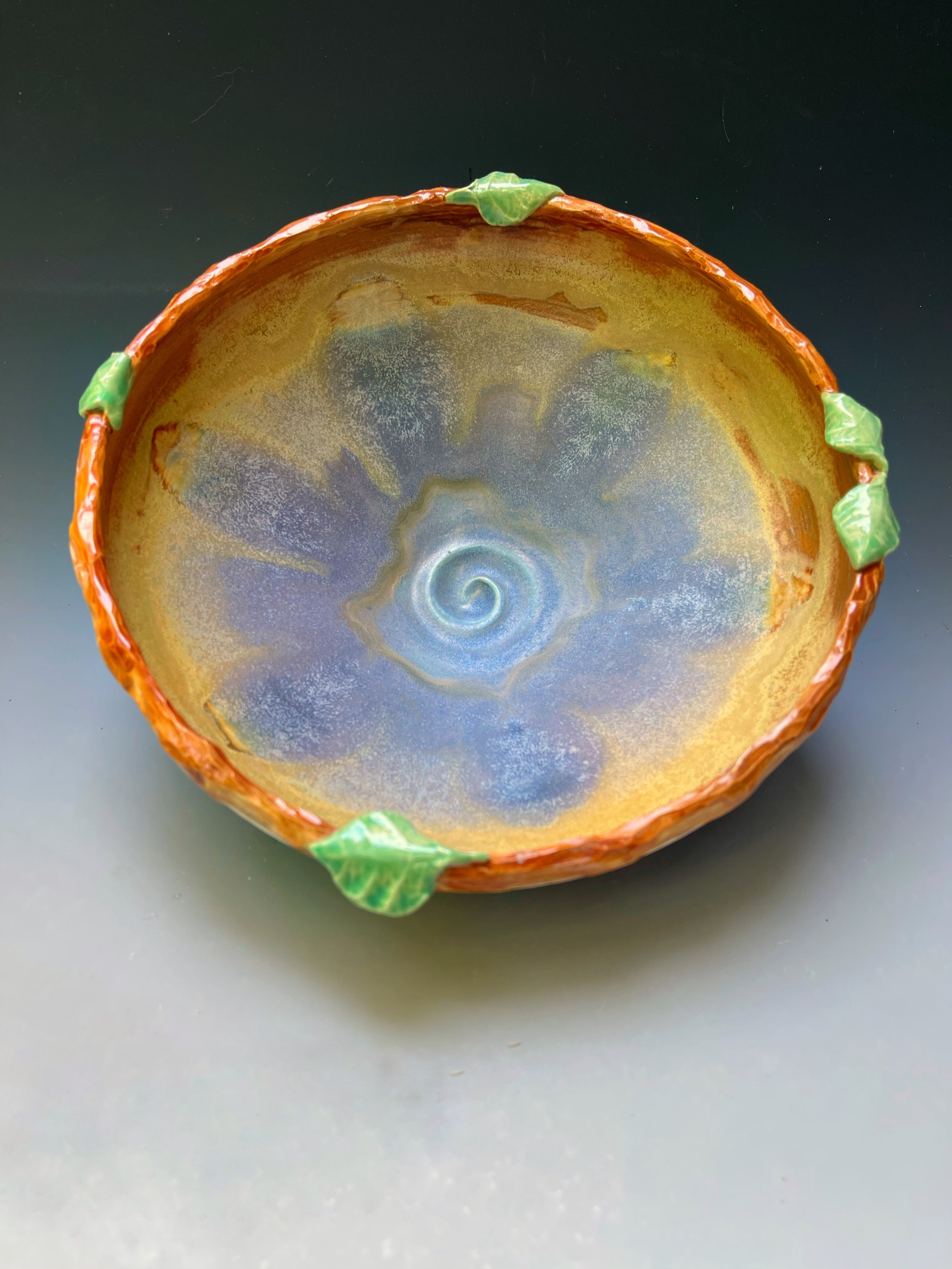 gorgeous mandala glaze inside functional bowl with tree branch and leaves sculptured on rim