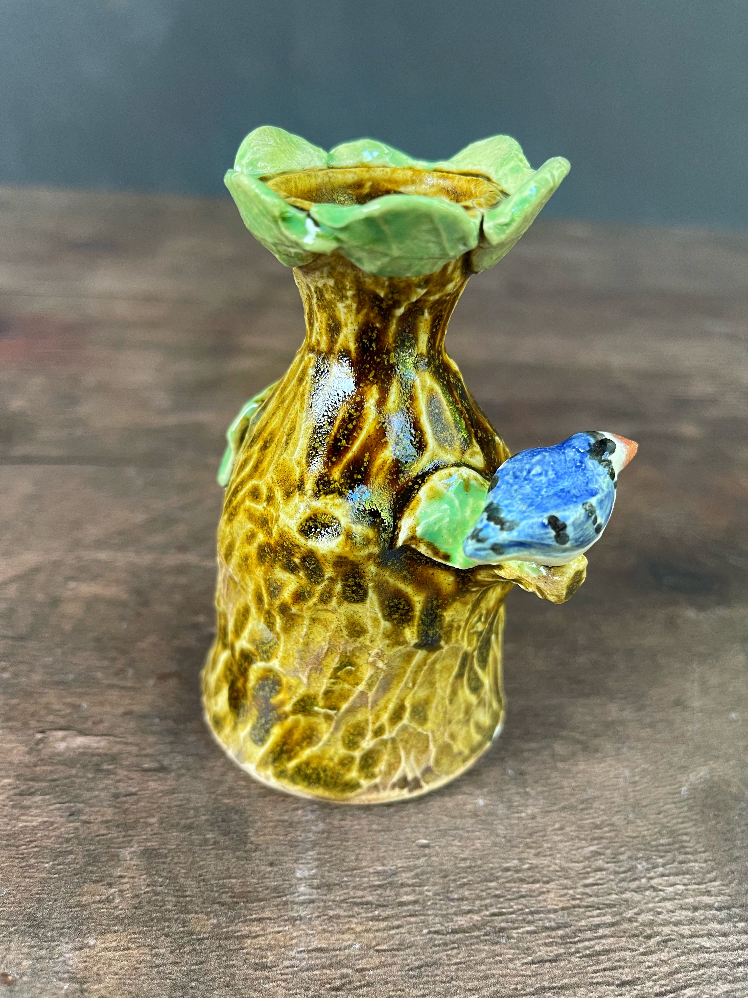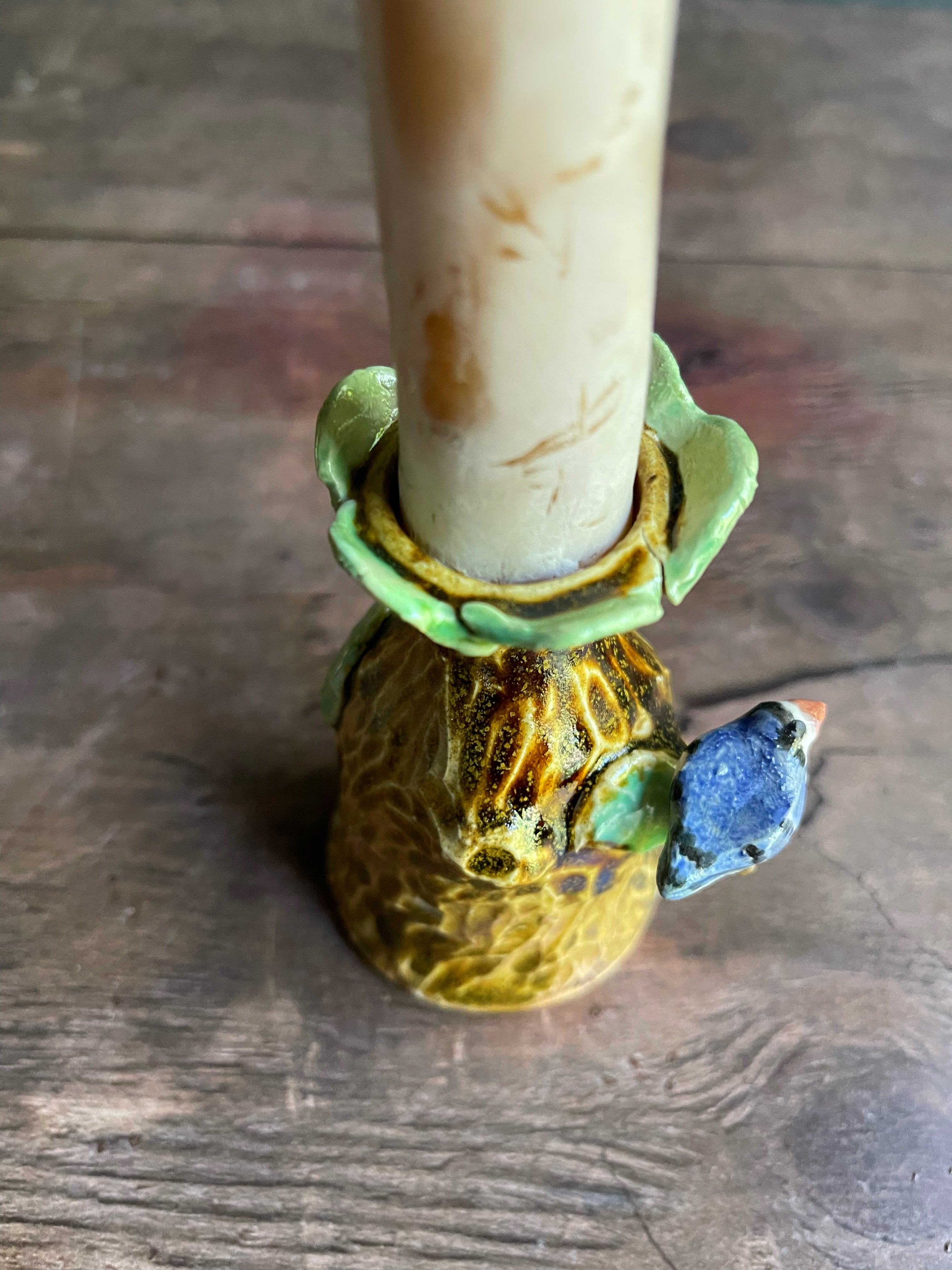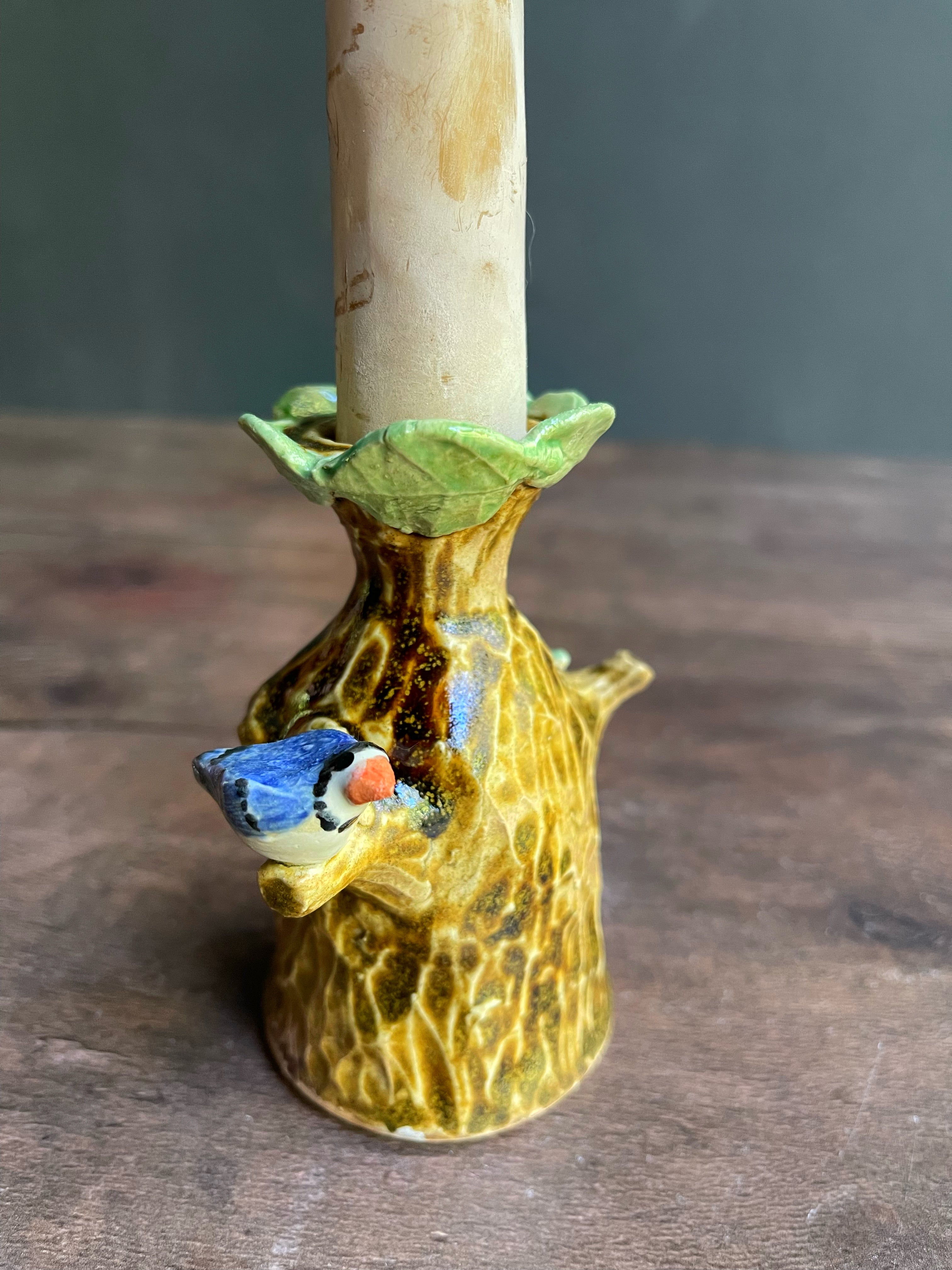 a beautiful blue jay on a carved tree branch candlestick holds a taper candle of any size. This is a prototype, offered at an introductory price so scoop it up if you like it!