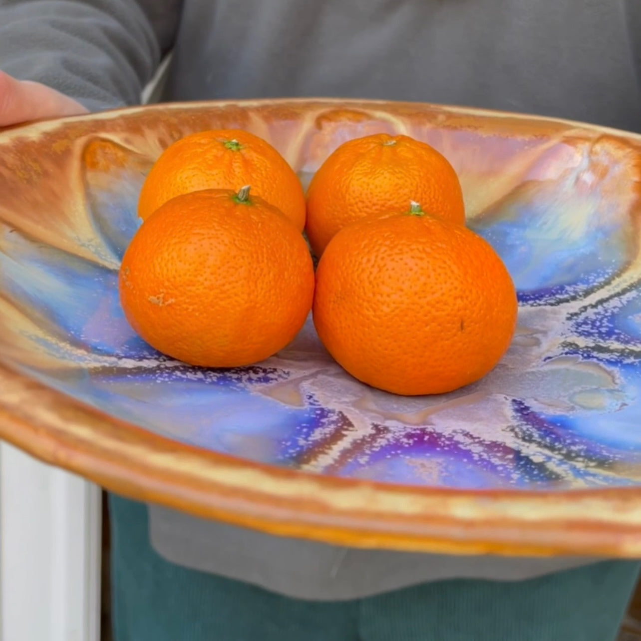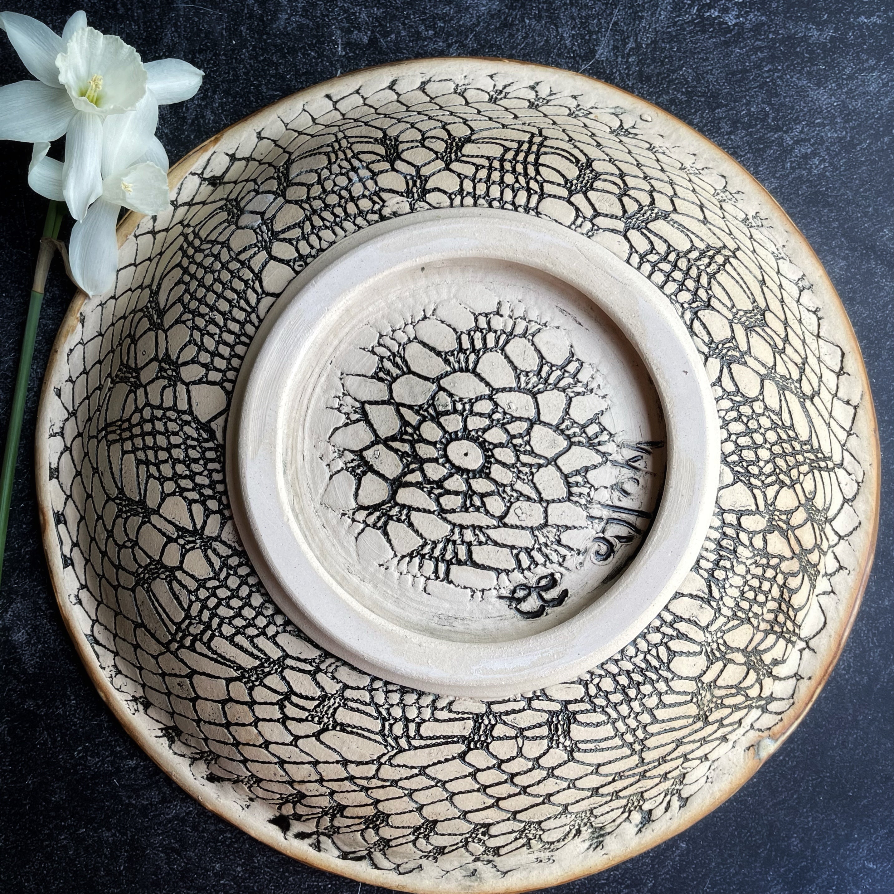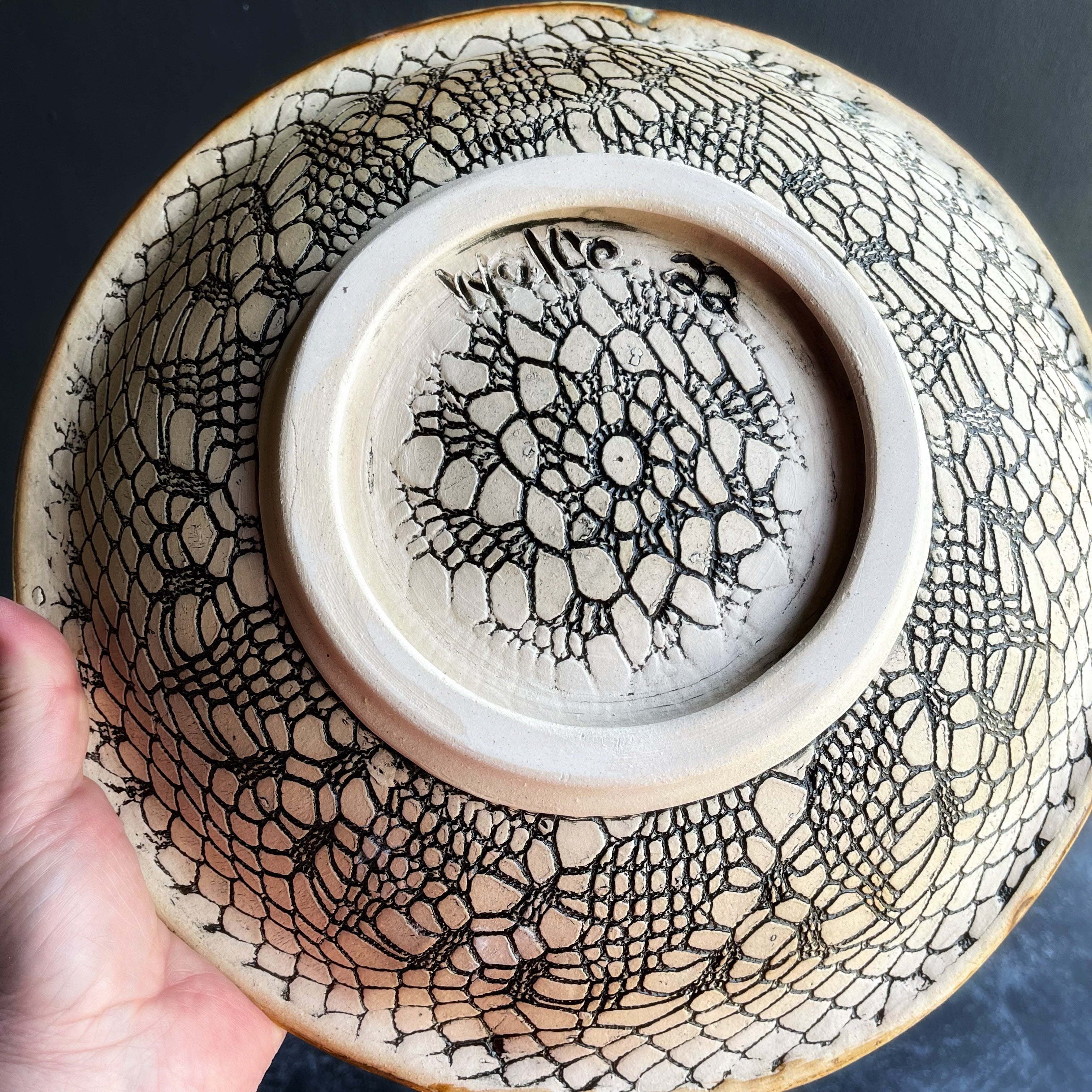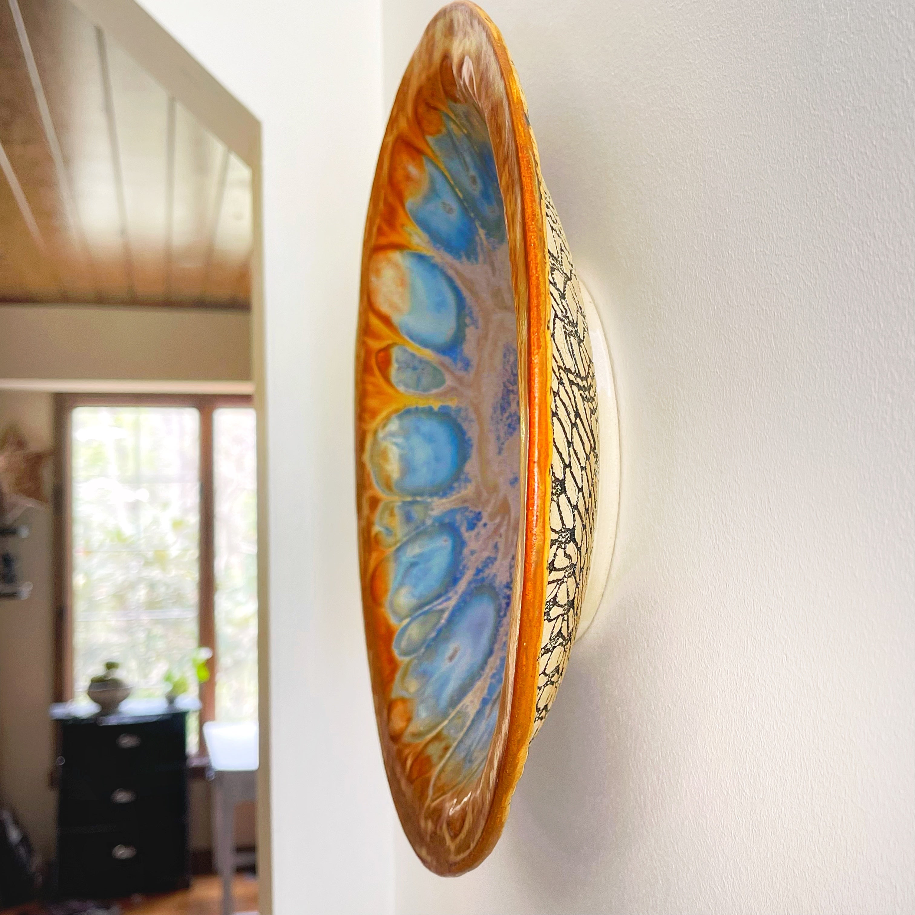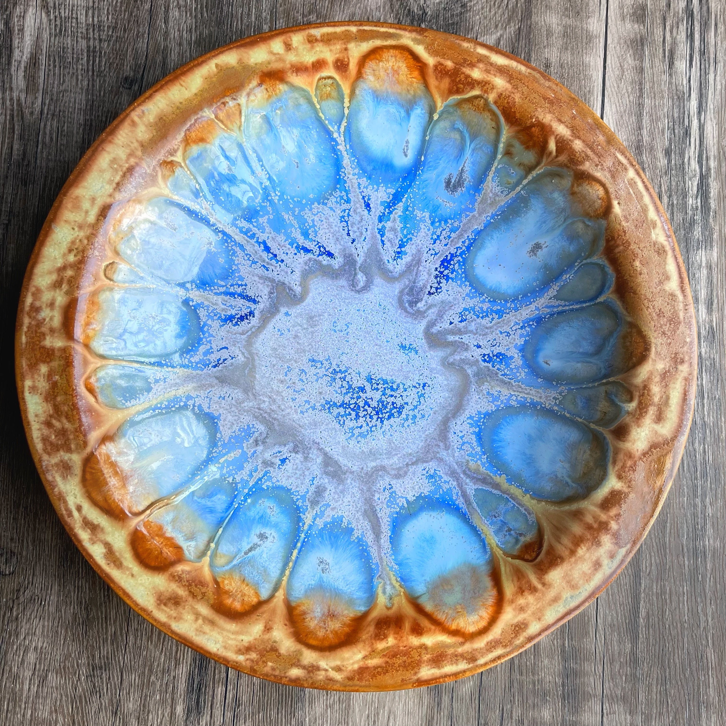 The glazes flow to create a mandala or flower shape with beautiful microcrystals. The back has a spectacular lace pattern. This textured pattern is visible from the side if hung on a wall or under the rim. This is one spectacular platter.