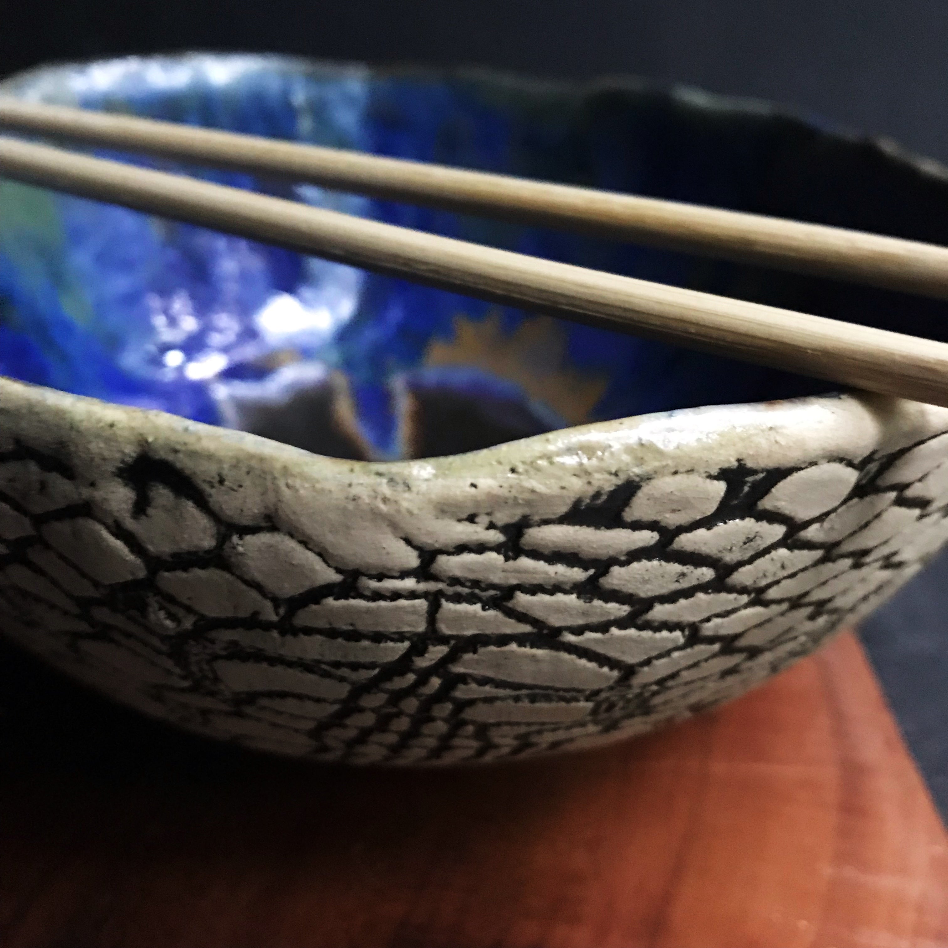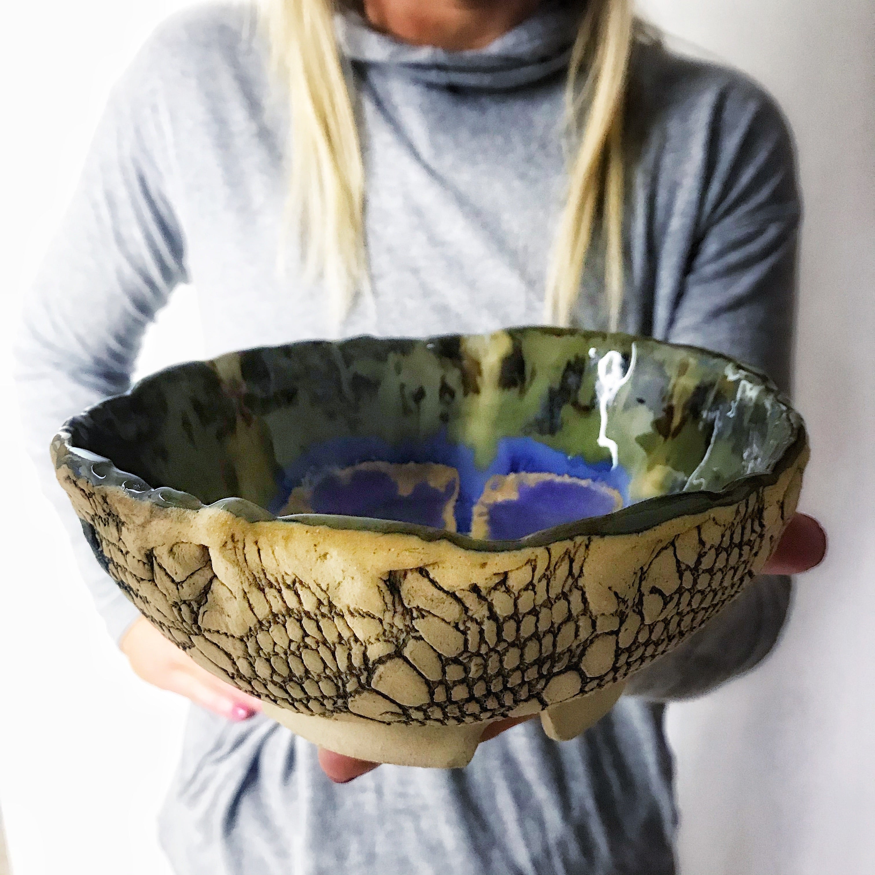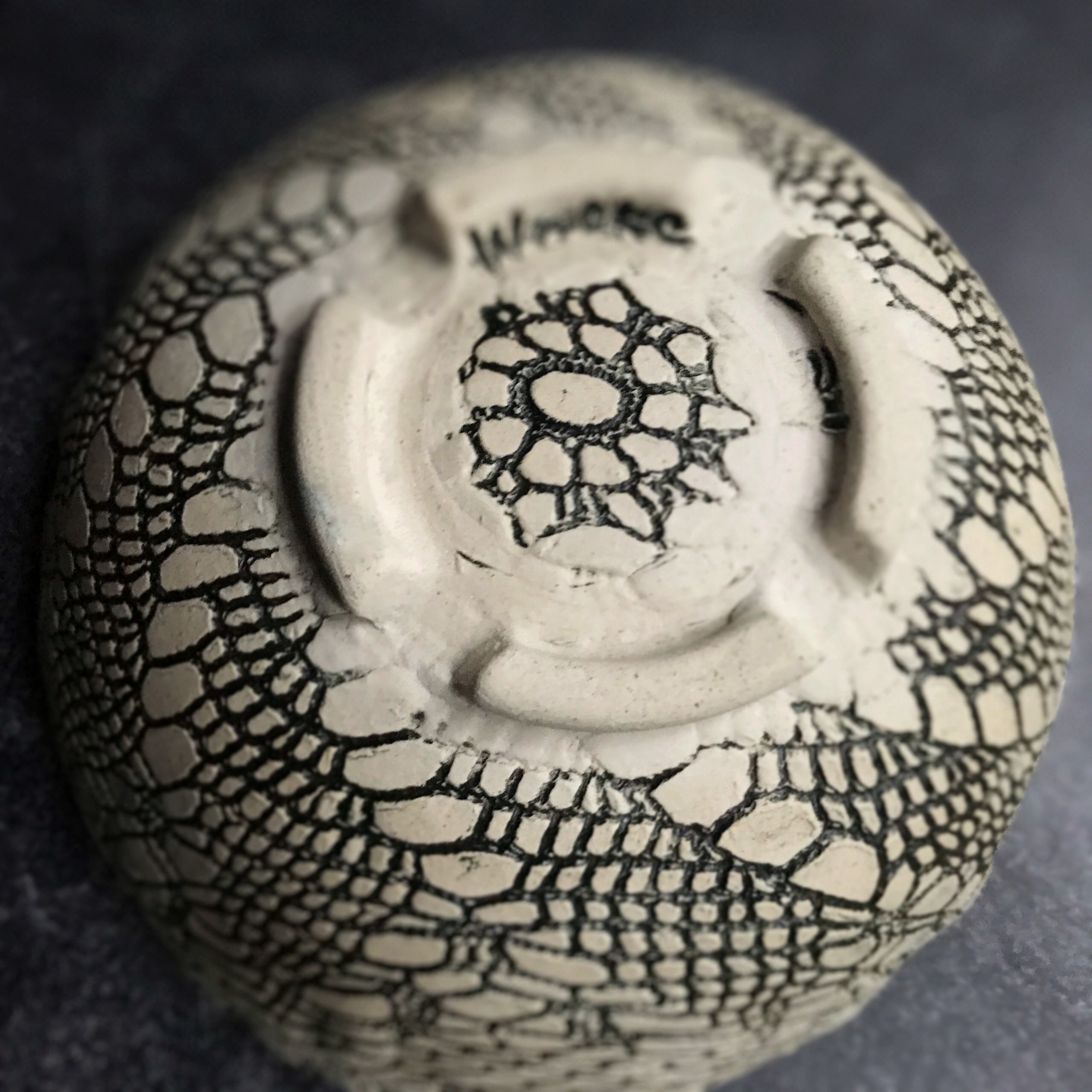 My rustic ceramic bowl collection marries sculpture with functional serving, and gives your table something as organic and nourishing as the food you serve. The outer texture is made by pressing my Nana's old crochet lace tablecloth into the wet clay. The texture is accented by an iron oxide, permanently fired into the piece.