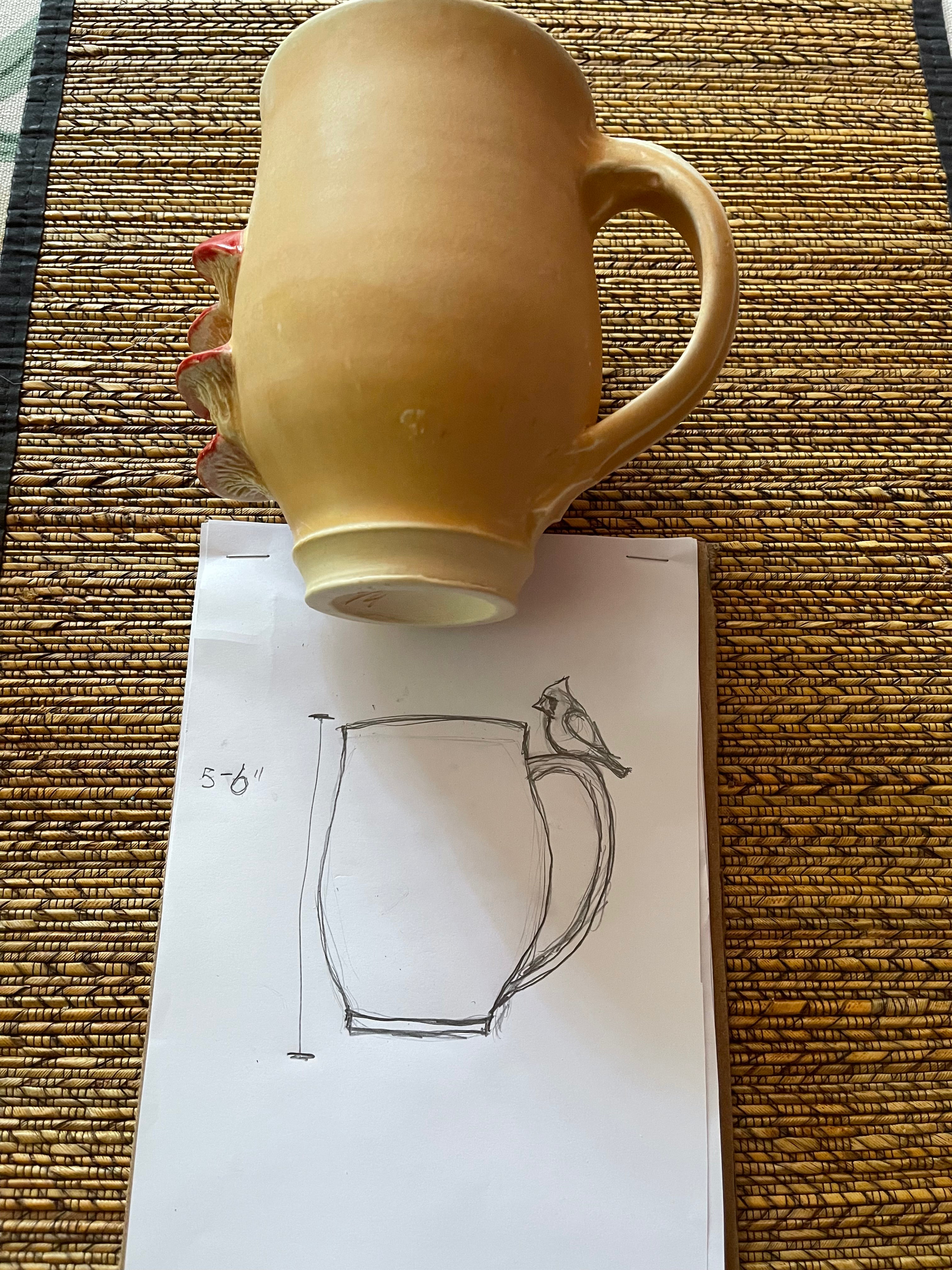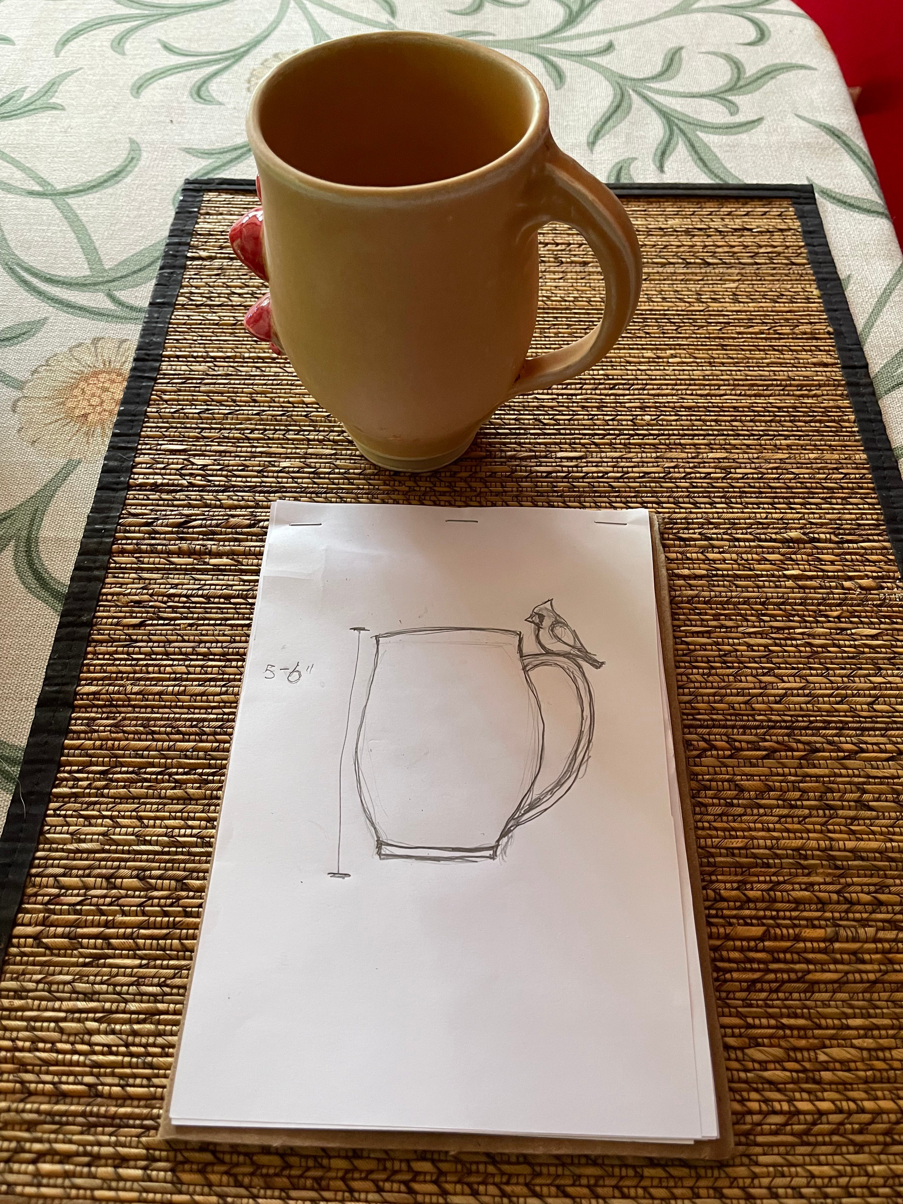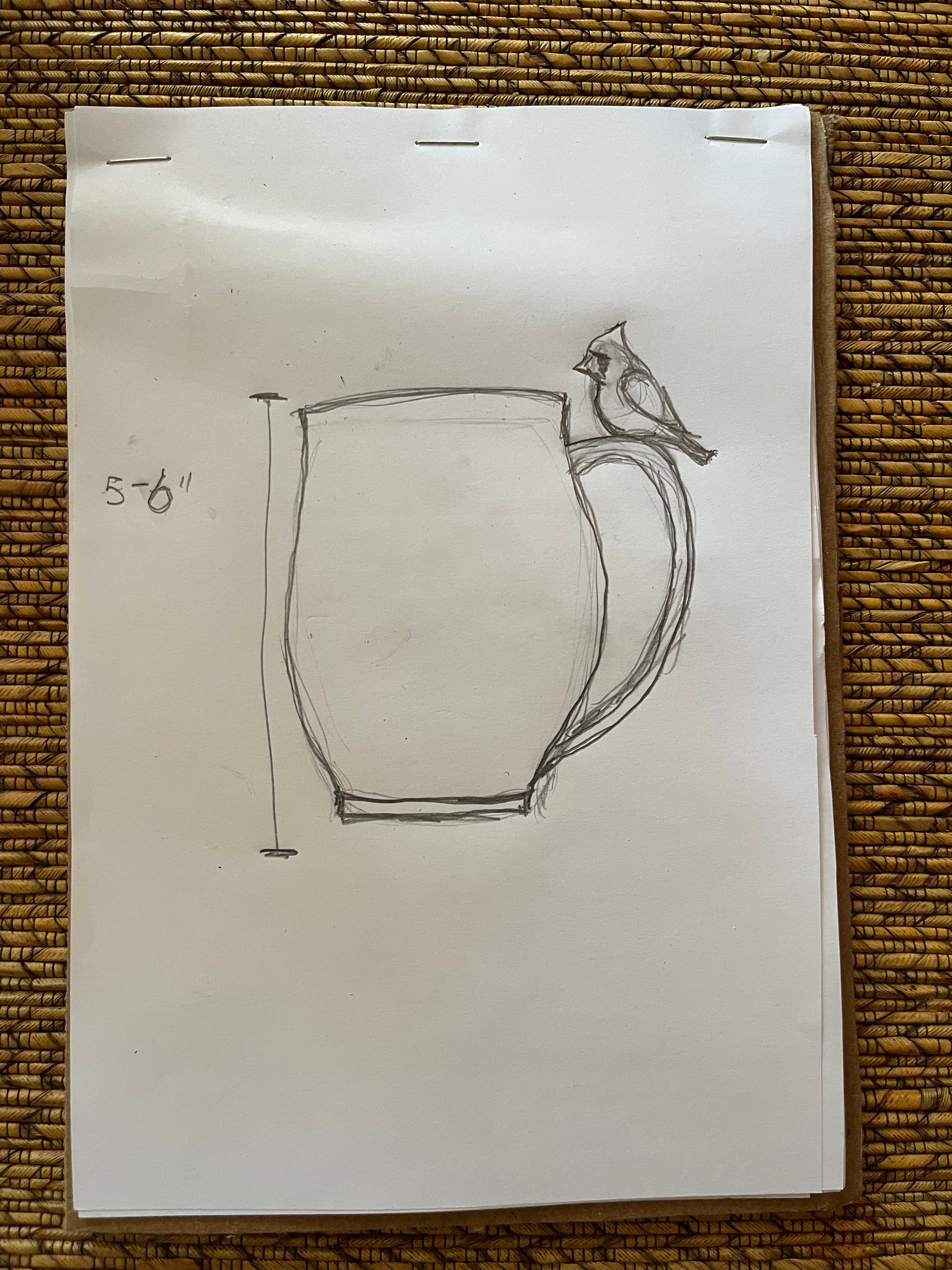 order is for 5 custom mugs with a cardinal on the handle. Each will be as sketched with variations typical of handmade work. Colors will vary. Buyer will recieve pics to choose from 7-8 prototypes and can choose the ones she wants