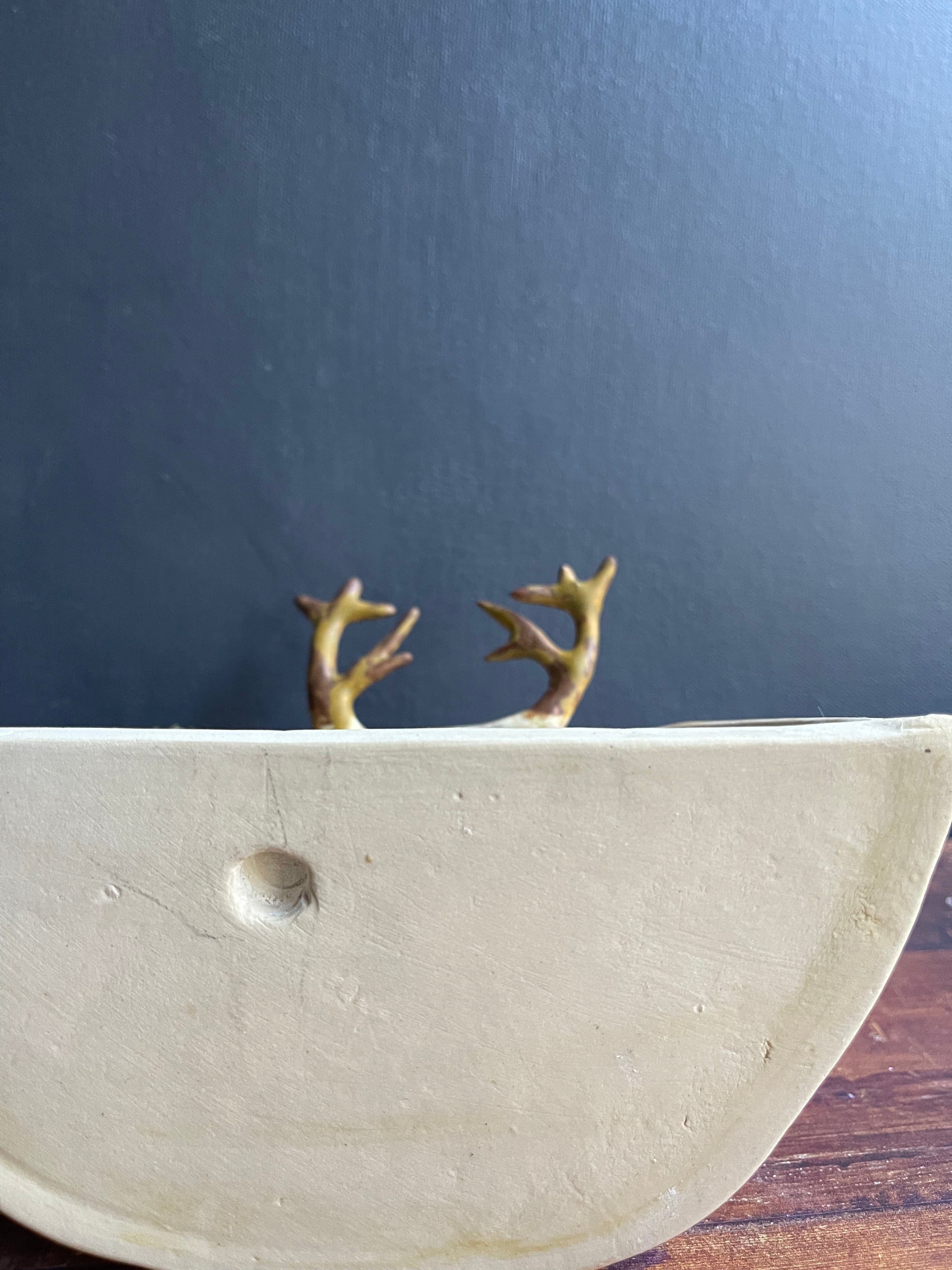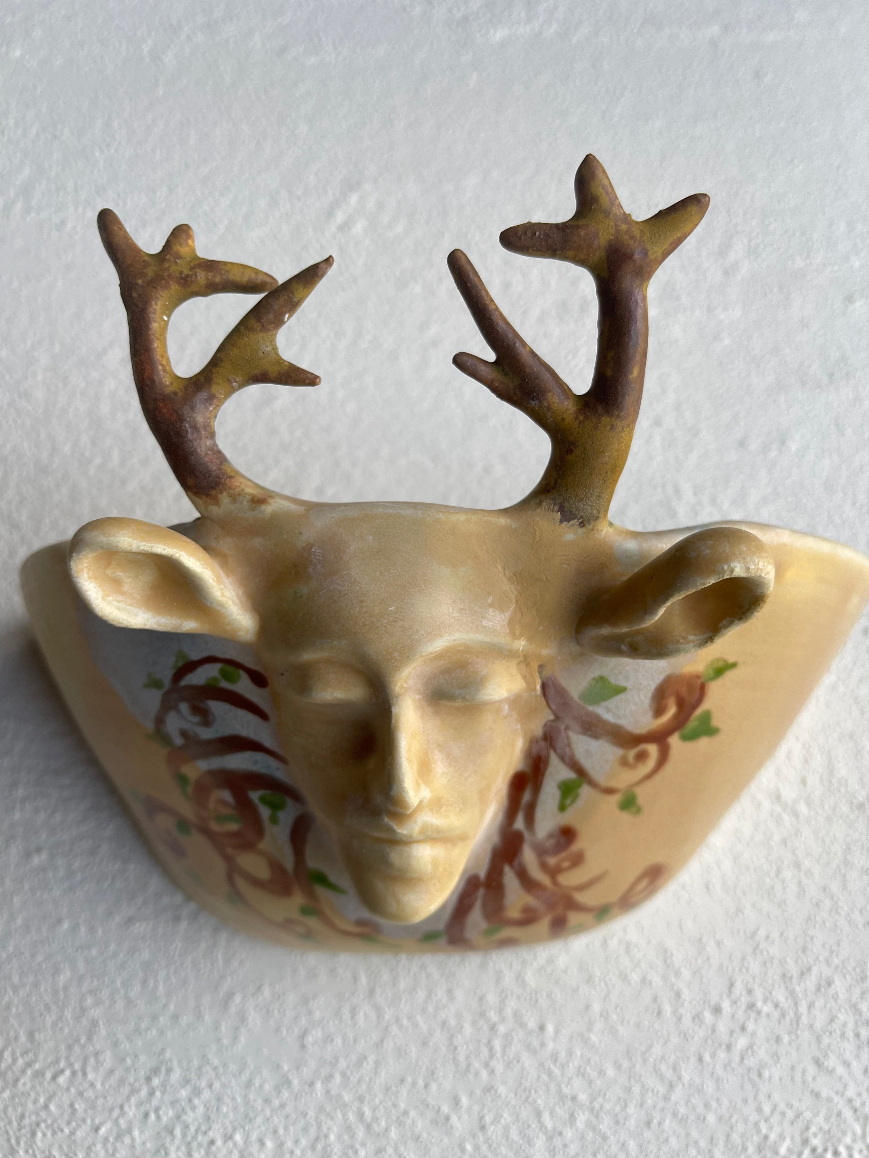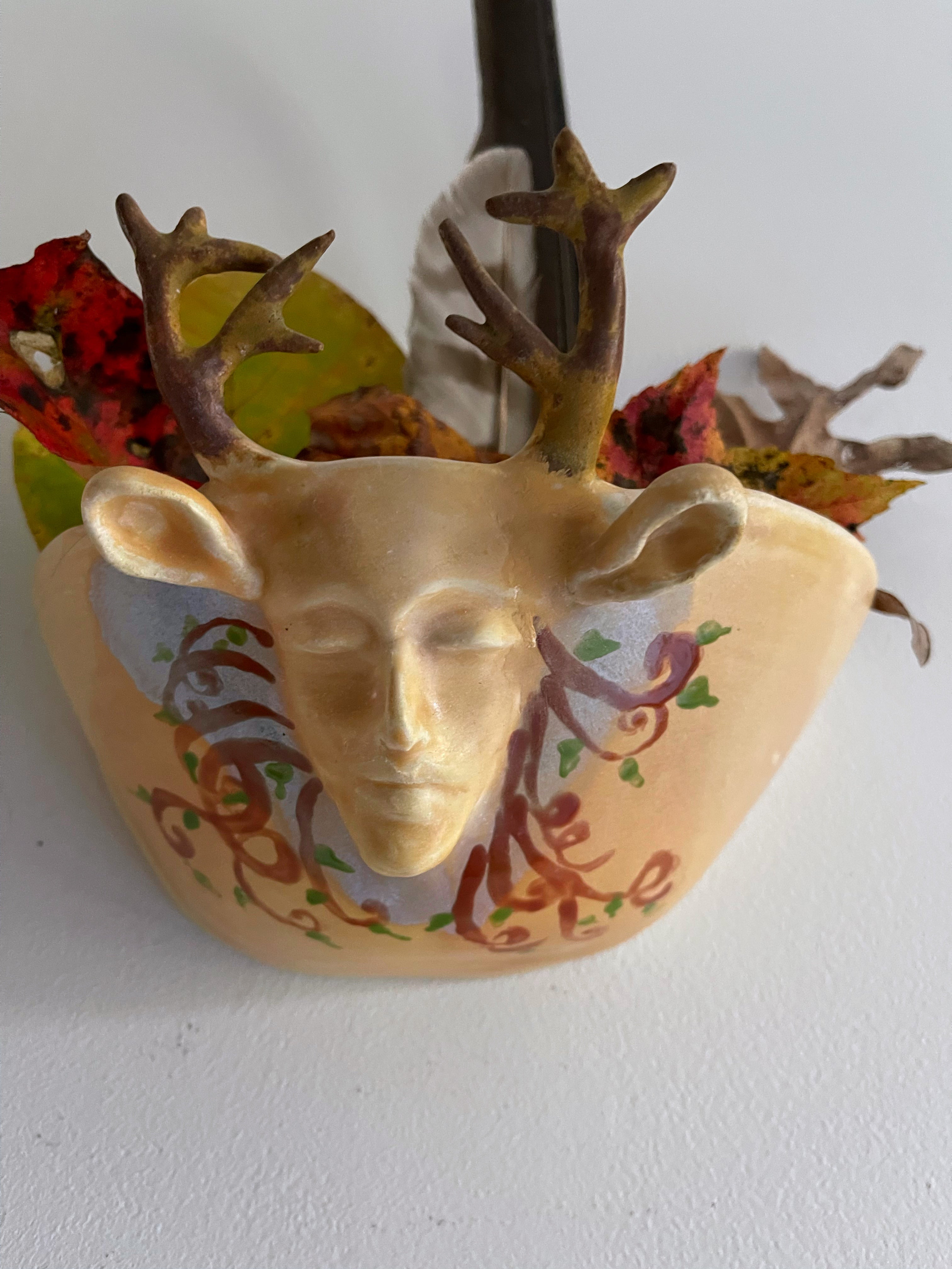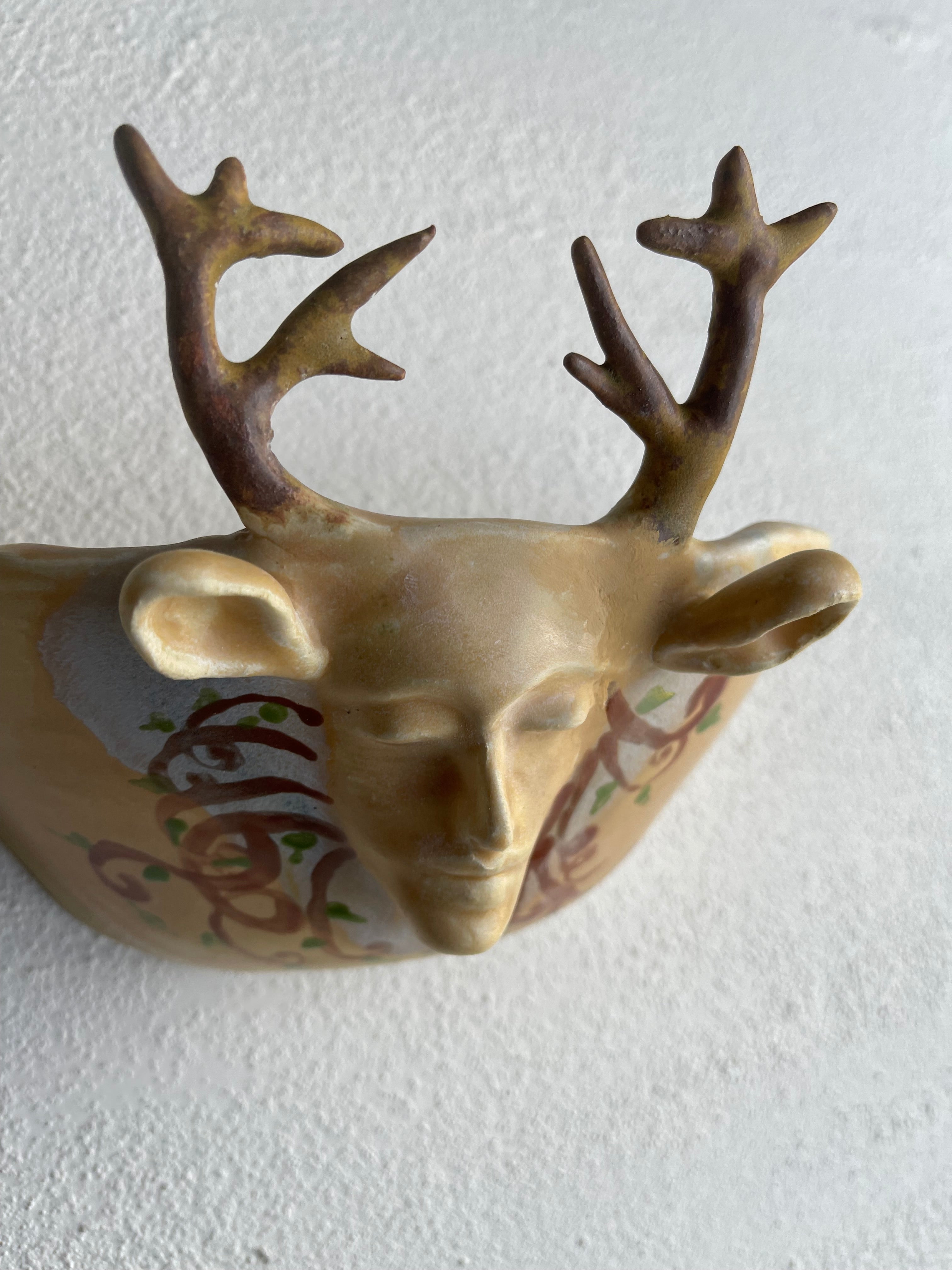 A deer woman made in a hanging wall pocket to hold collectibles or a plant. She will hang by 1 nail with a round head