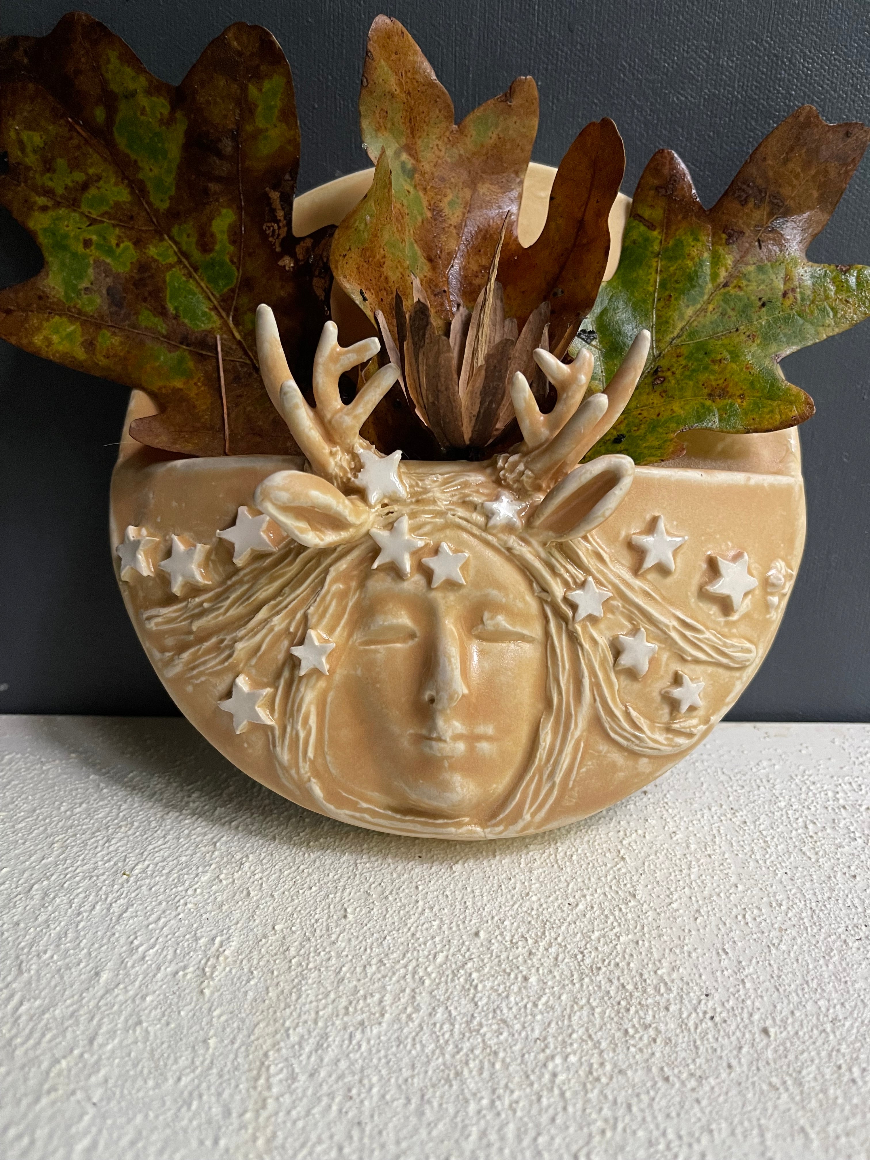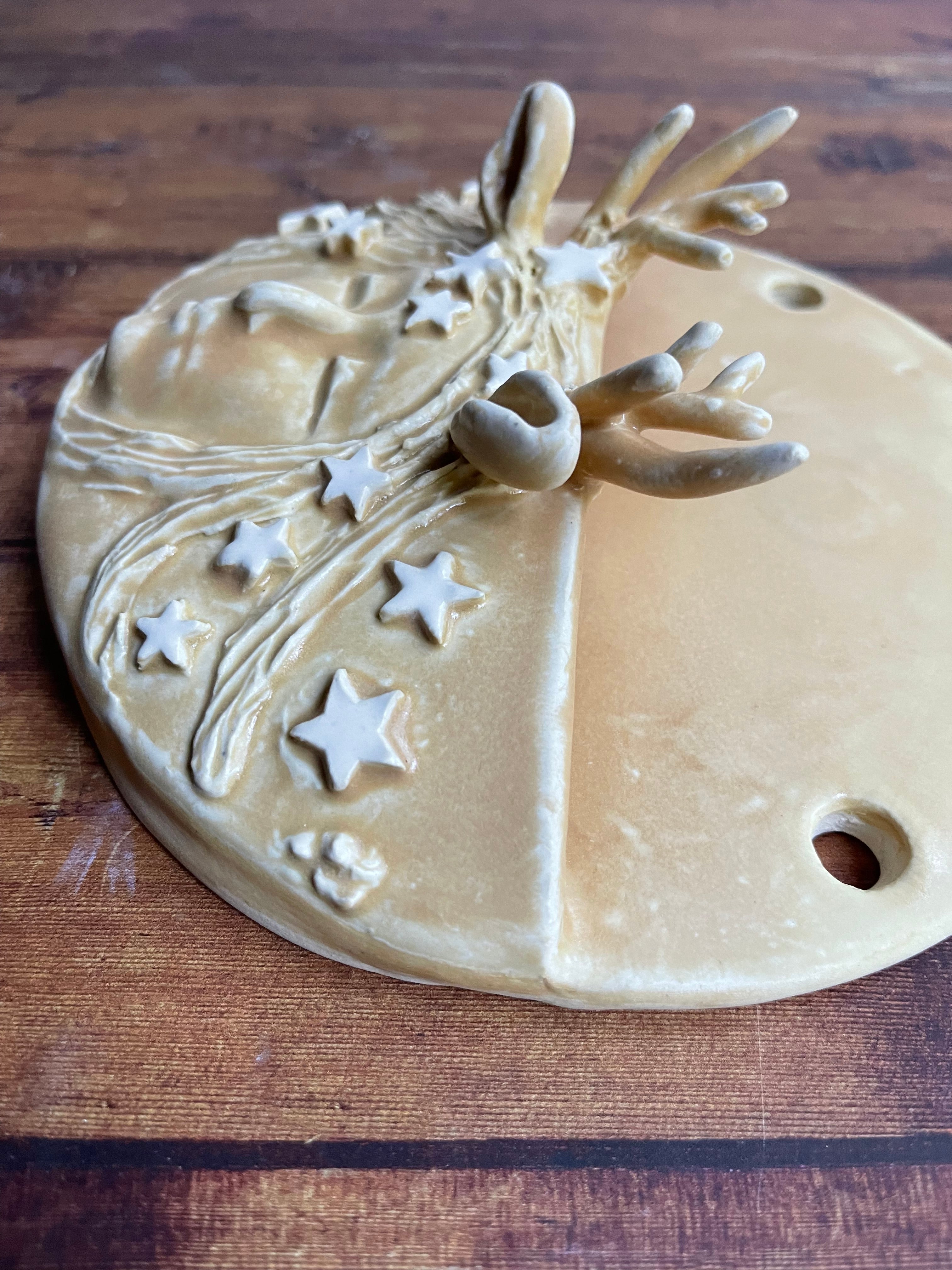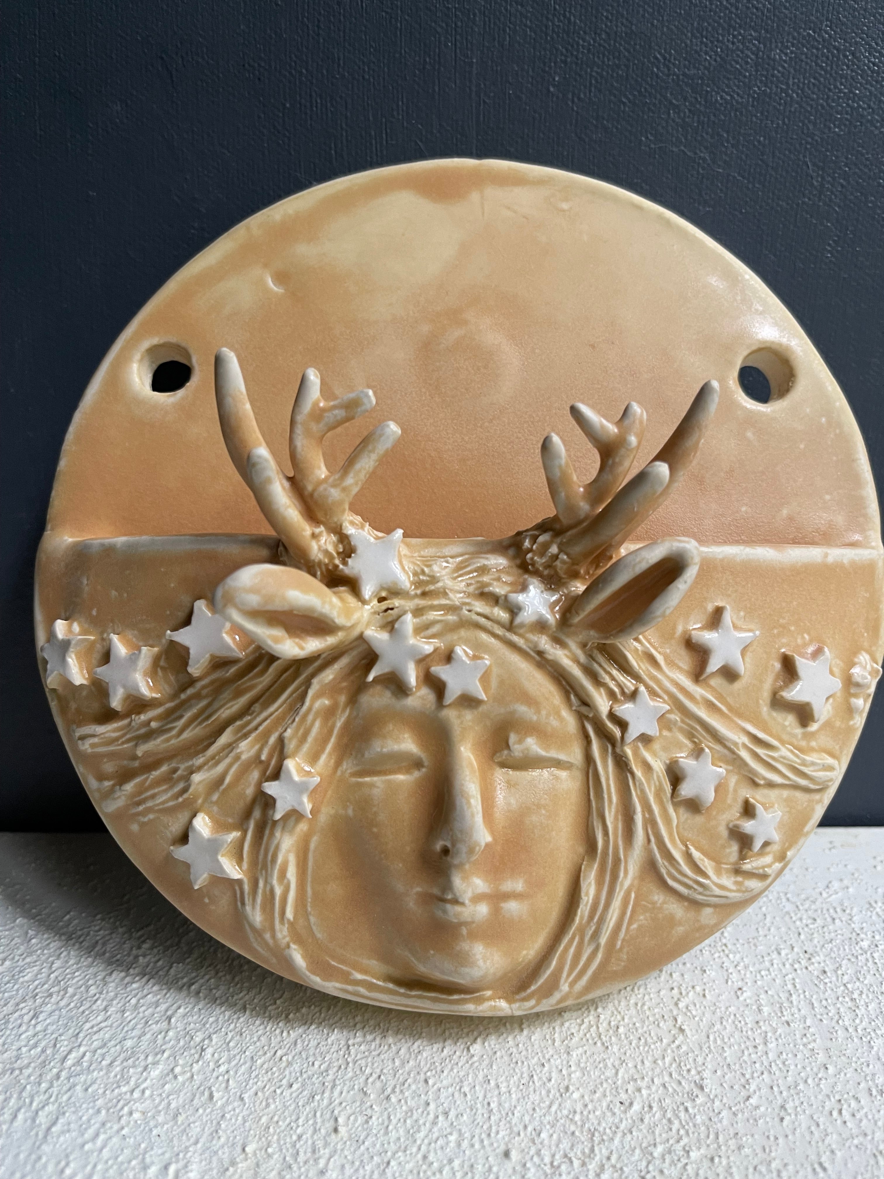 a deer woman with stars made in a hanging wall picket to hold collectibles. She hangs on 2 nails