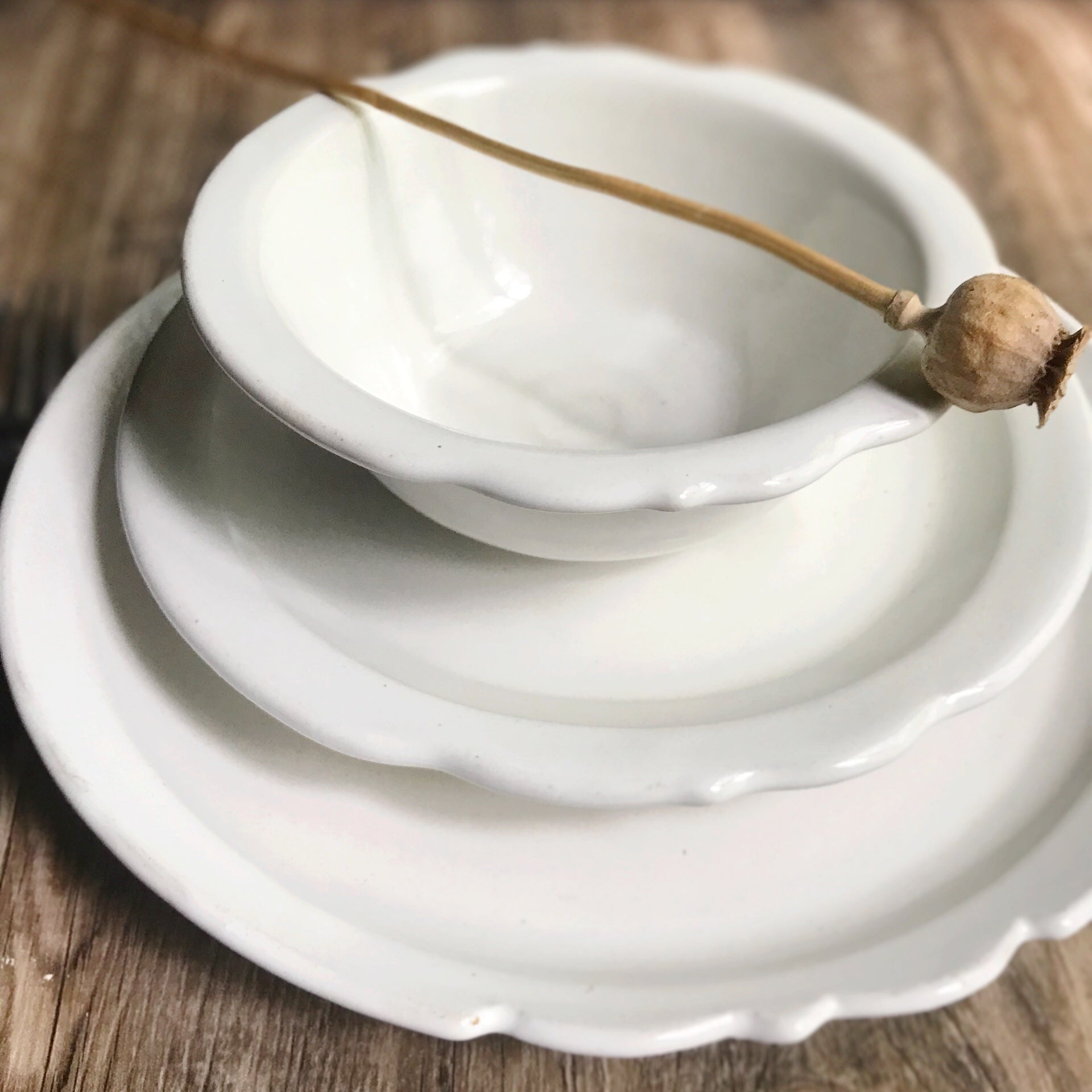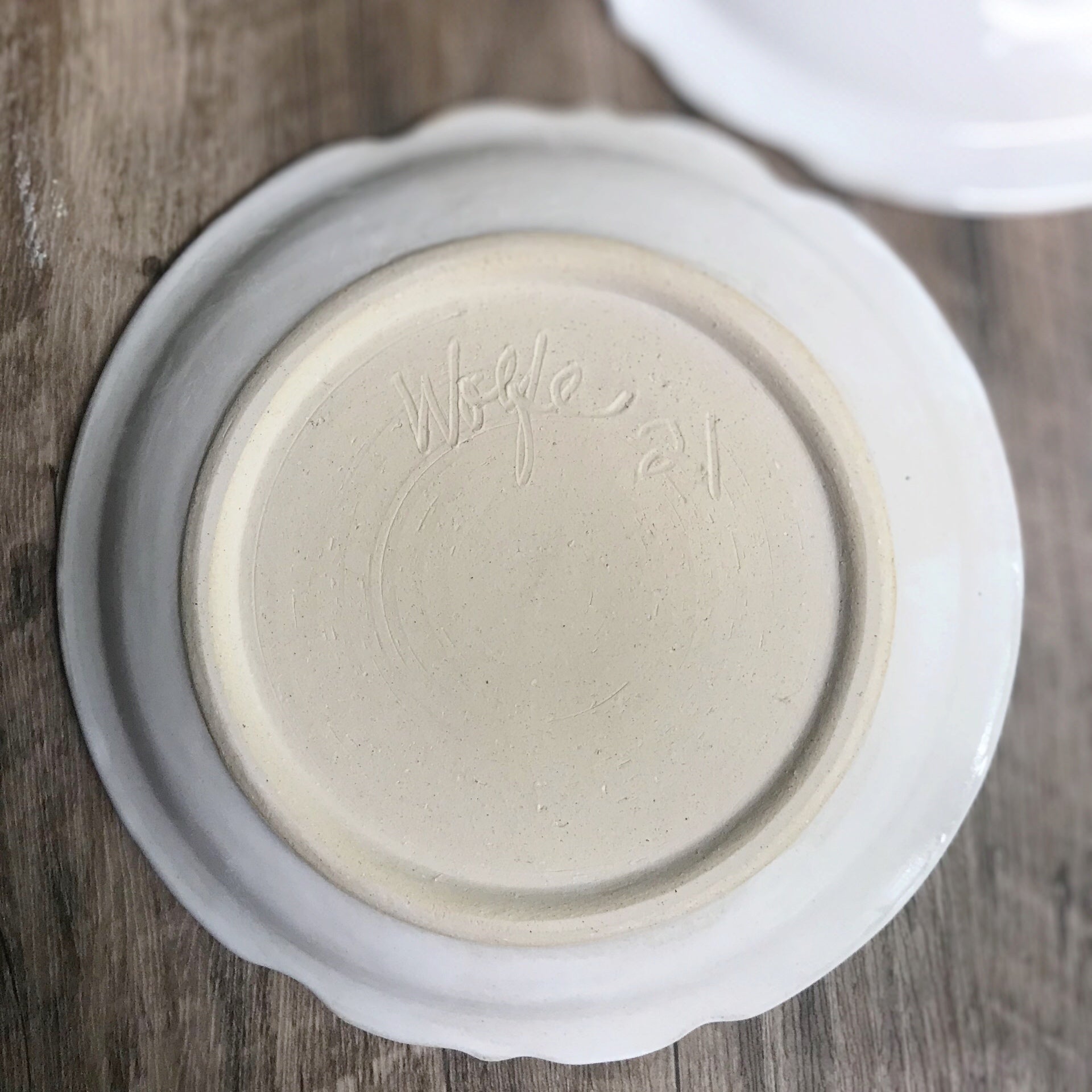 Wheel thrown, altered into quatrafoil shapes, sizes for moderate portions, this modern minimalist set sets a relaxed, artistic table. Thrown foot rims make pieces lightweight and stable. Dinner plate- 10 1/2" D