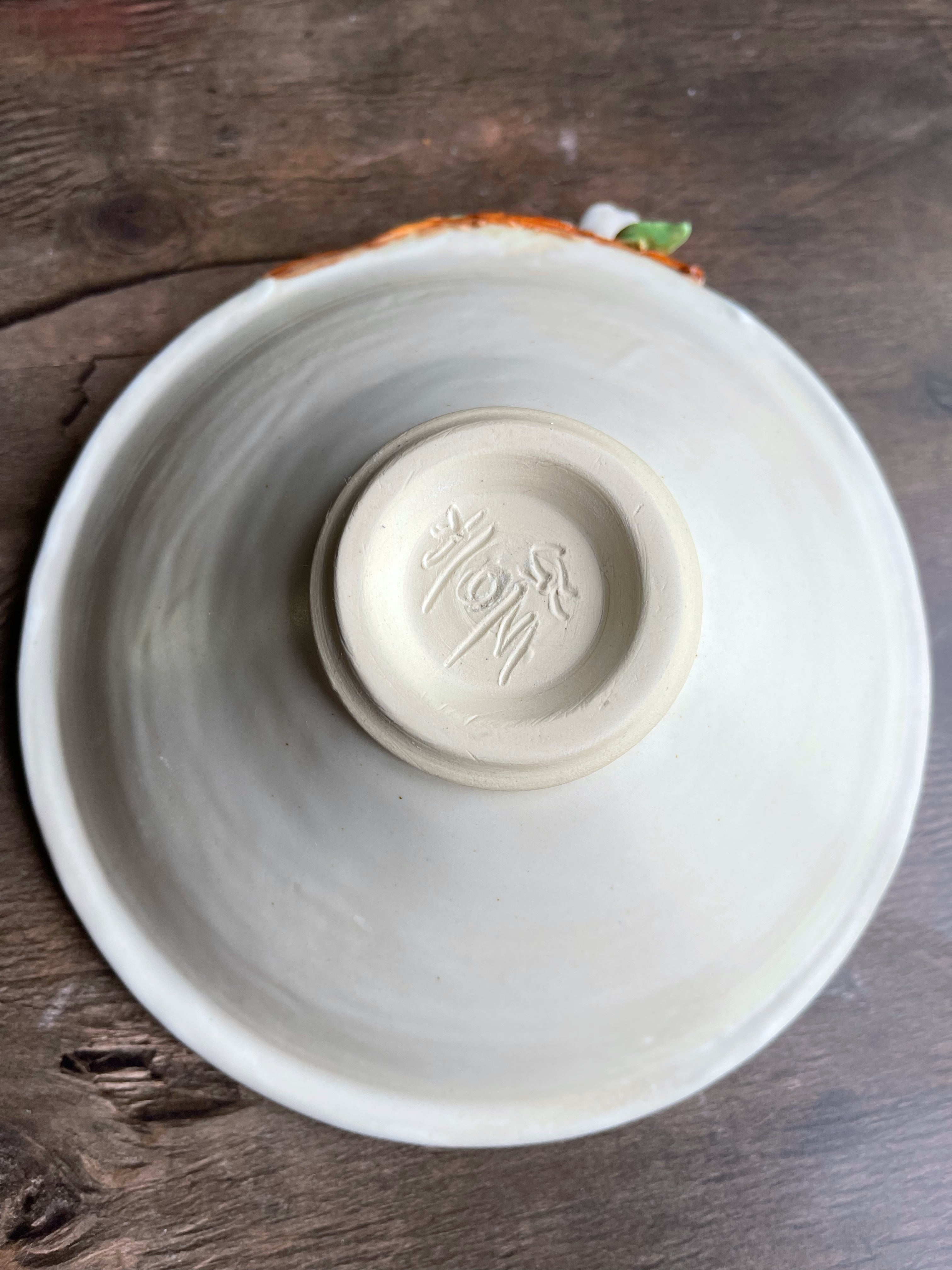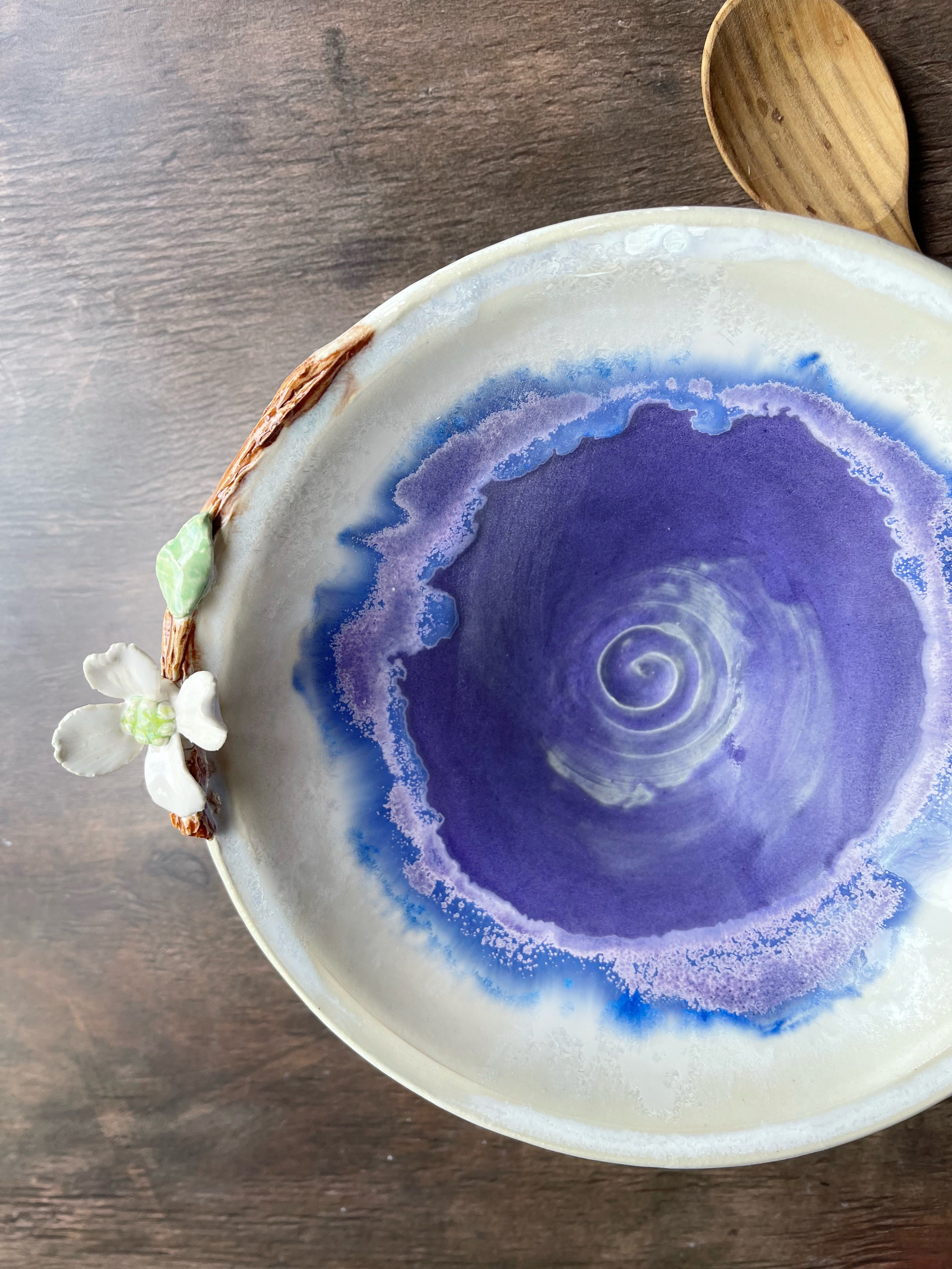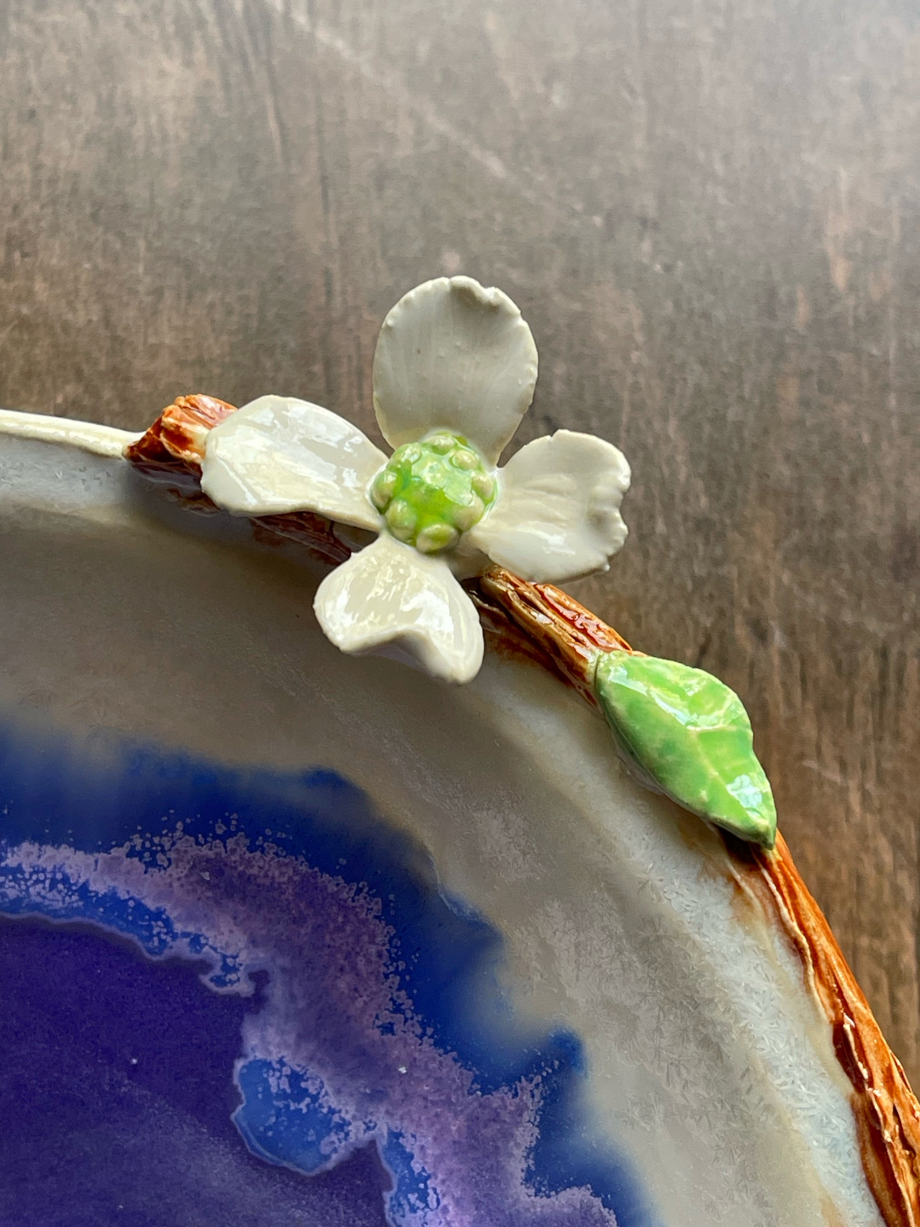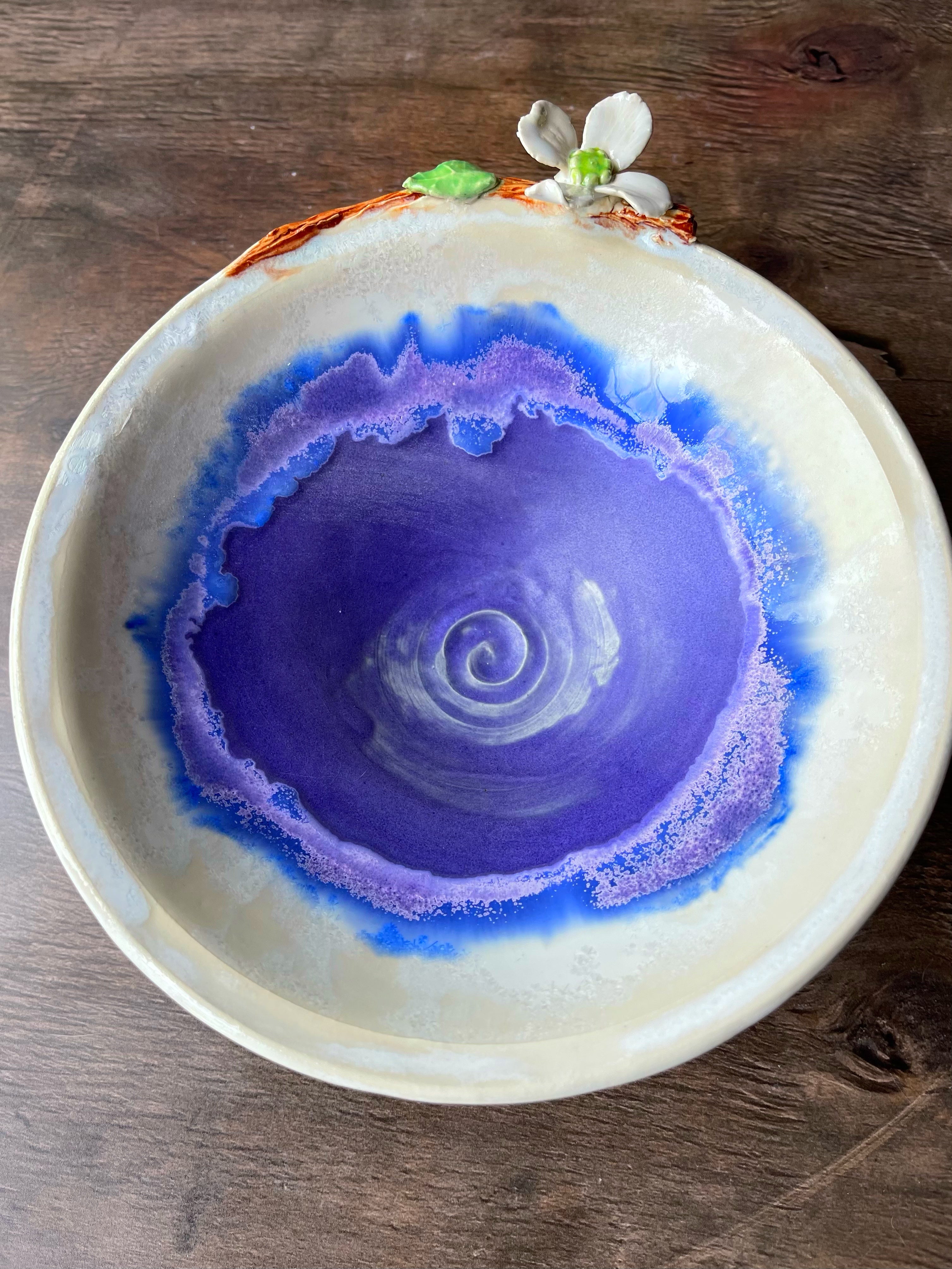 Textured tree branch rimmed bowl with a dogwood bloom on a branch glazed in multicolor glazes inside.