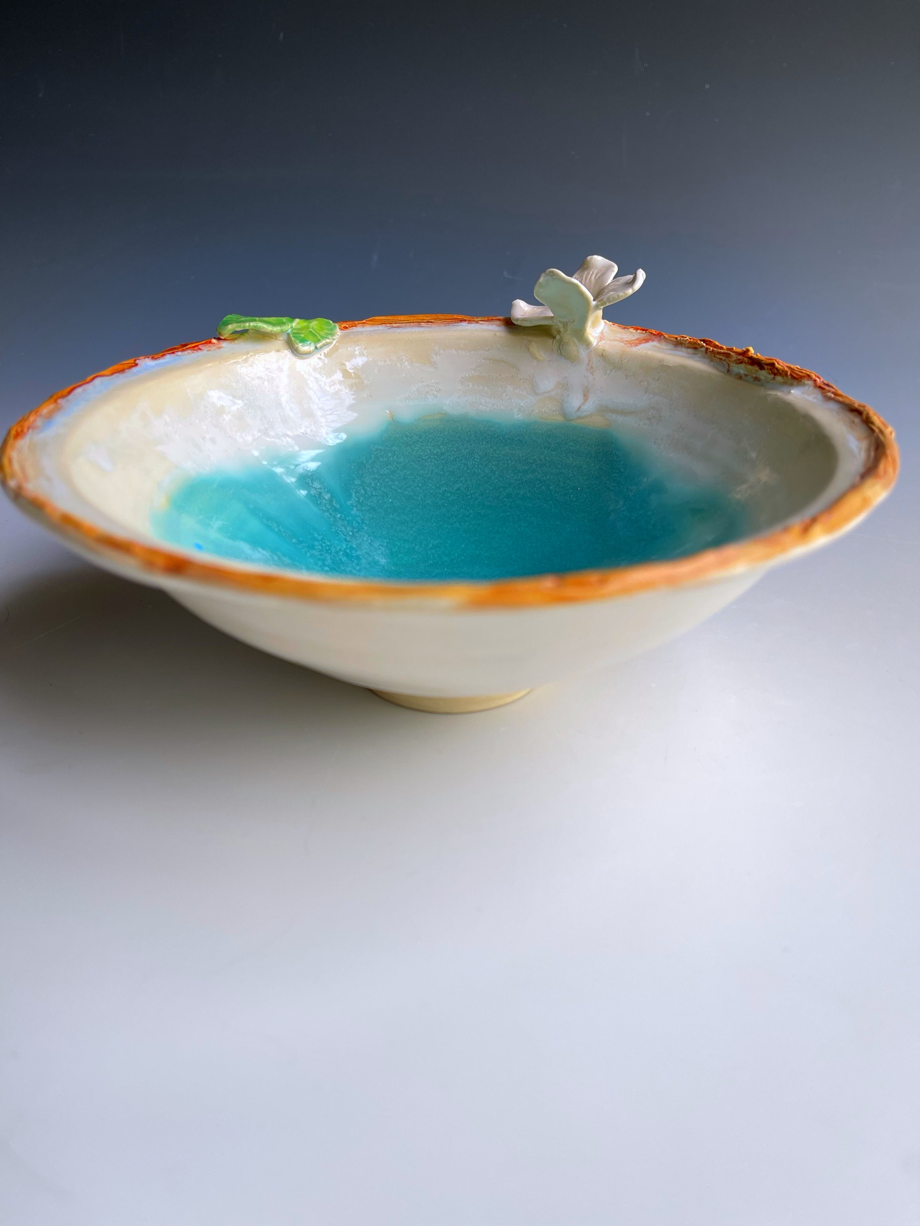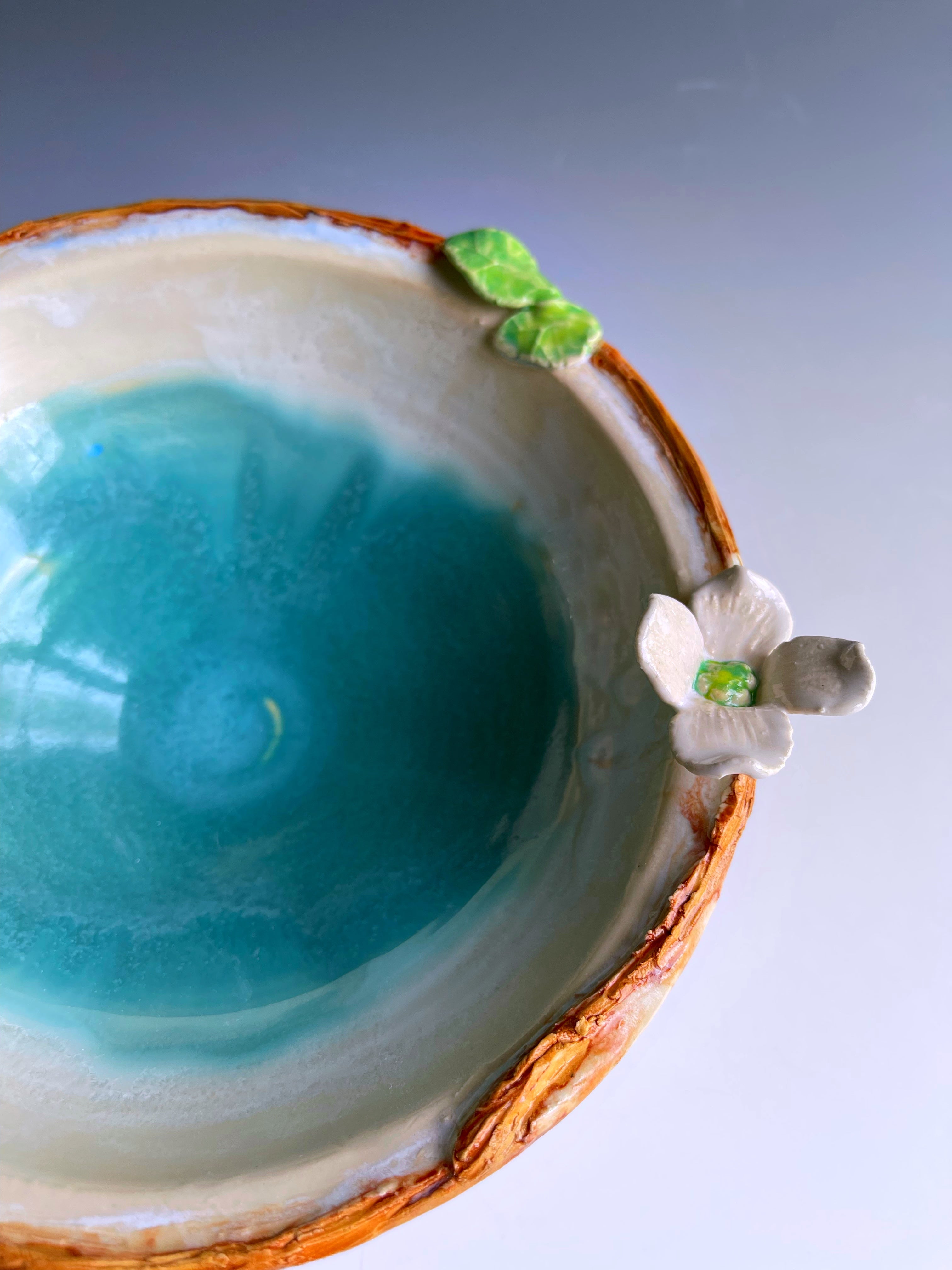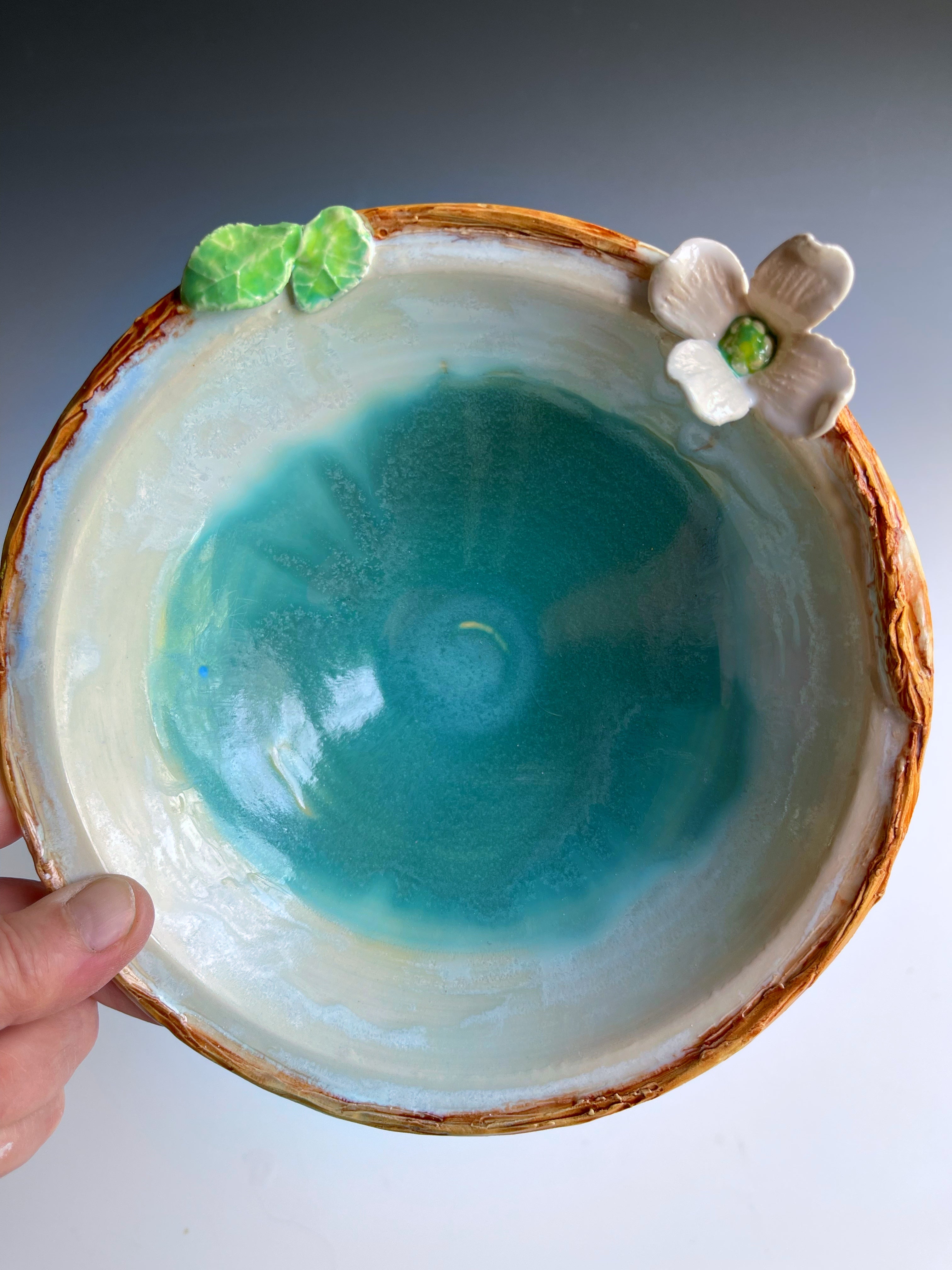 Textured tree branch rimmed bowl with a dogwood bloom on a branch glazed in multicolor glazes inside.