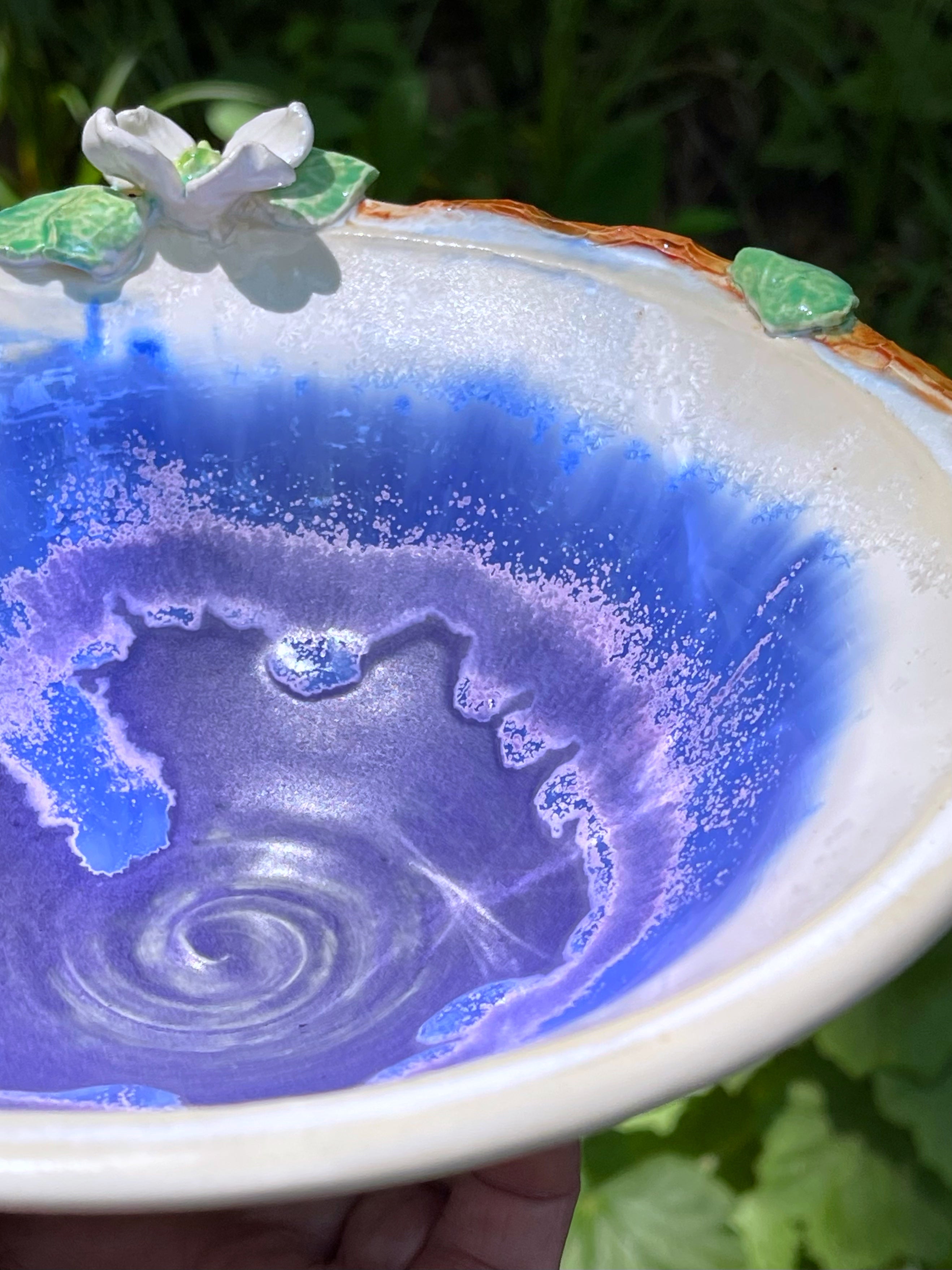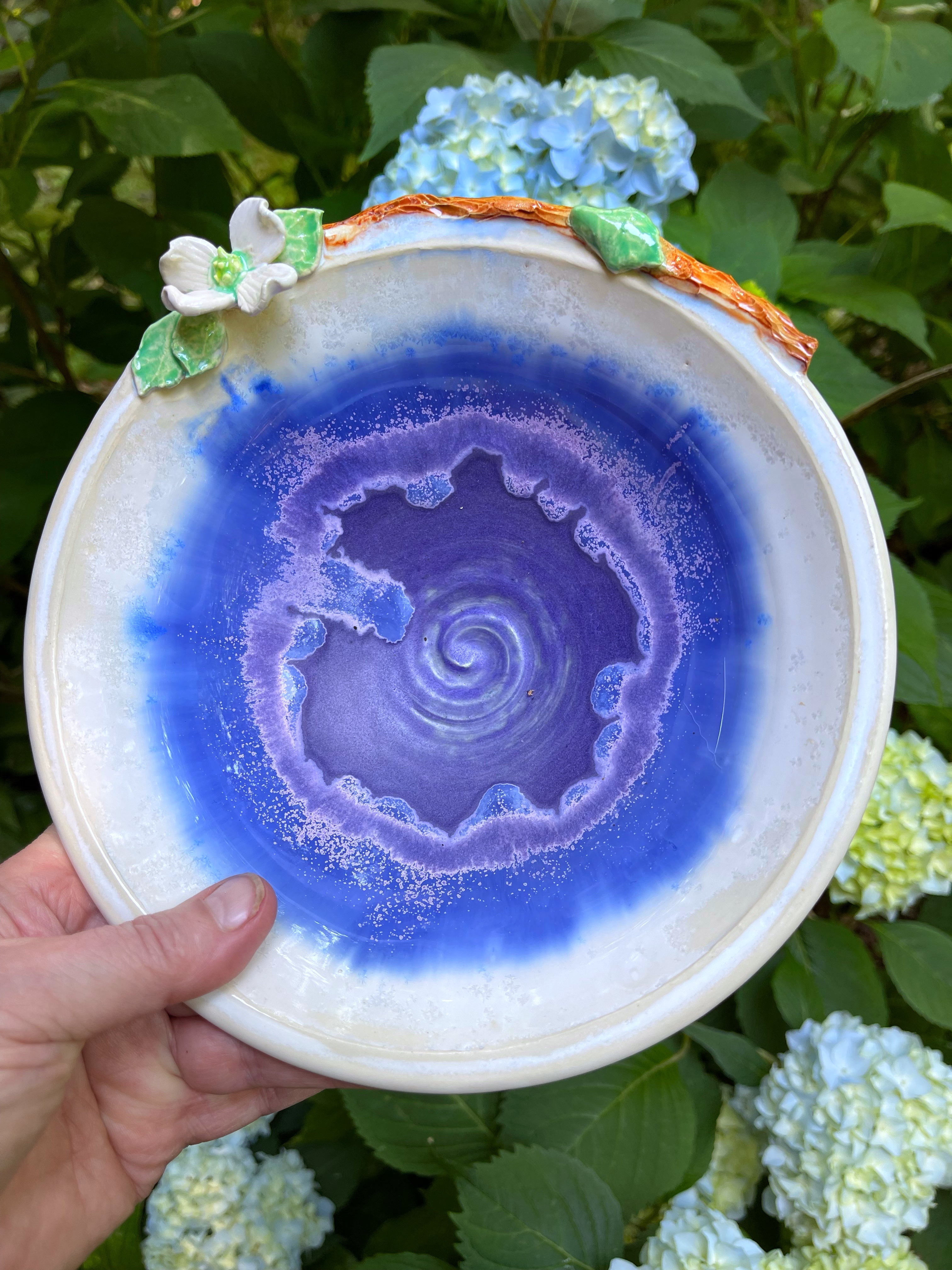 Textured tree branch rimmed bowl with a dogwood bloom on a branch glazed in multicolor glazes inside.