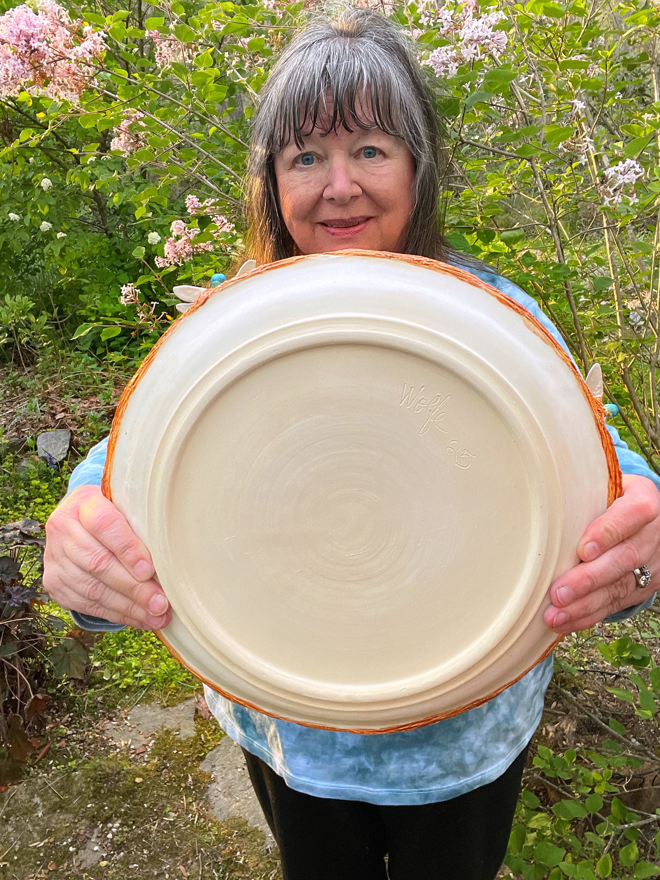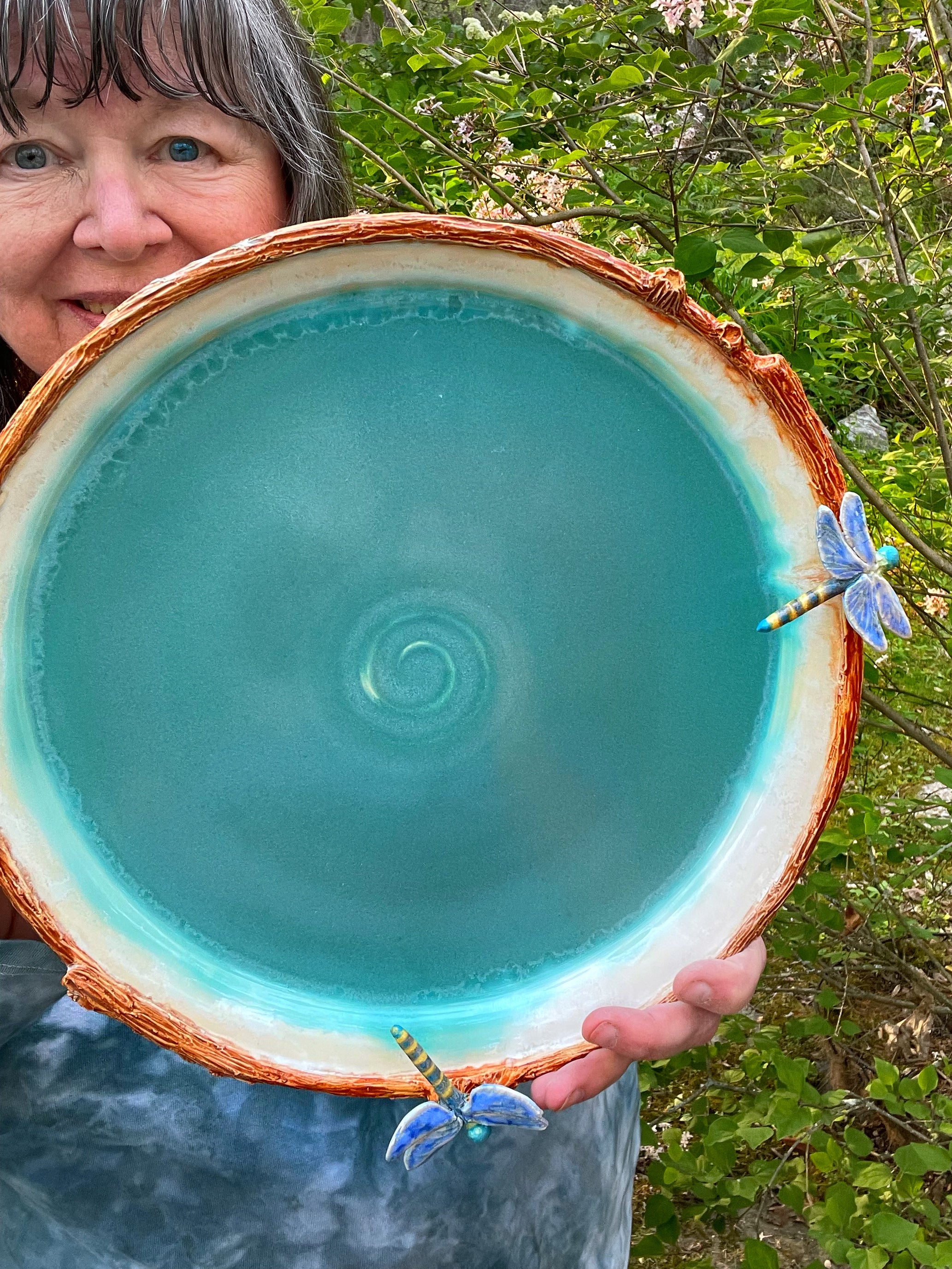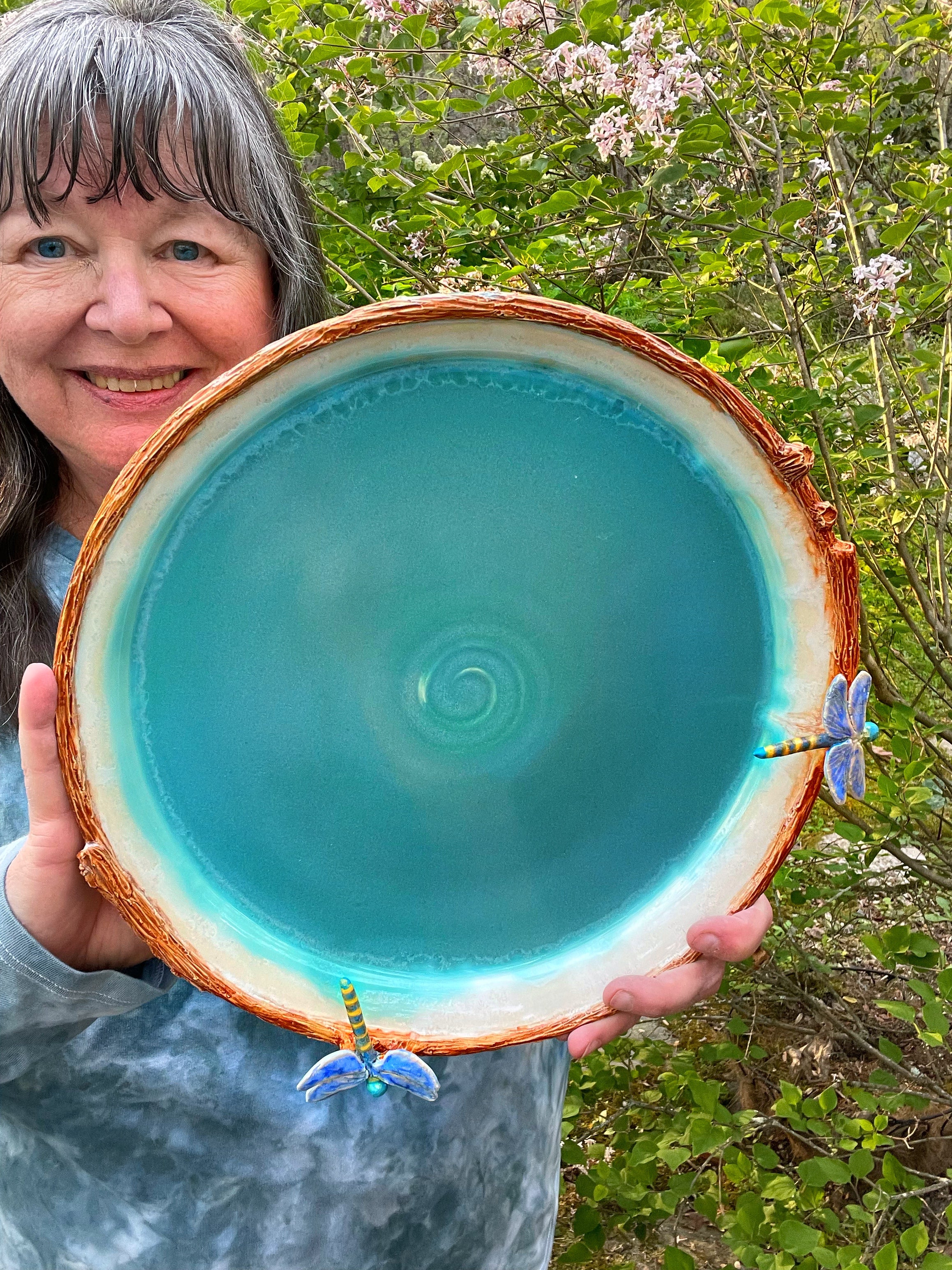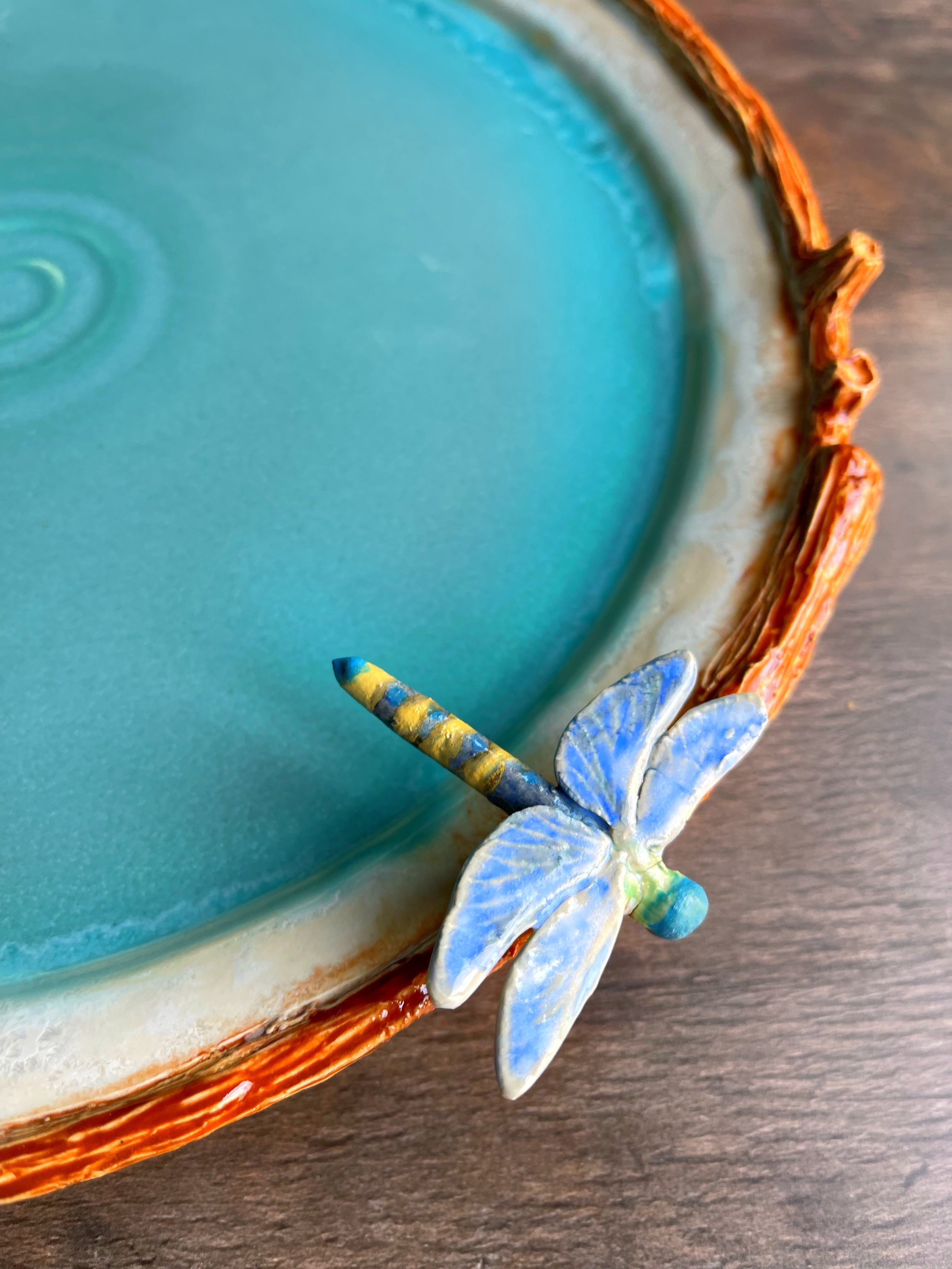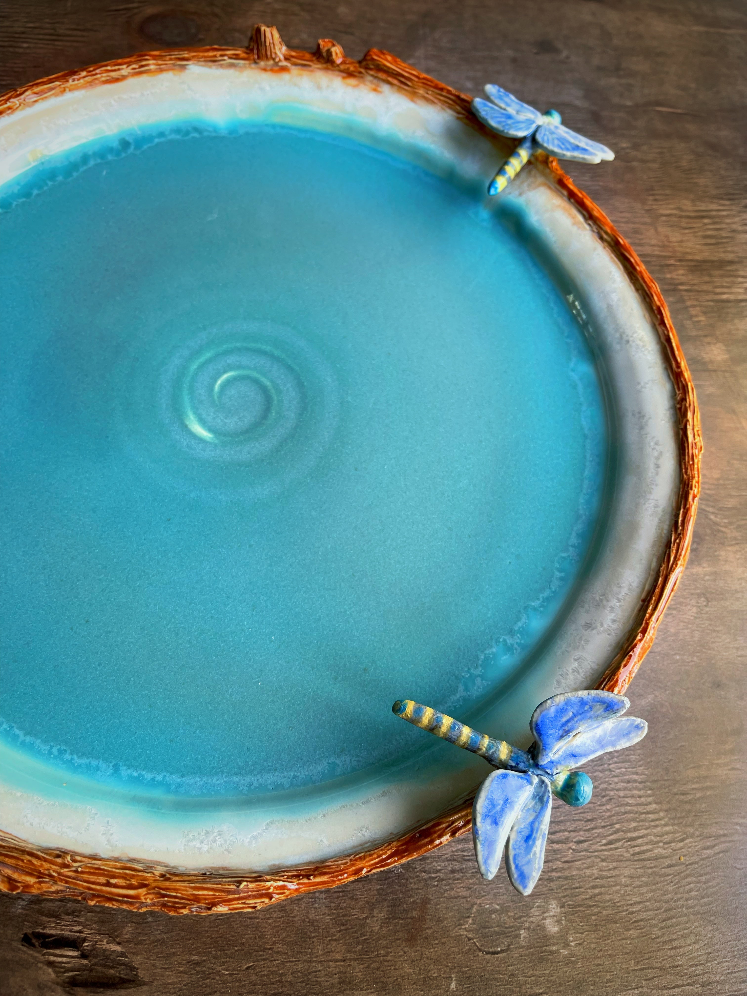 This functional stoneware serving platter was thrown then sculpted with a tree branch rim and dragonflies. The serving diameter is 10”, large enough for a roast chicken.