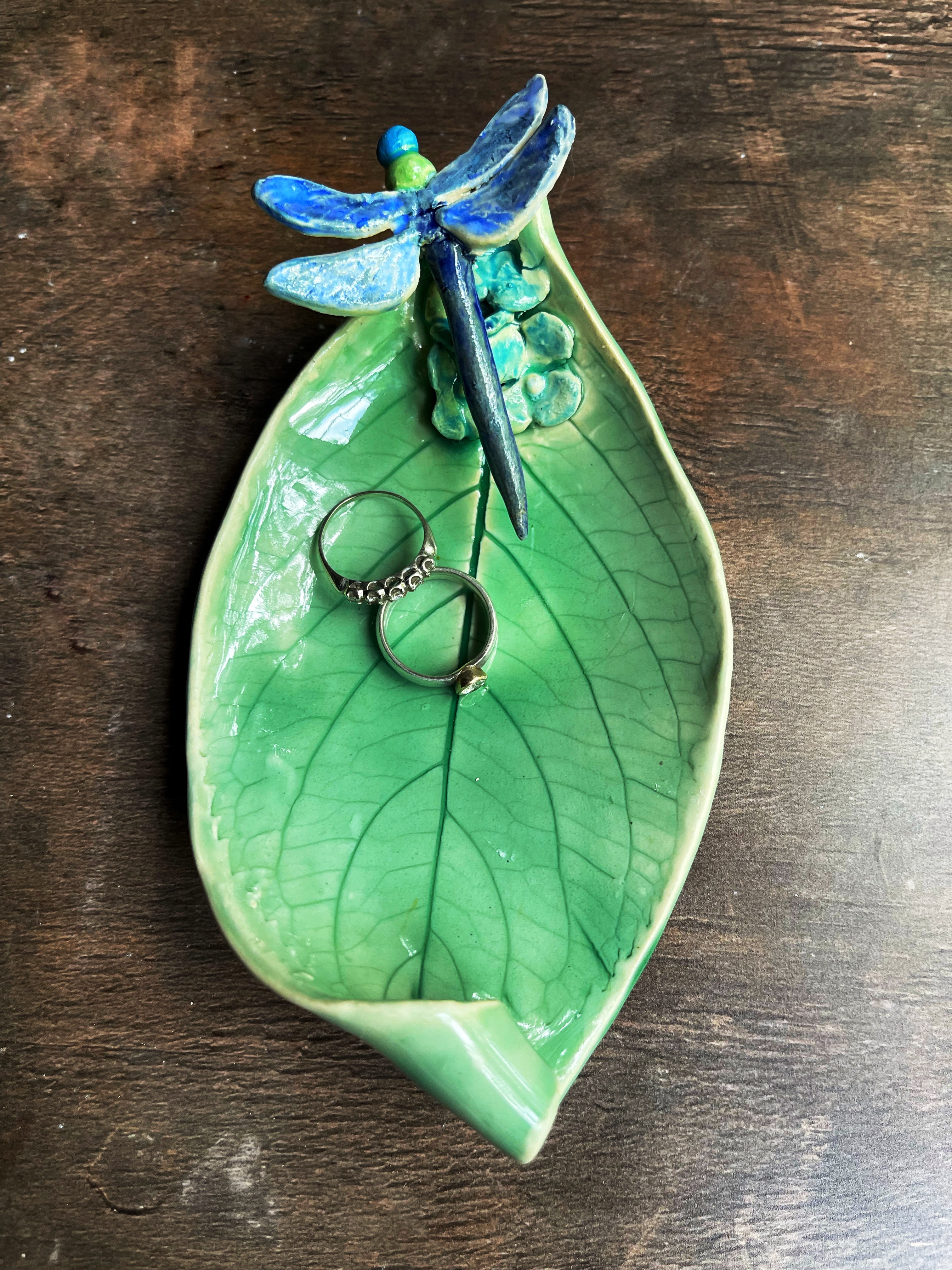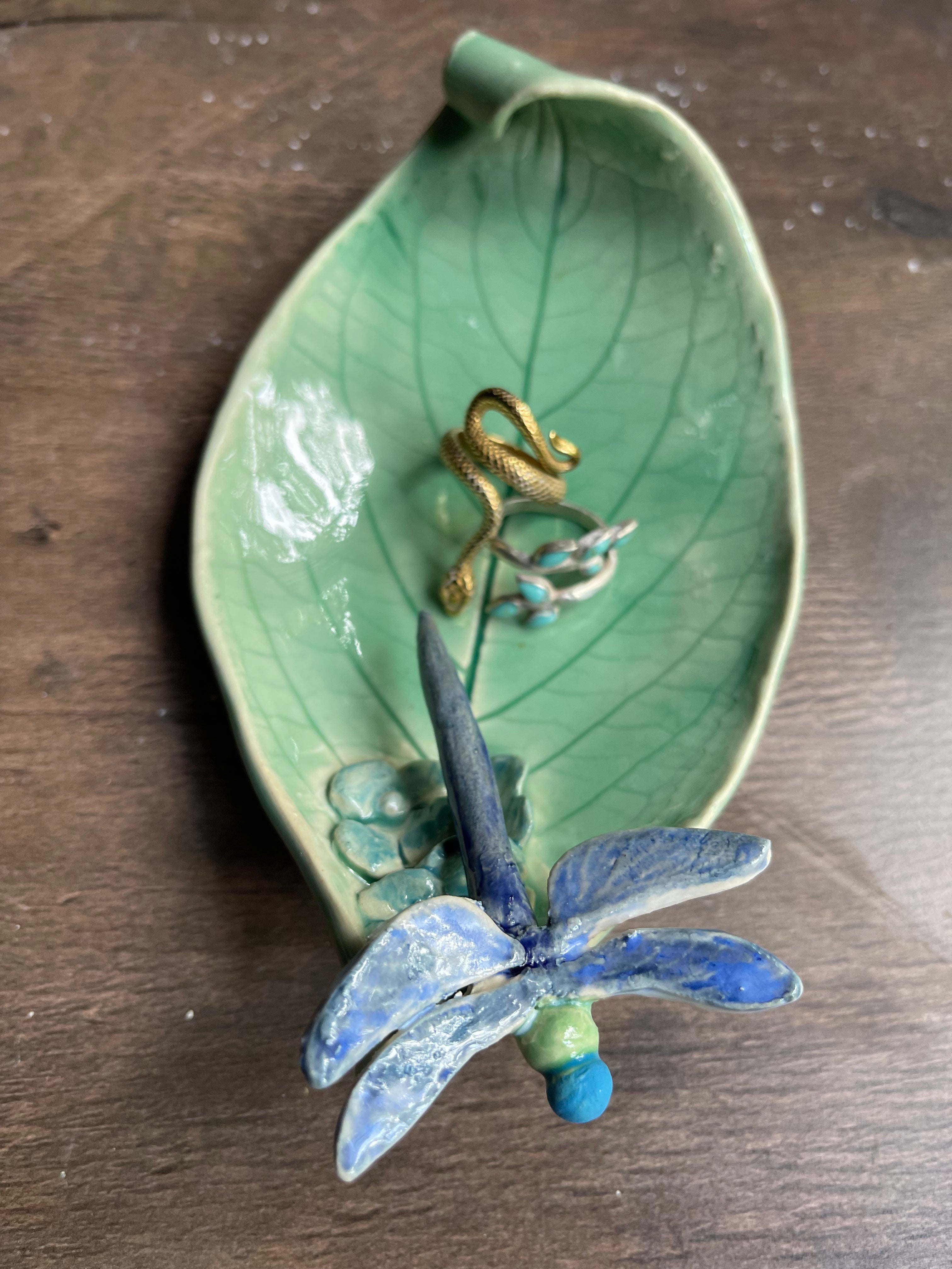 Leaf plate with curl and a dragonfly. Perfect for serving, candles, soap dish