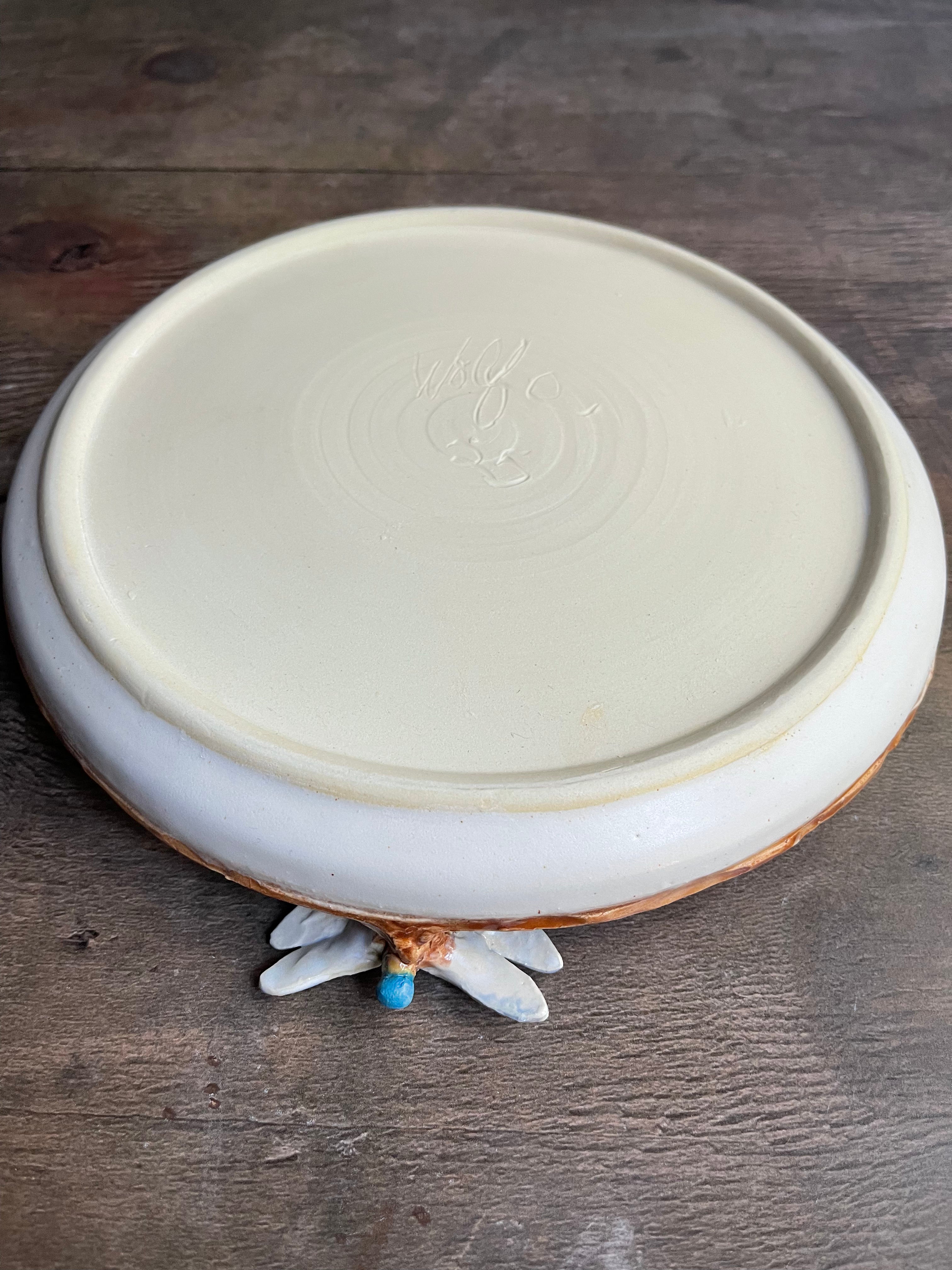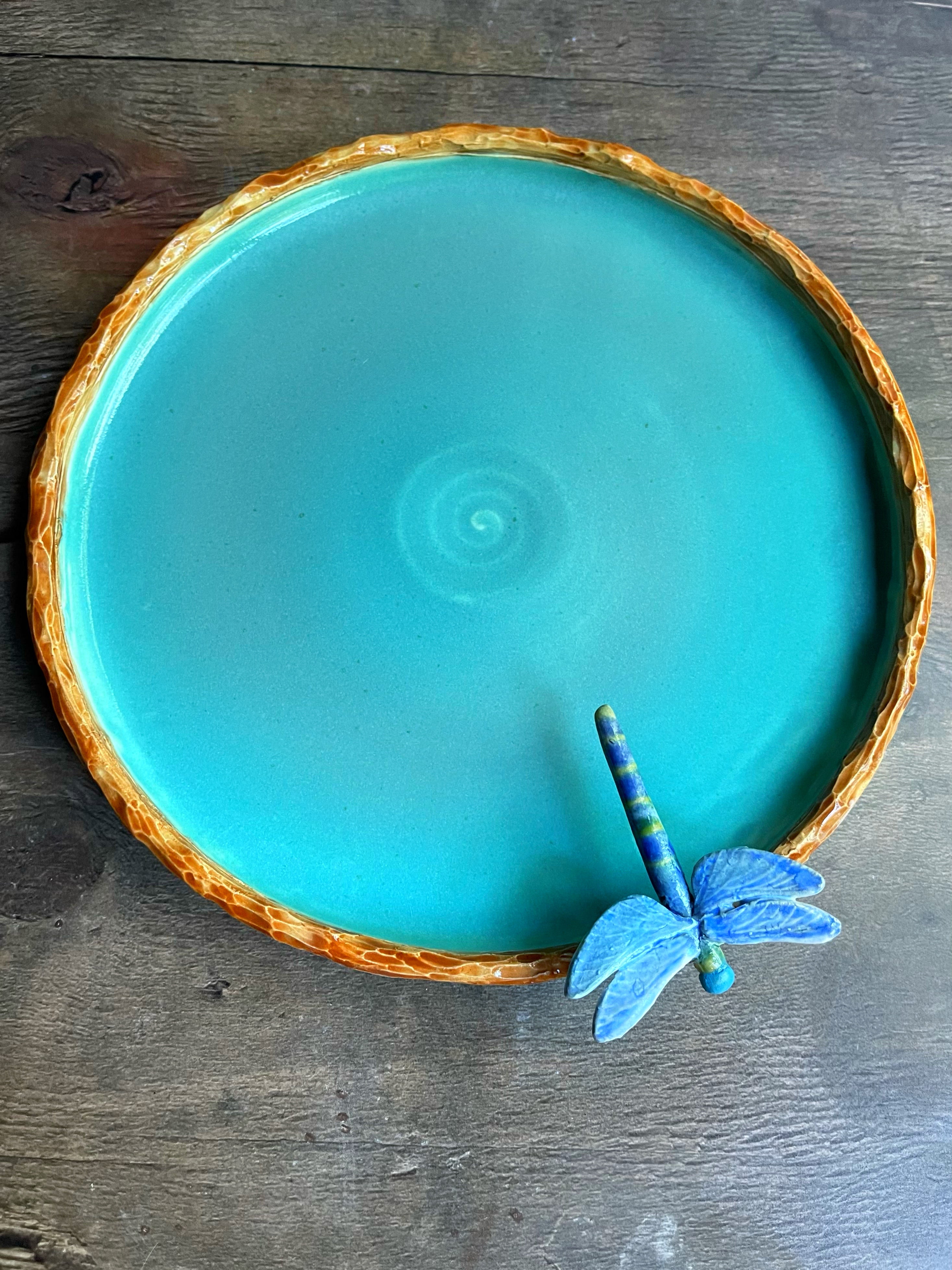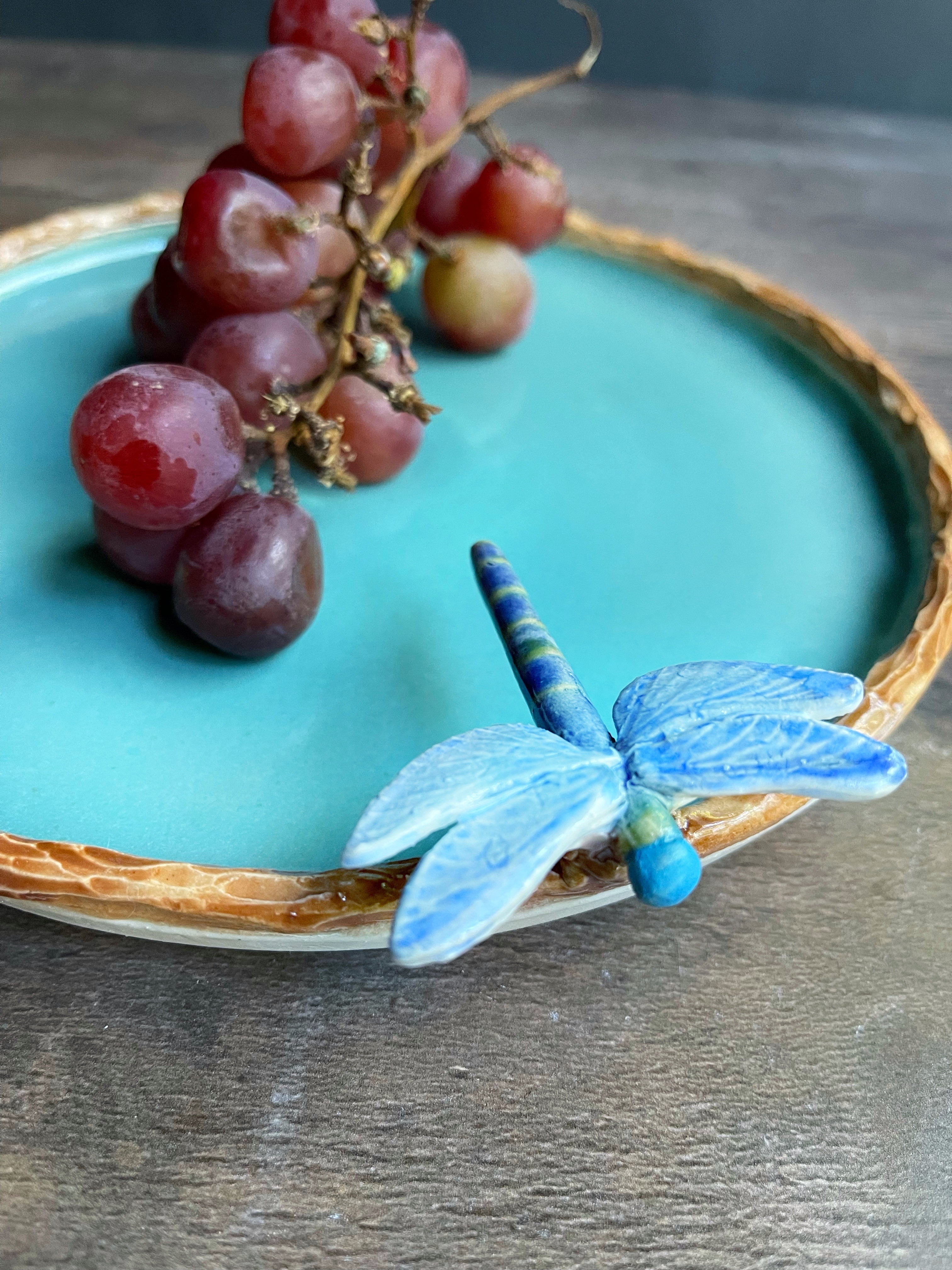 Hand sculpted dragonfly artfully rests on the rim of a plate with a tree branch rim. Trimmed foot rim on bottom for excellent balance. Serve a few snacks or one show stopper dessert.
