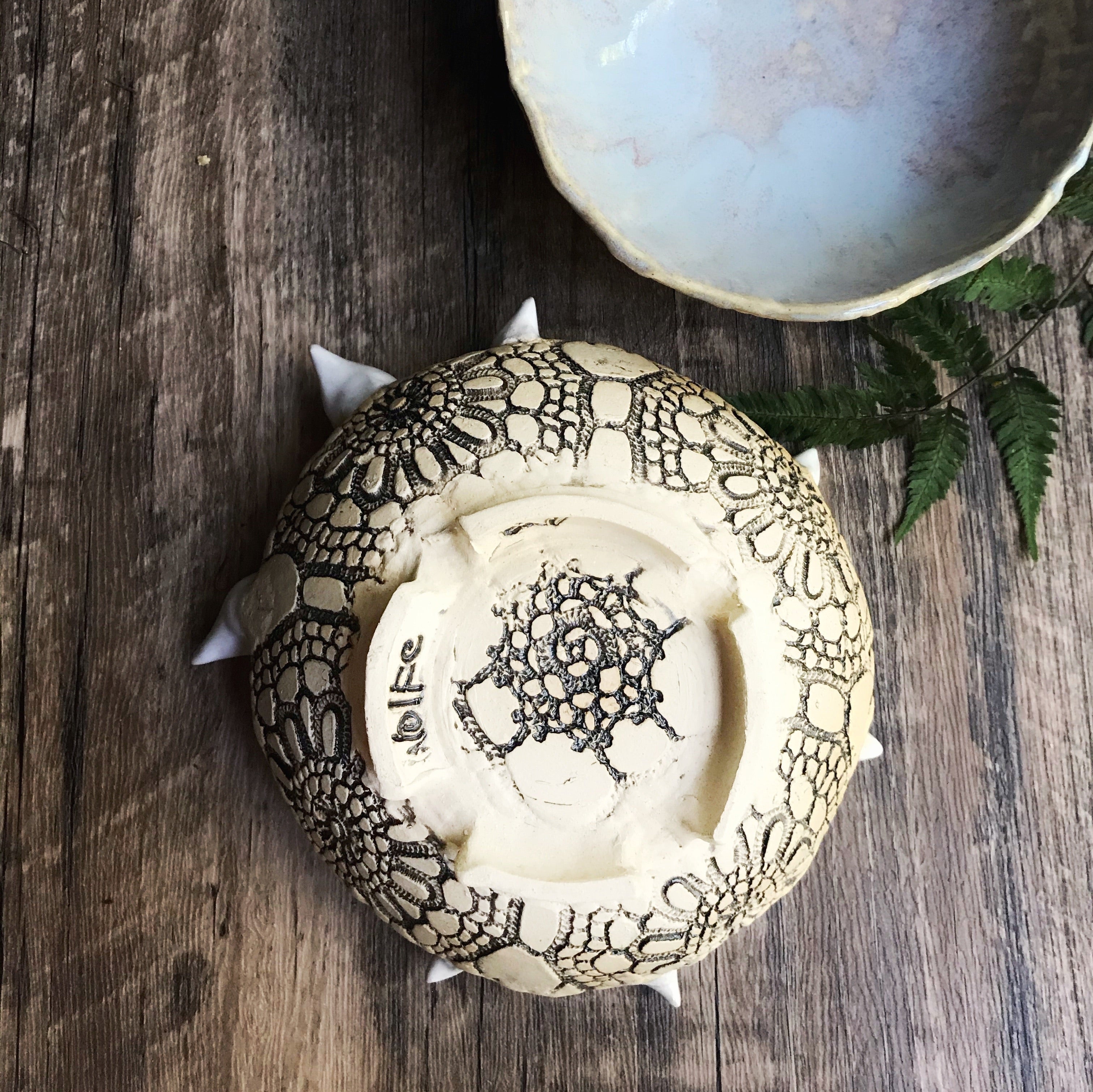 Hand built in stoneware clay with my nana's crochet tablecloth pressed into the clay for texture, this organic shape has a hand formed bird for each member of your family on the rim. The inside is glazed in Cloud Gray, and the texture has black oxide permanently fired into the lace to accent the texture.