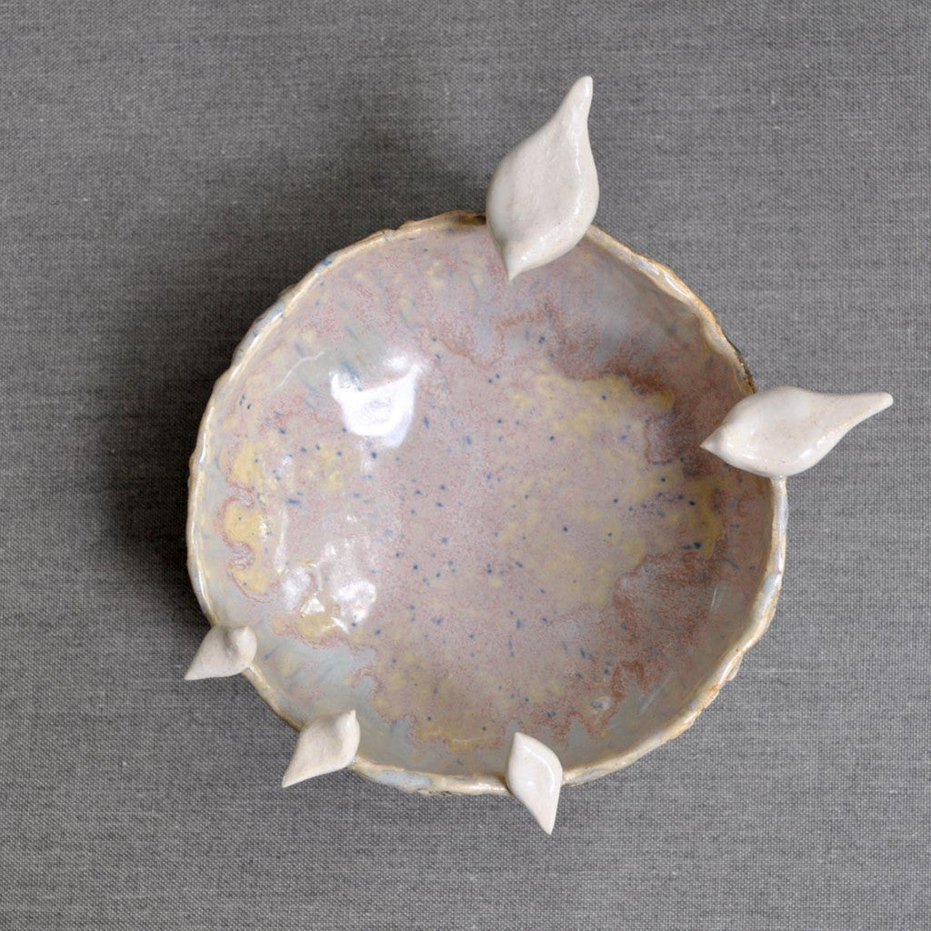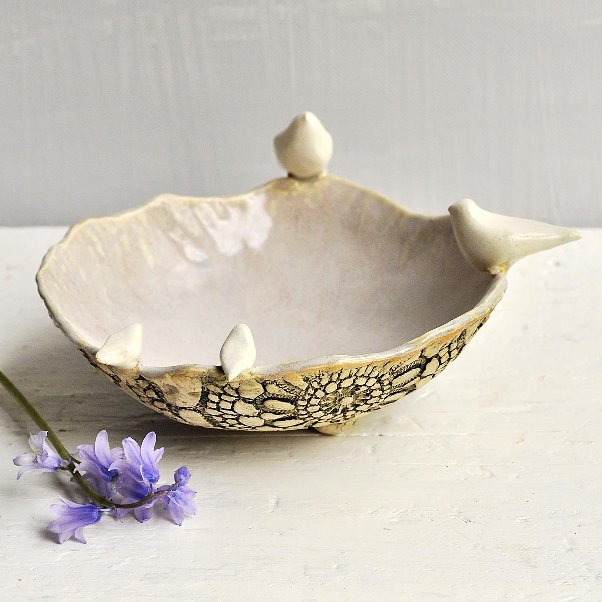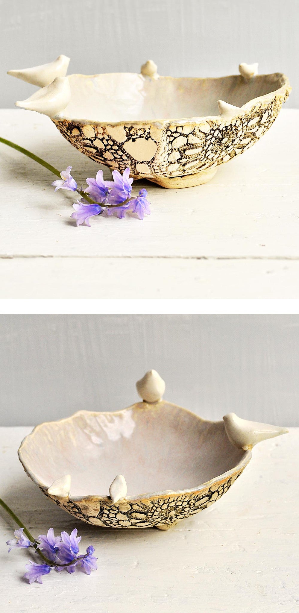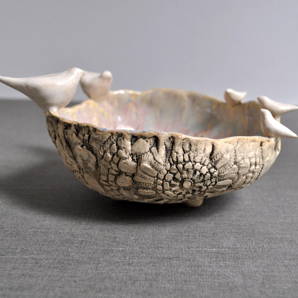 Hand built in stoneware clay with my nana's crochet tablecloth pressed into the clay for texture, this organic shape has a hand formed bird for each member of your family on the rim. The inside is glazed in Cloud Gray, and the texture has black oxide permanently fired into the lace to accent the texture.