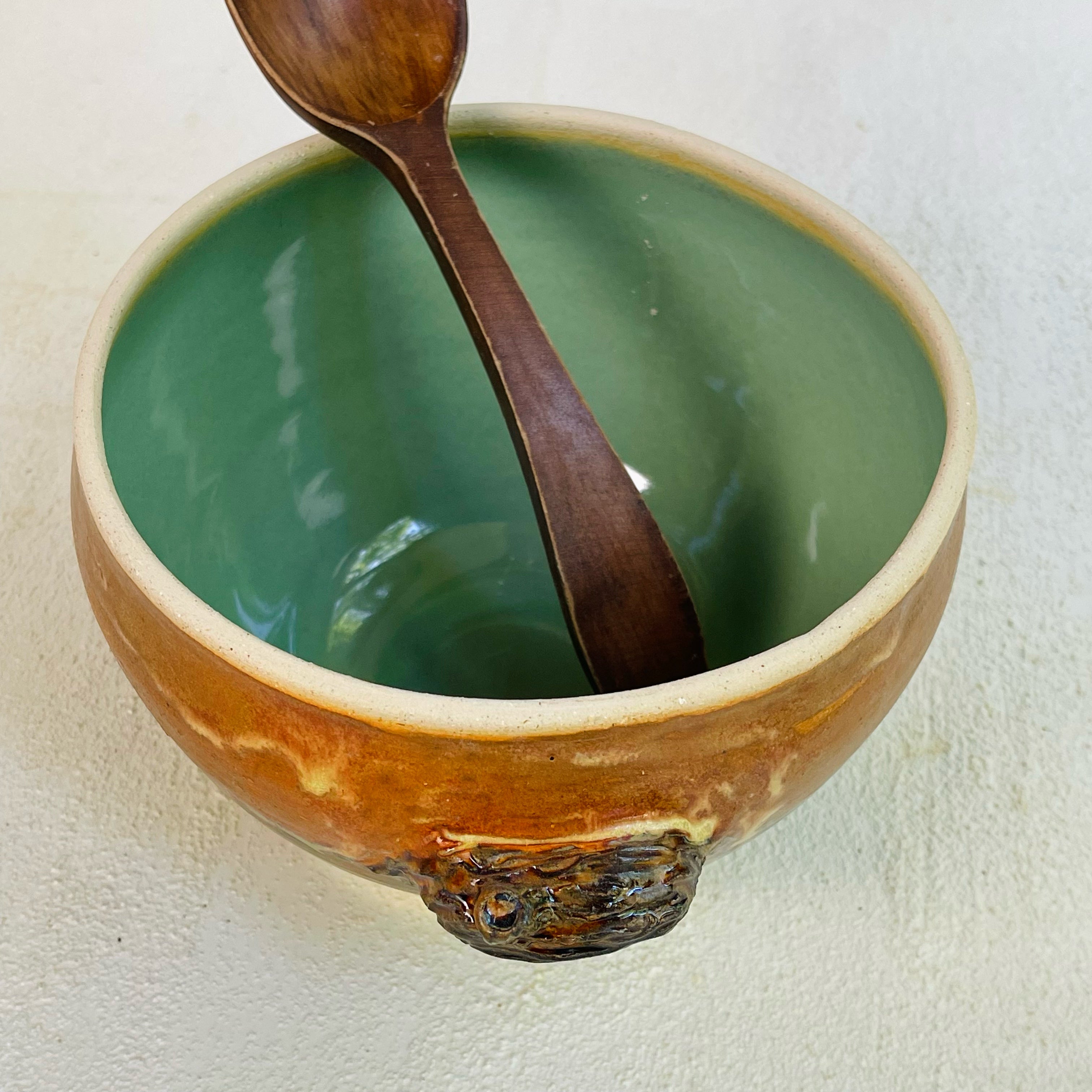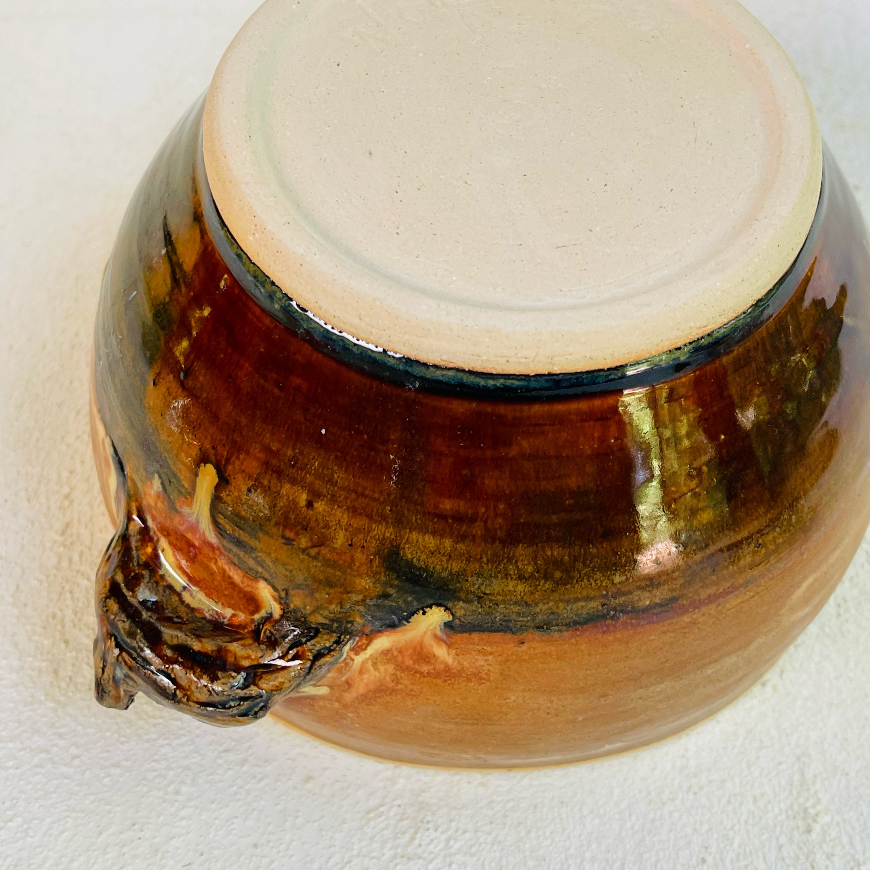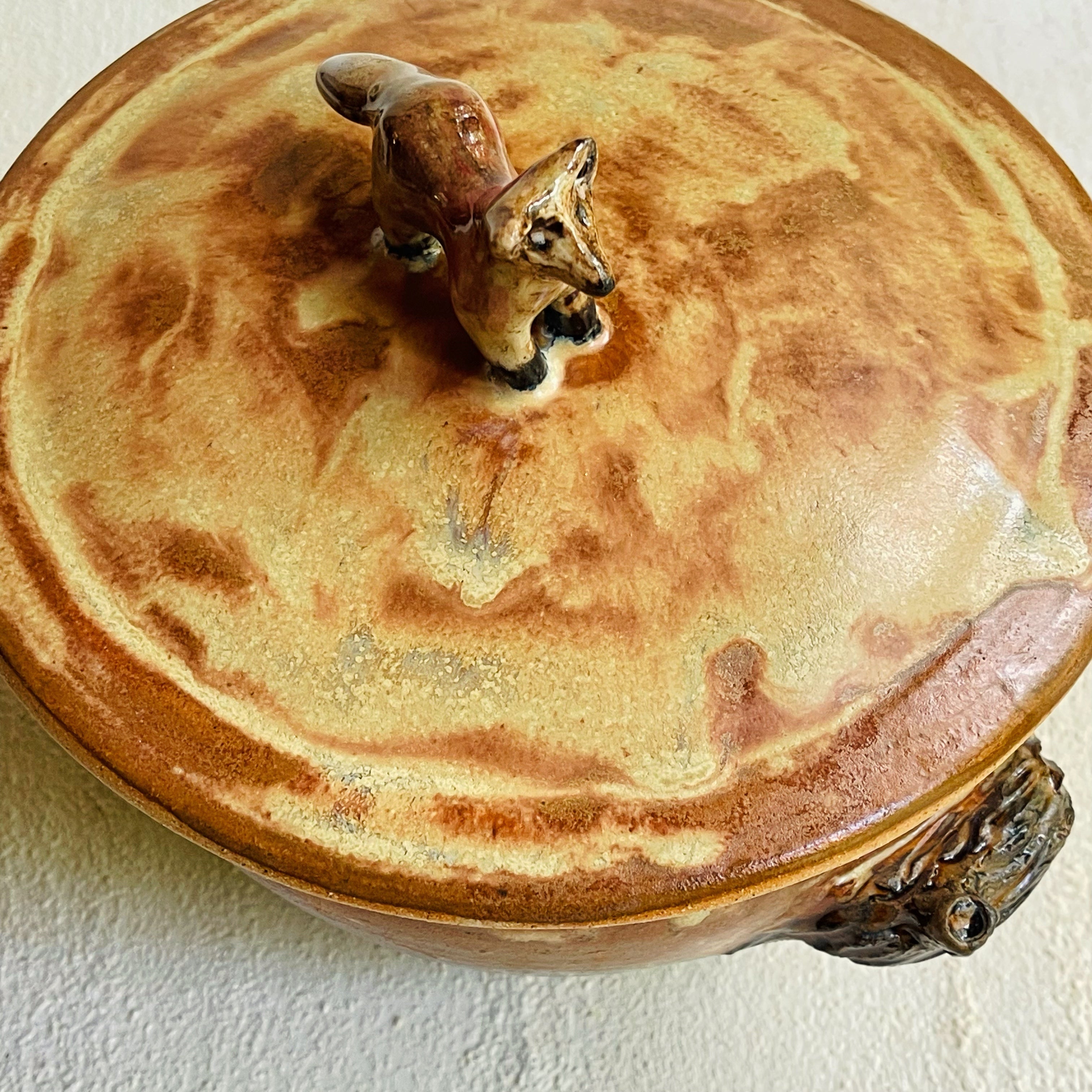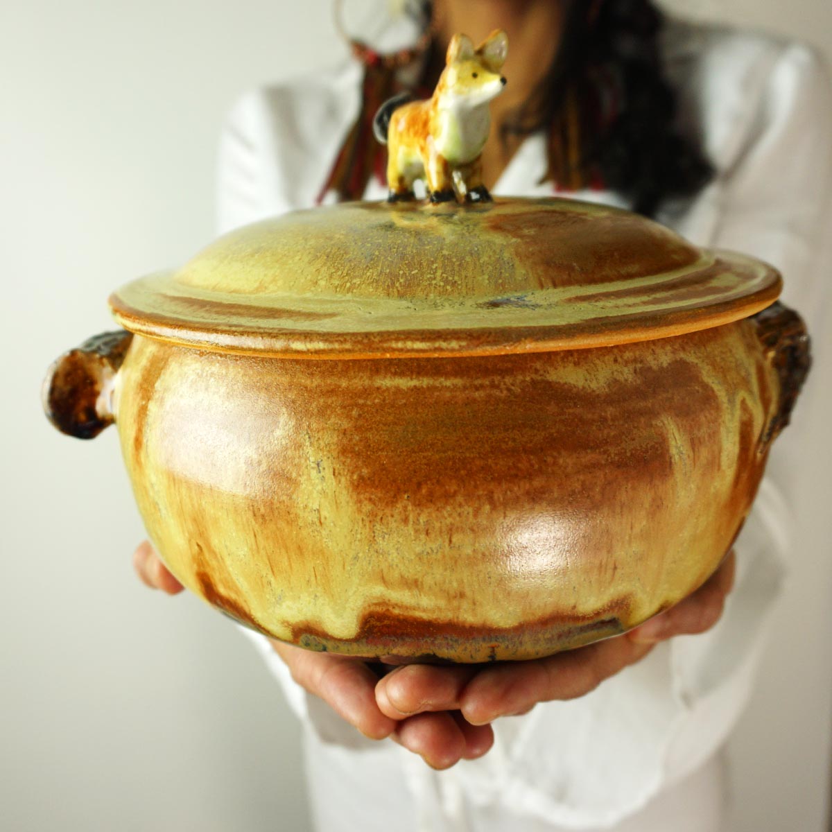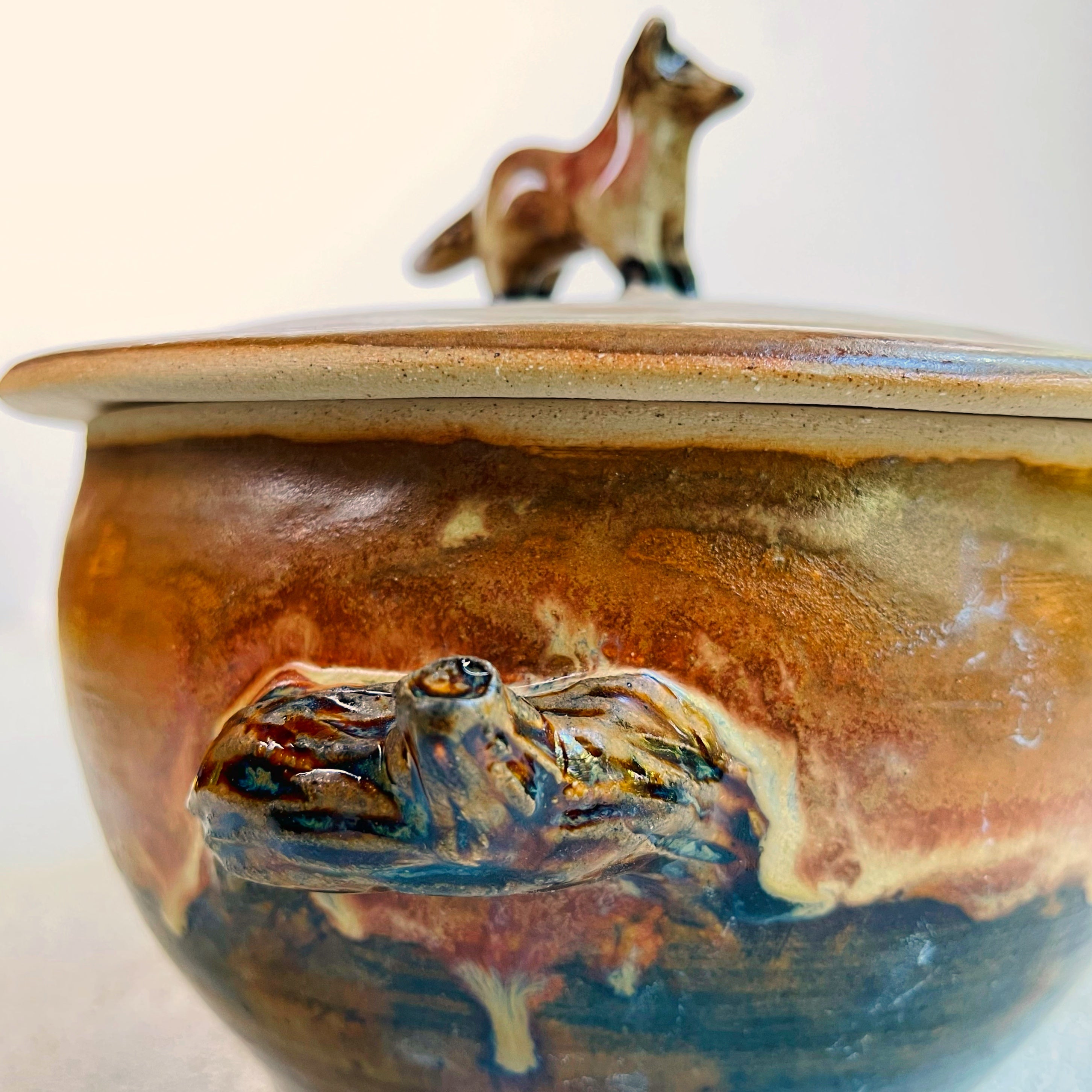 This wheel thrown lidded casserole has a hand sculpted fox as a knob and tree branches as handles.