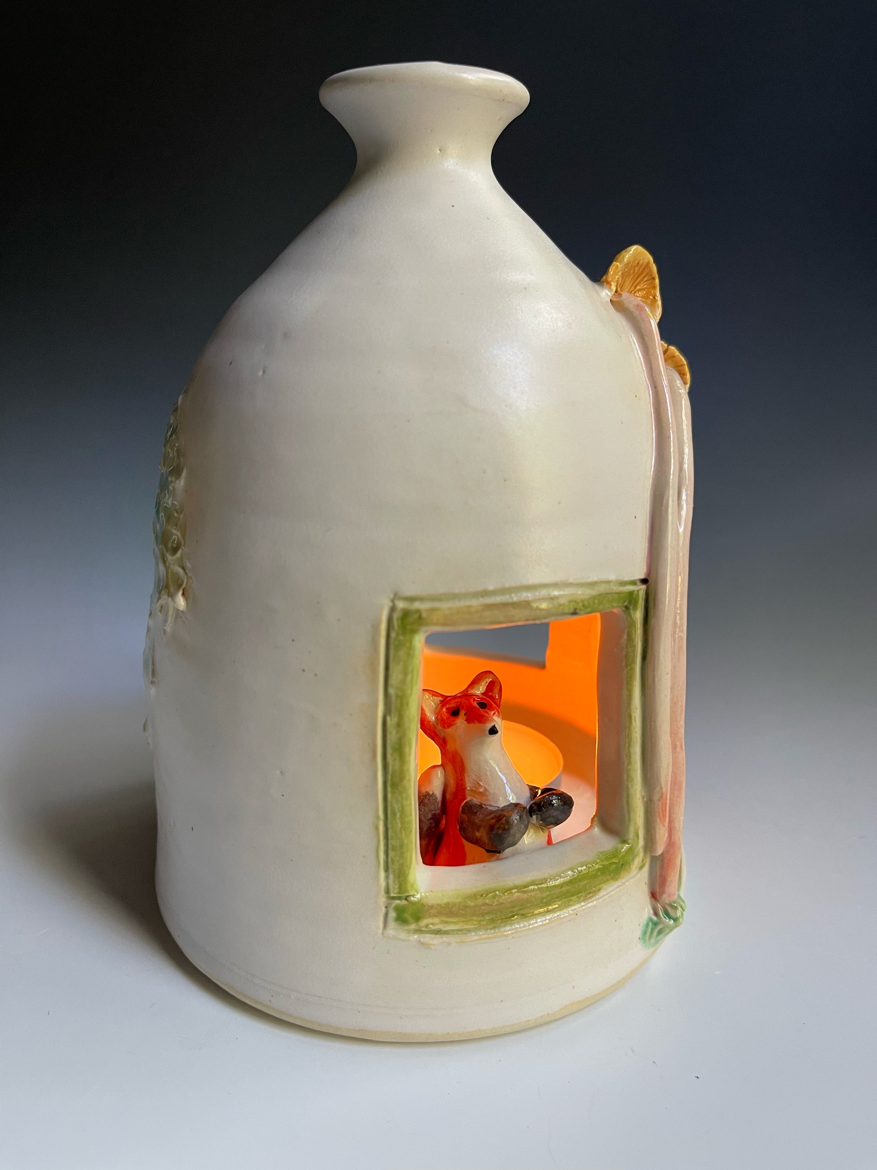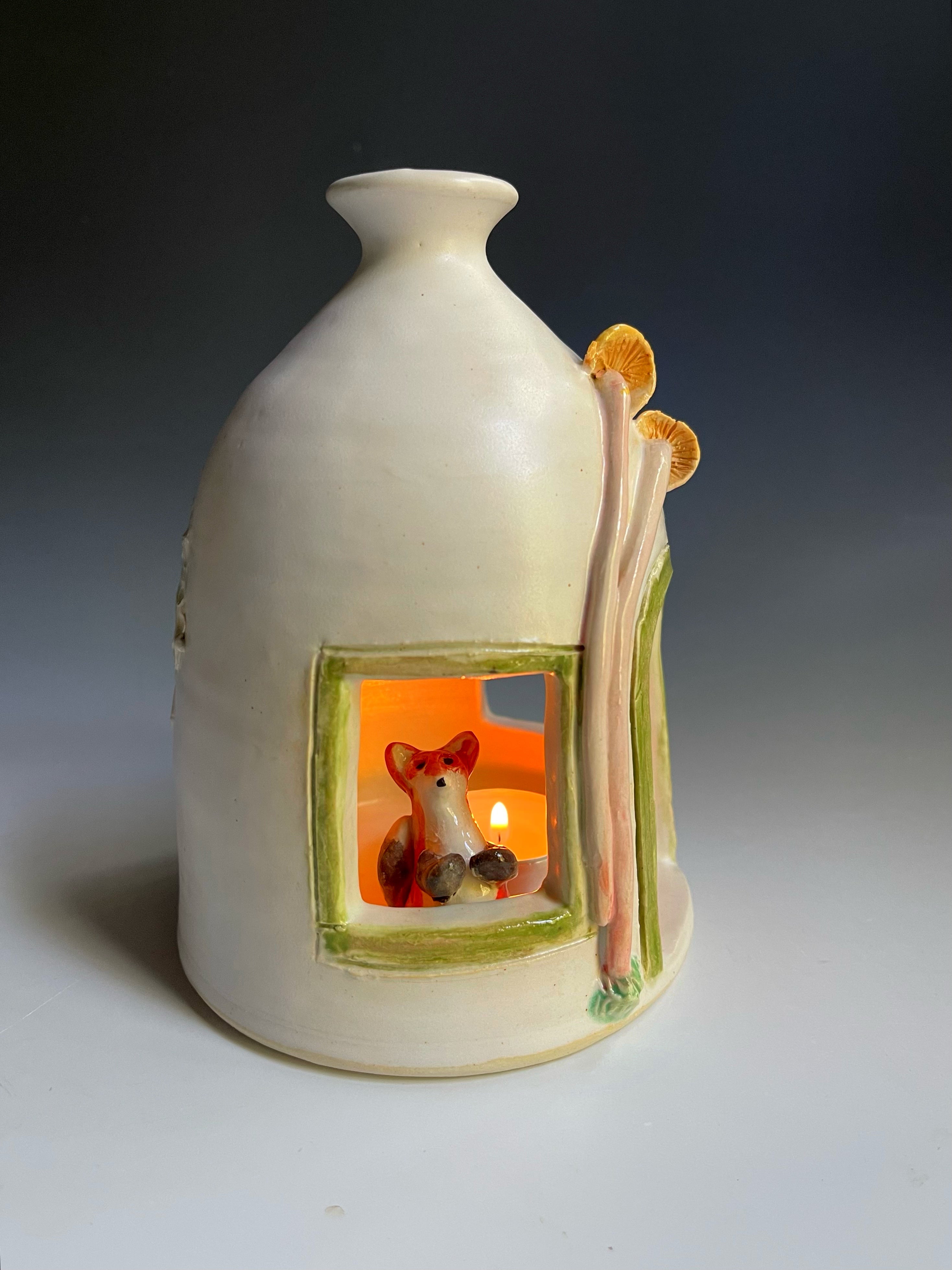 This lantern is in prototype and won’t be repeated exactly as is. If you like the price, snap it up now! She has a fox, mushrooms and moss in a dome shape.