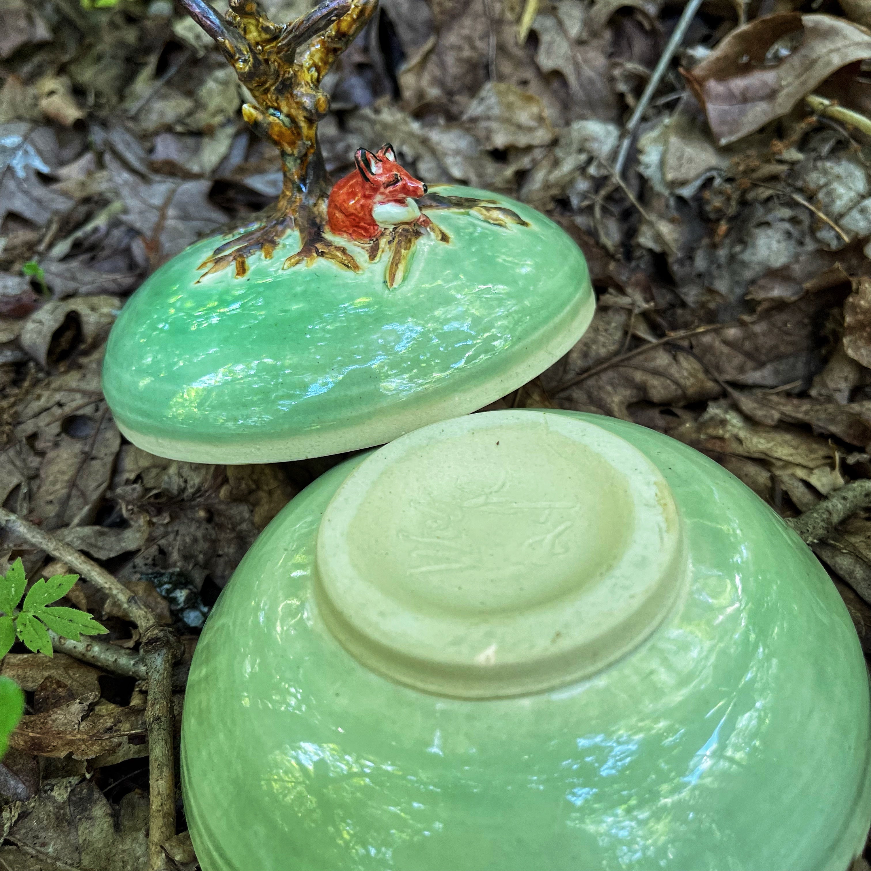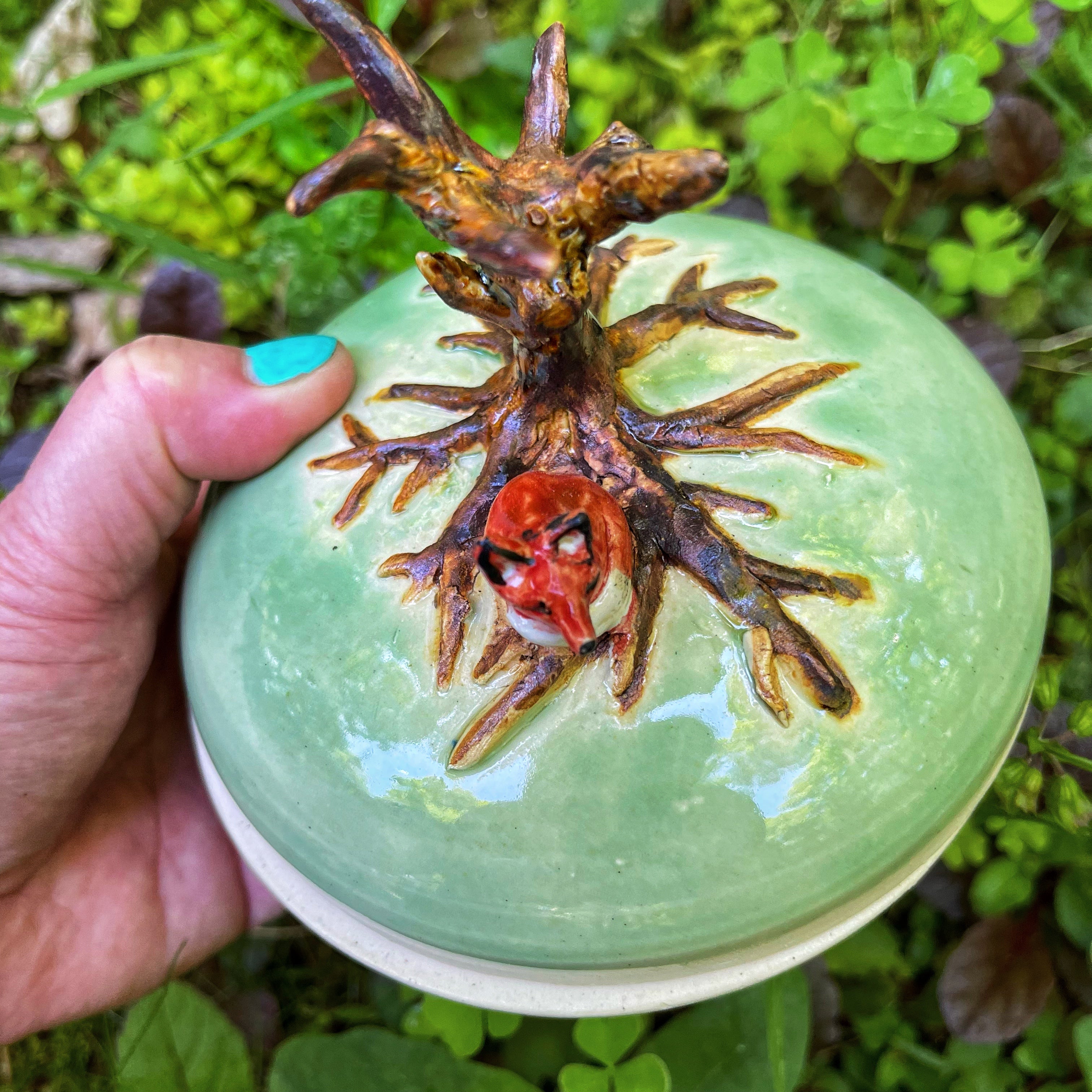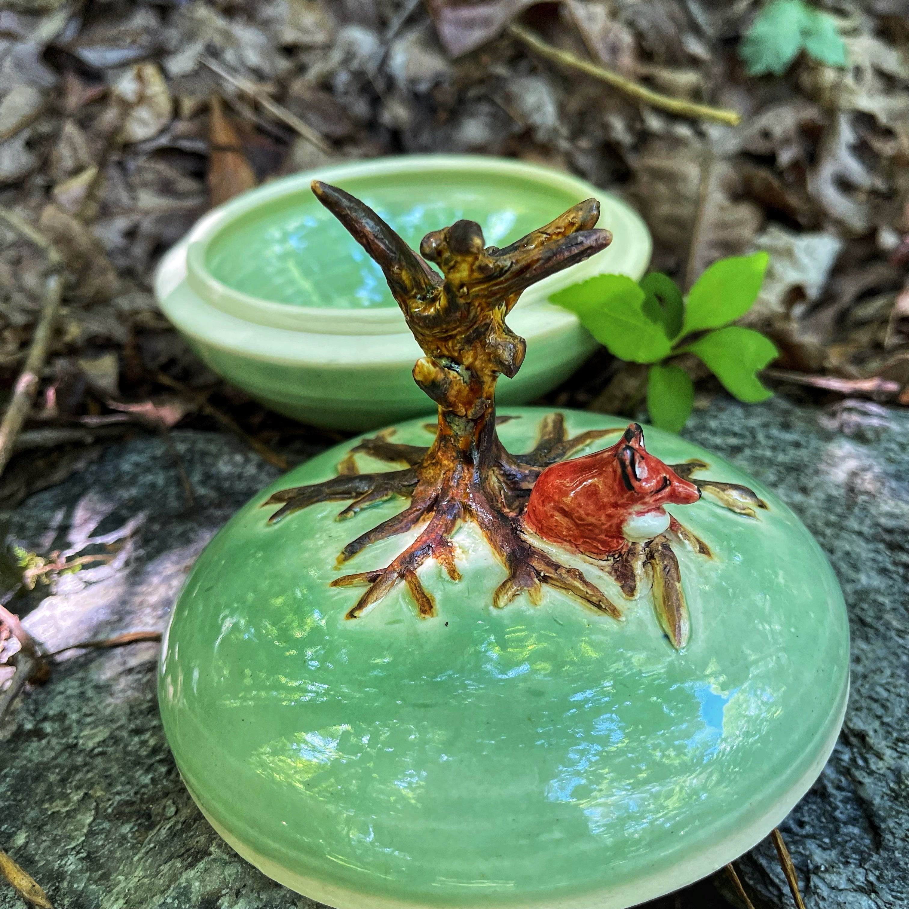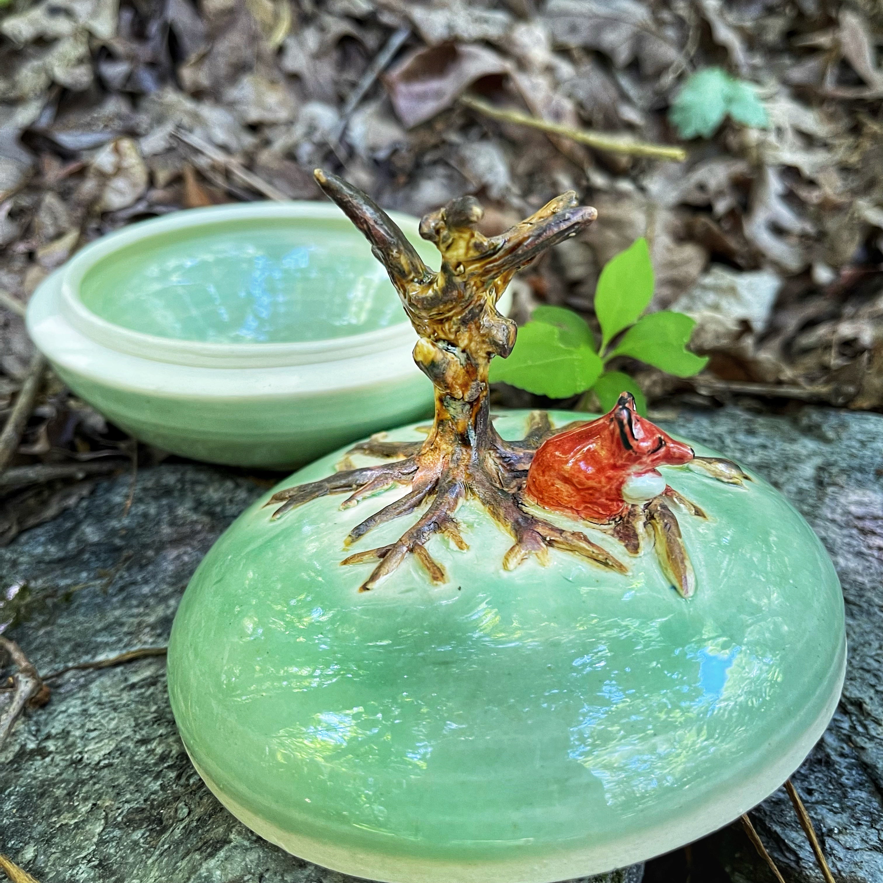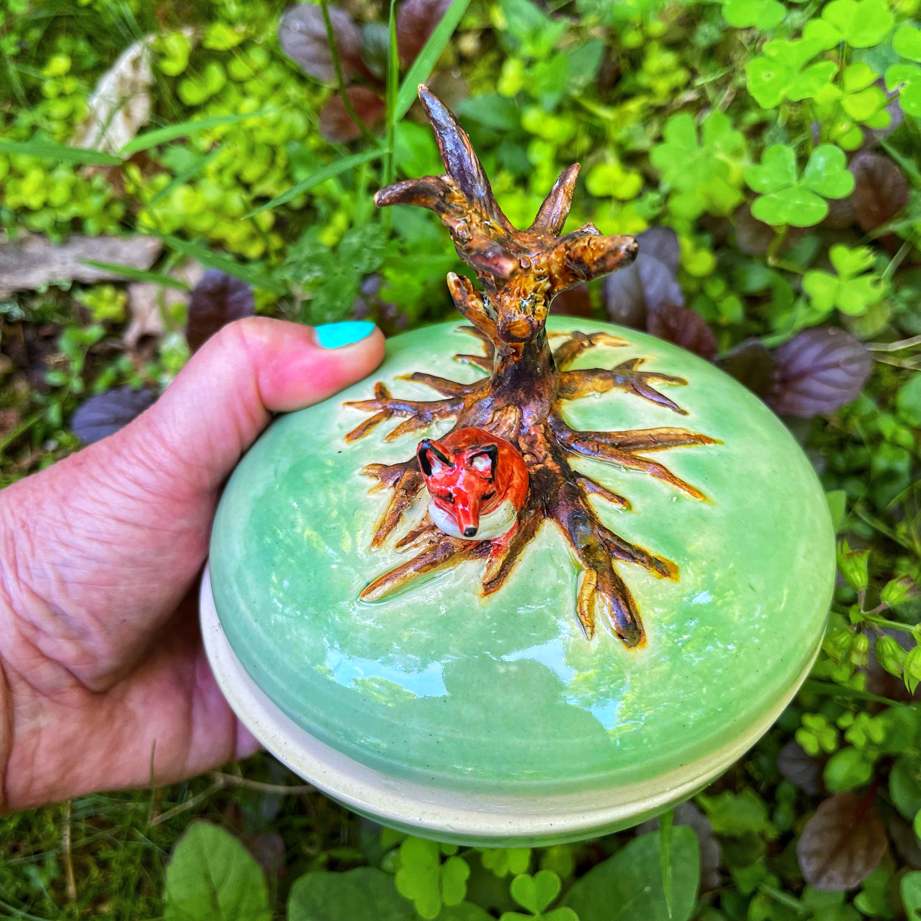 Beneath the ancient Tree of Life, a fox nestled in its roots, calling forth wisdom to navigate a complex situation. If you put a slip of paper inside this ceramic box, you might acquire the answers you seek. Or maybe it’s just a charming place for a dear momento.