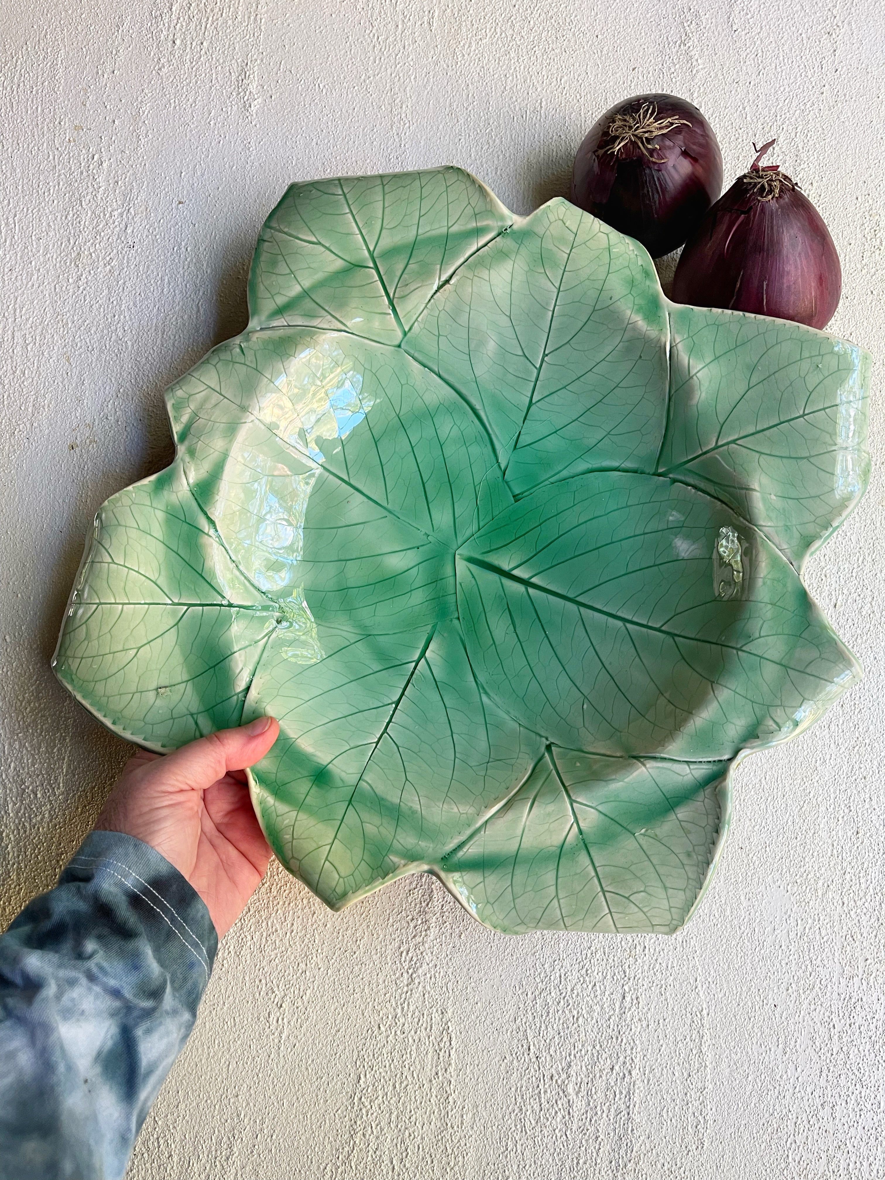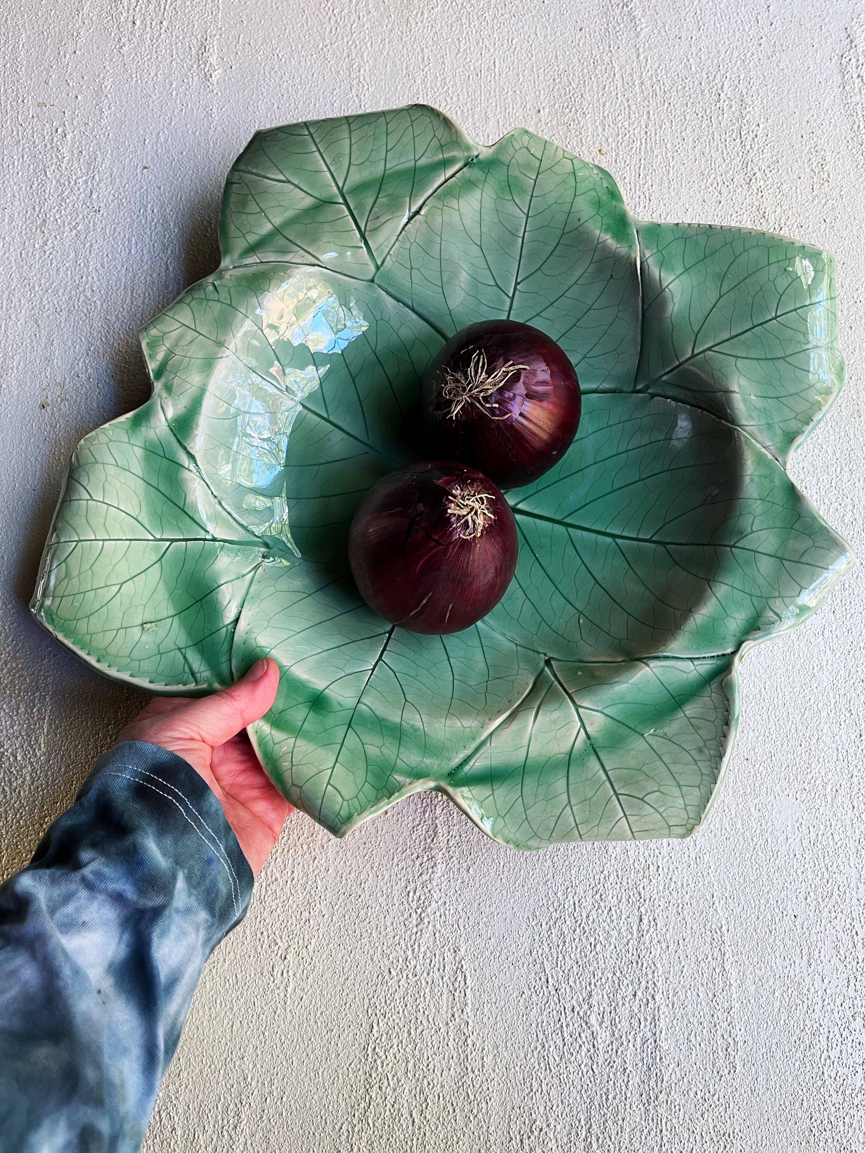 A Showstopper! large hand built serving platter or hanging wall art made by pressing real hosta leaves into clay. The leaves are curled as a design interest. A foot rim was added for balance and strength. 16” X 3" H, holds a roast chicken, 16 piled biscuits, pasta for 8.