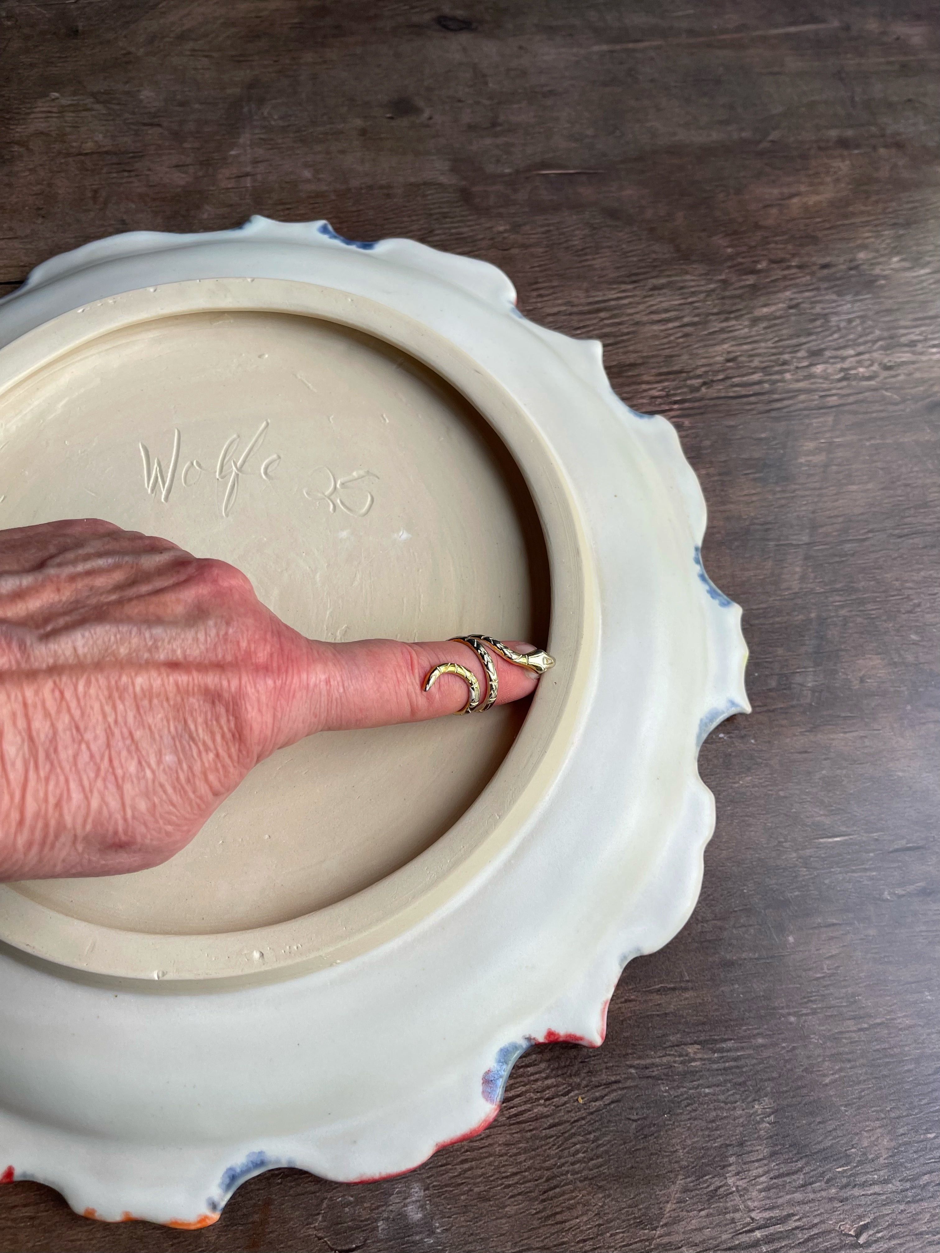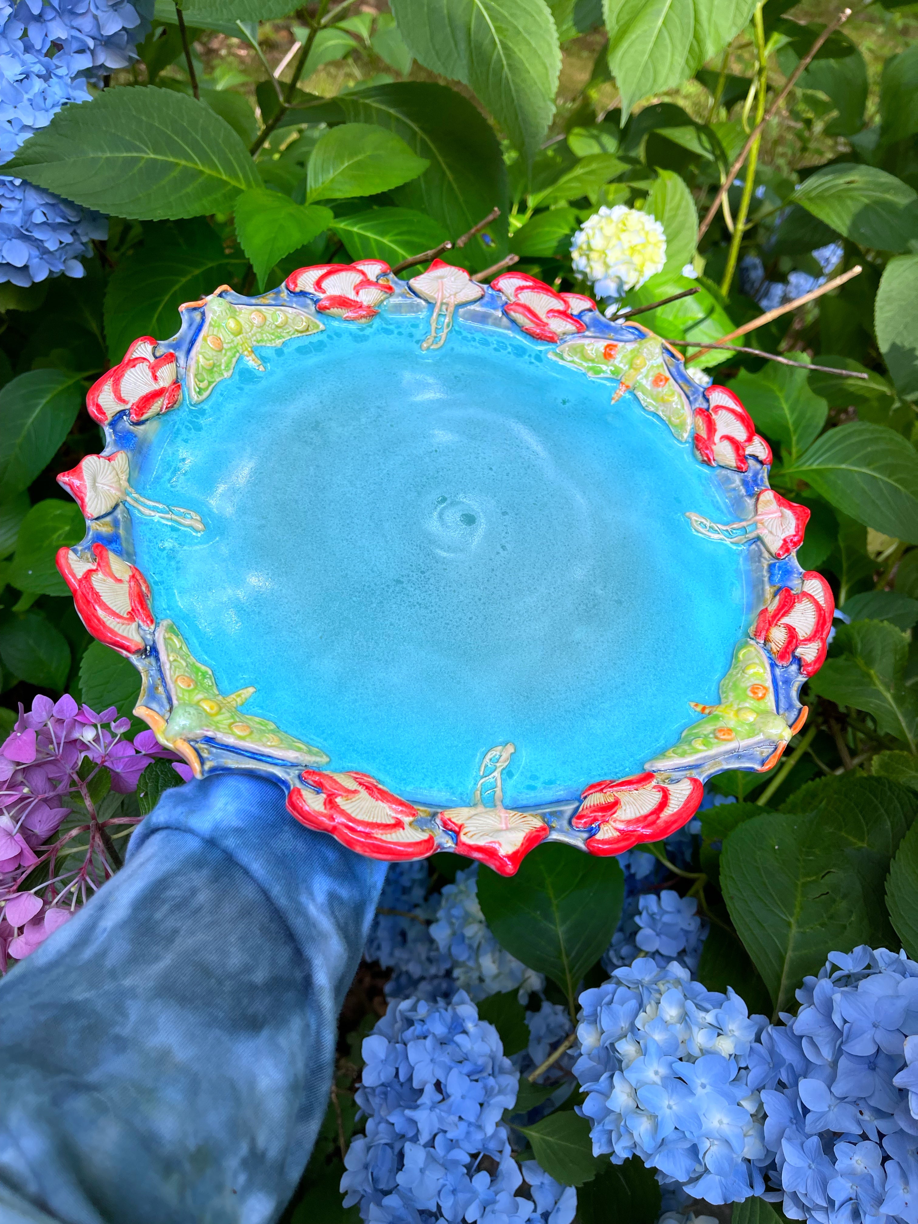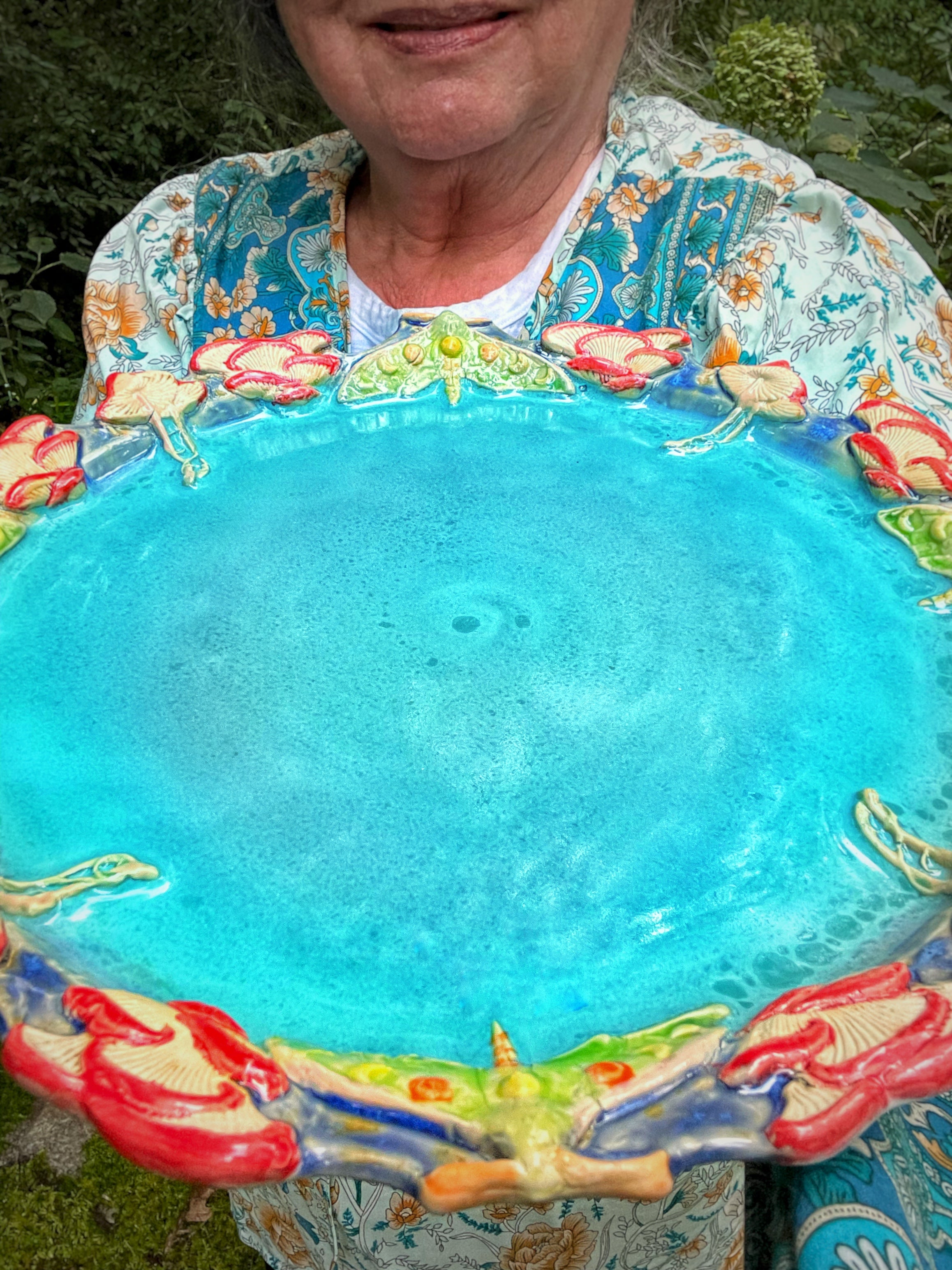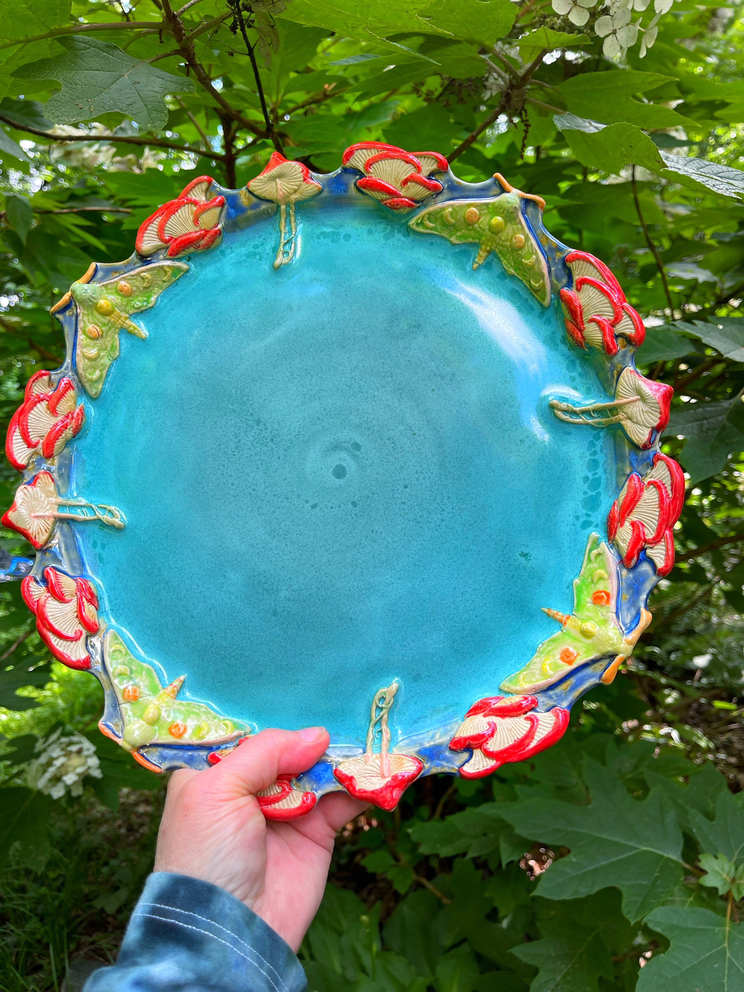 This functional stoneware serving platter was thrown then sculpted with a ring of moths and mushrooms . The Luna moth is believed to bring good luck. It is a spectacular piece with some minor cracks. You probably won’t notice them and it won’t bother you so enjoy the savings!