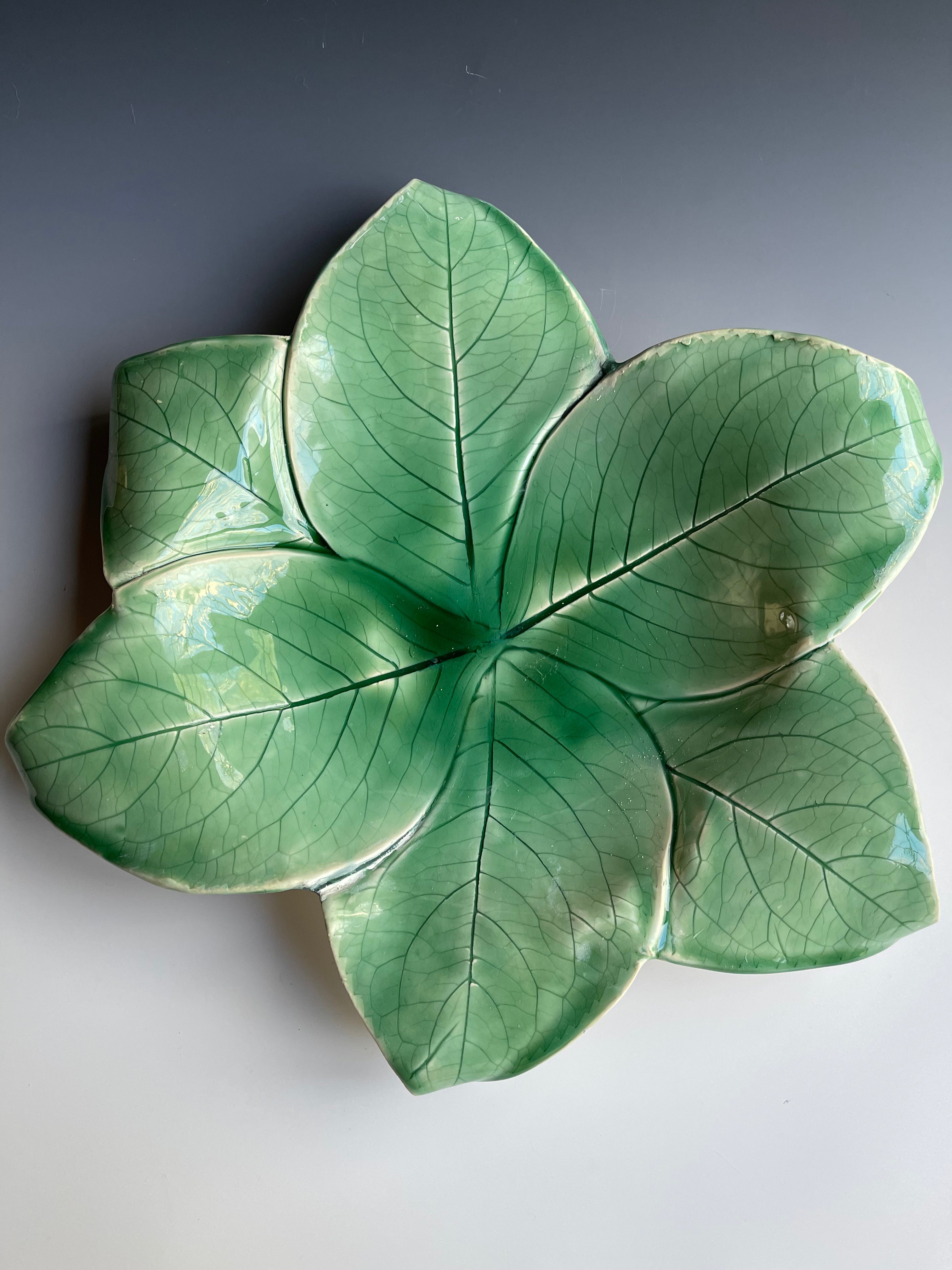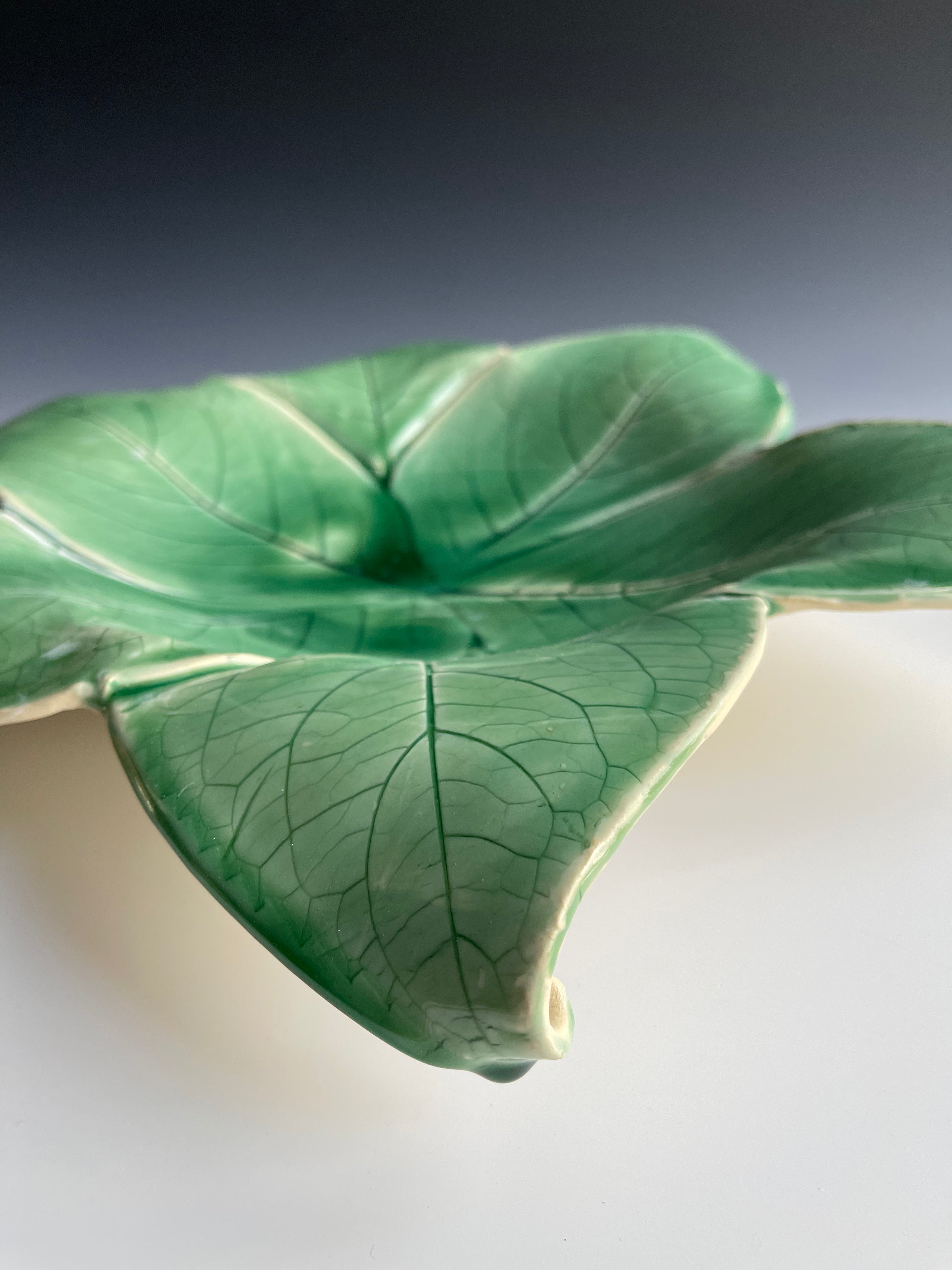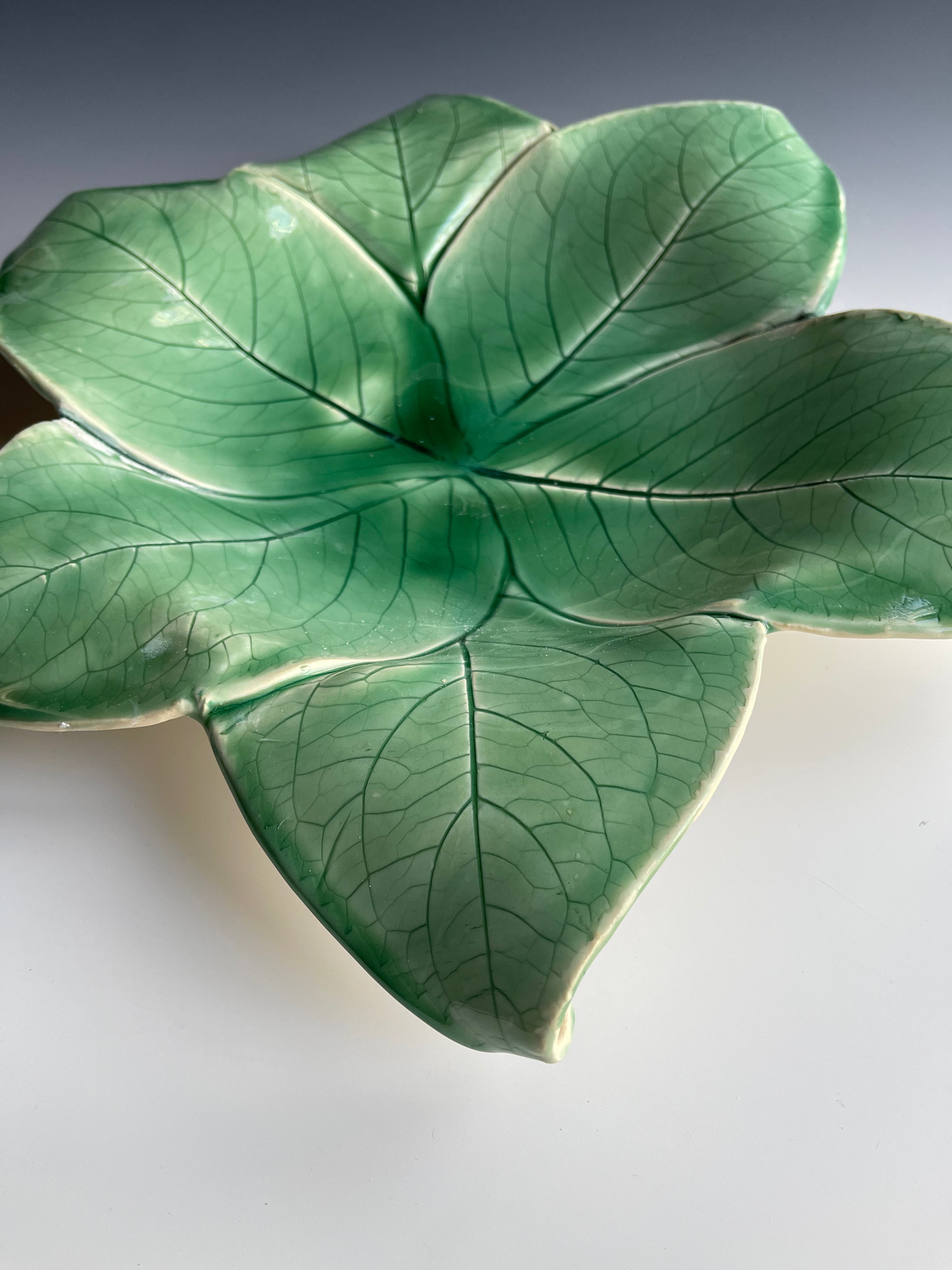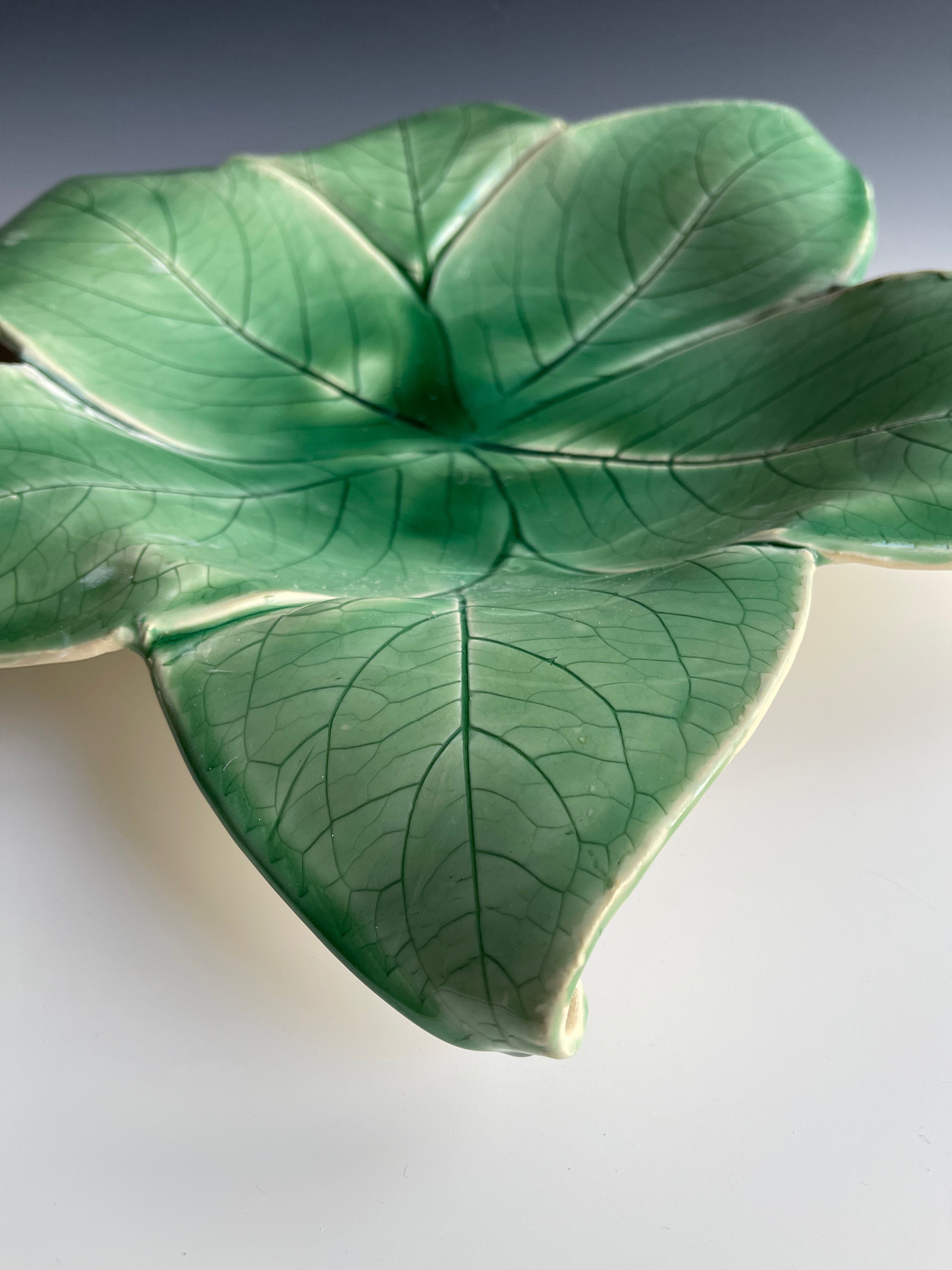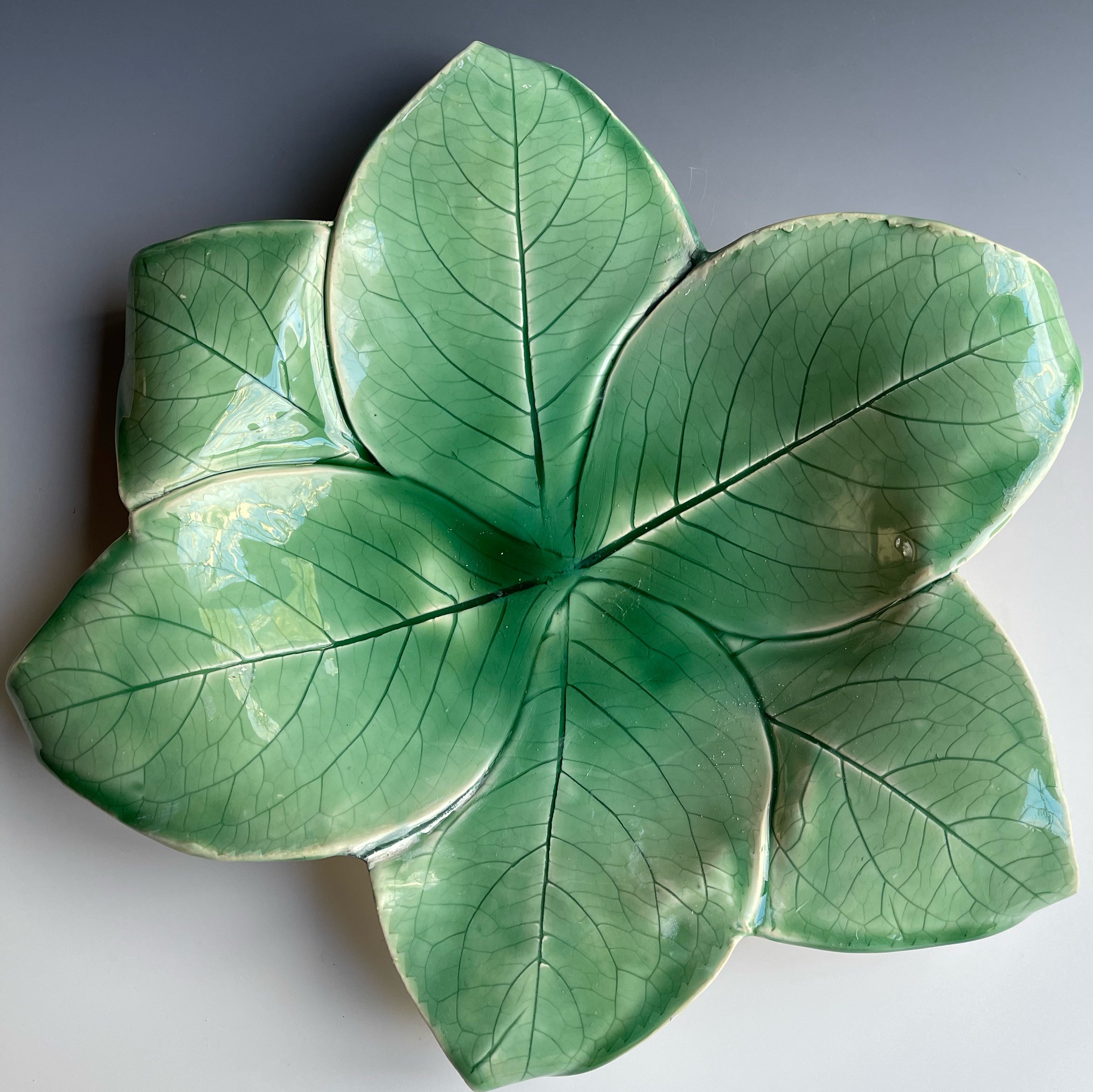 A Showstopper! large hand built serving platter or hanging wall art made by pressing real hosta leaves into clay. The leaves are curled as a design interest. A foot rim was added for balance and strength. 16” X 3" H, holds a roast chicken, 16 piled biscuits, pasta for 8.