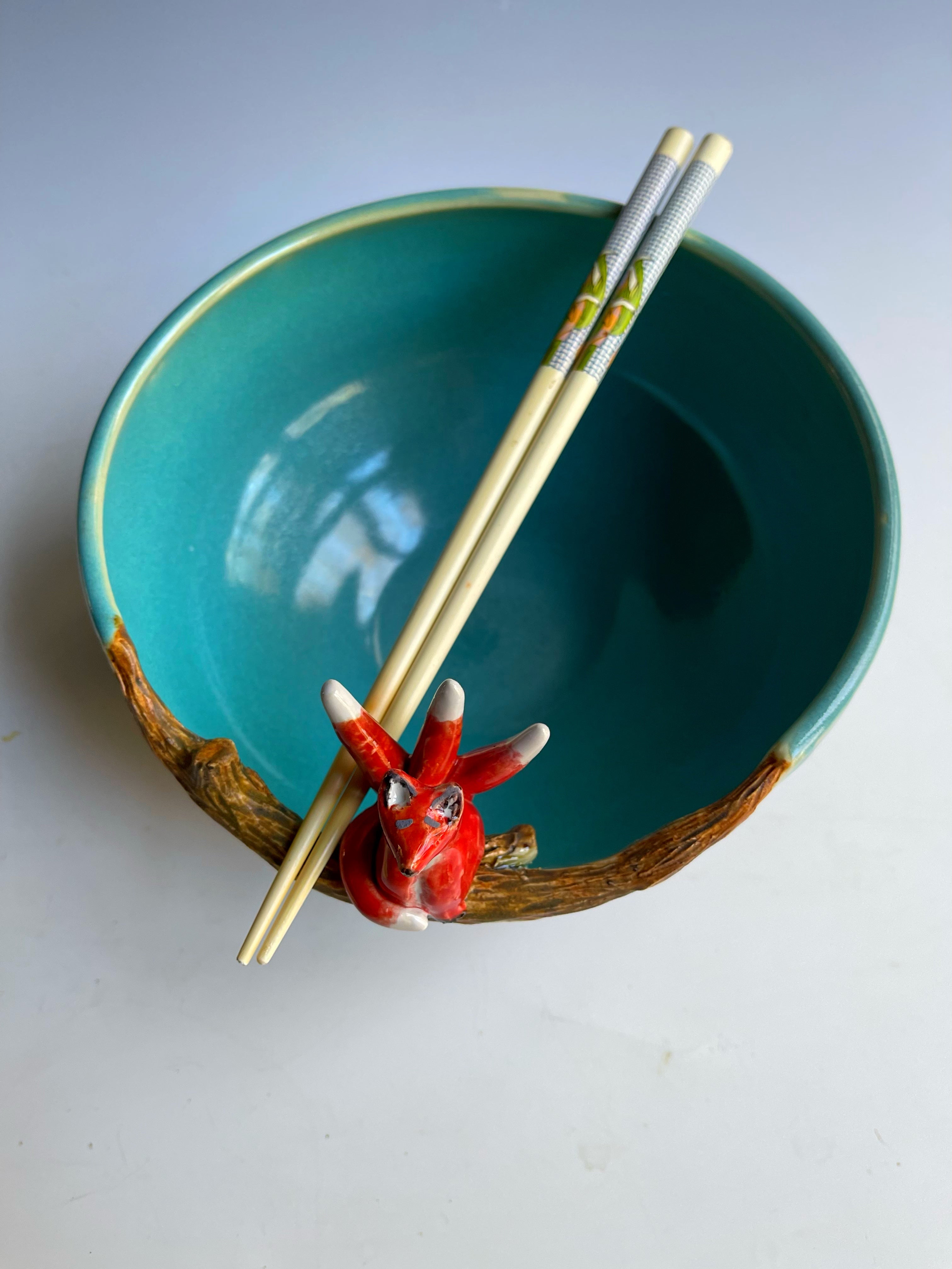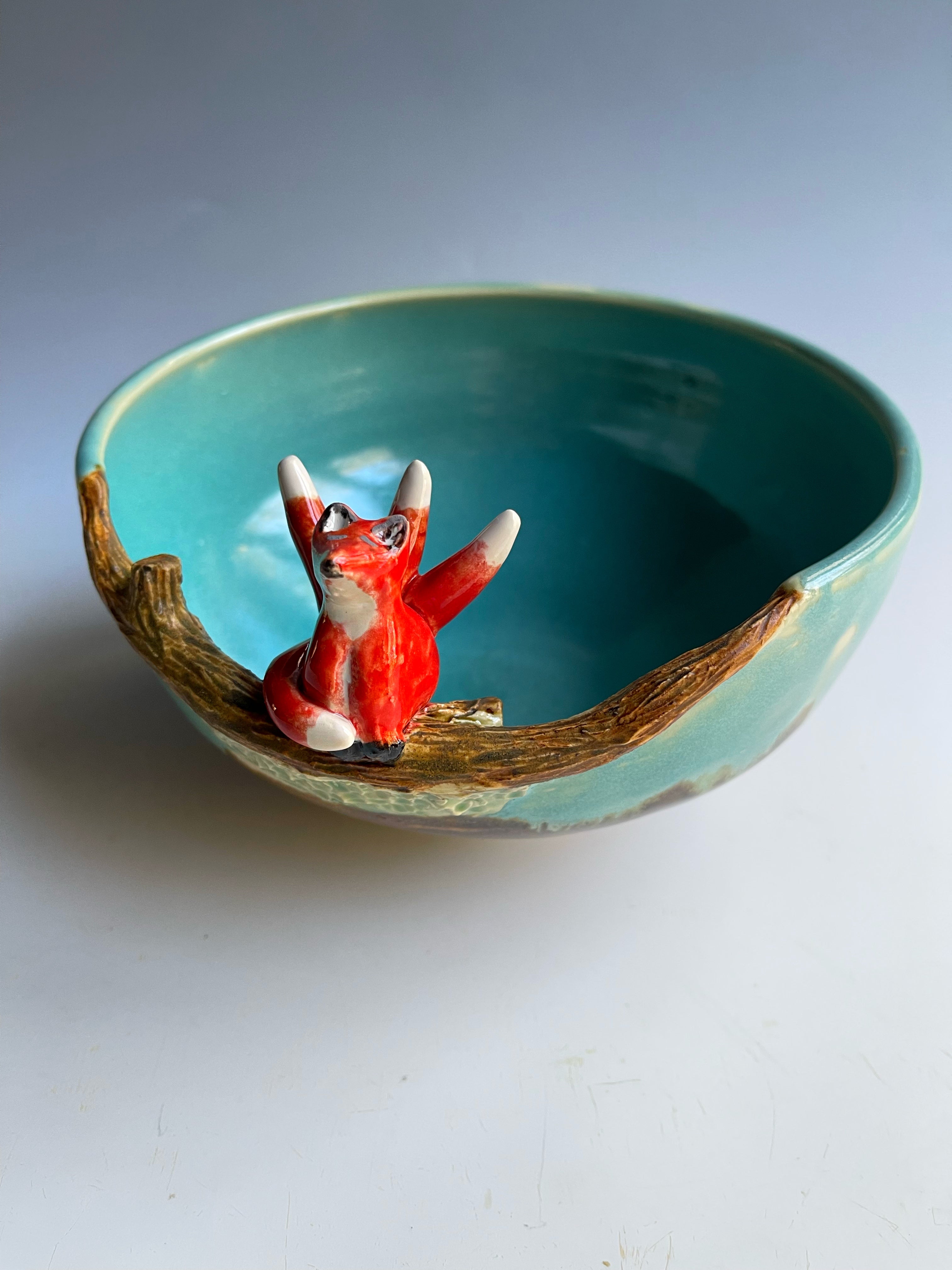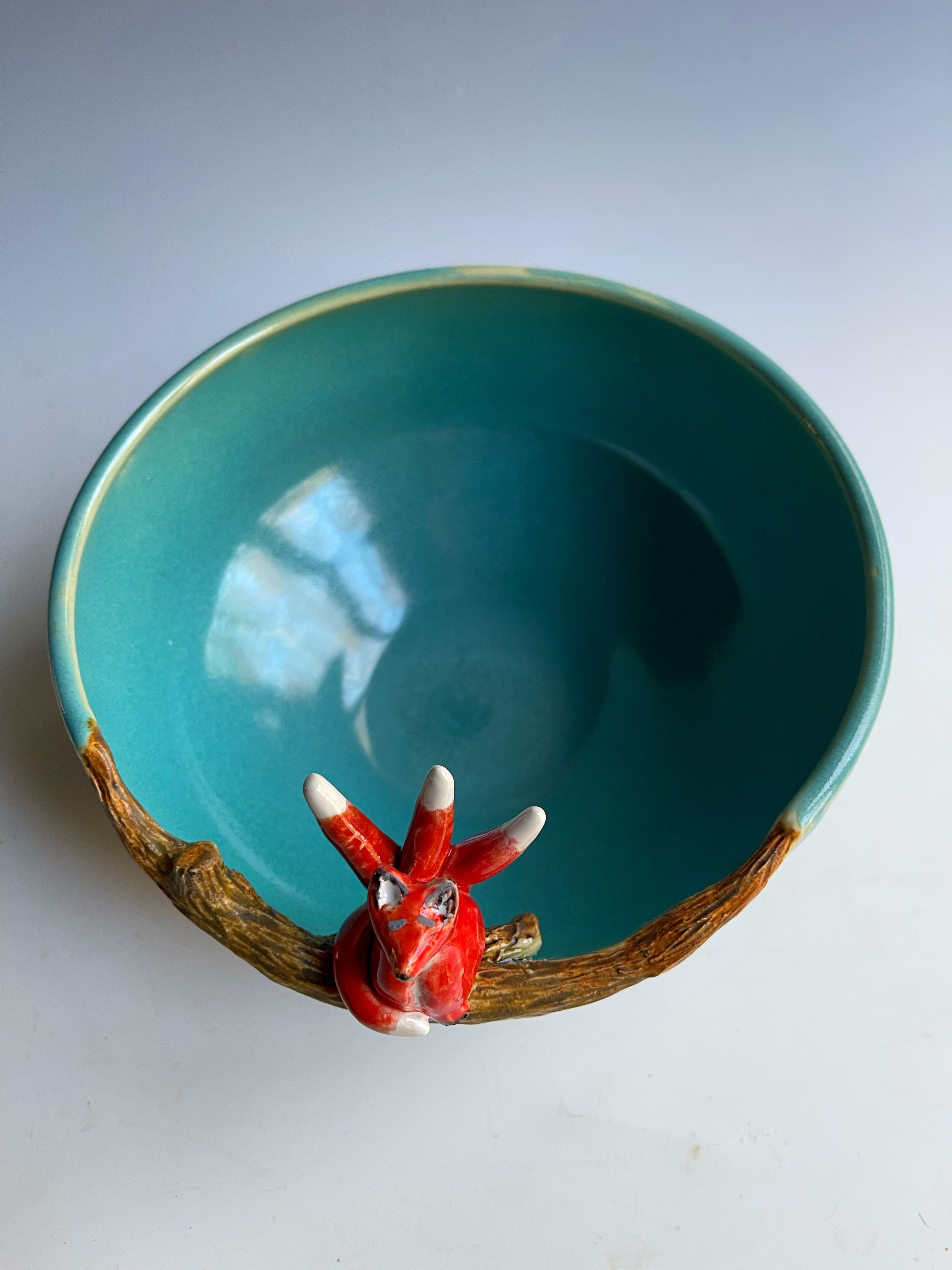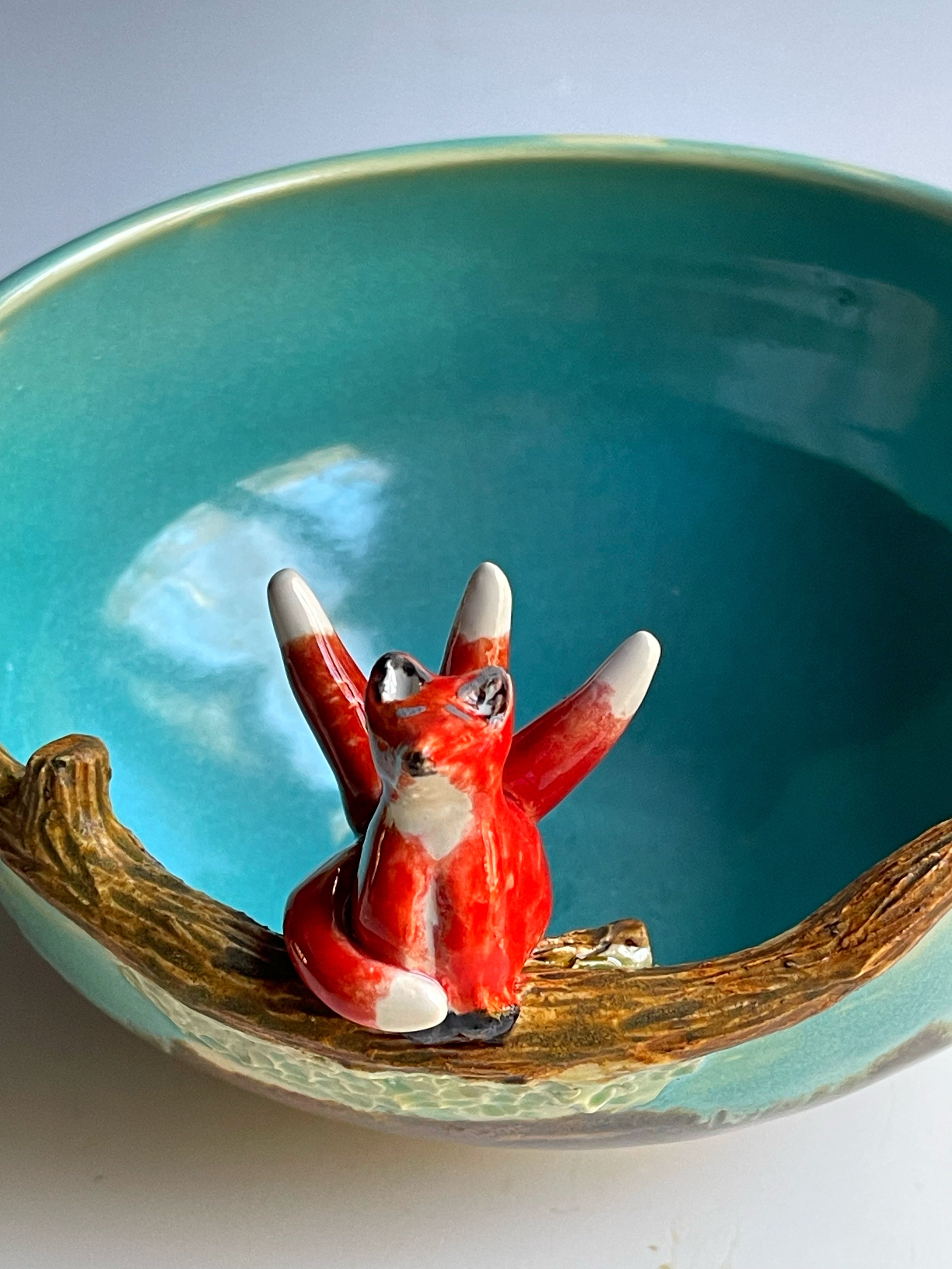 A kitsune is a Japanese fox. Kitsune are believed to possess superior intelligence, long life, and magical powers. Those who grow more powerful acquire more tails. There in one 4-tailed fox on this bowl. It may be used as a special centerpiece or as a serving bowl.