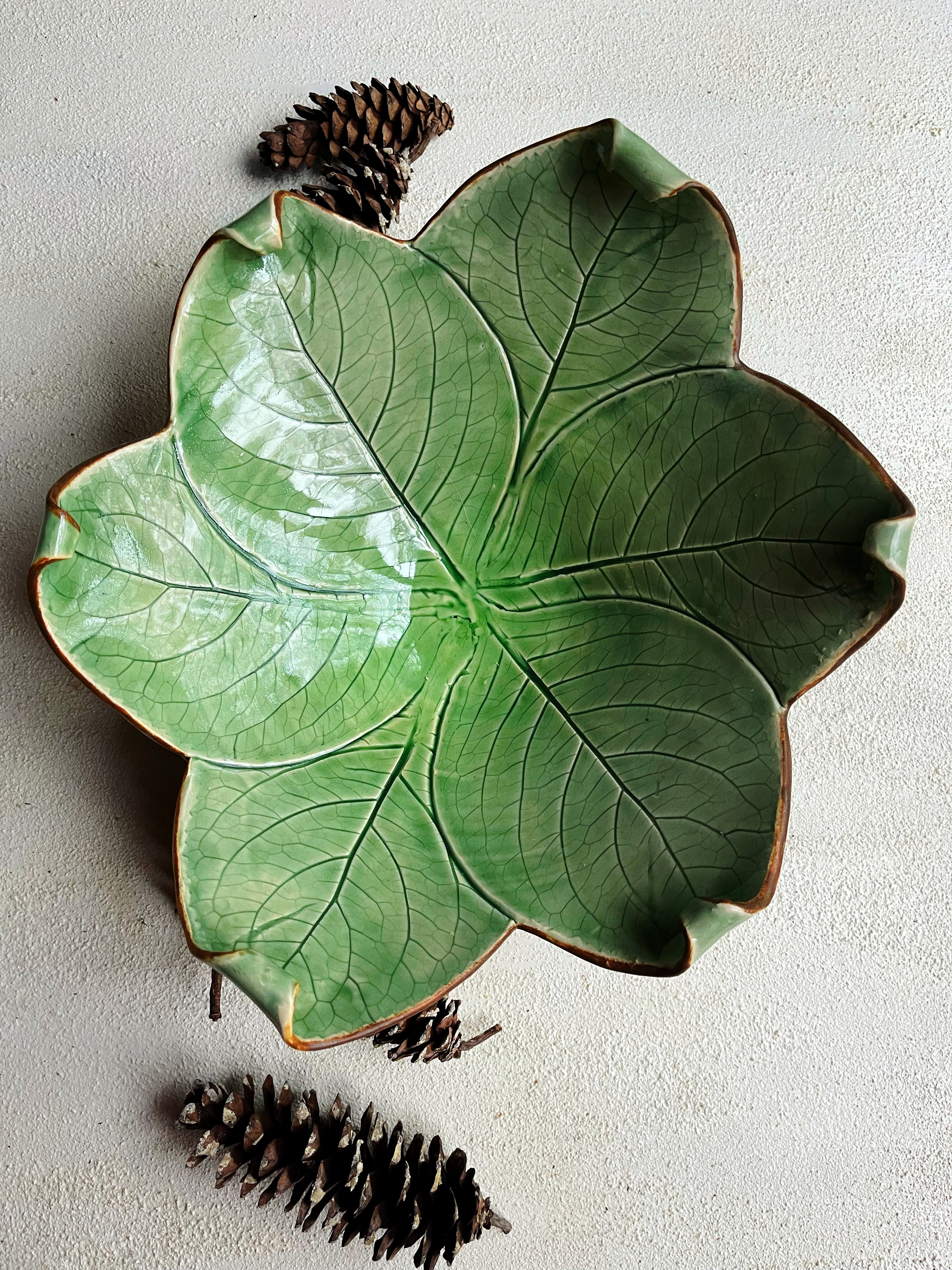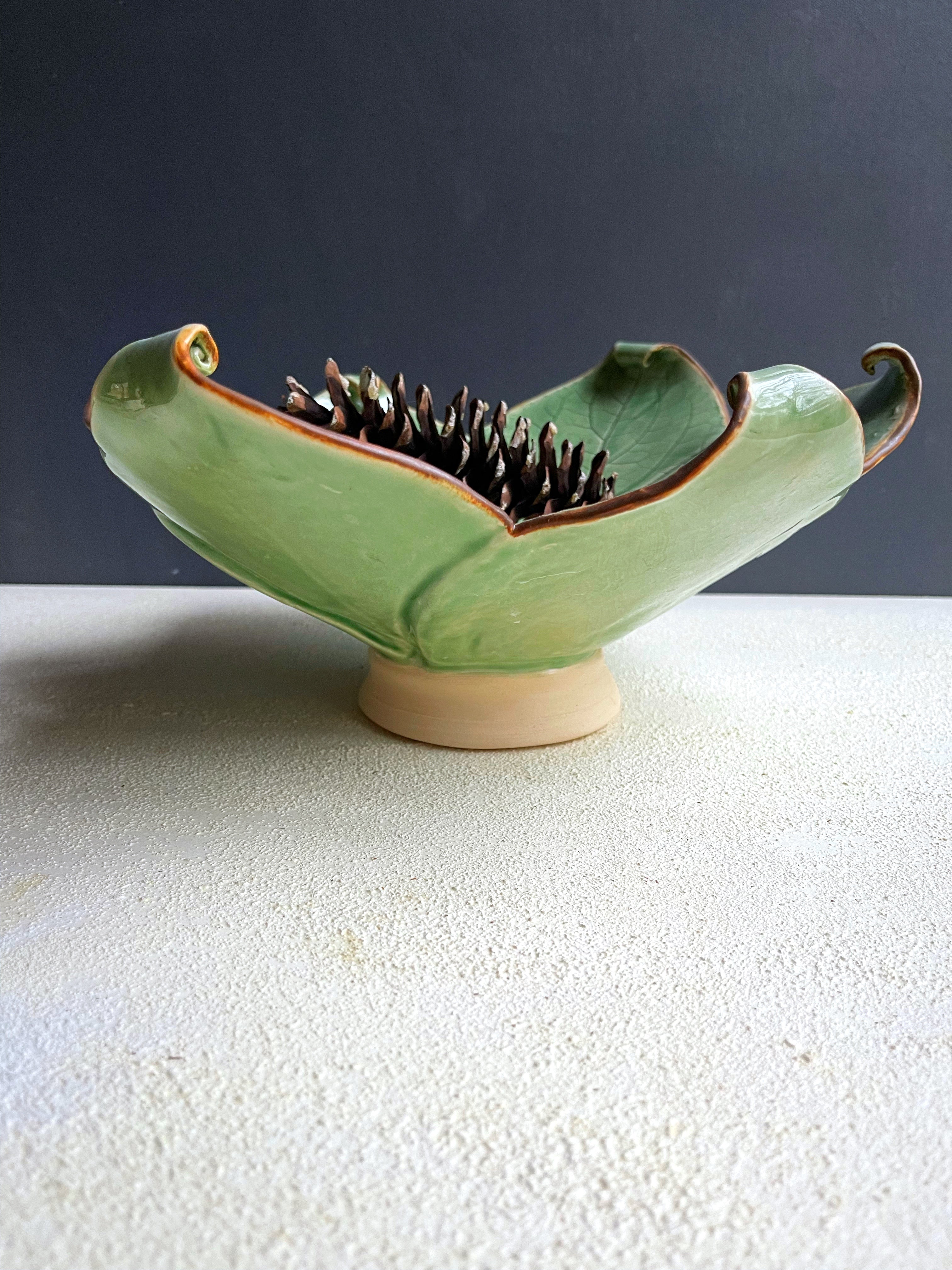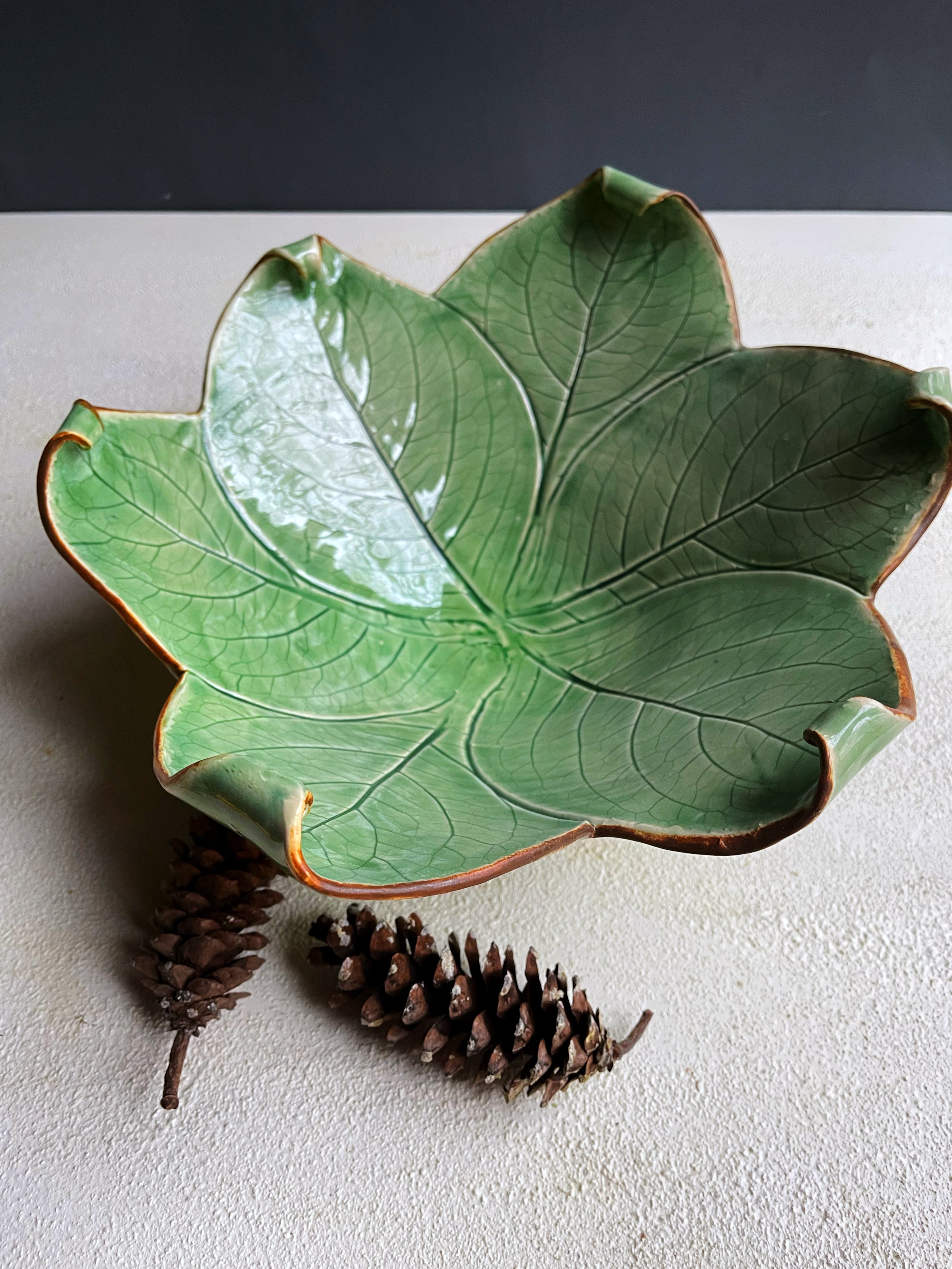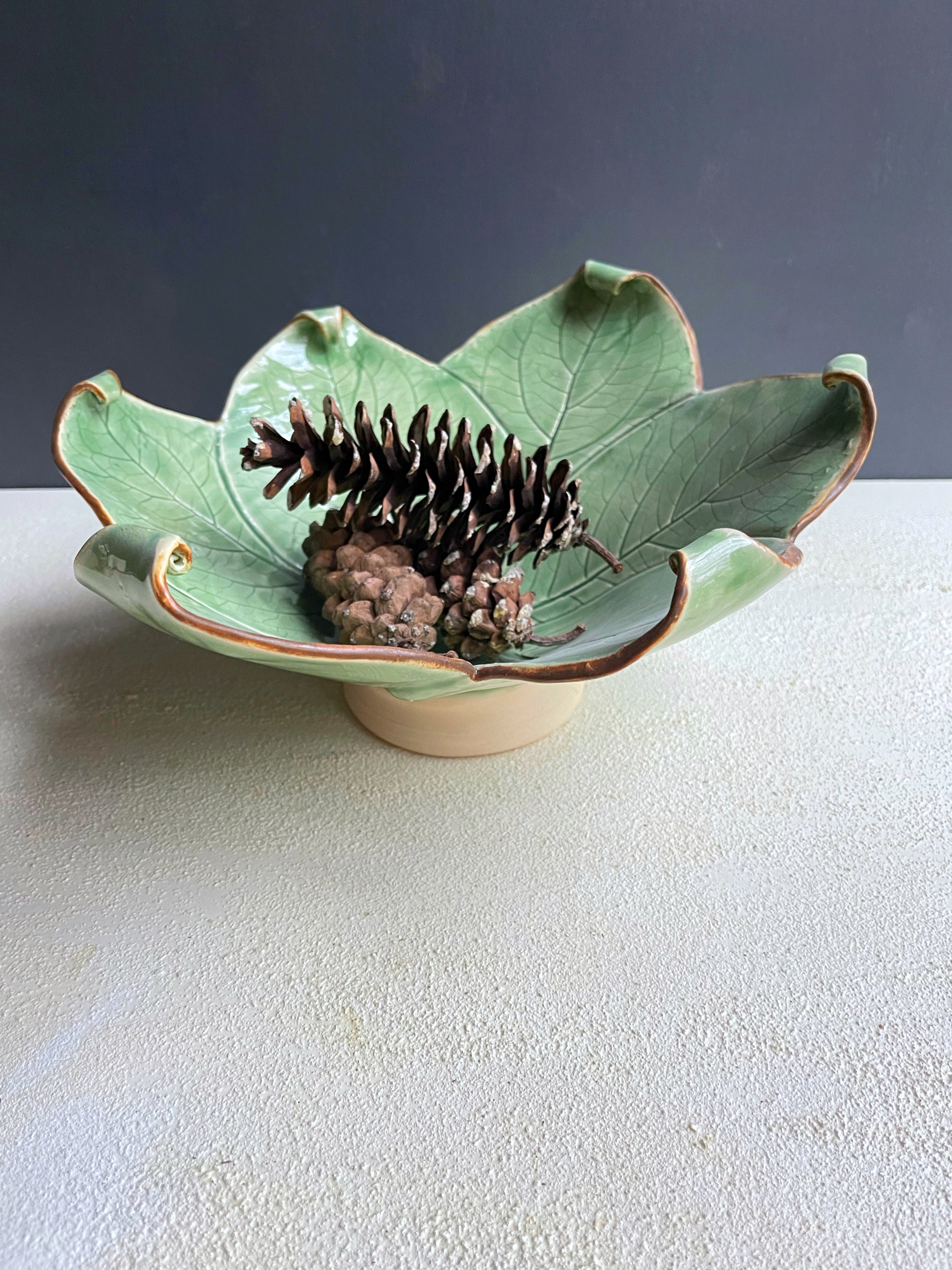A large hand built bowl made by pressing real hydrangea leaves into clay. A pedestal foot rim was added for balance and strength. 12" D X 5 1/2" H