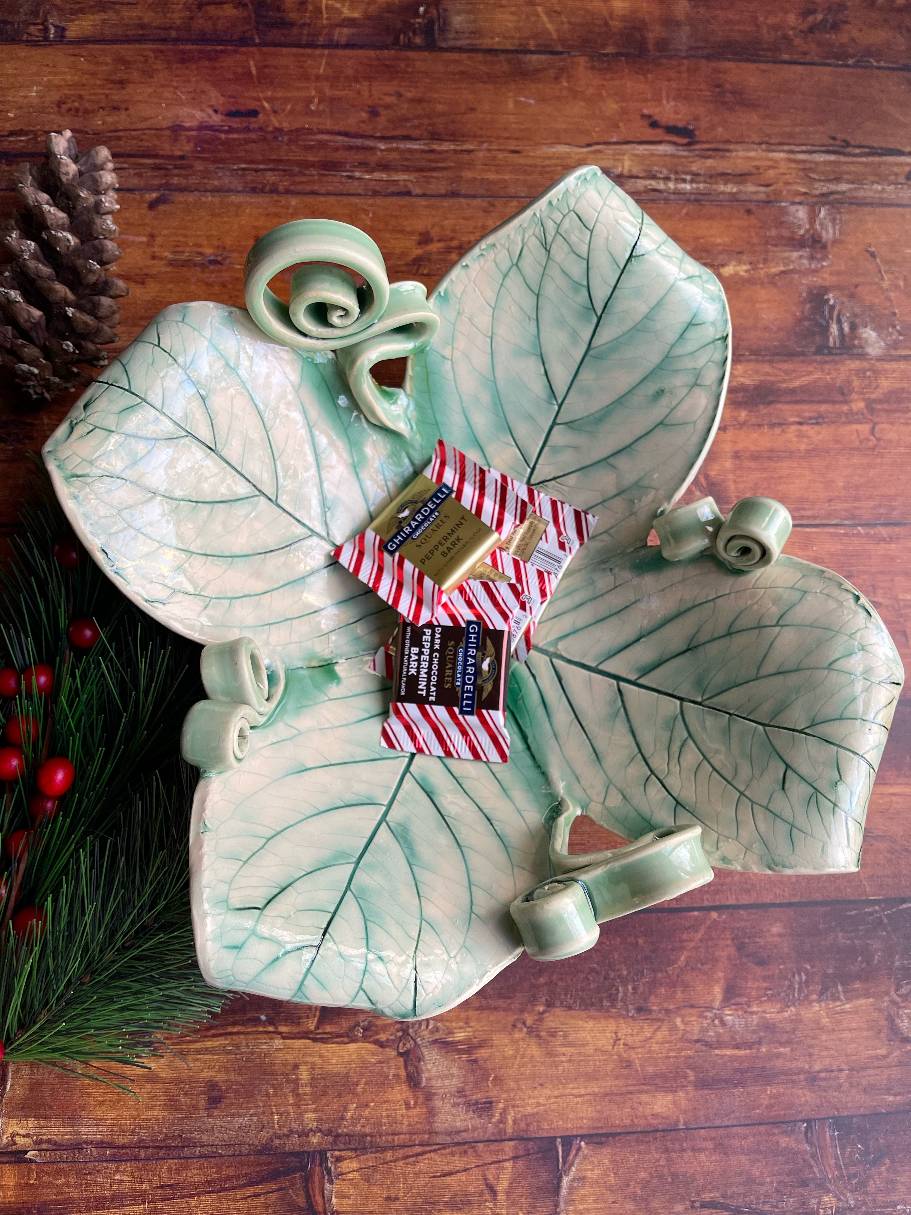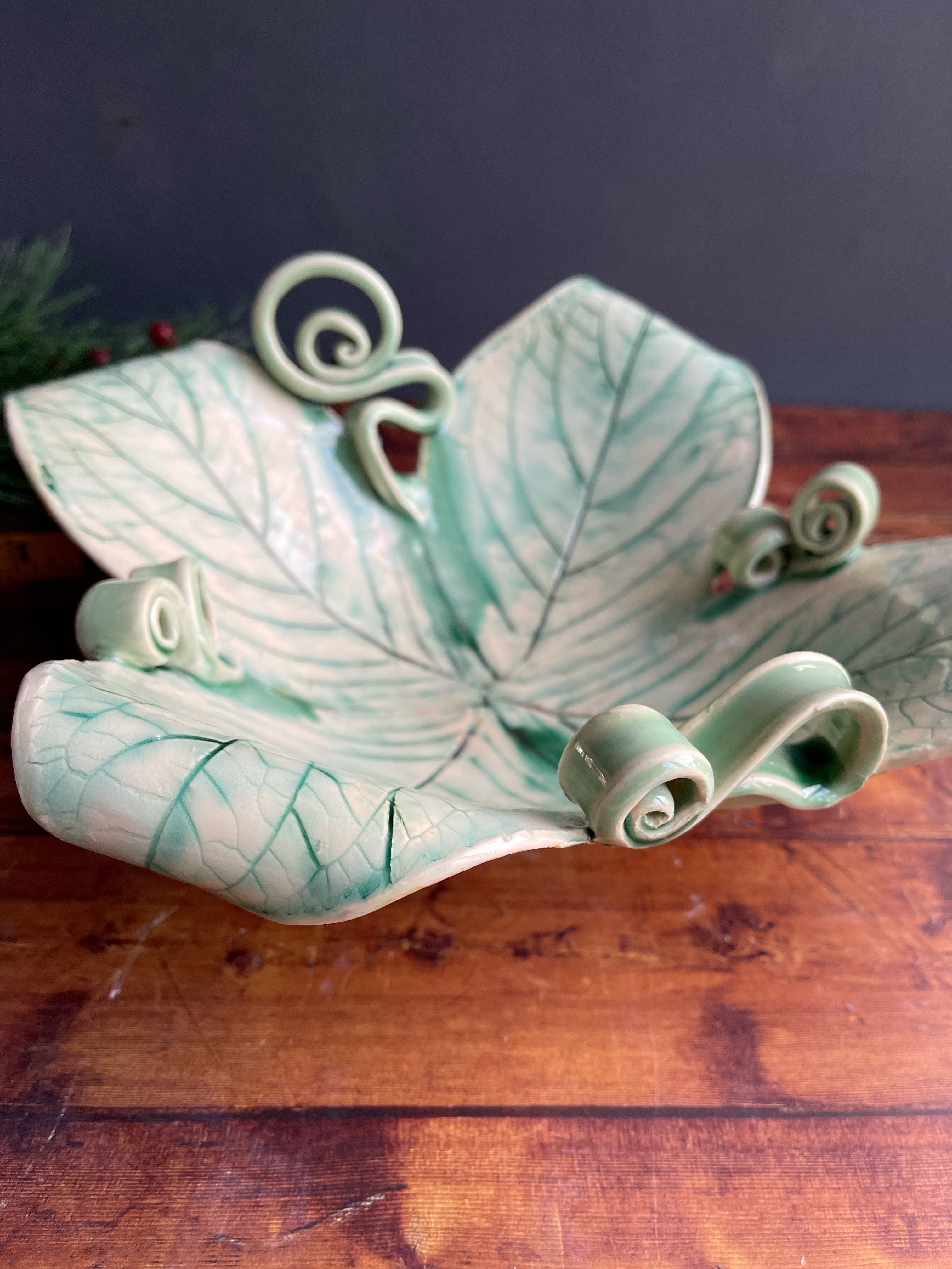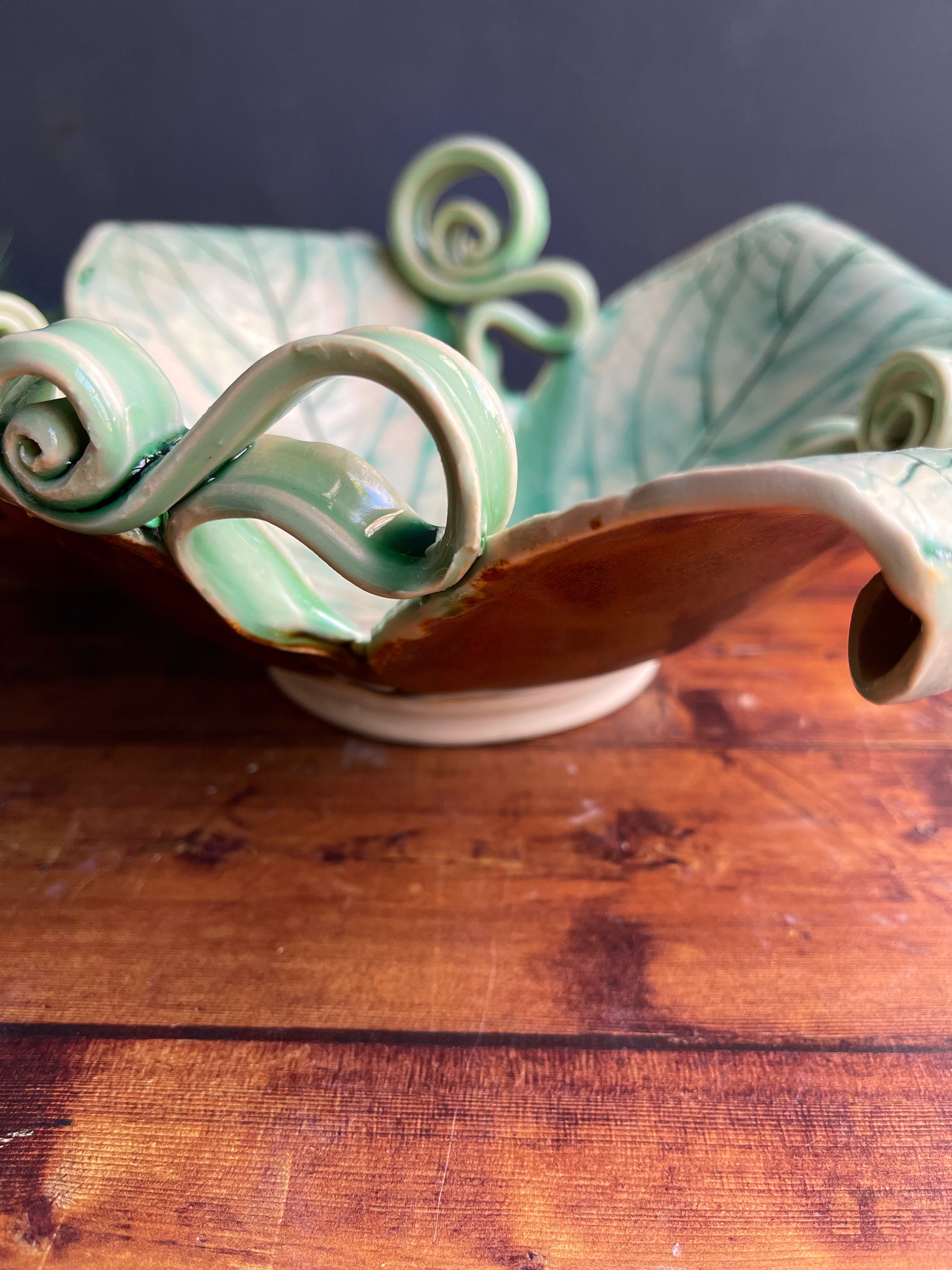 Leaf bowl with curly vines. Made by pressing hosta leaves from my garden into soft clay and sculpting them into a bowl with curly vines. Perfect as a fruit bowl, serving, or even interior design