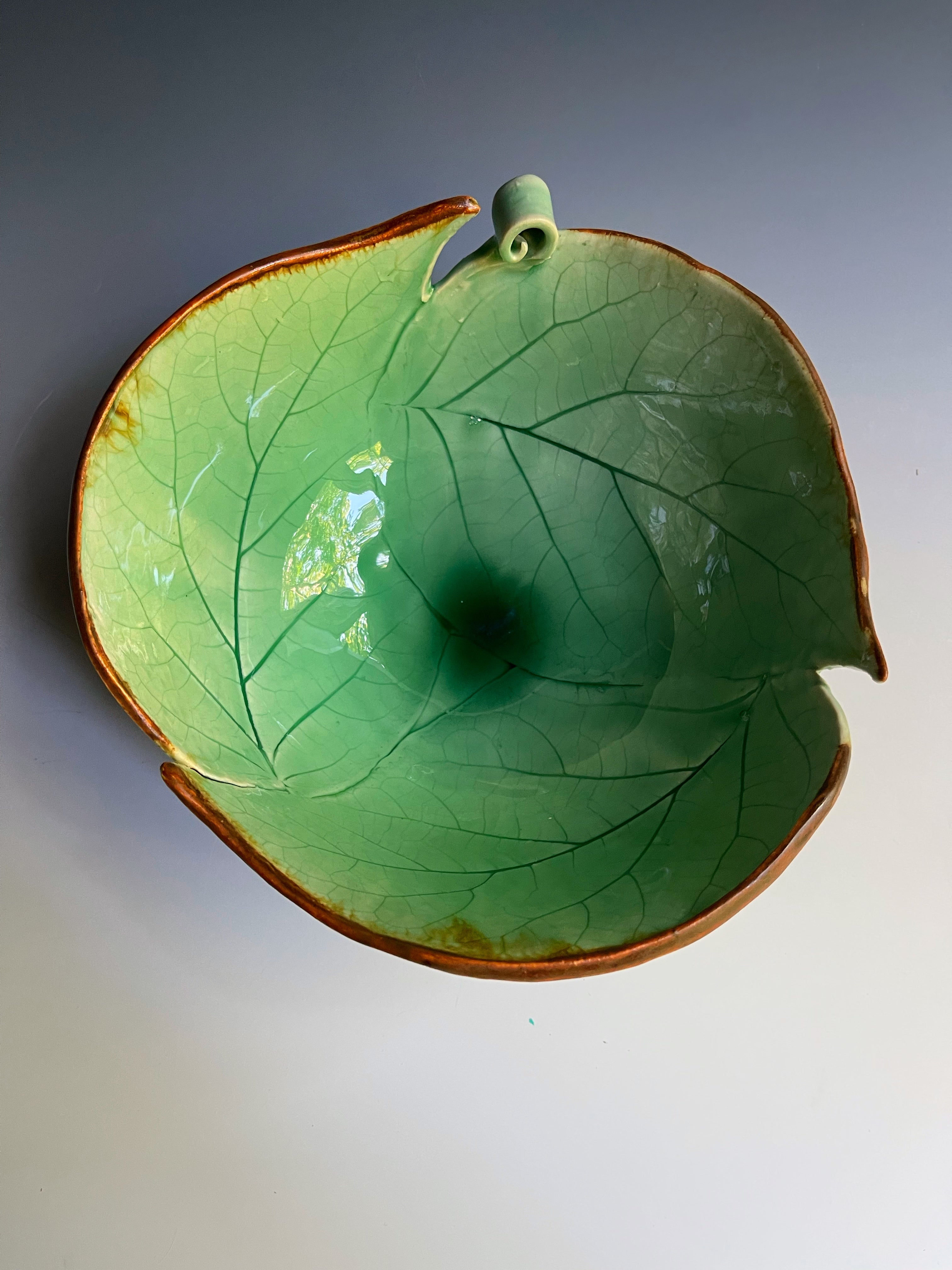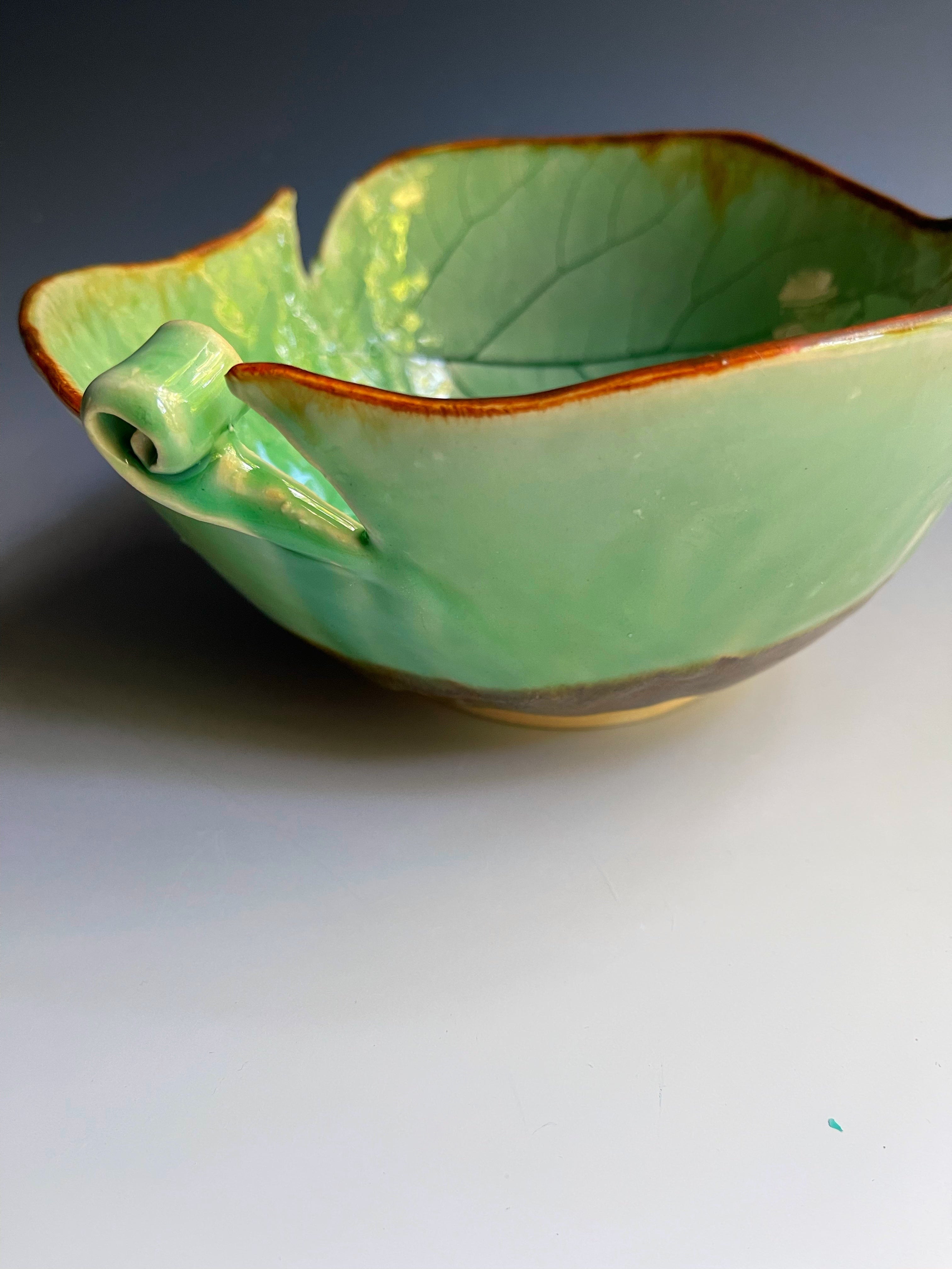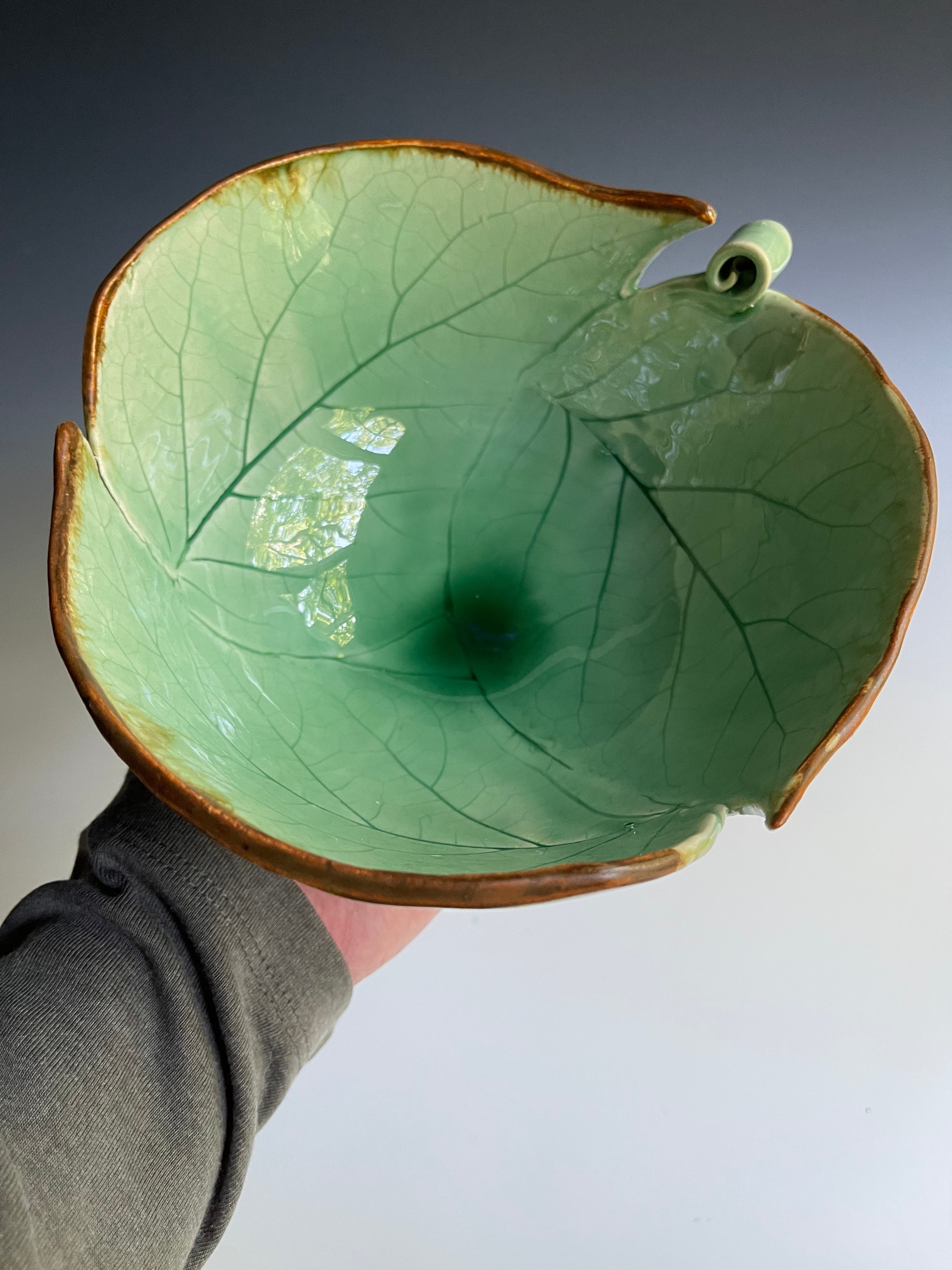 Leaf bowl with a curly vine Perfect for serving pho, large salad, side dish. Beautiful glaze and leaf detail.