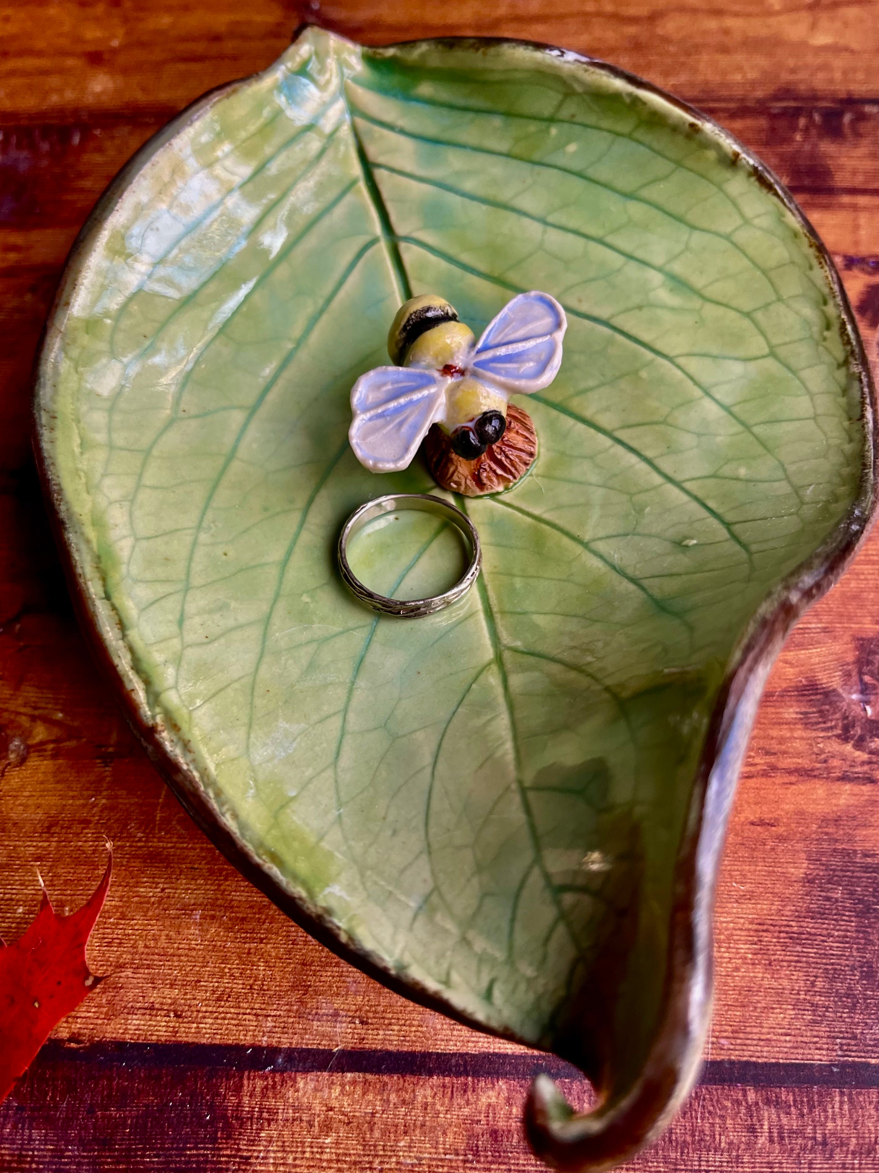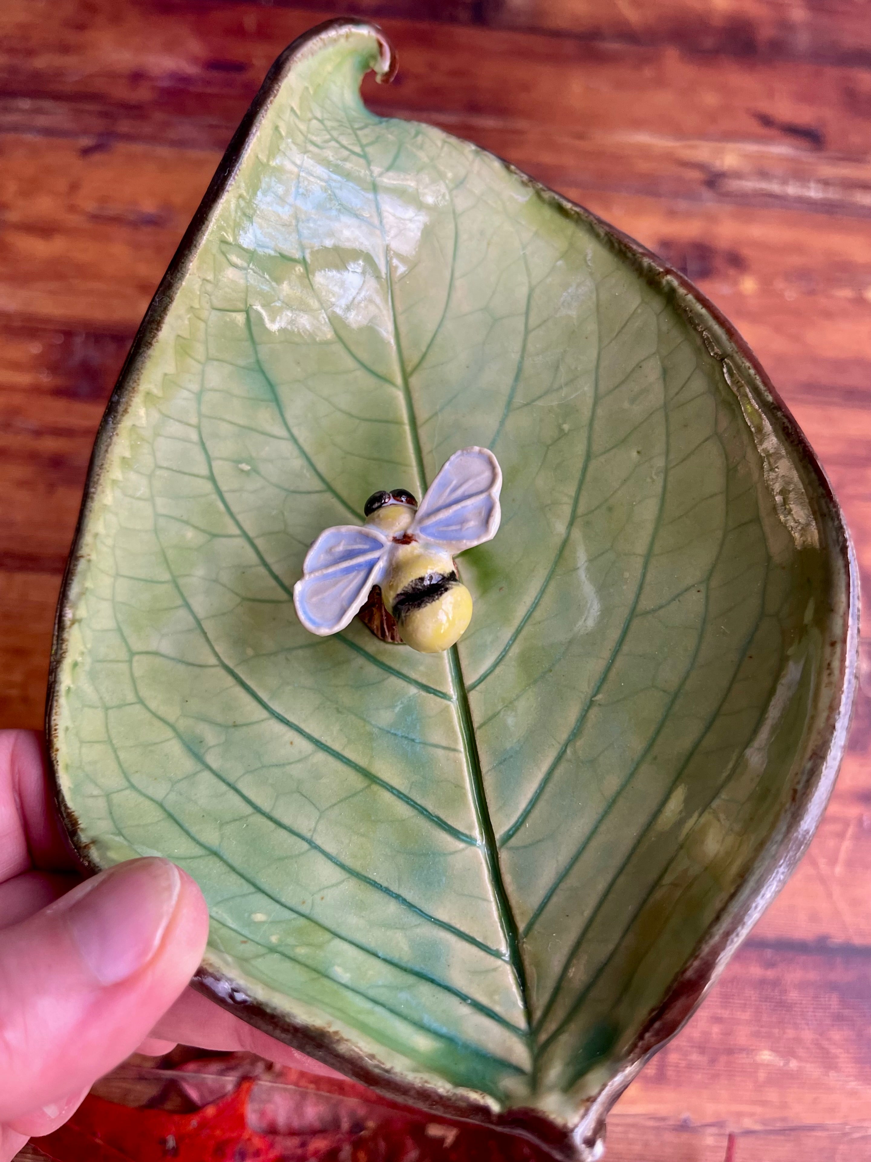 Curly Leaf plate with a honeybee. Perfect for candles, trinkets, spoon rest