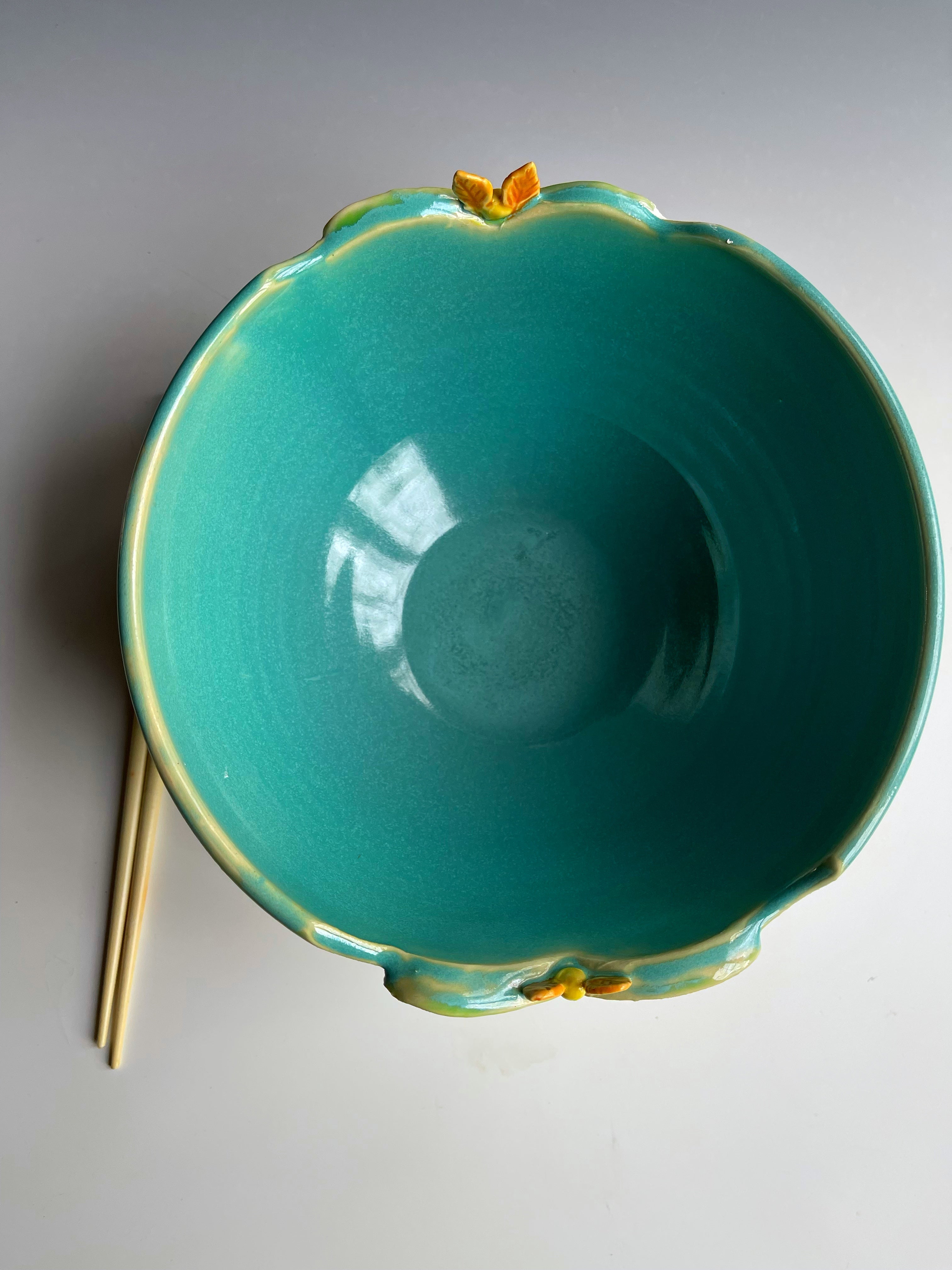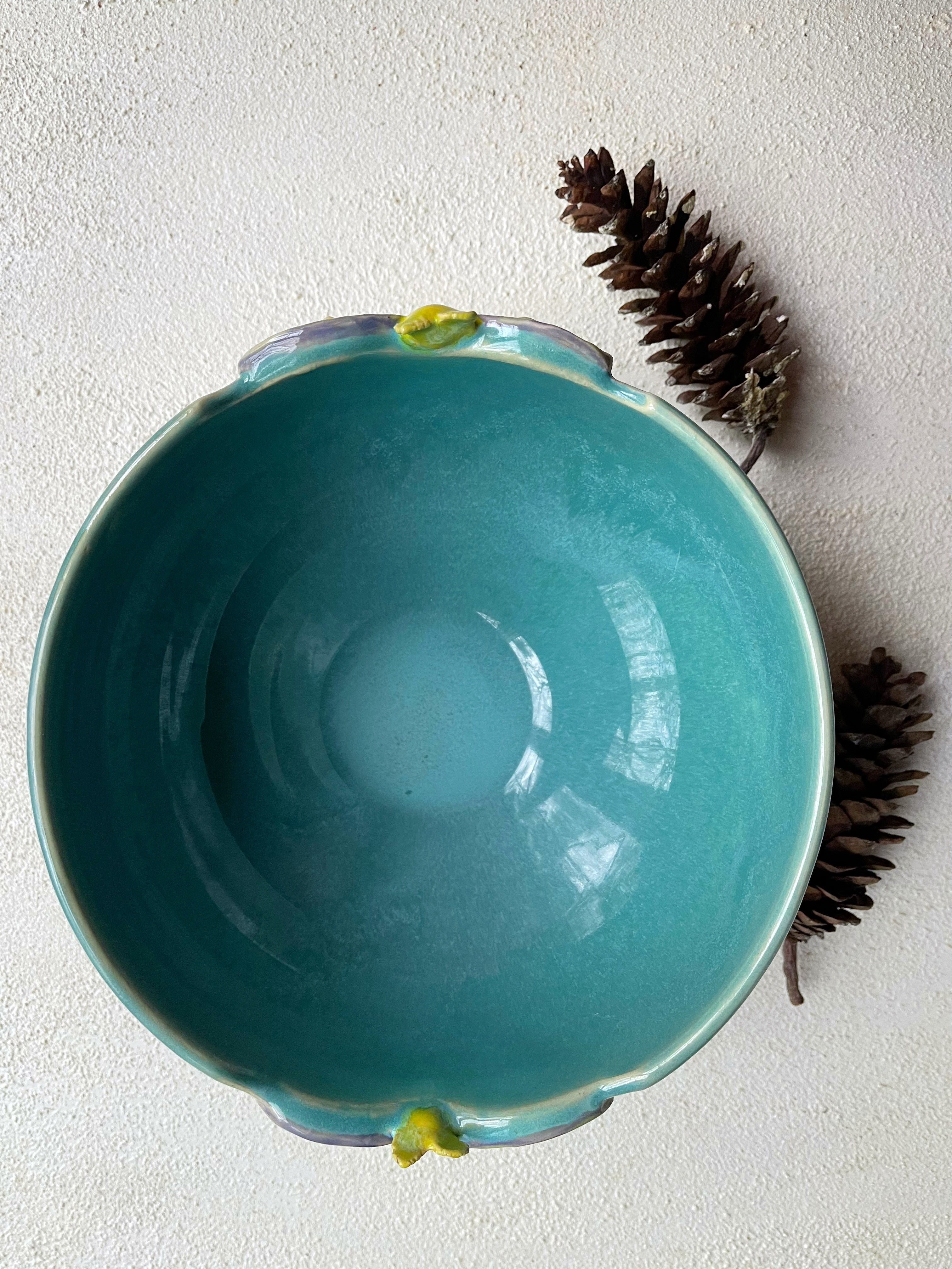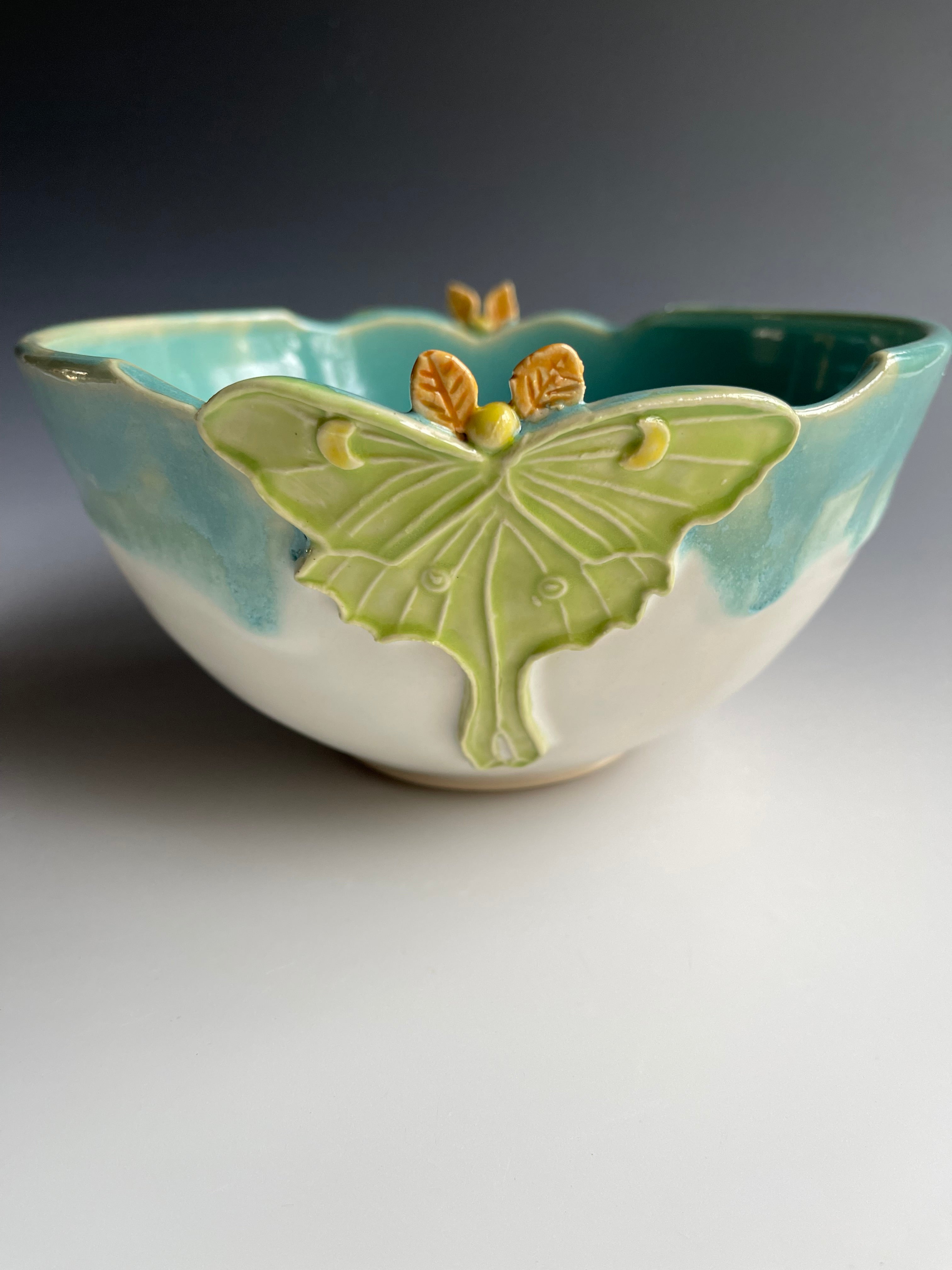 A carved bowl thrown on a wheel with 2 luna moth sculptures on opposing sides. Very elaborate sculpting and glaze work. This makes a charming serving bowl or centerpiece