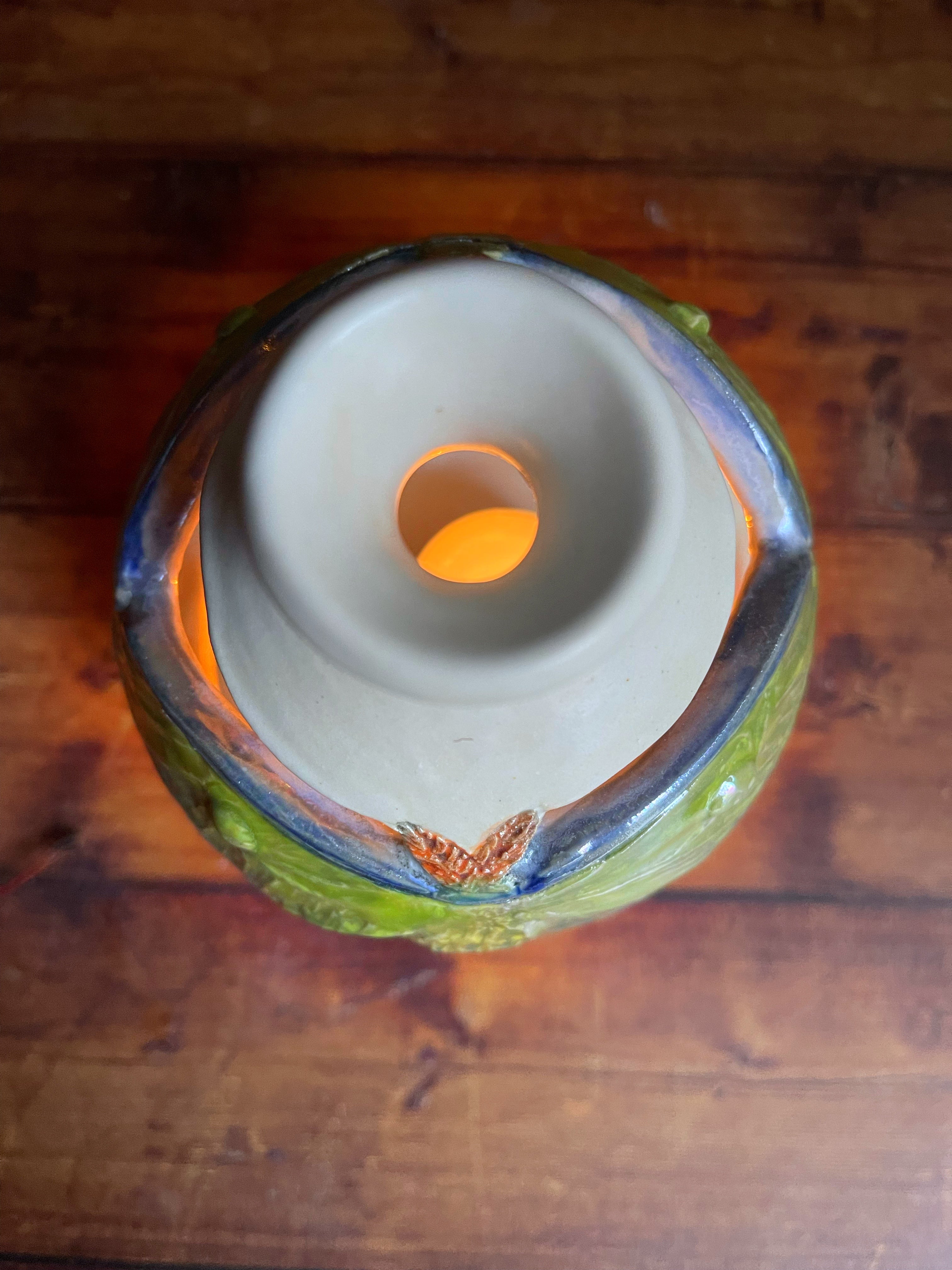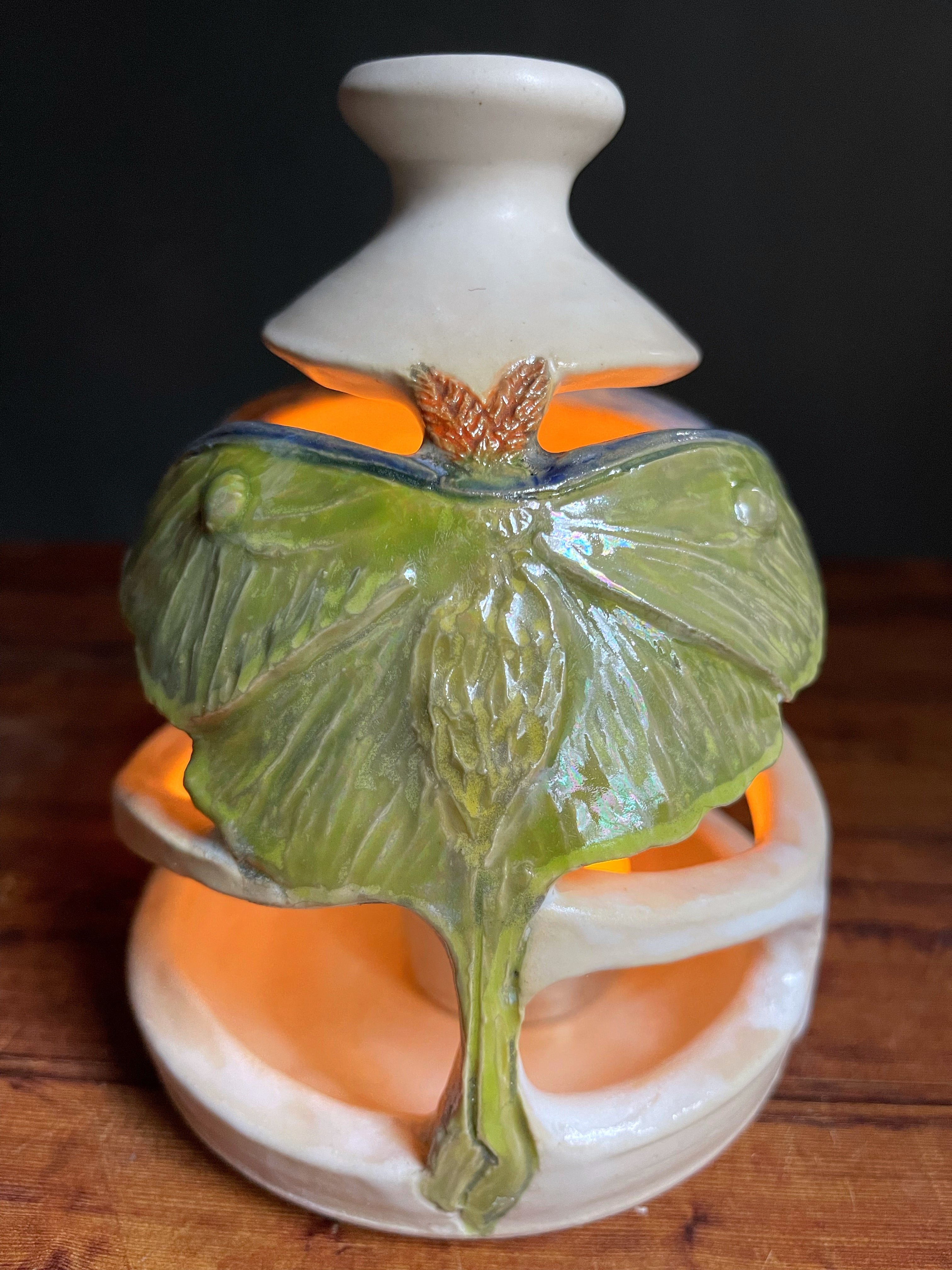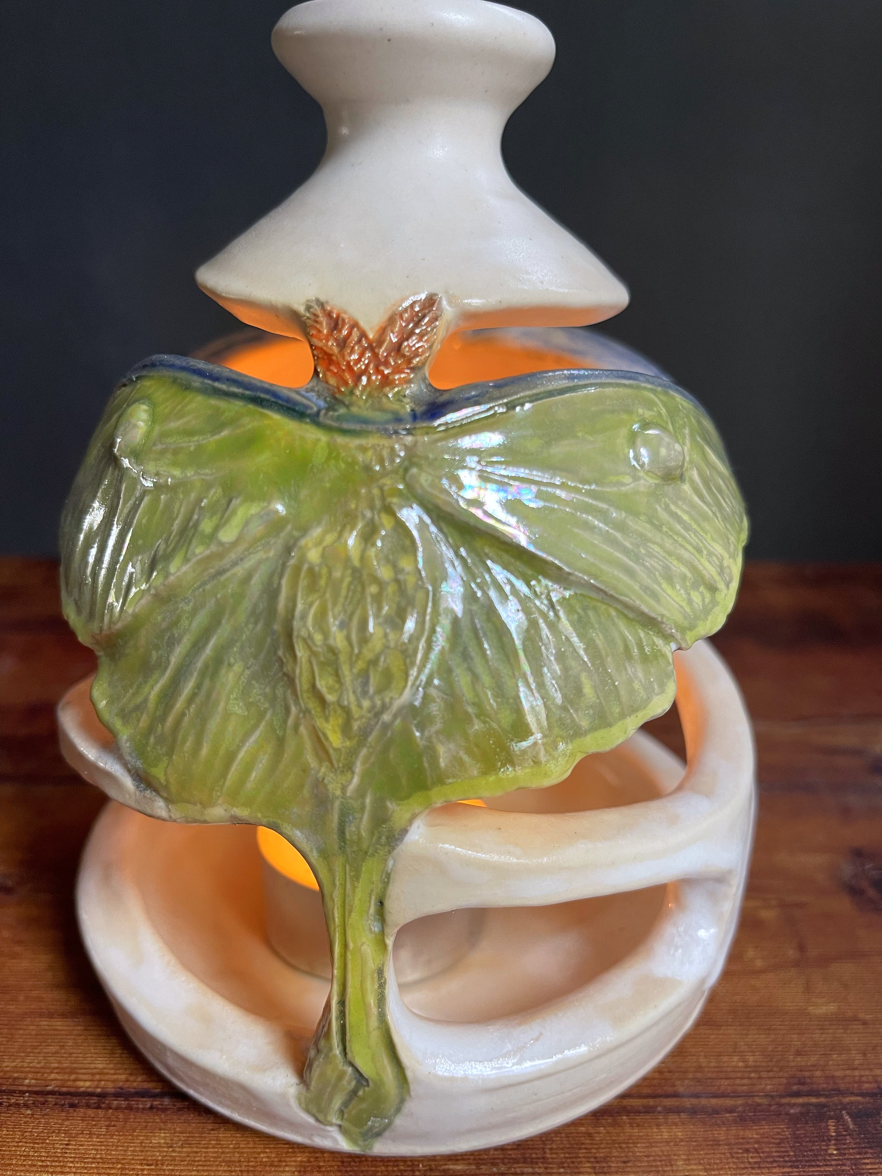 This lantern is in prototype and won’t be repeated exactly as is. If you like the price, snap it up now! She has 2 Luna moths in an intricately carved swirling pattern. Many hours went into this piece.