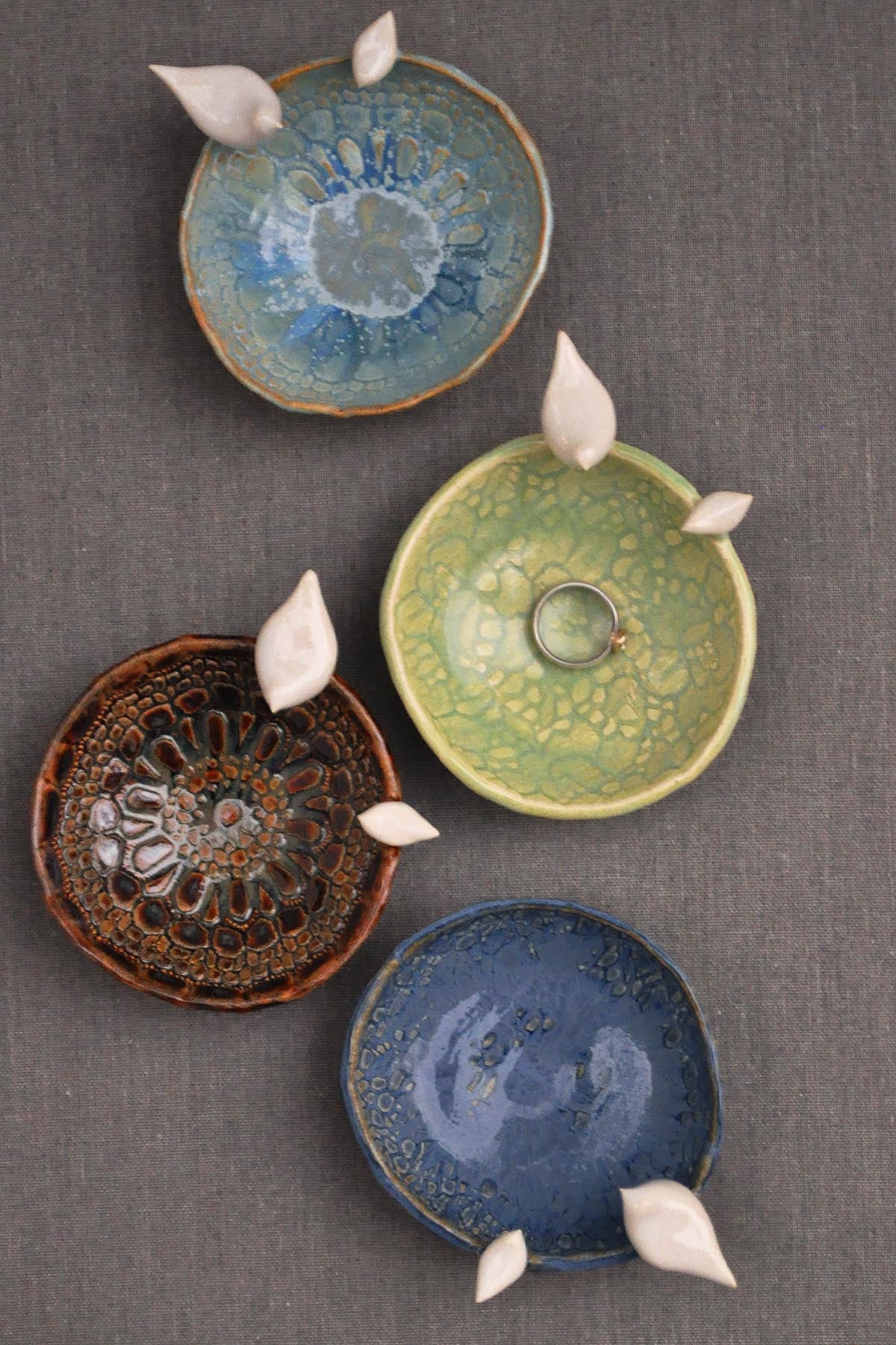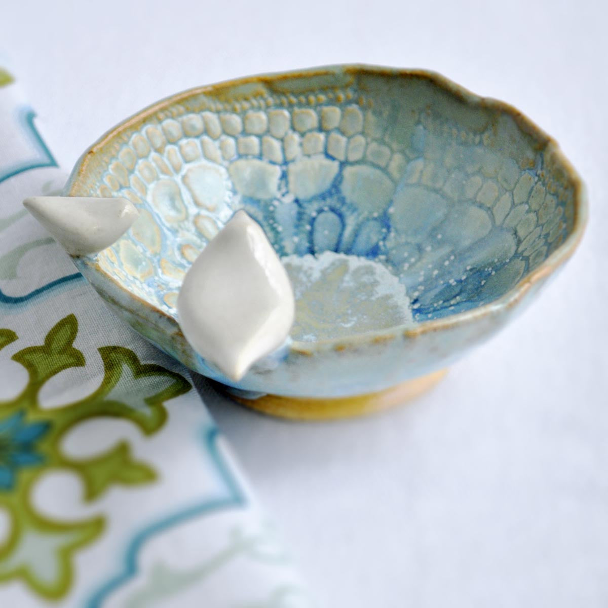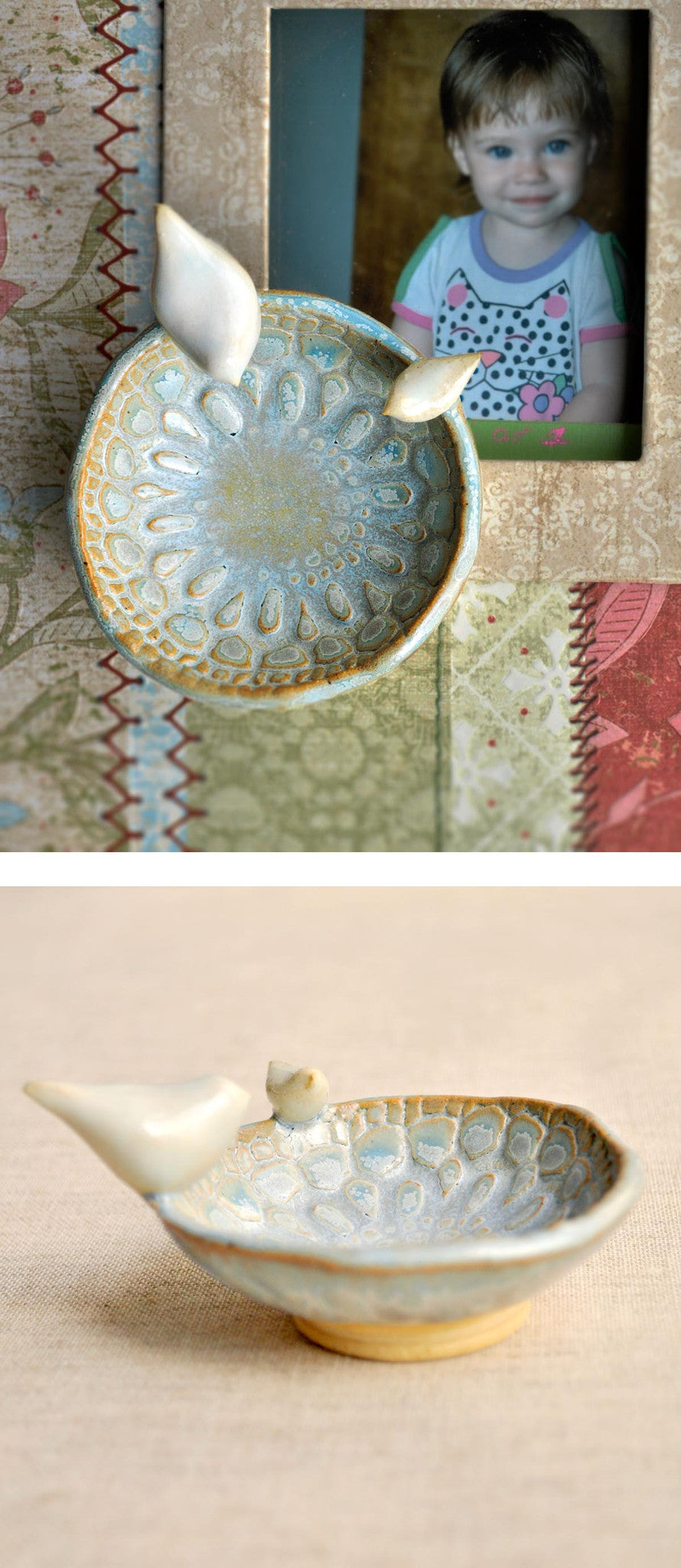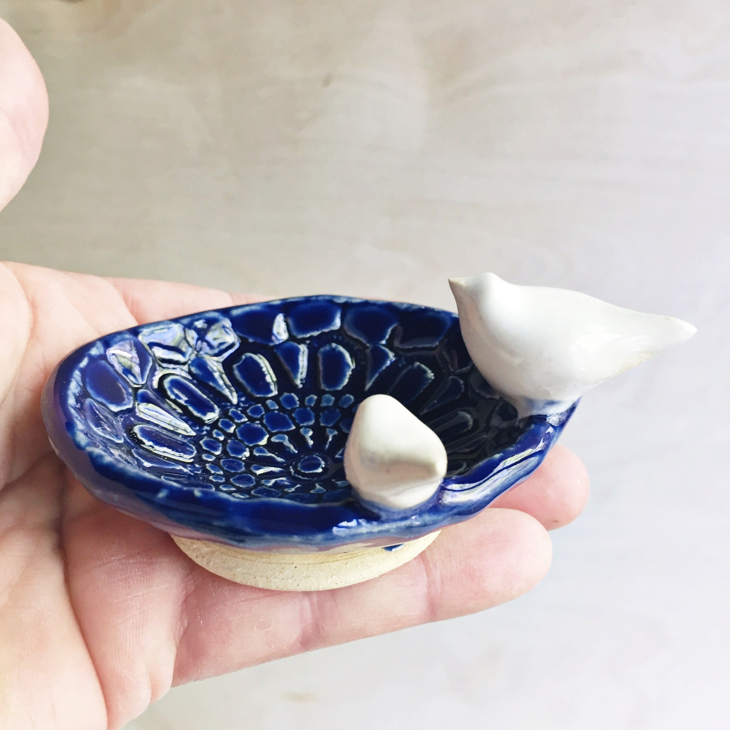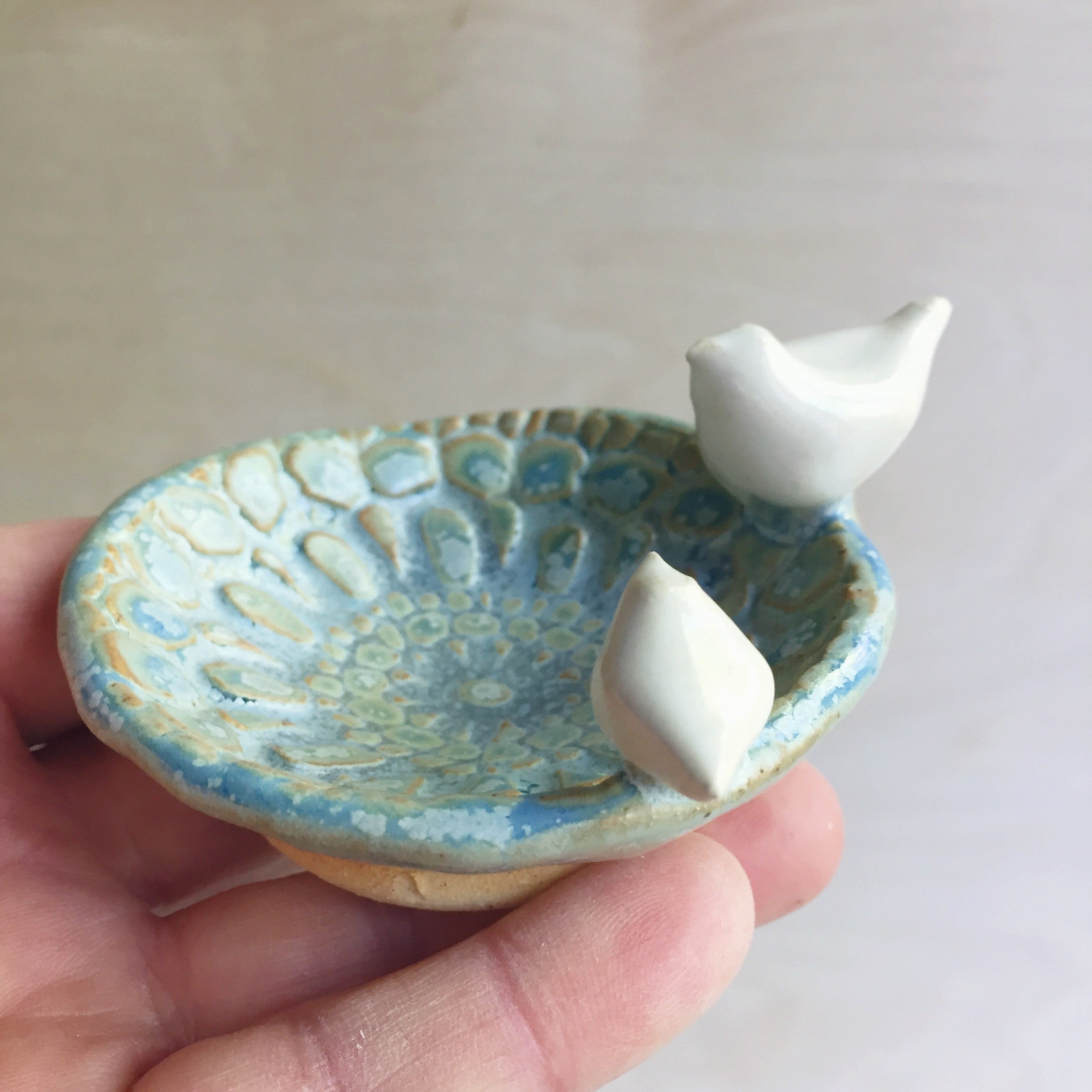 3" D; 4" long including the birds, and 2 1/2" H. The edge of the bowl is intentionally rustic.
