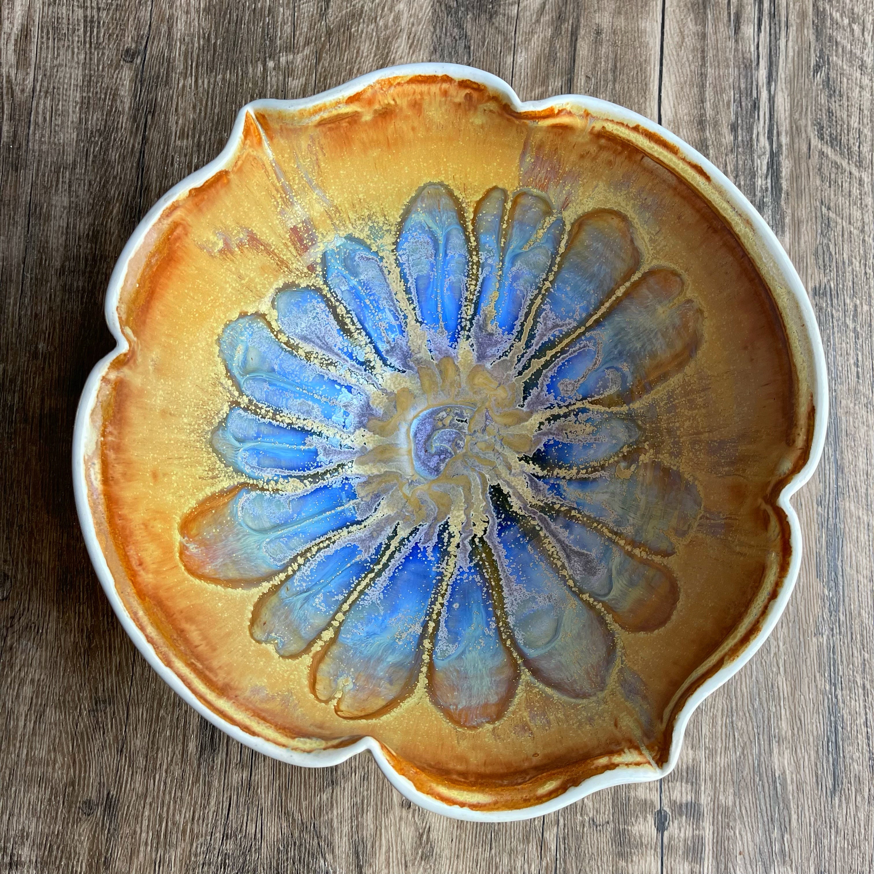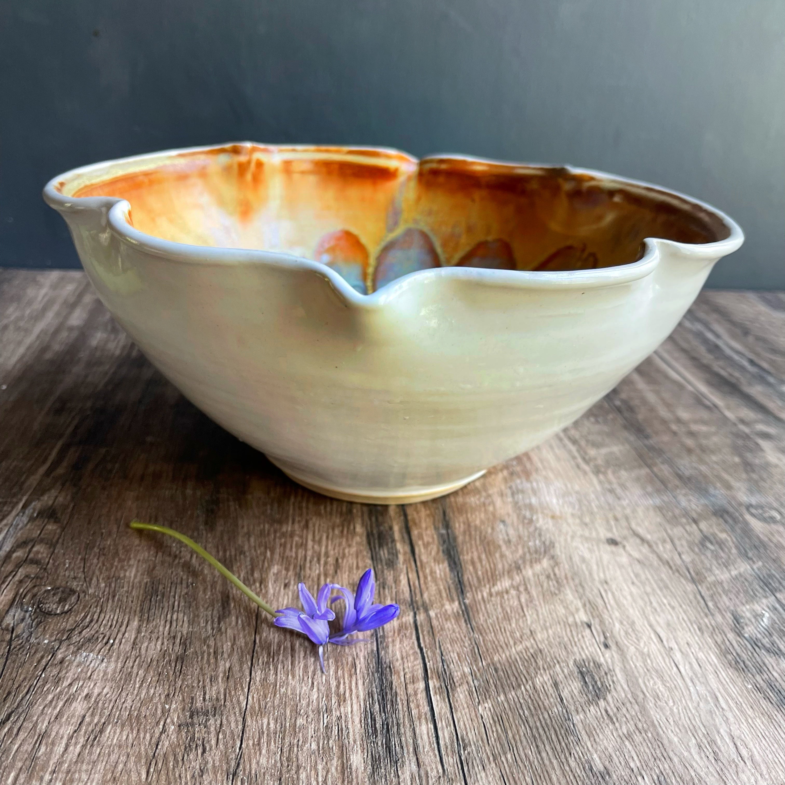 This large modern ceramic bowl was wheel thrown and altered into a quatrefoil (Arabesque) shape.