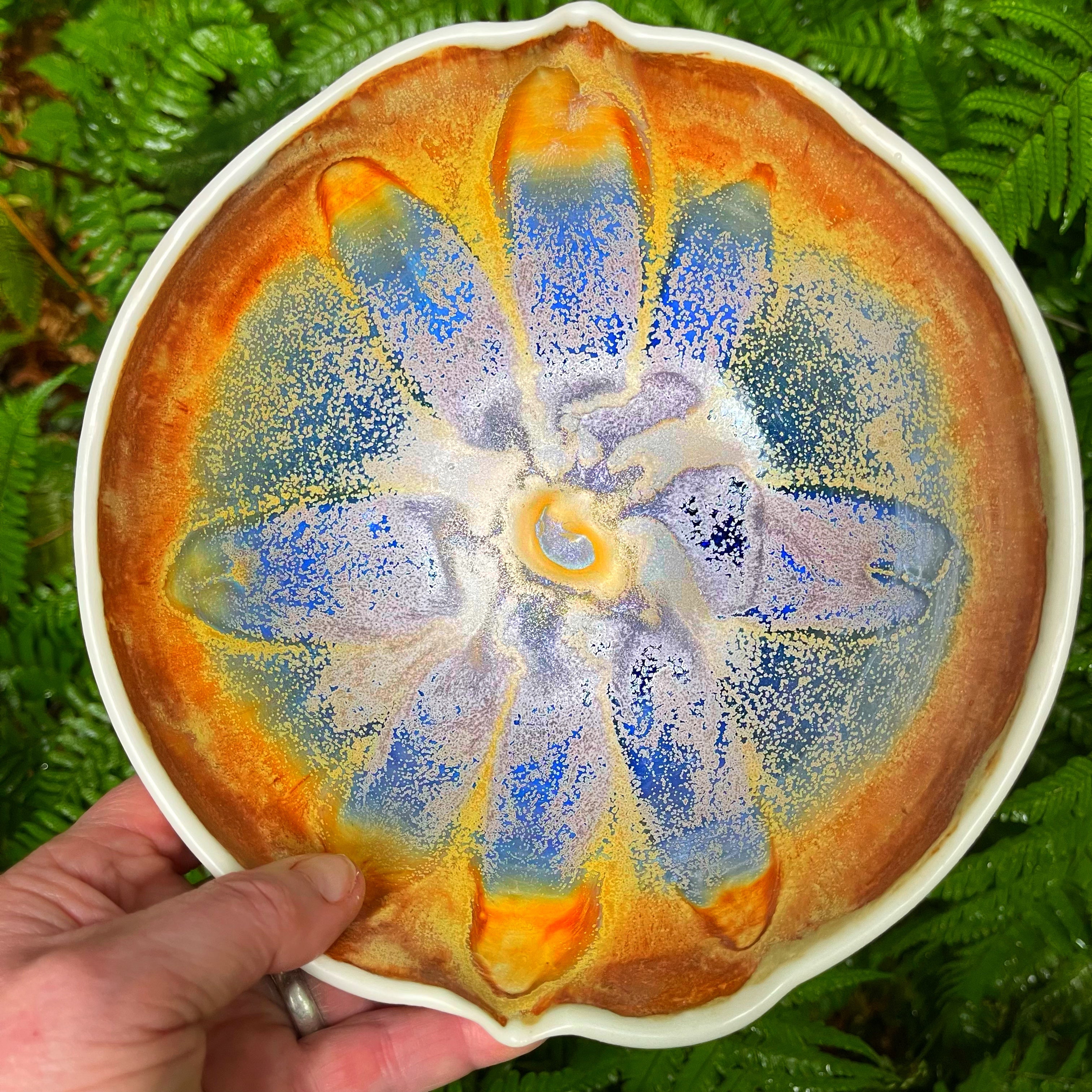 This modern ceramic bowl was wheel thrown and altered into a flower shape.