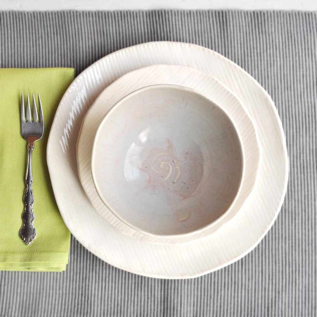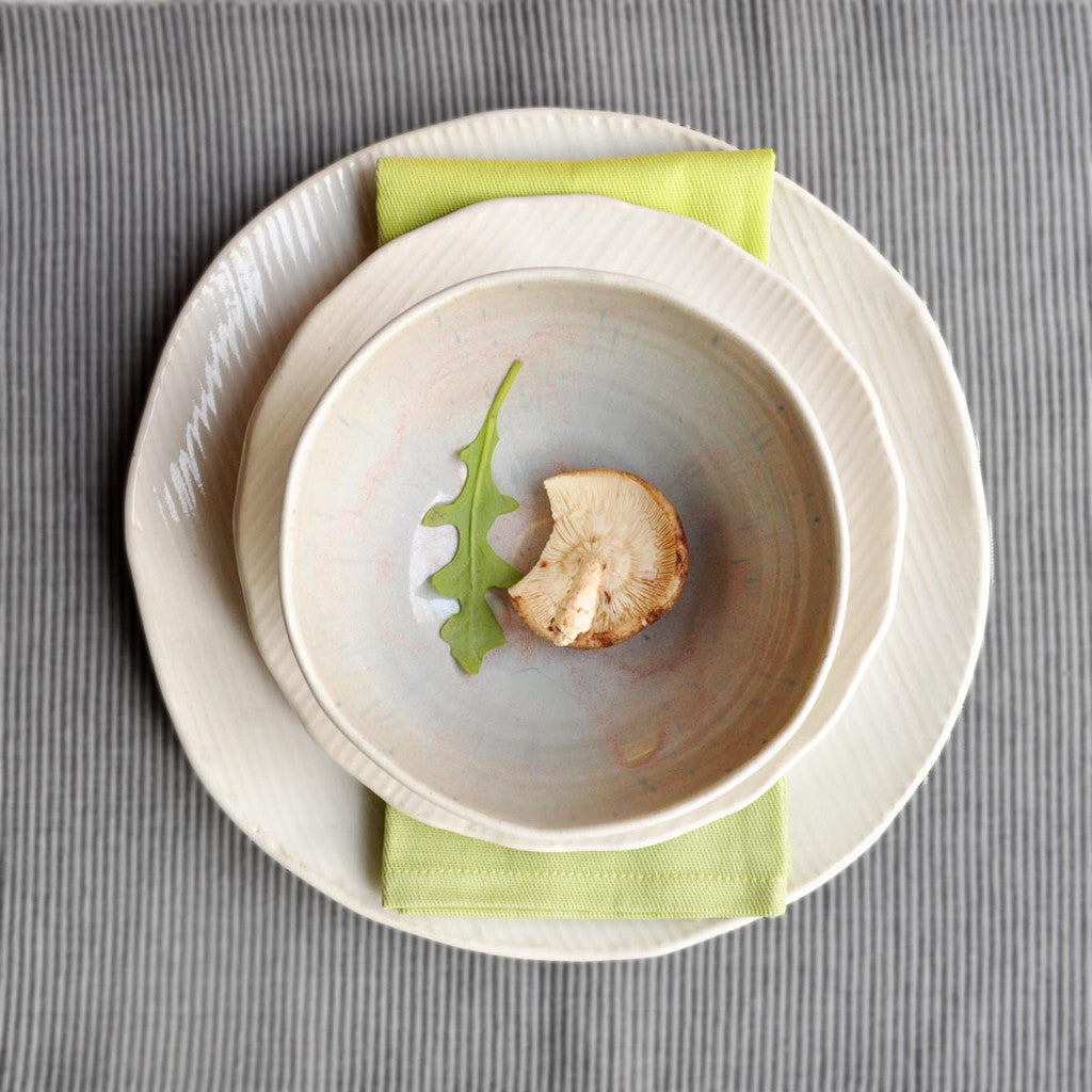 Minimalist with Gray has organic shapes in soft Satin White, with Cloud Gray glaze on the interior of the bowl. If the early morning mist or clouds before a dramatic storm fill you with pleasure, this is your dinnerware. The 2 plates have a striped texture. It is quite interesting to angle them in different ways. The bowl is thrown and altered. All bottoms have a thrown foot rim, making them stable and lightweight.