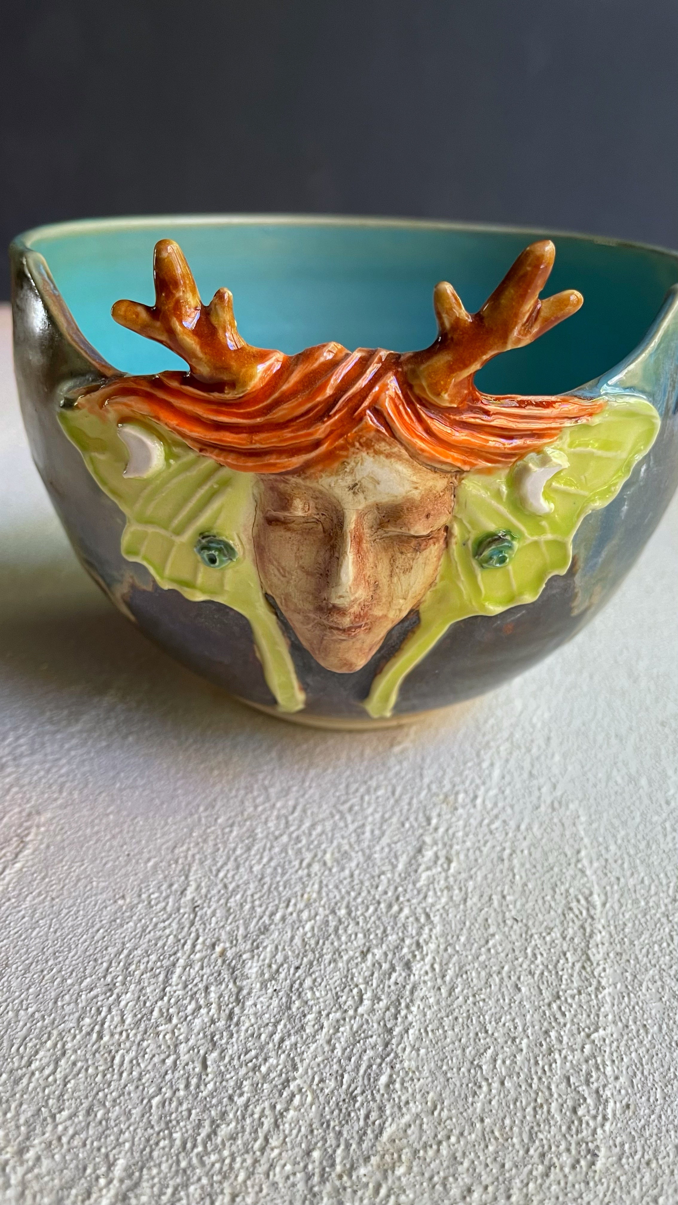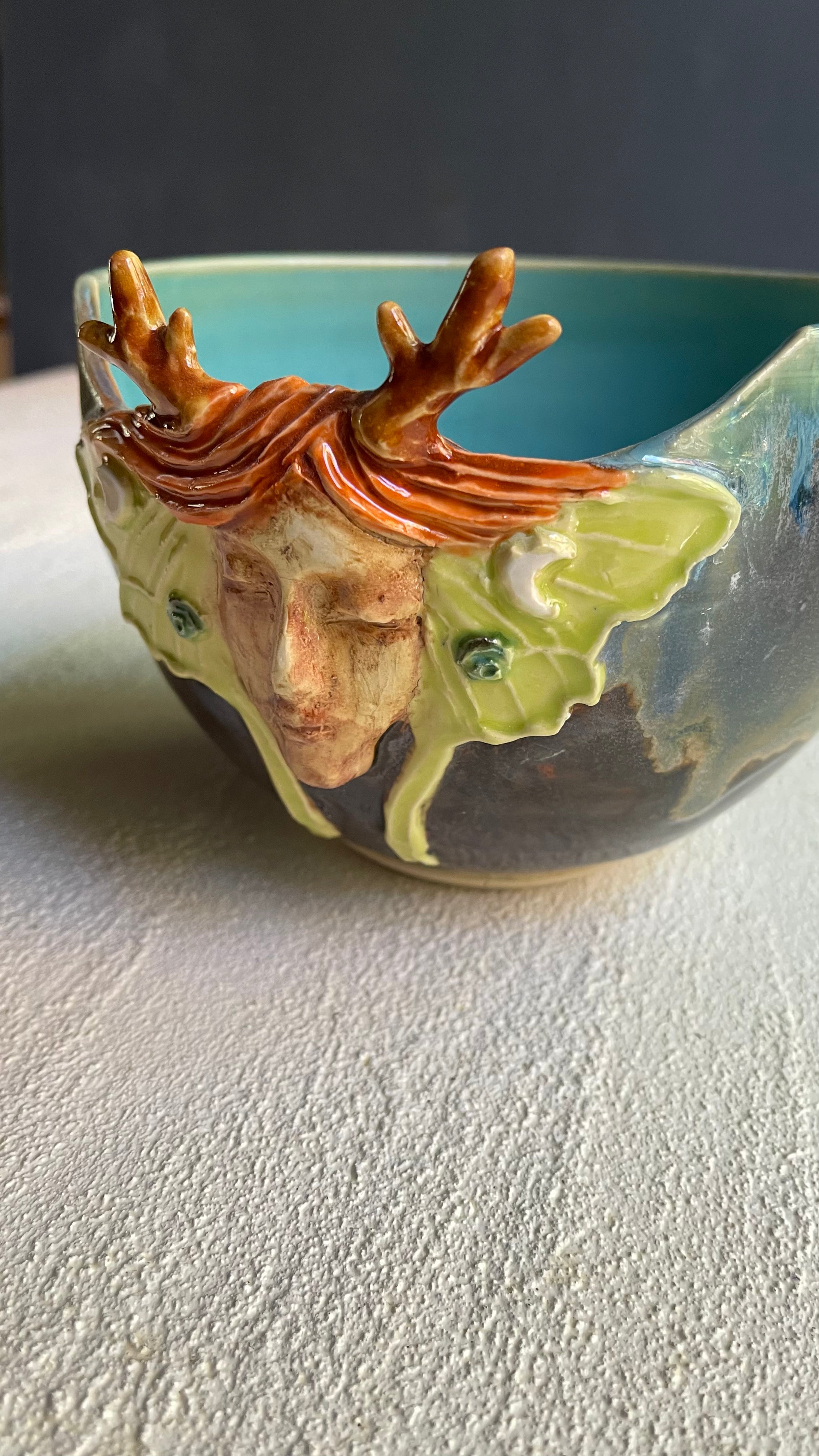A hand sculpted Luna moth on each side of a bowl with the rim carved, reminiscent of Art nouveau.