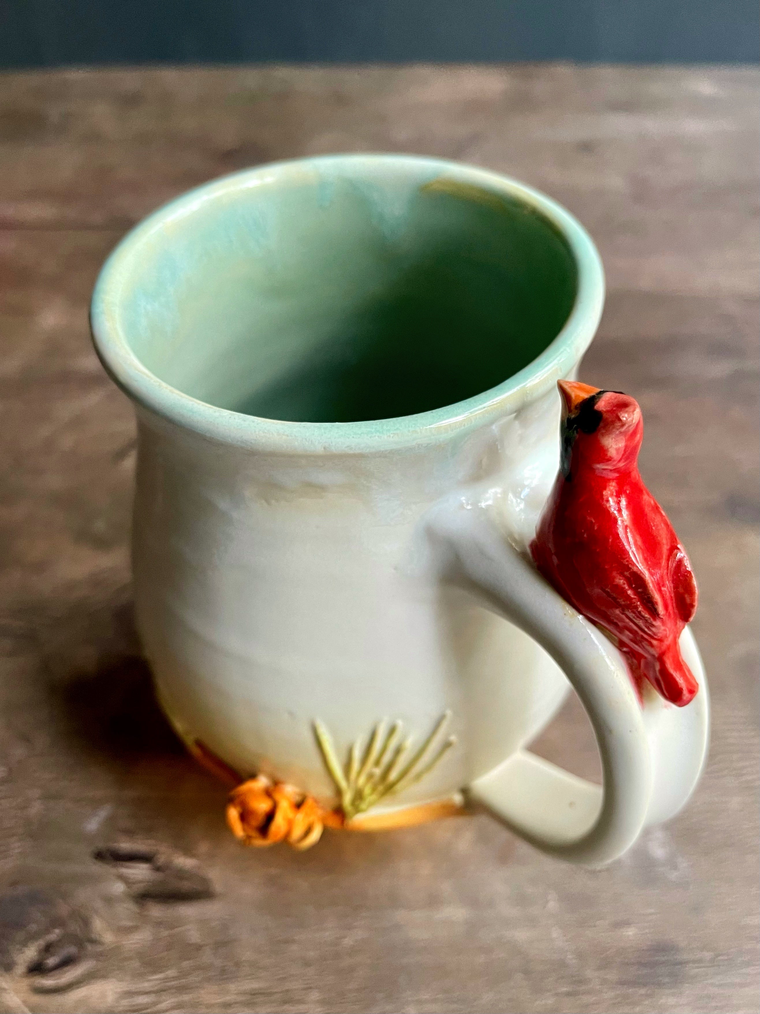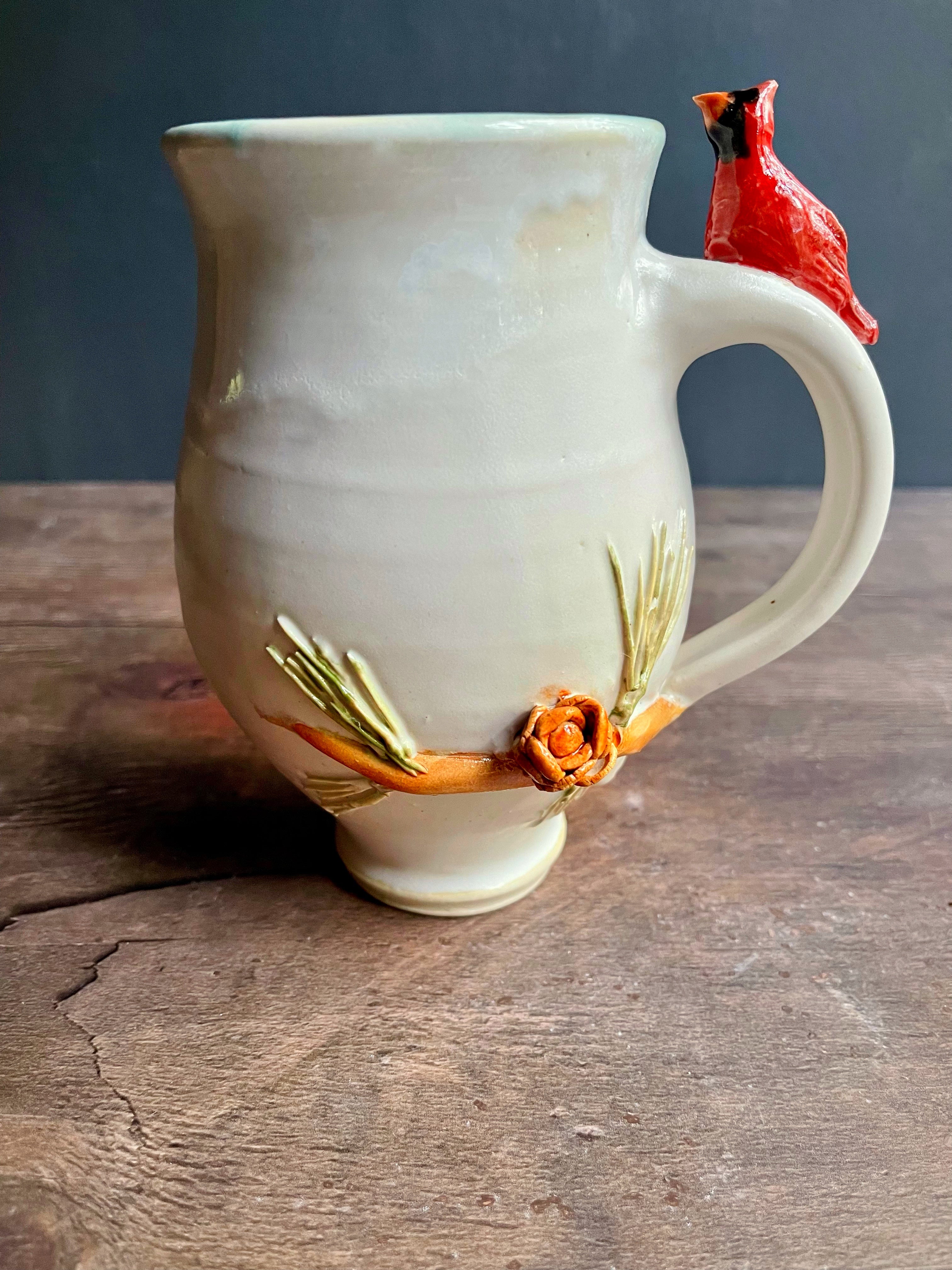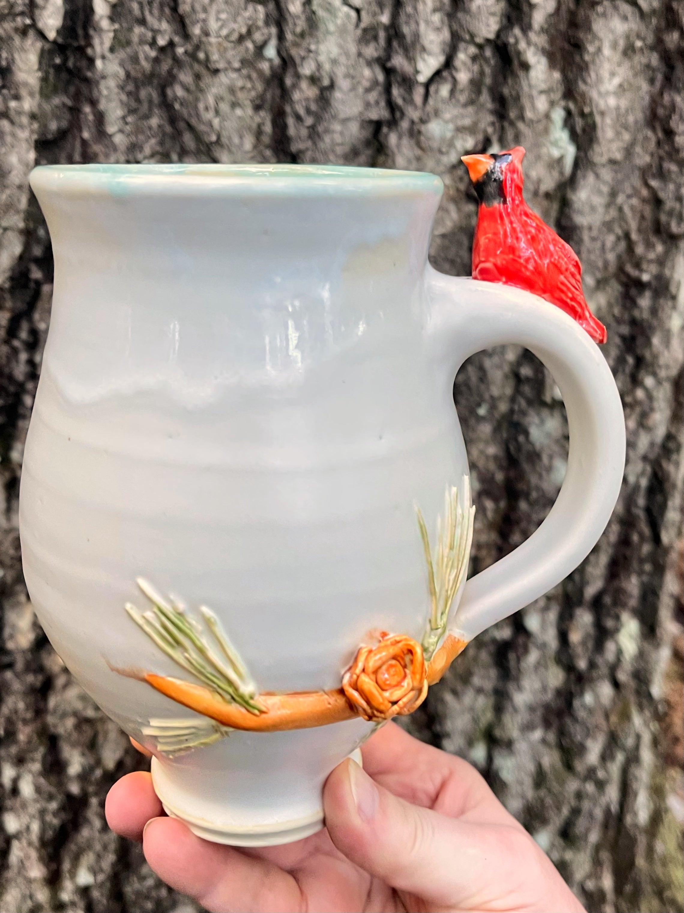 mug glazed in multicolor glazes. Cardinal and pine branch entirely hand sculpted and pleasingly well balanced- a pure delight to hold in your hand.