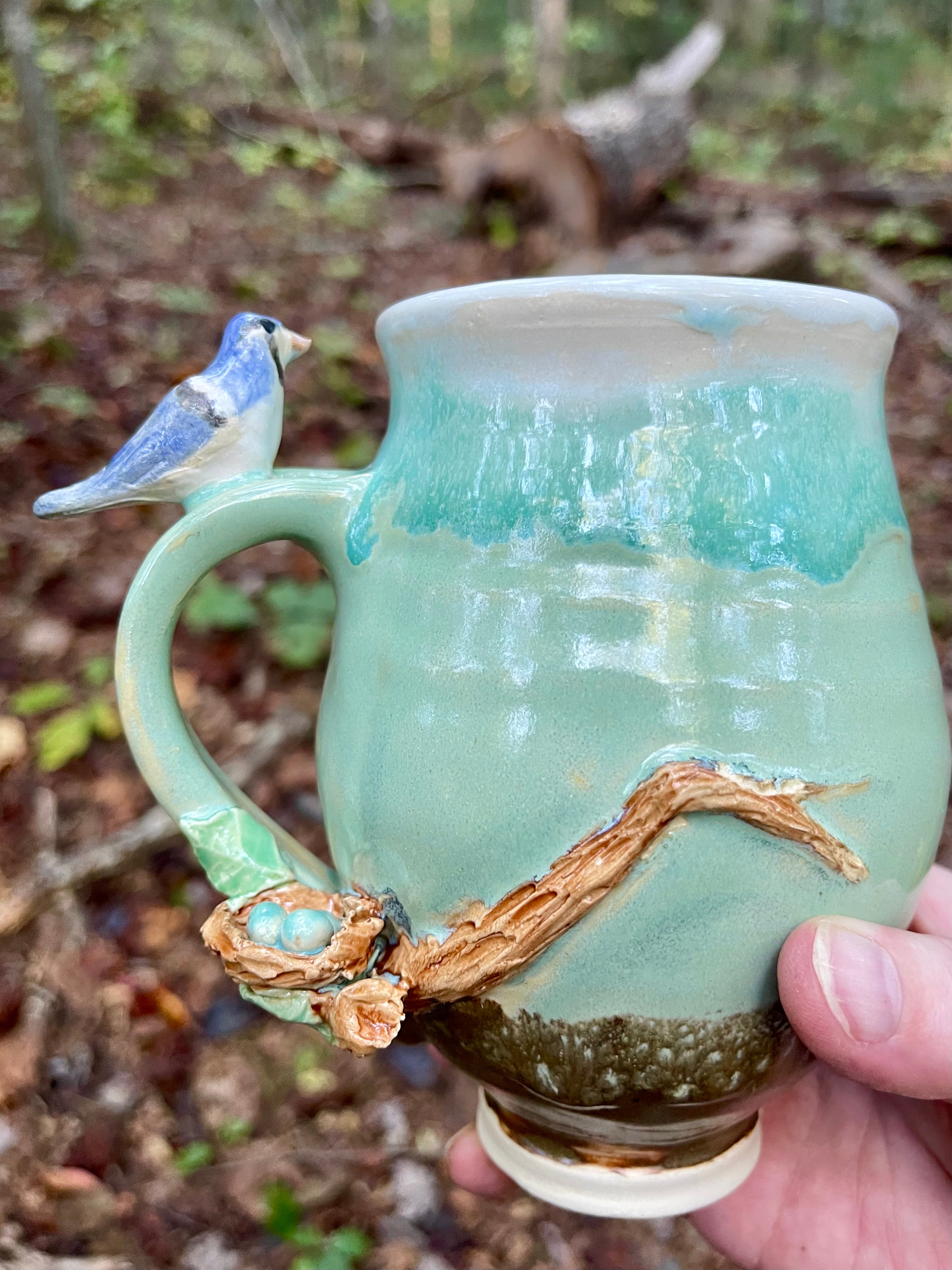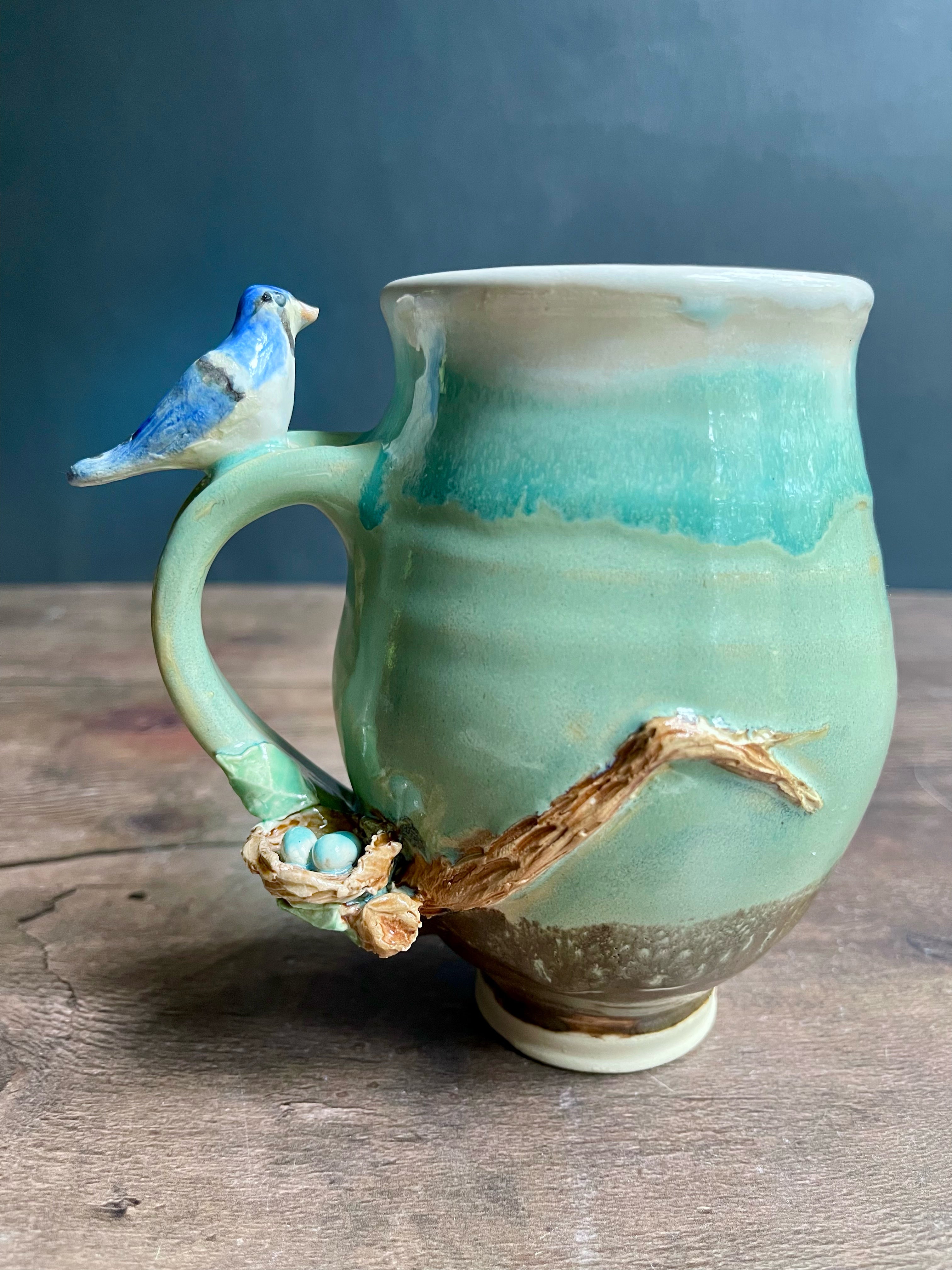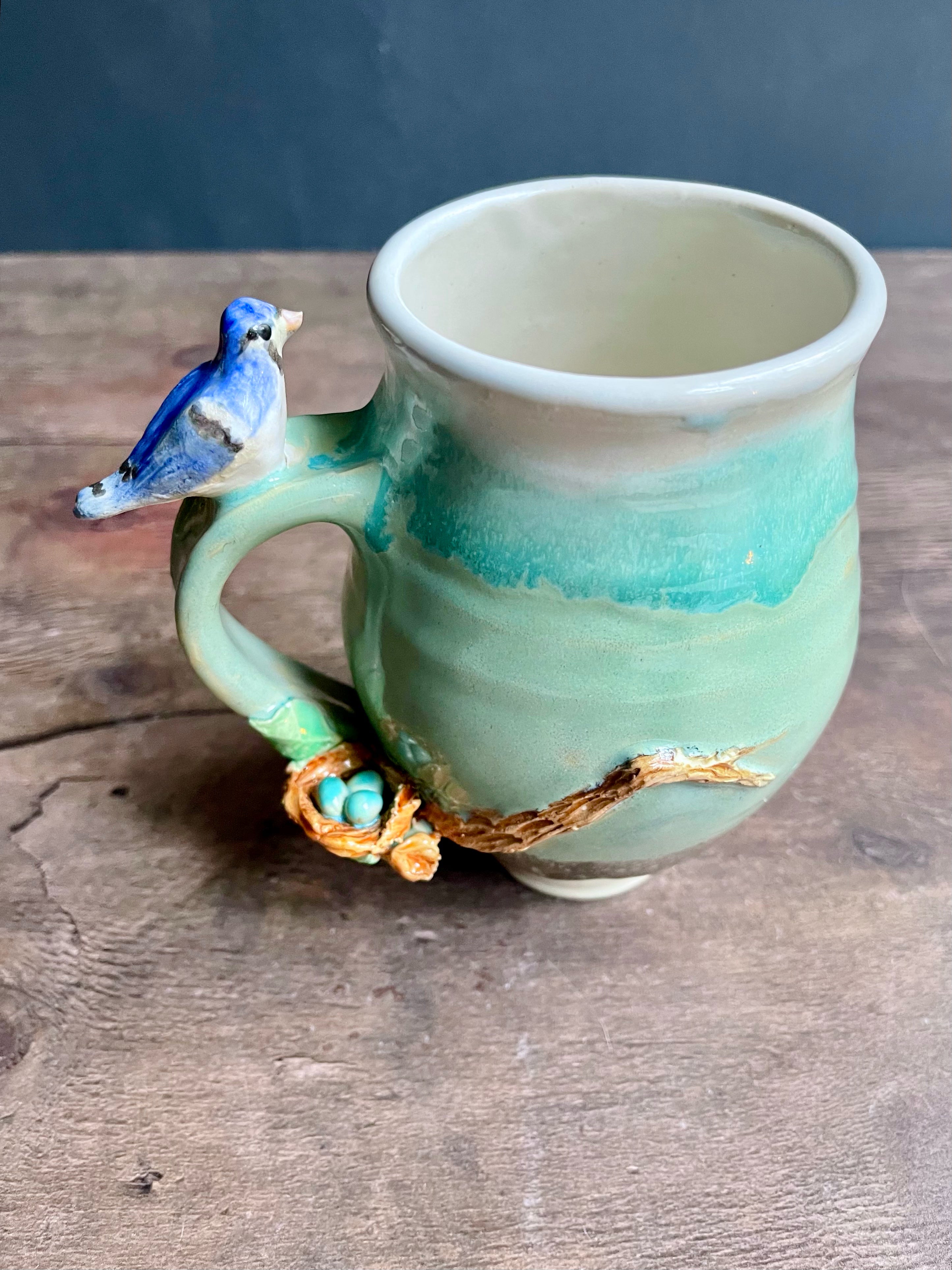 Mug glazed in multicolor glazes. Blue Jay and nest entirely hand sculpted and pleasingly well balanced- a pure delight to hold in your hand.
