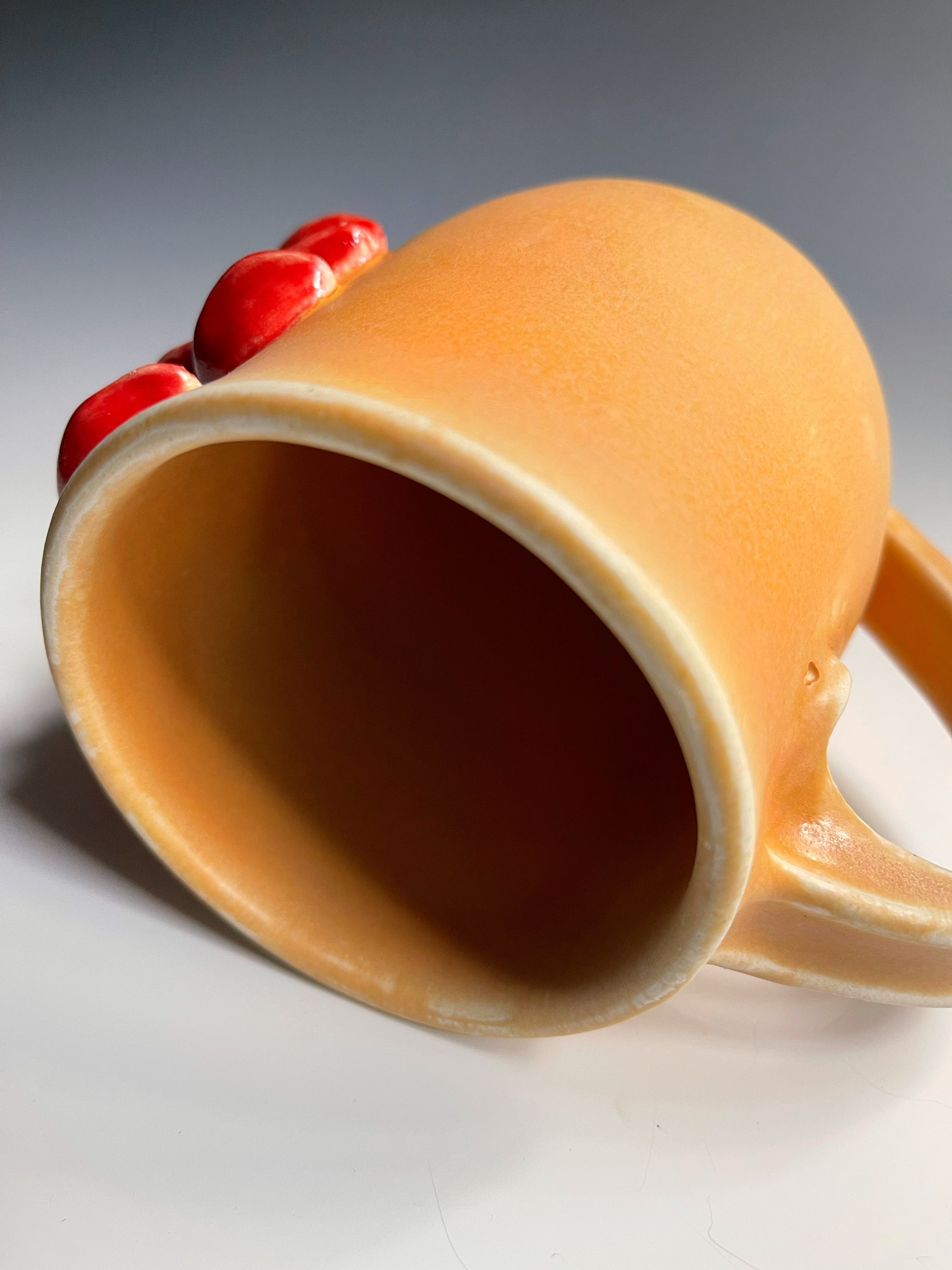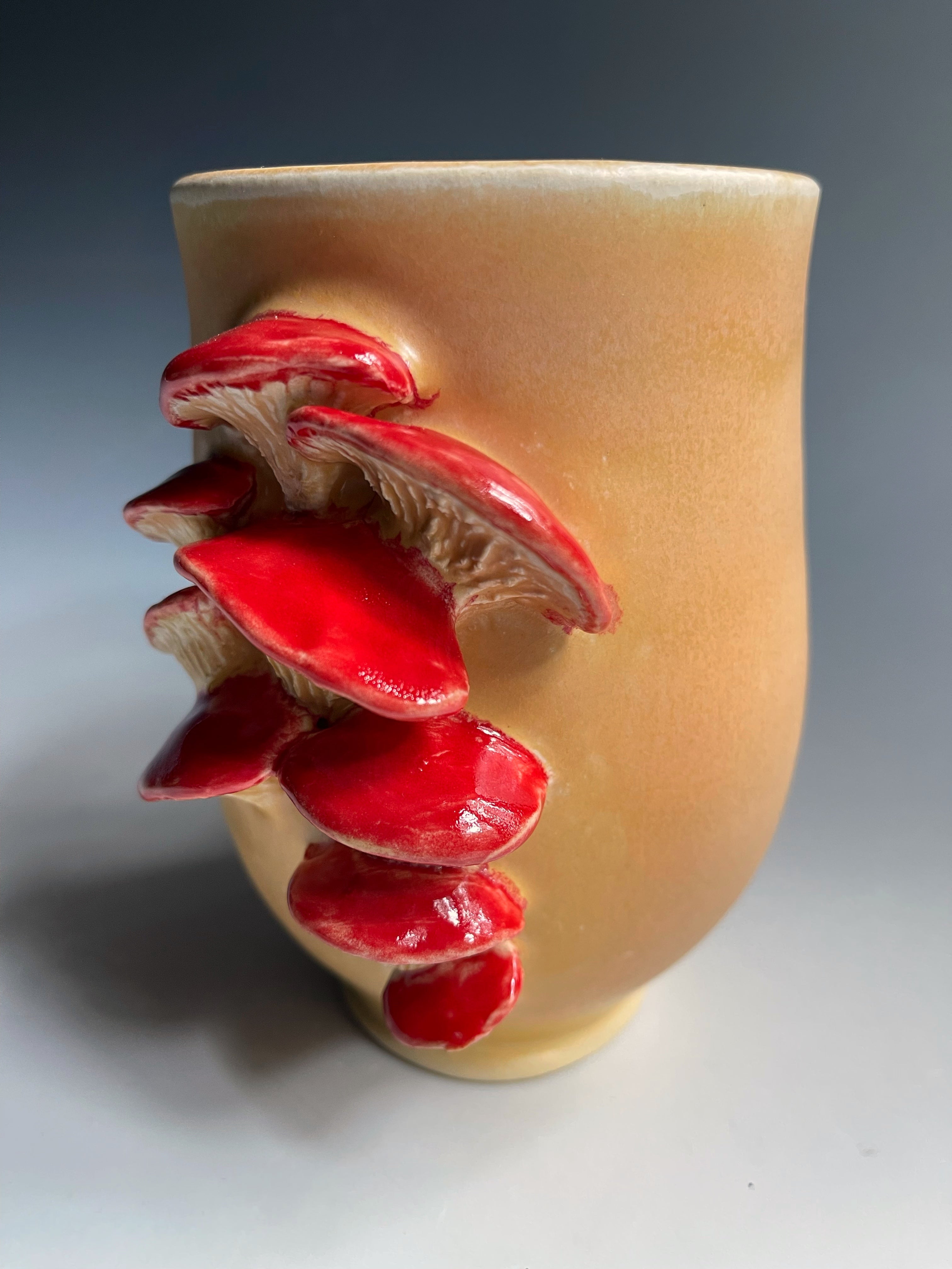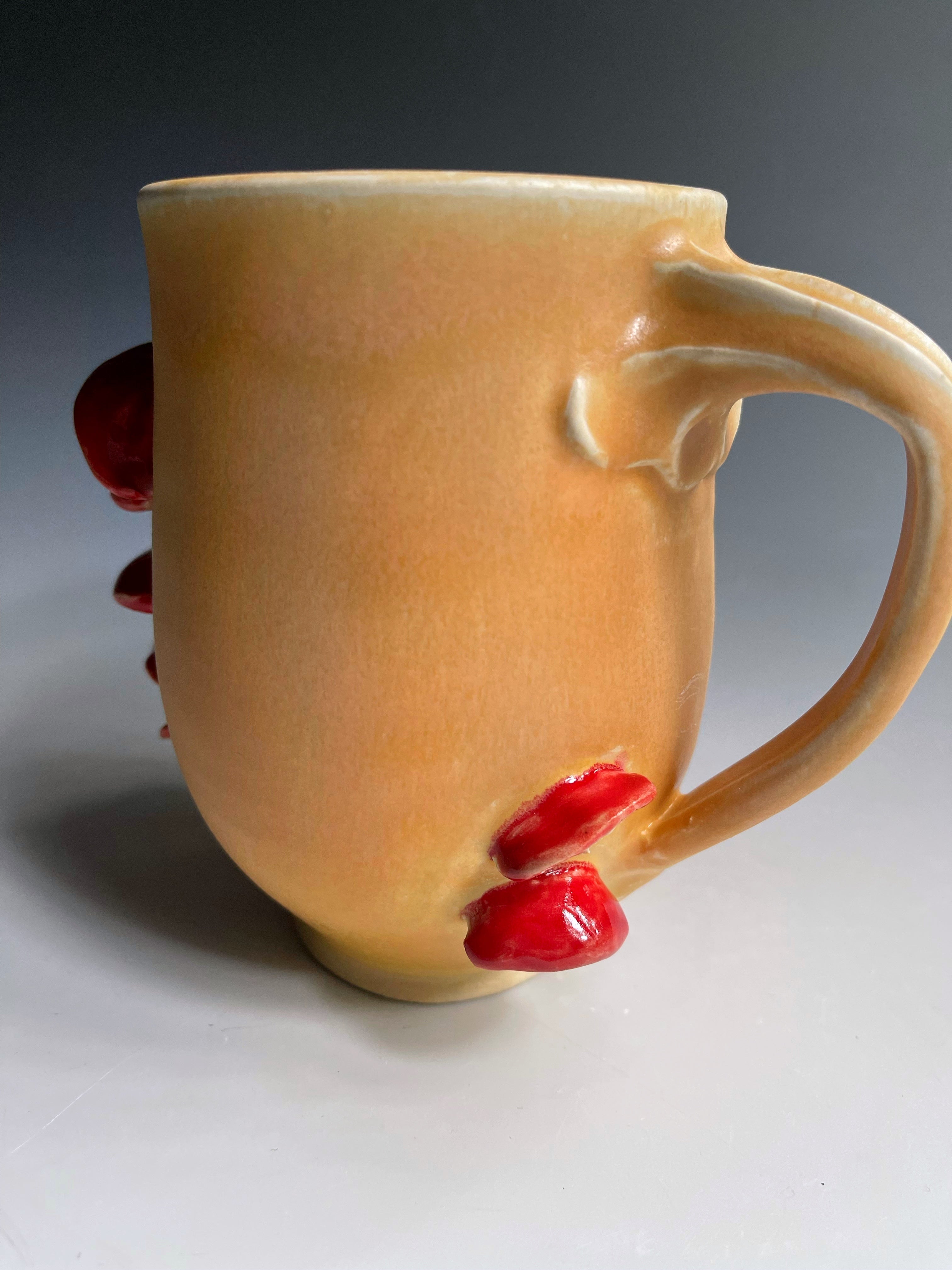 Shelf mushrooms on a mug with a scroll-y handle. glazed in a soft apricot. entirely hand sculpted and pleasingly well balanced- a pure delight to hold in your hand.