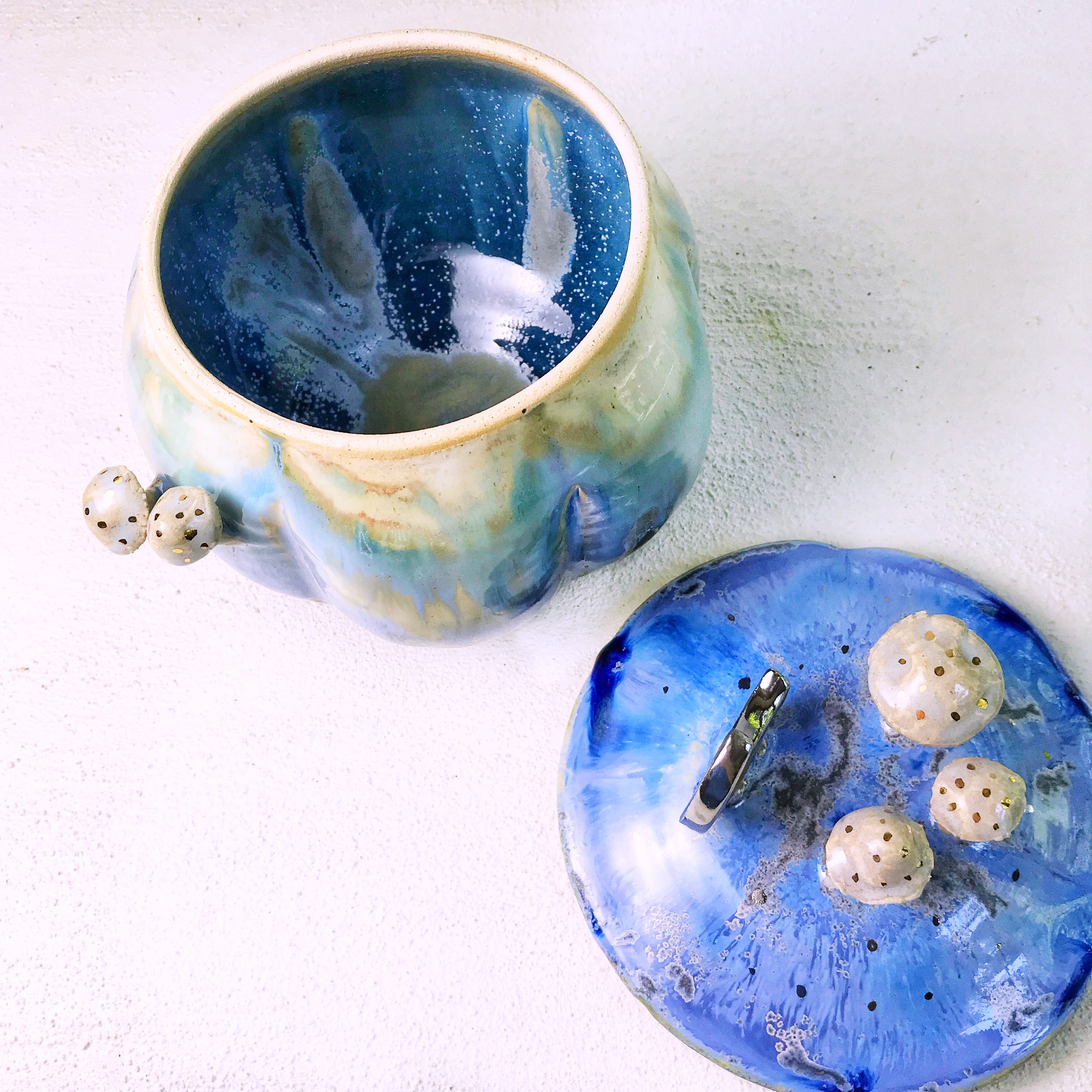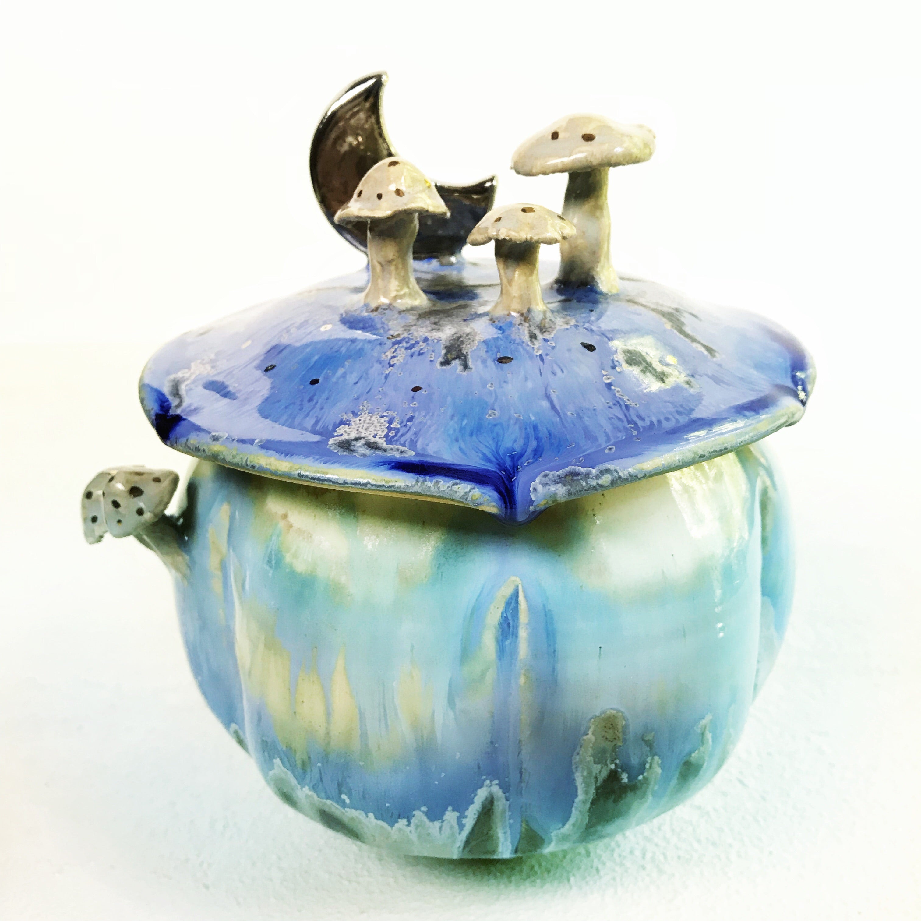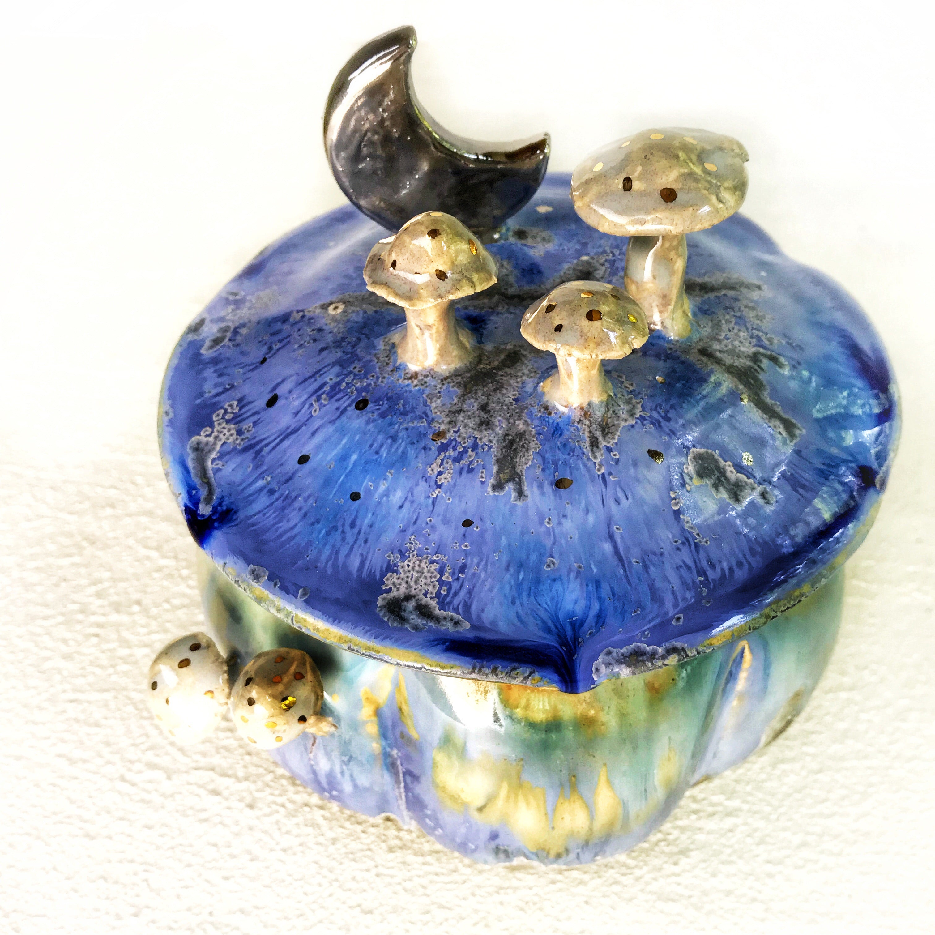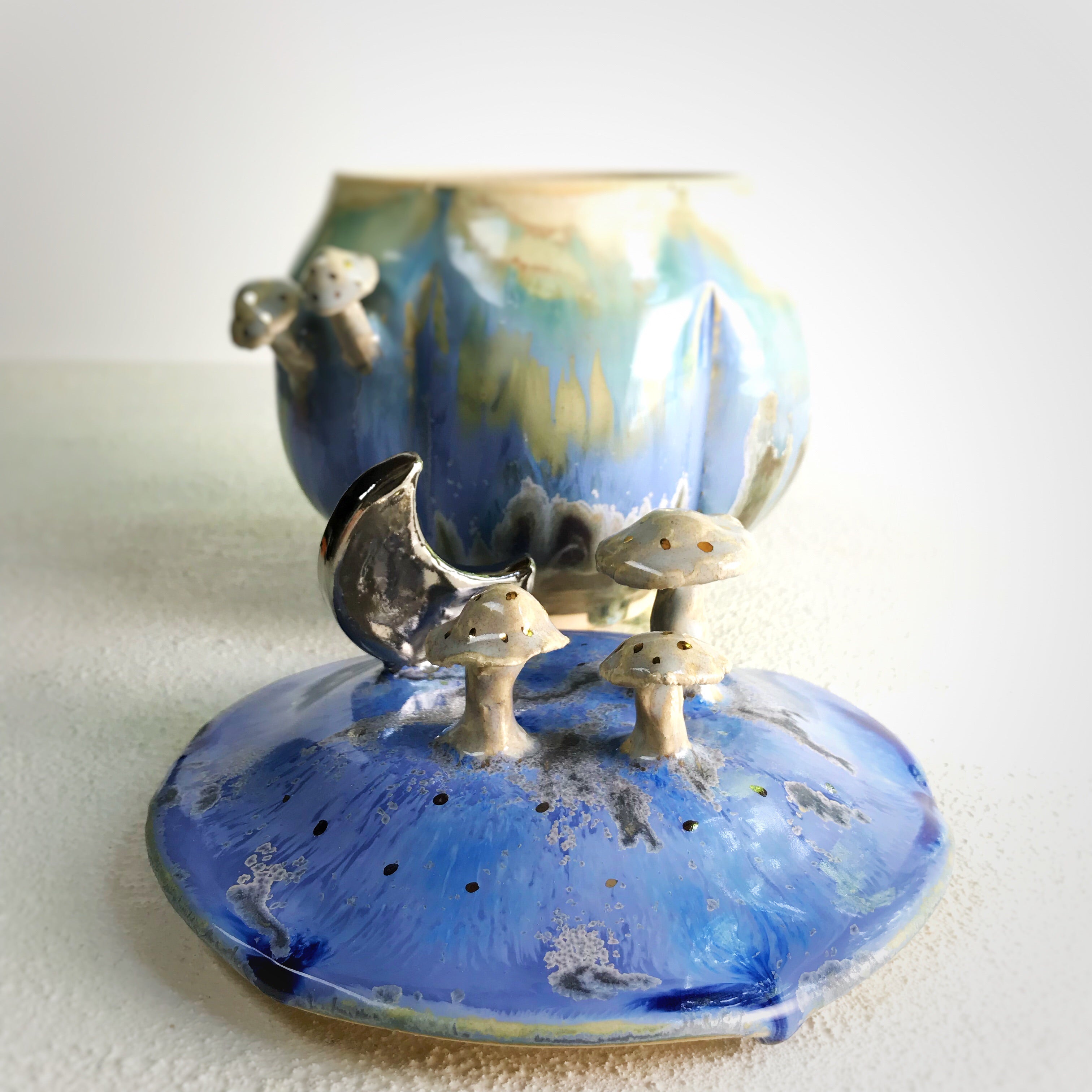 This wheel thrown lidded jar has Mushrooms and a crescent moon. The moon and shrooms are glazed in 22K gold and white gold luster.