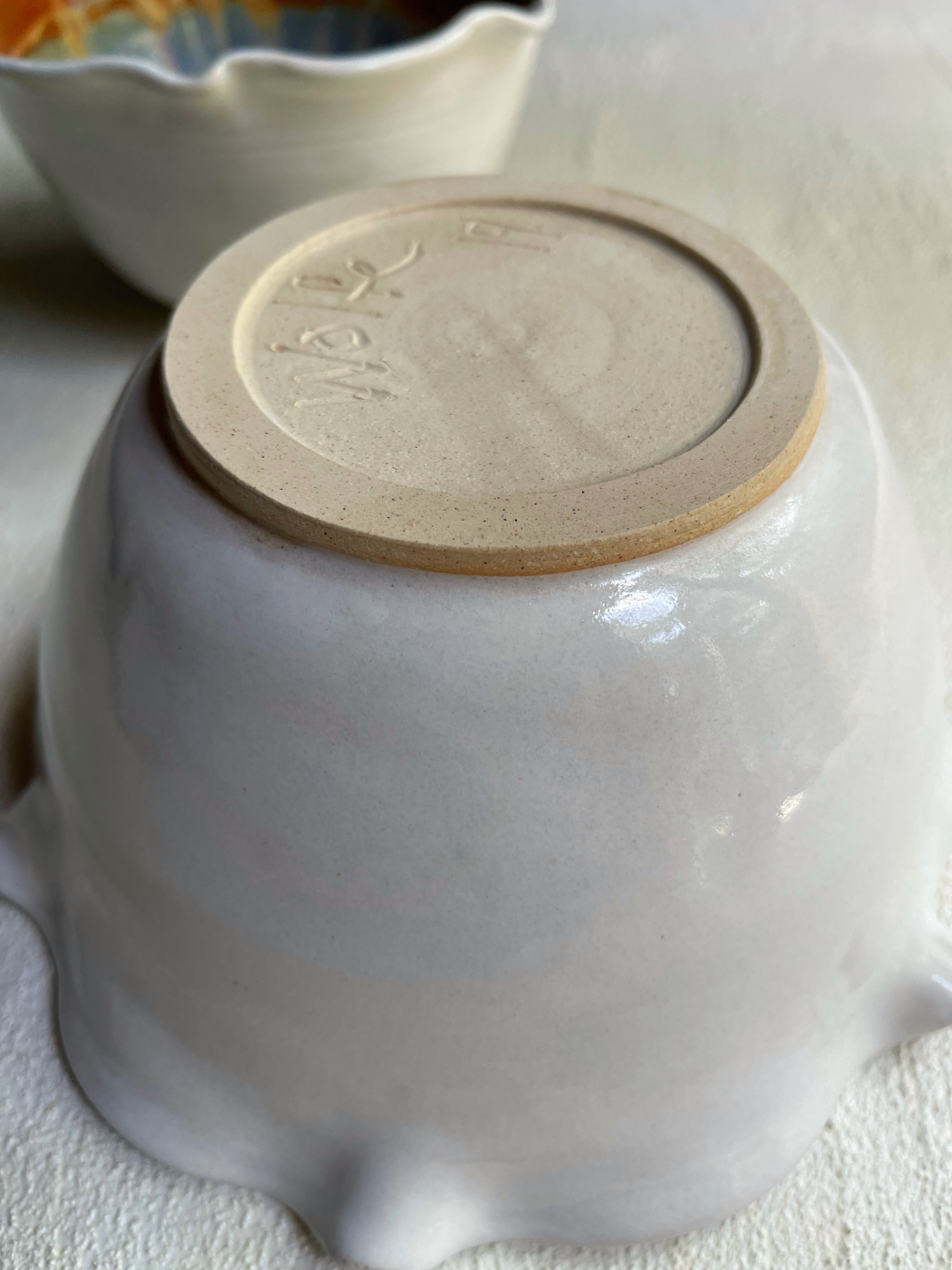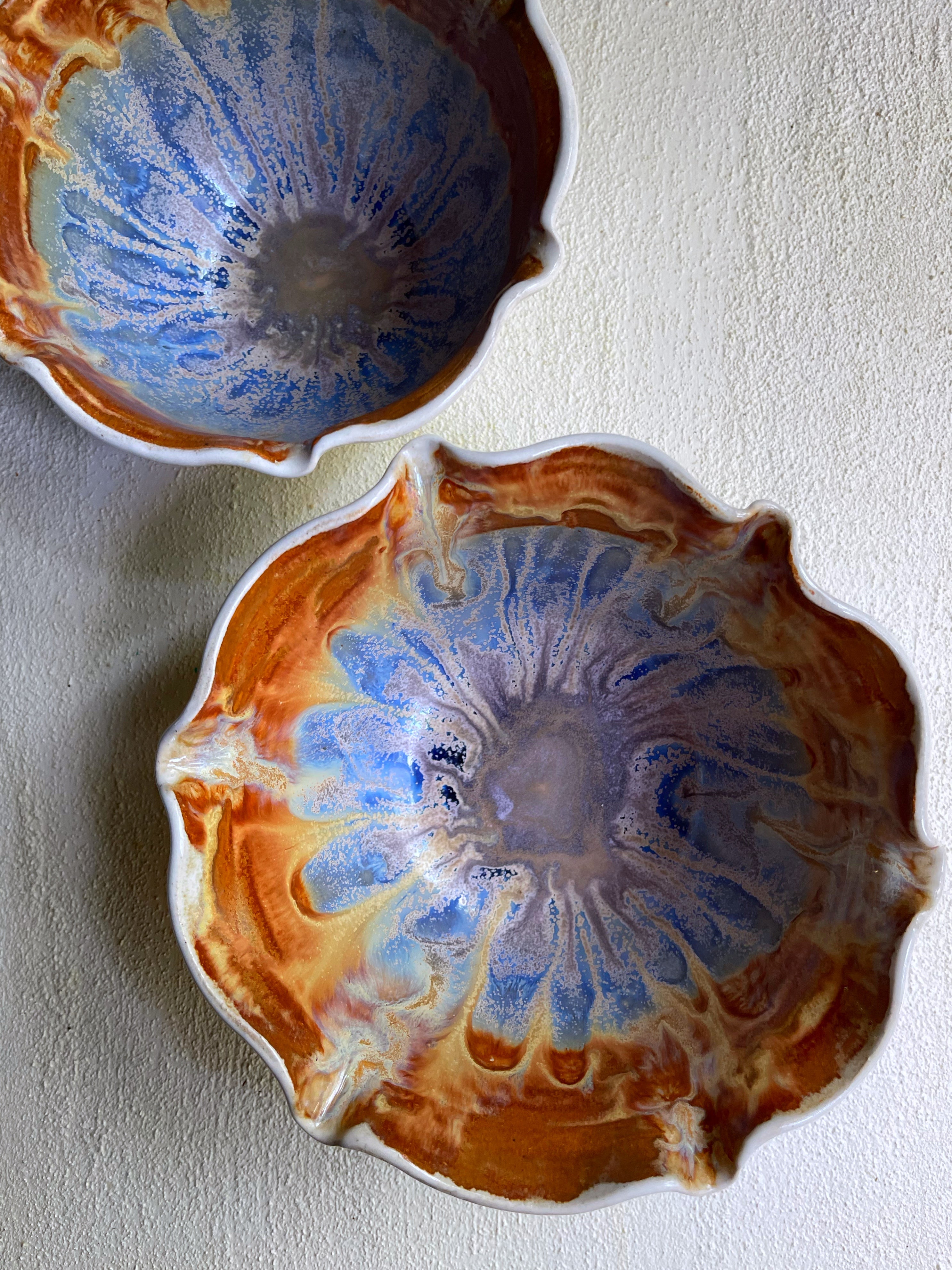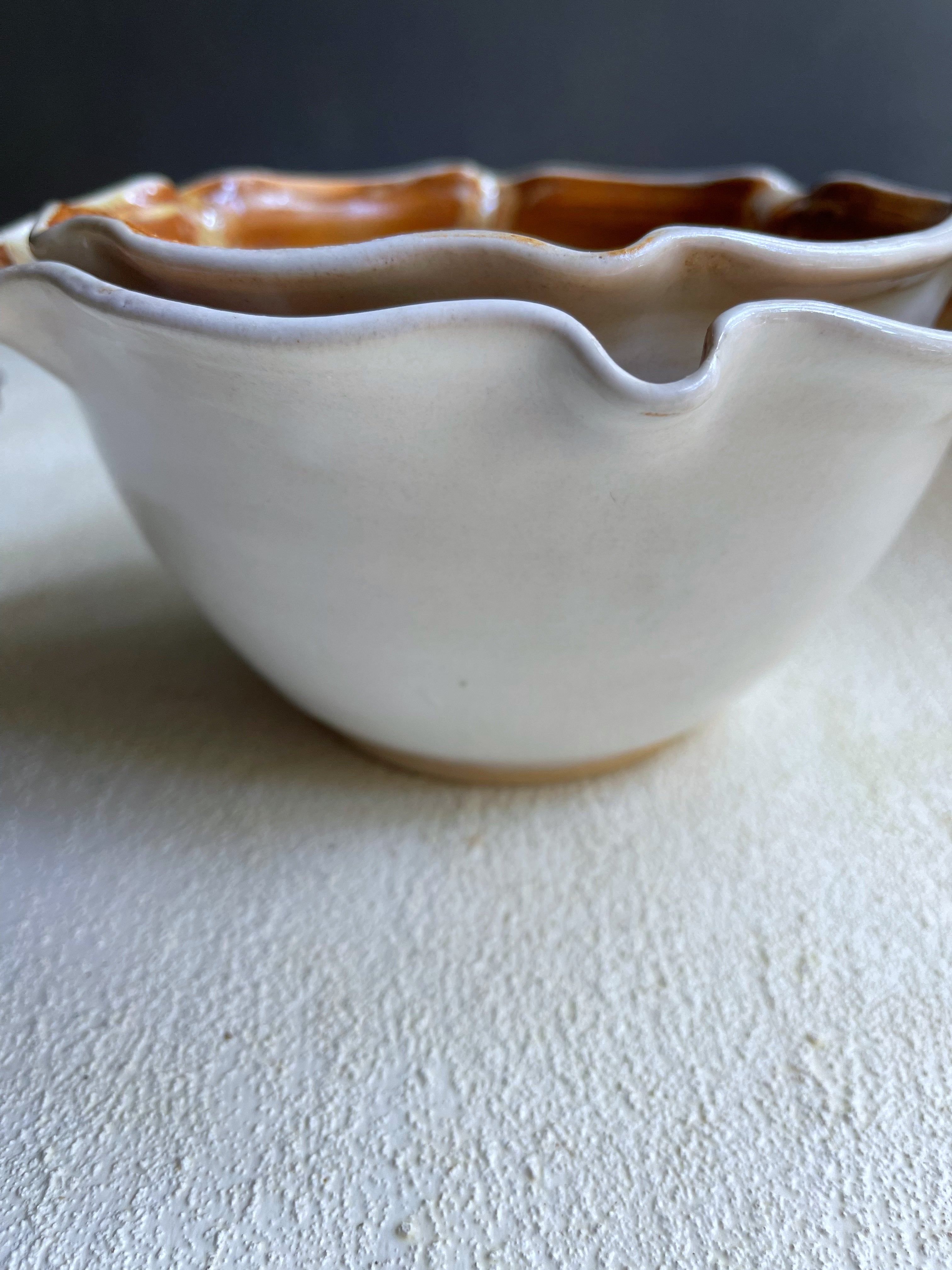 This set of 3 nesting bowls were thrown on a potters wheel and altered into a symmetrical "flower" shape. This set is tall with the center bowl slightly above the inner bowl. These are older bowls that I glazed for this load.