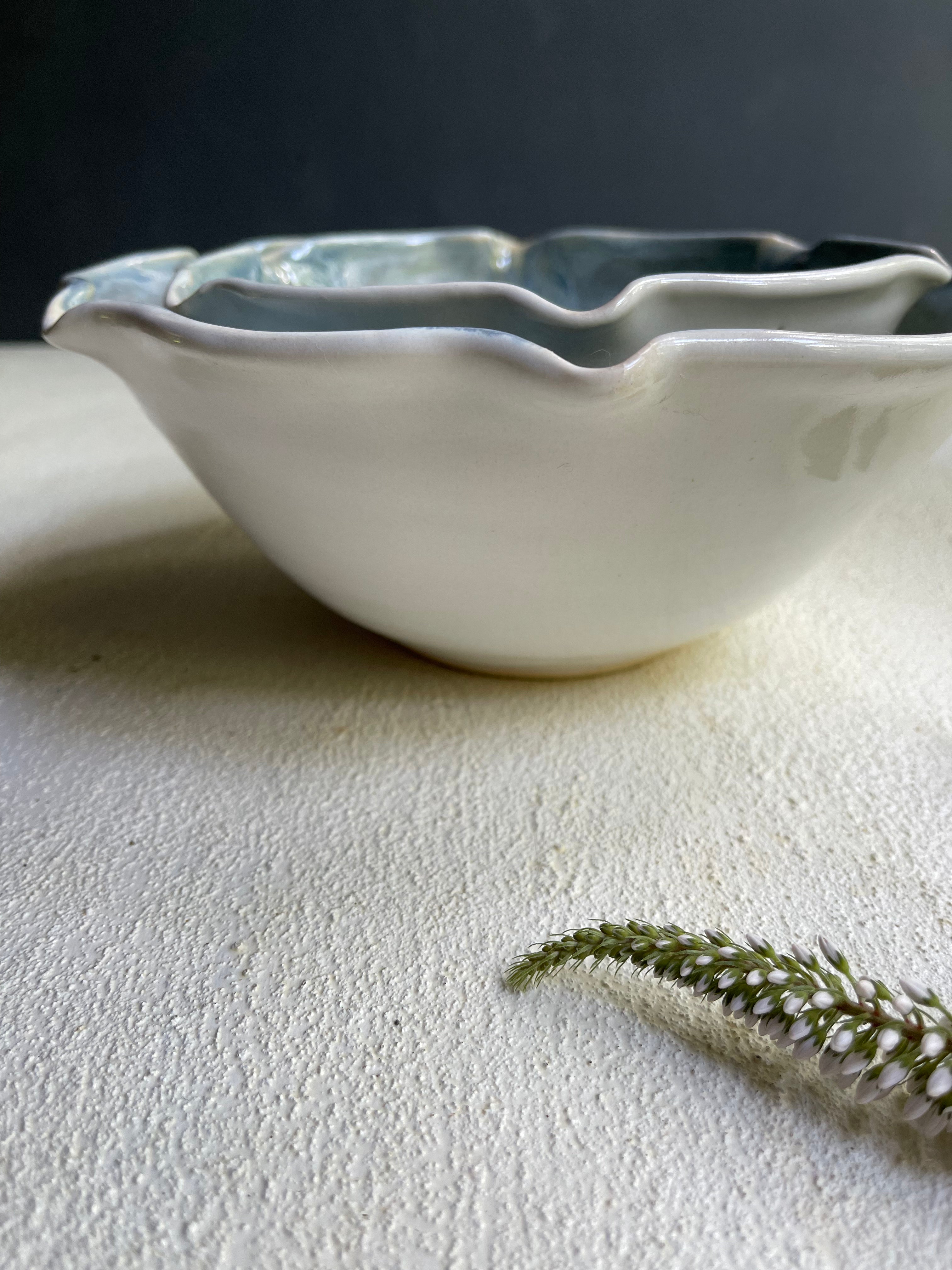 This set of 2 nesting bowls were thrown on a potters wheel and altered into a symmetrical "flower" shape. The narrow bases give the gesture of a flower unfolding. These are generous sizes that you will use every day. T