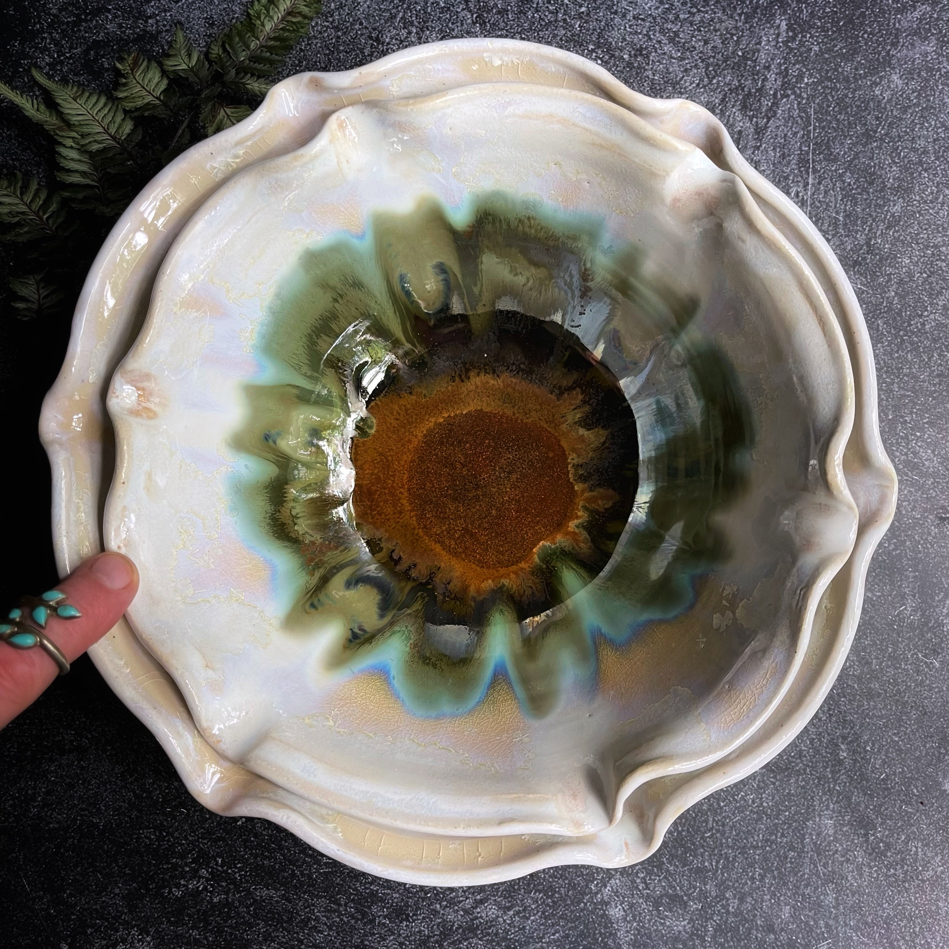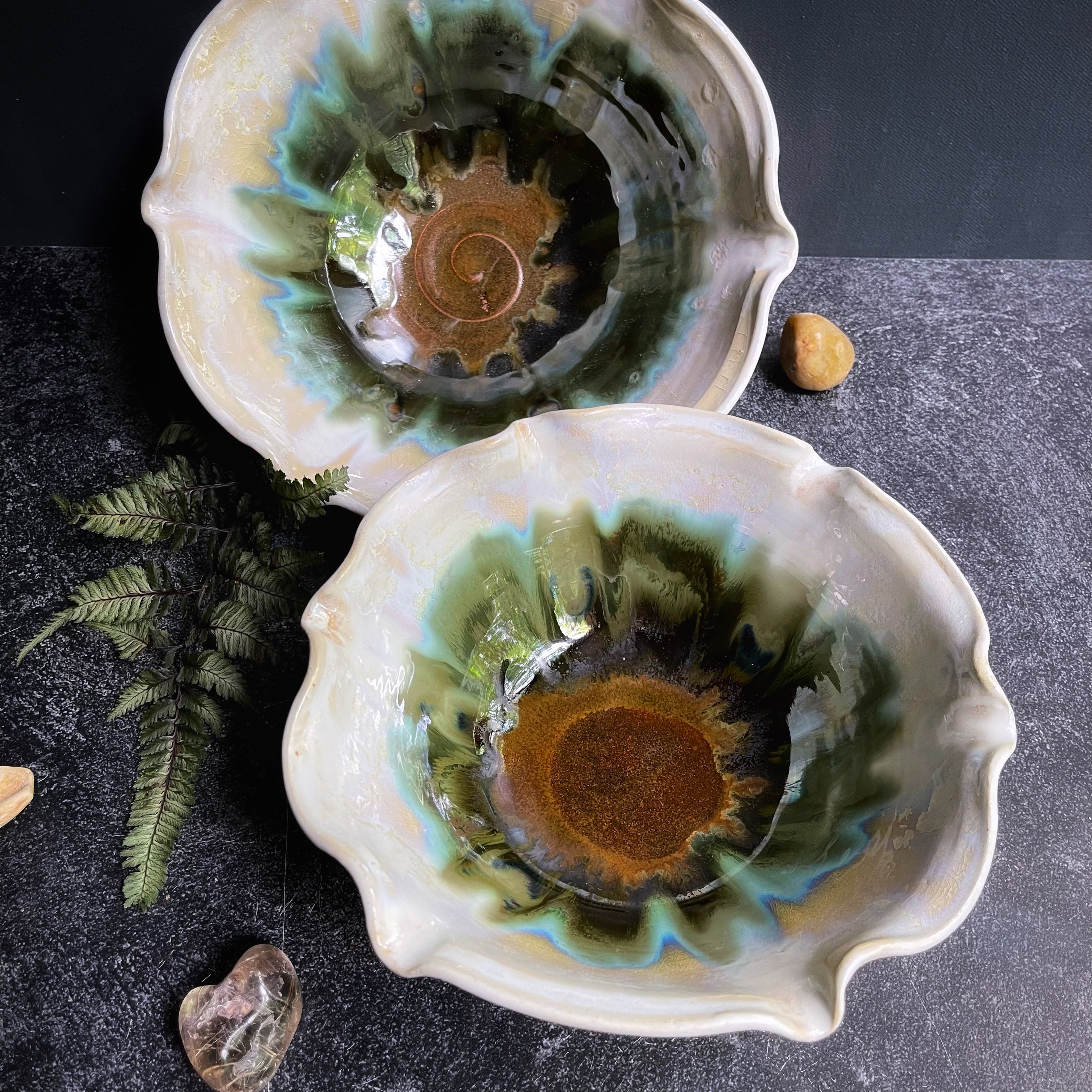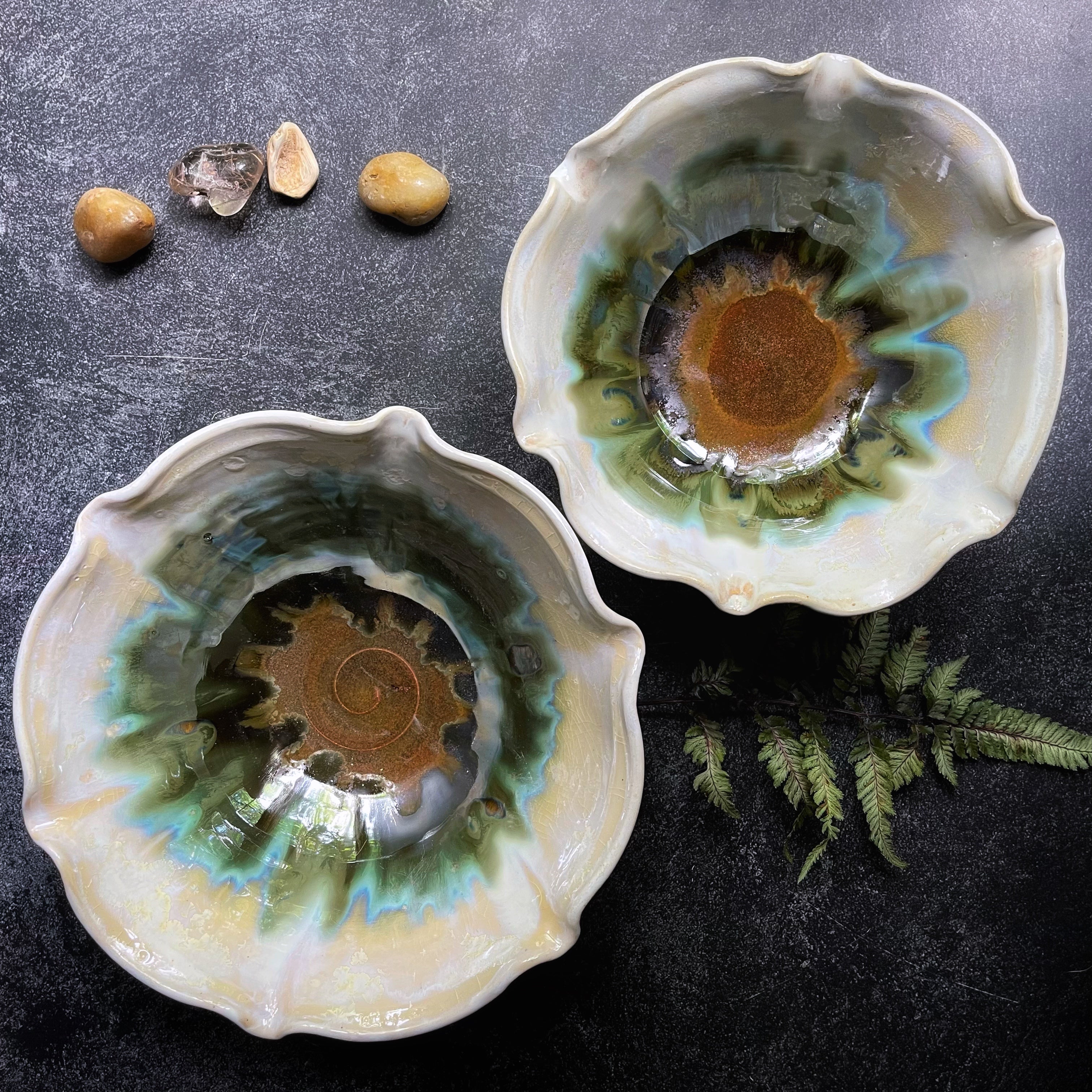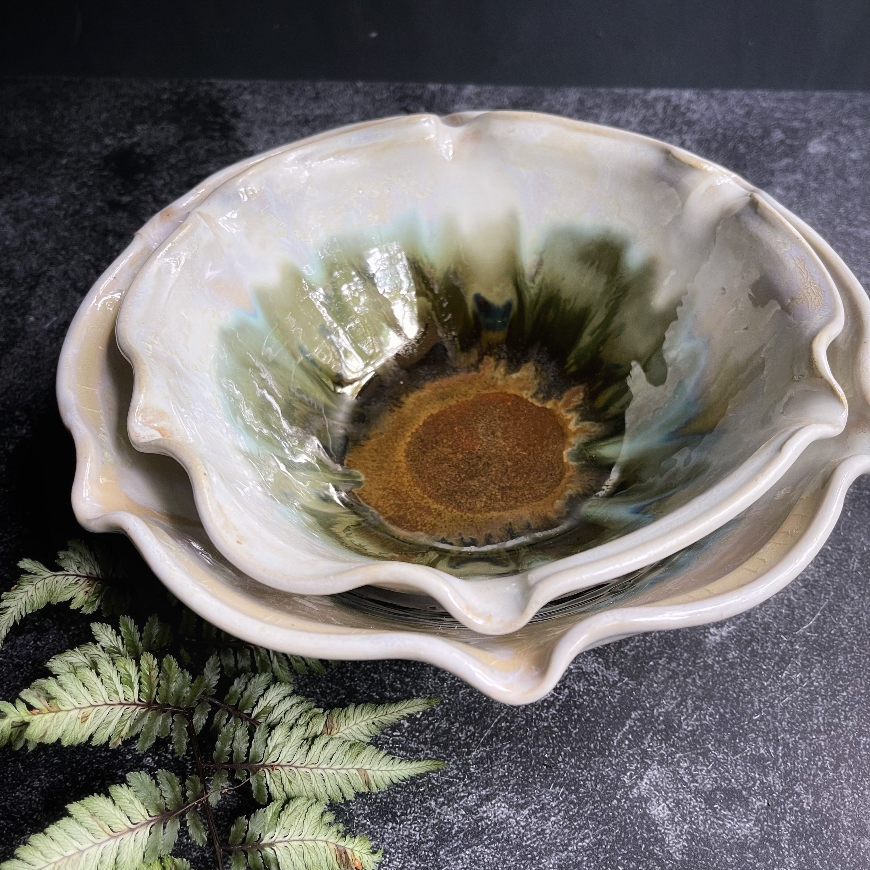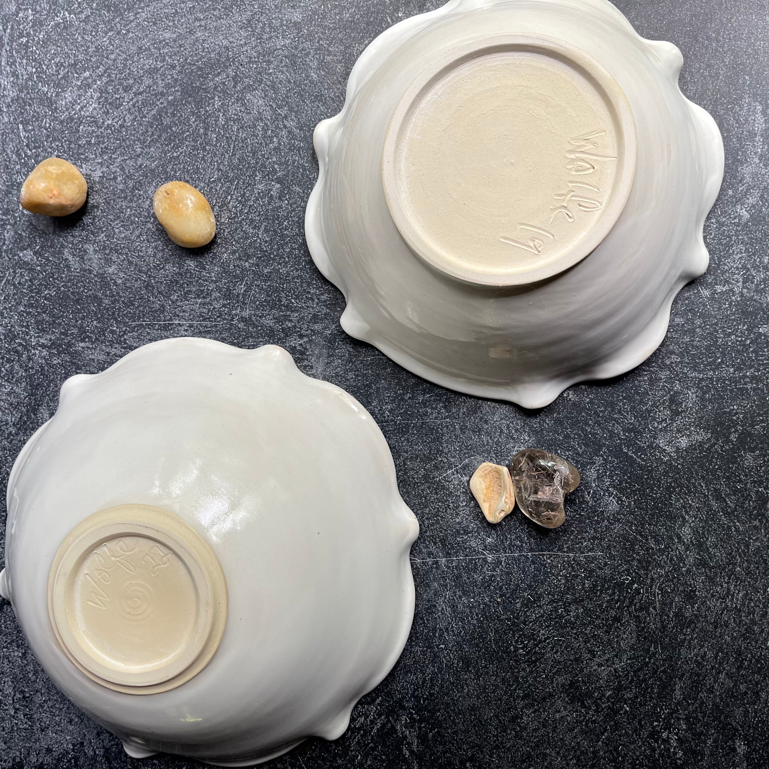 This set of 2 nesting bowls were thrown on a potters wheel and altered into a symmetrical "flower" shape. The narrow bases give the gesture of a flower unfolding. These are generous sizes that you will use every day.